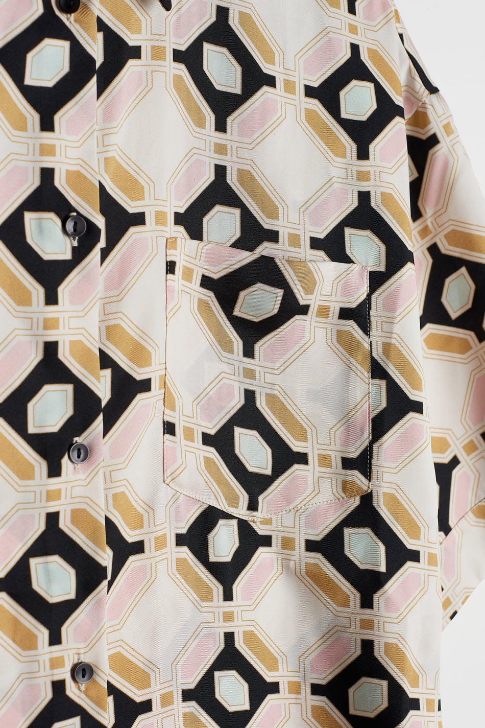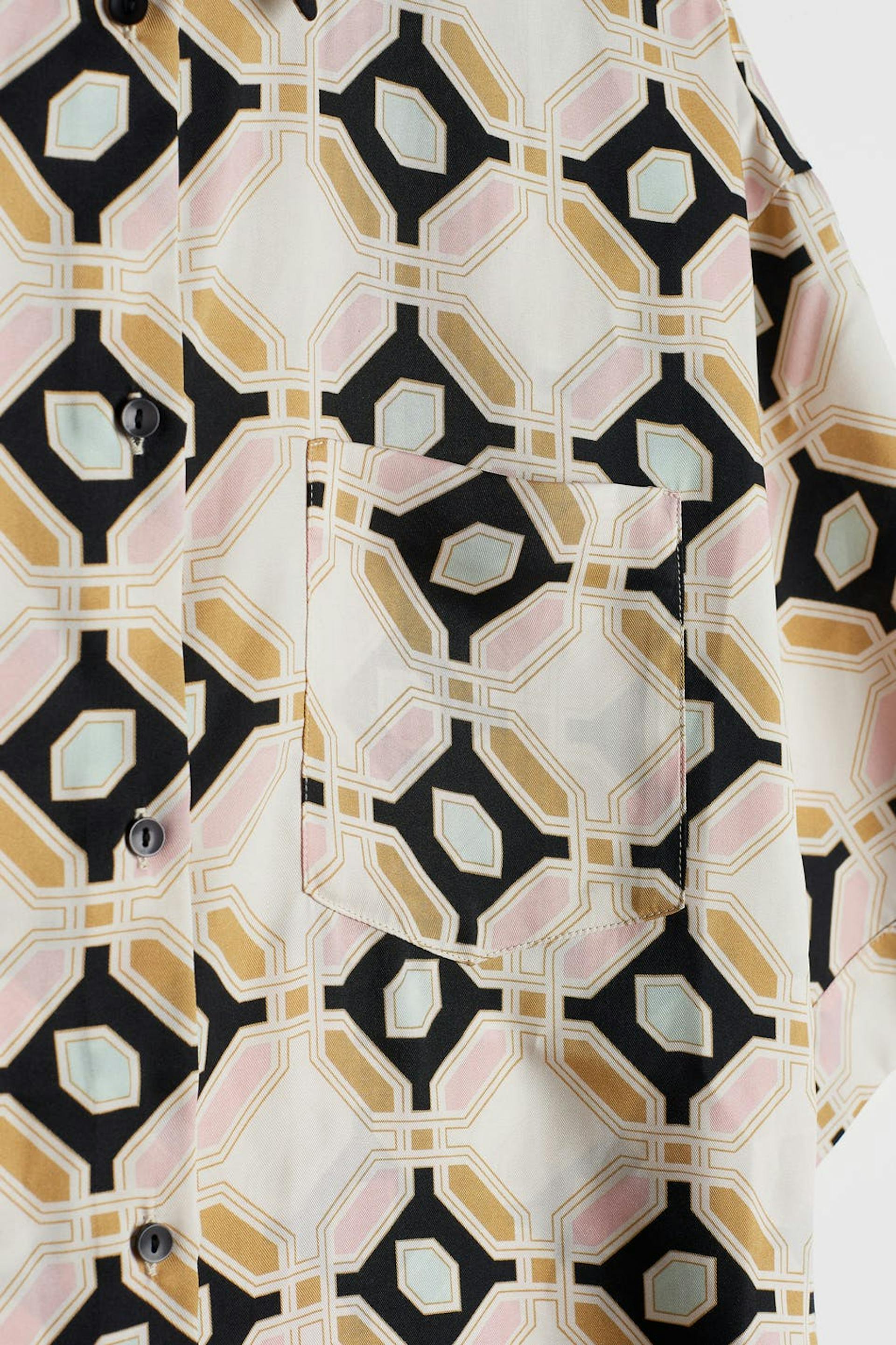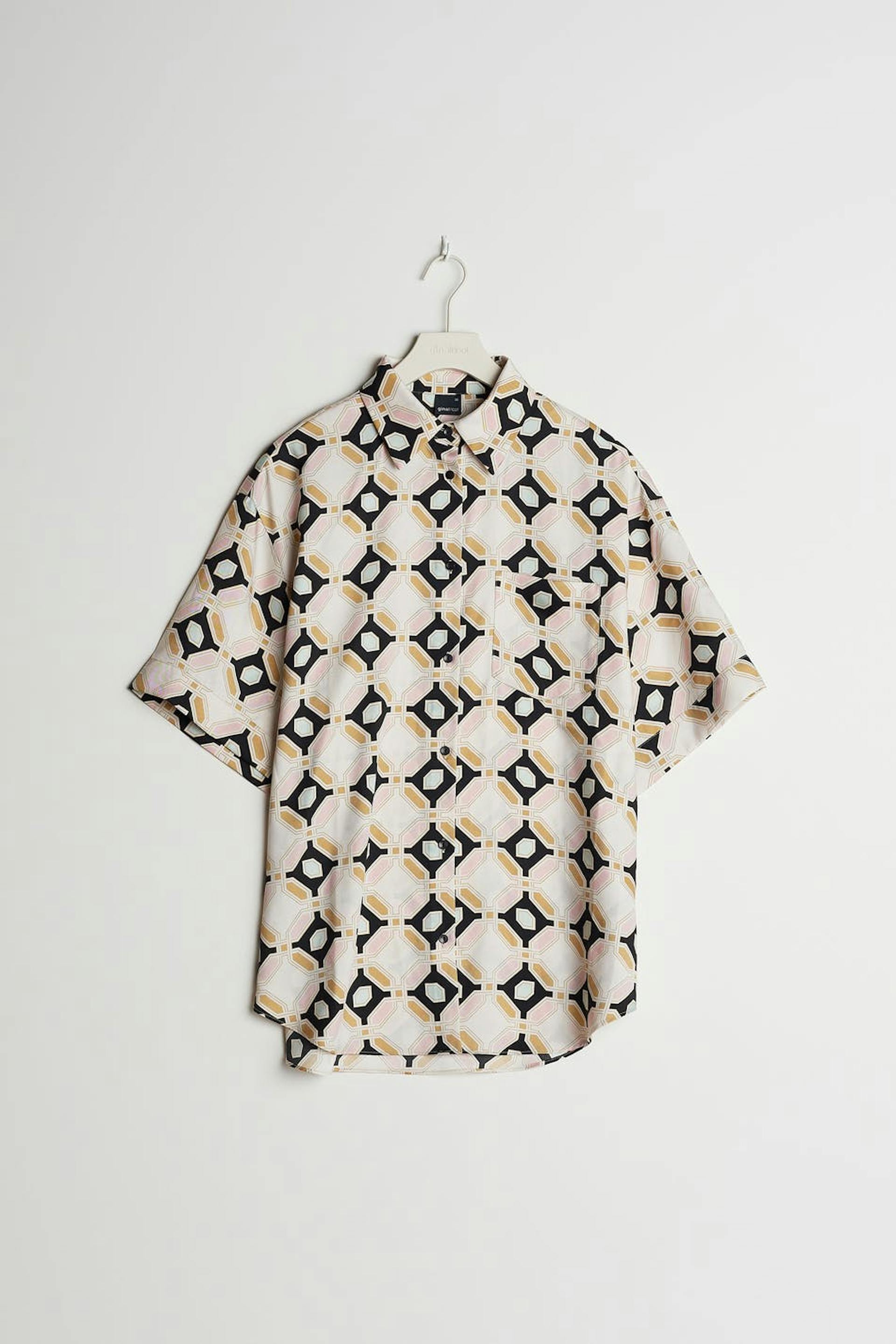 Short-sleeved blouse with a geometric, beige, pink, black, green pattern. The blouse is slightly longer at the back and has a satin-like material. It has a relaxed fit, buttons at the front and a chest pocket.