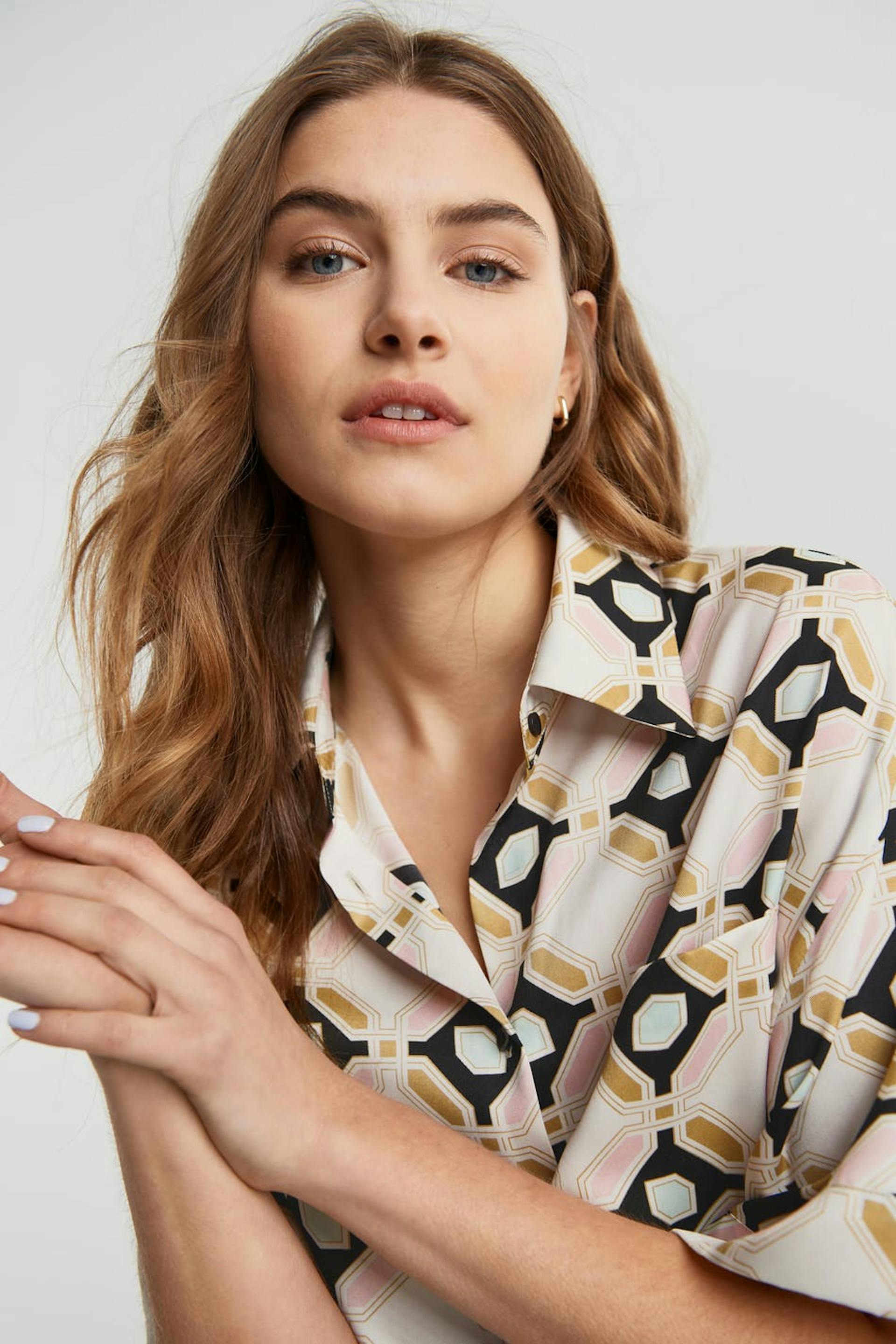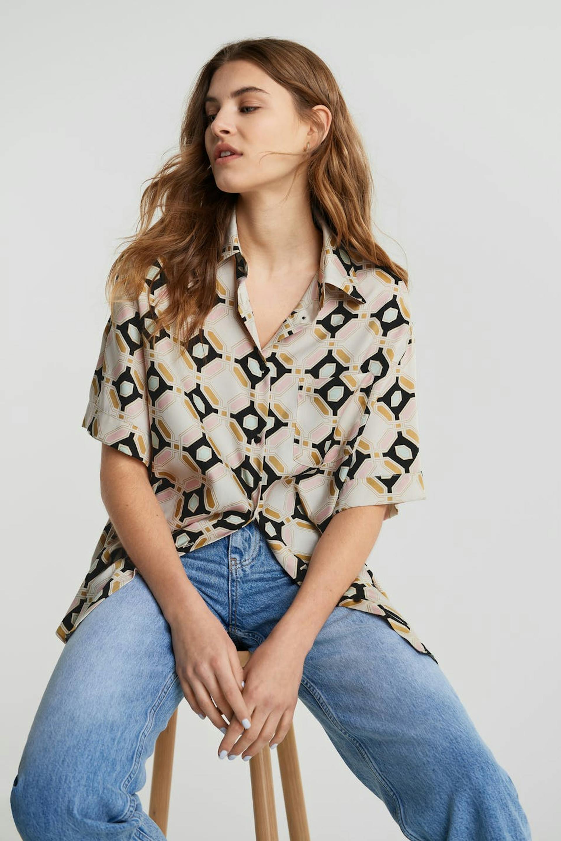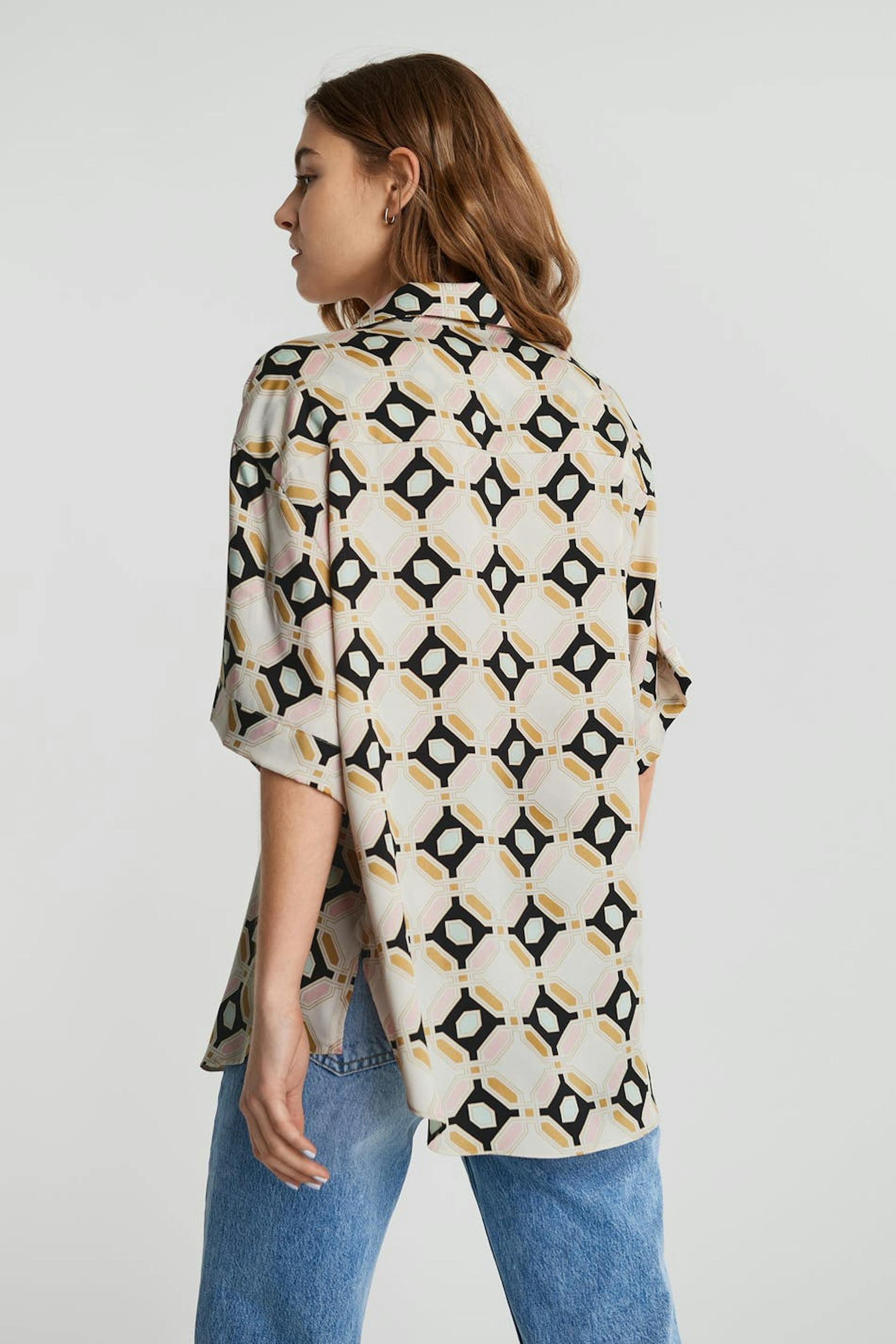 Short-sleeved blouse with a geometric, beige, pink, black, green pattern. The blouse is slightly longer at the back and has a satin-like material. It has a relaxed fit, buttons at the front and a chest pocket.