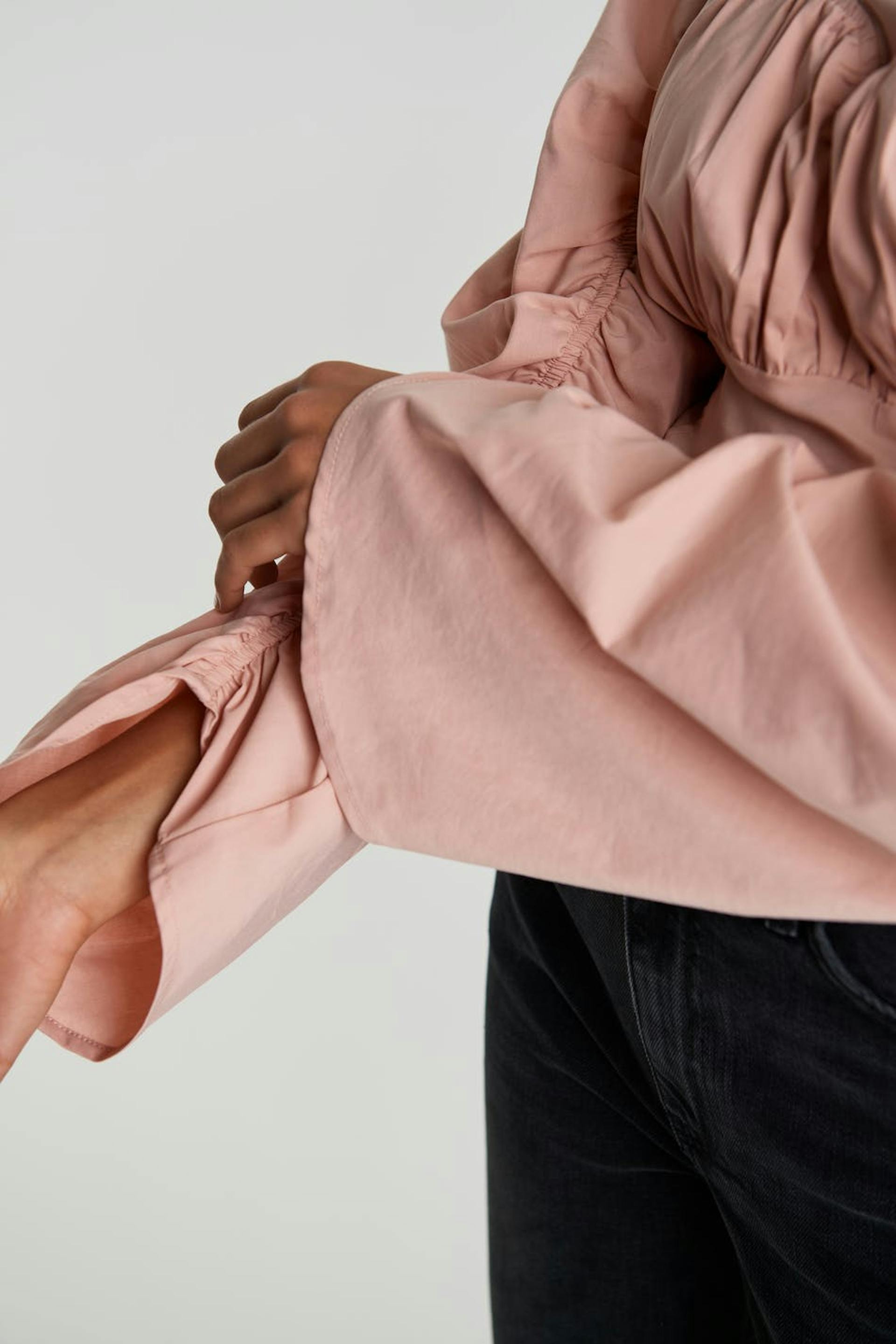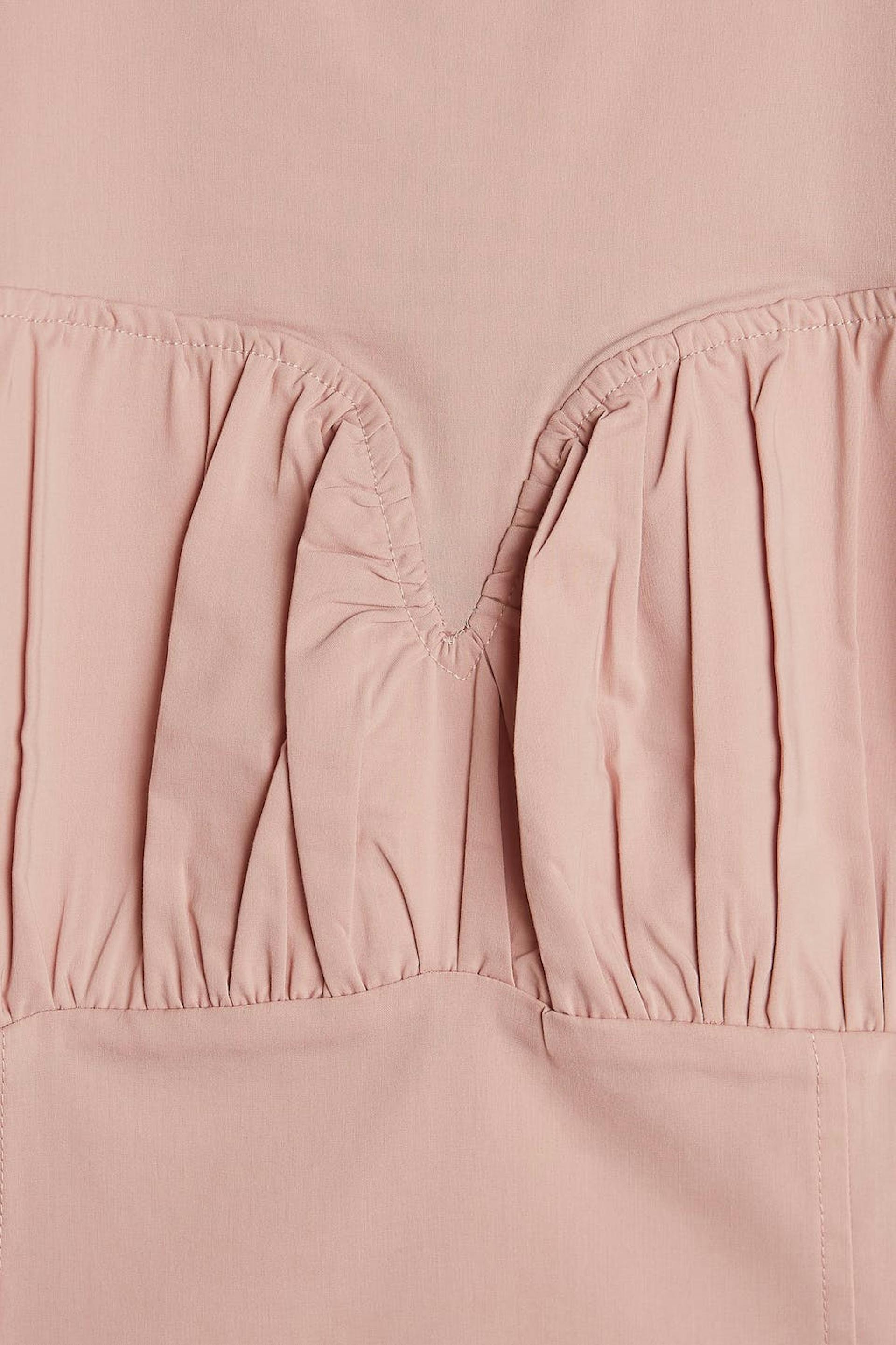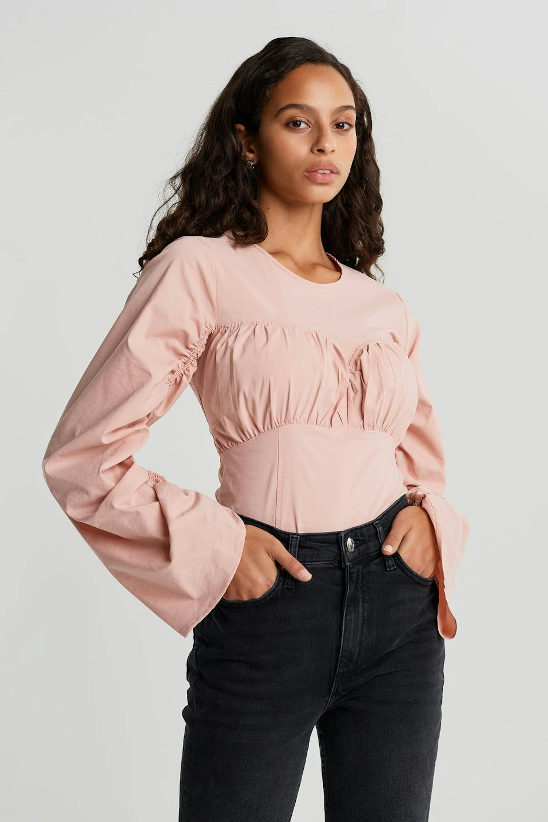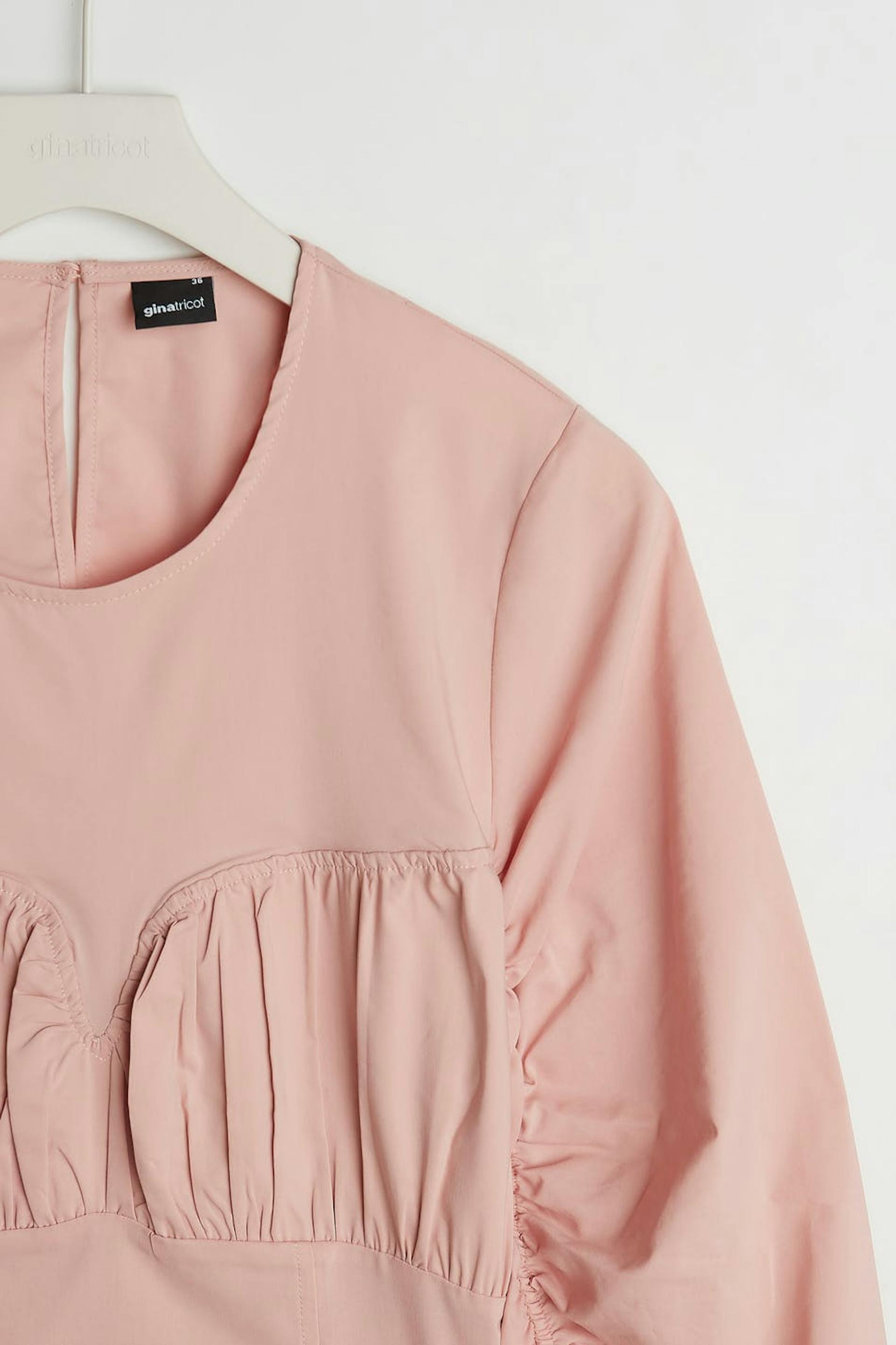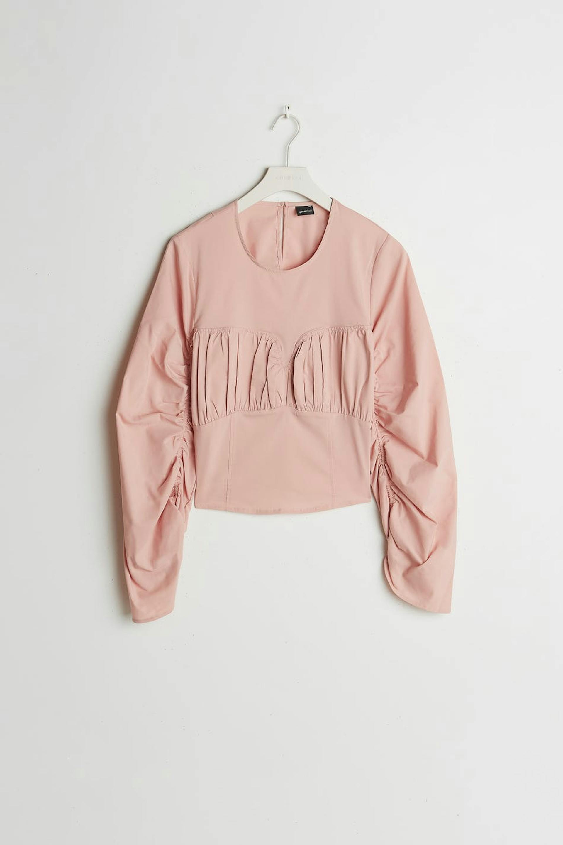Long-sleeved blouse with ruching on the sleeves and over the bust. The blouse is pink and has a button closure at the neck.