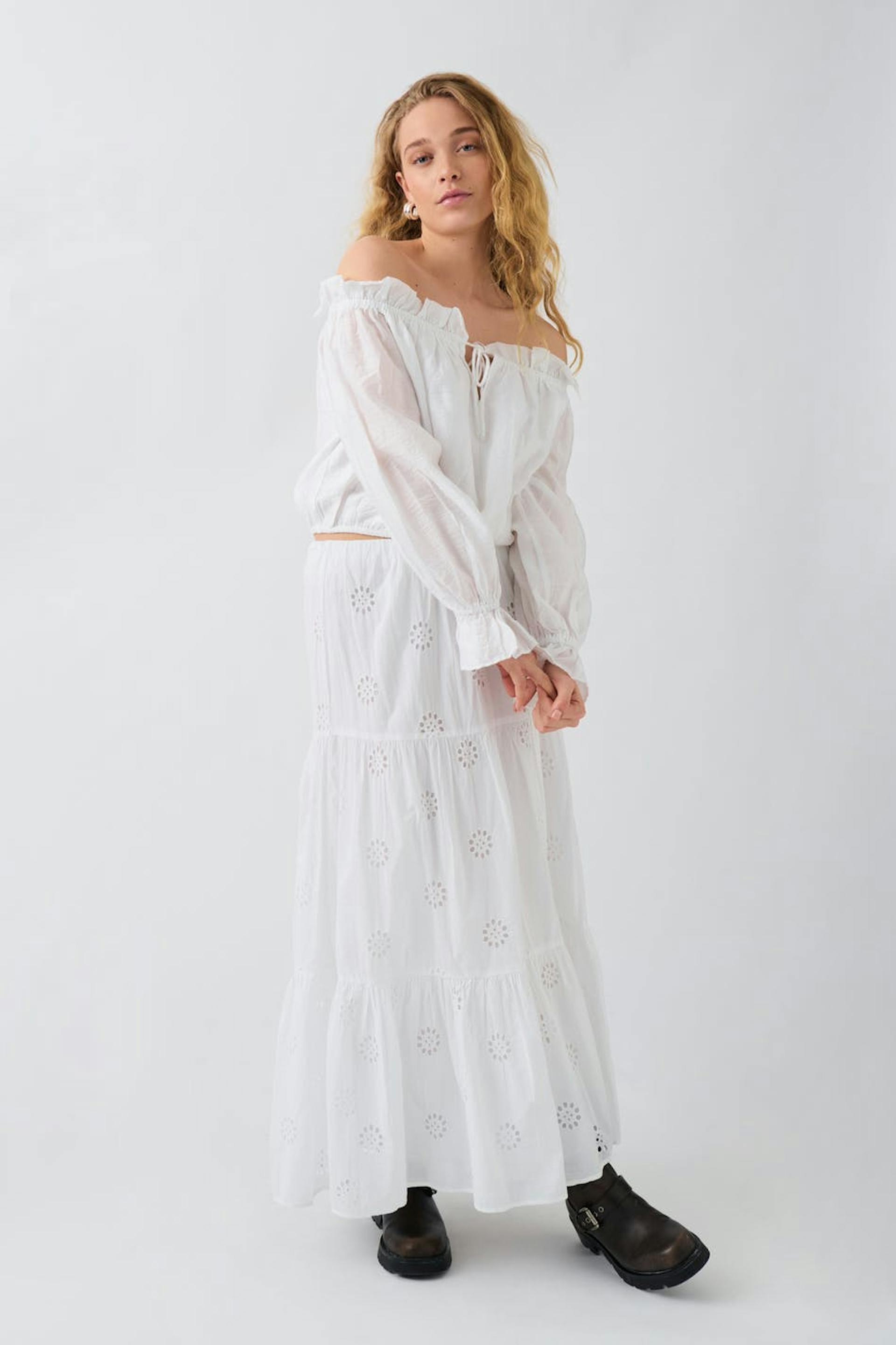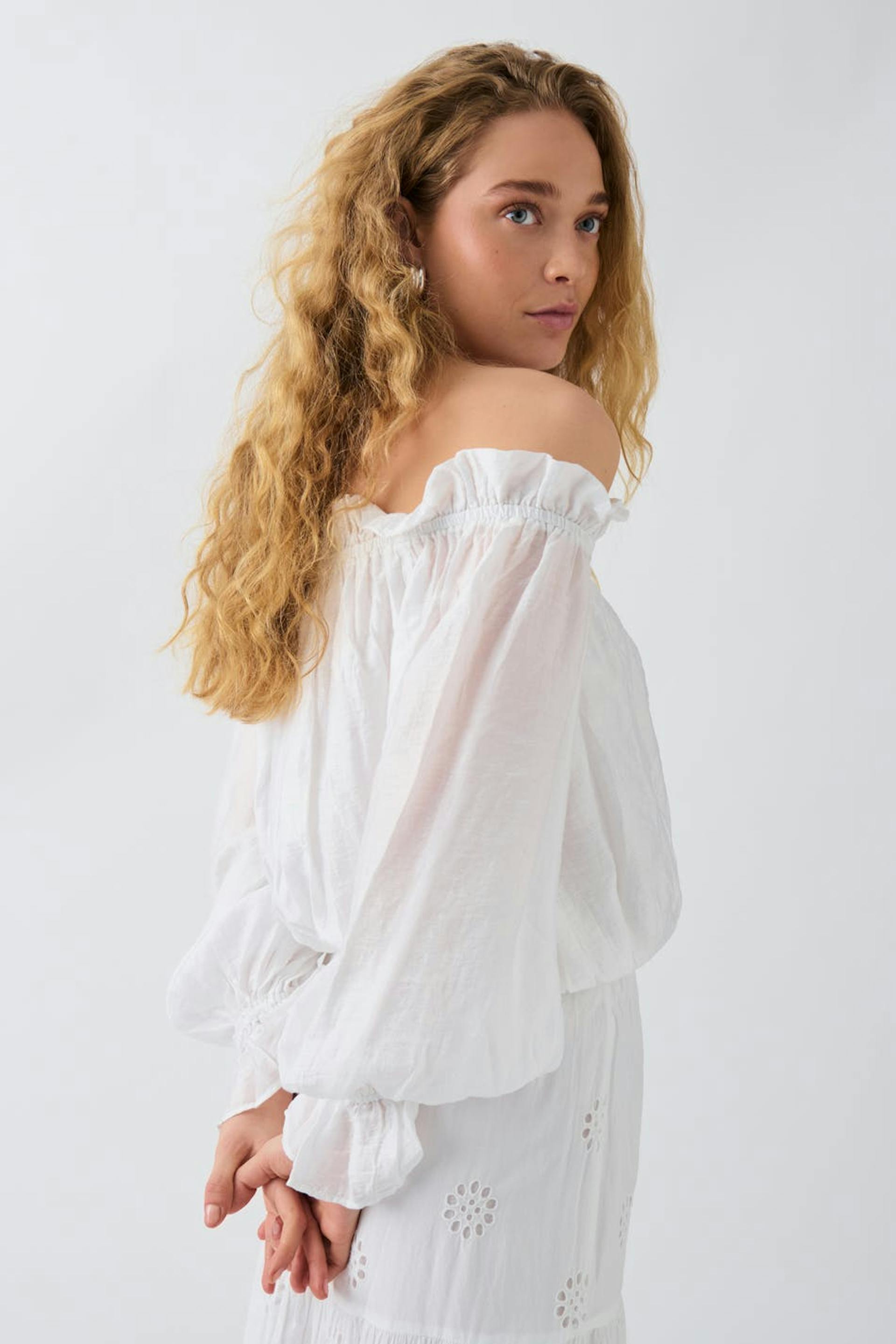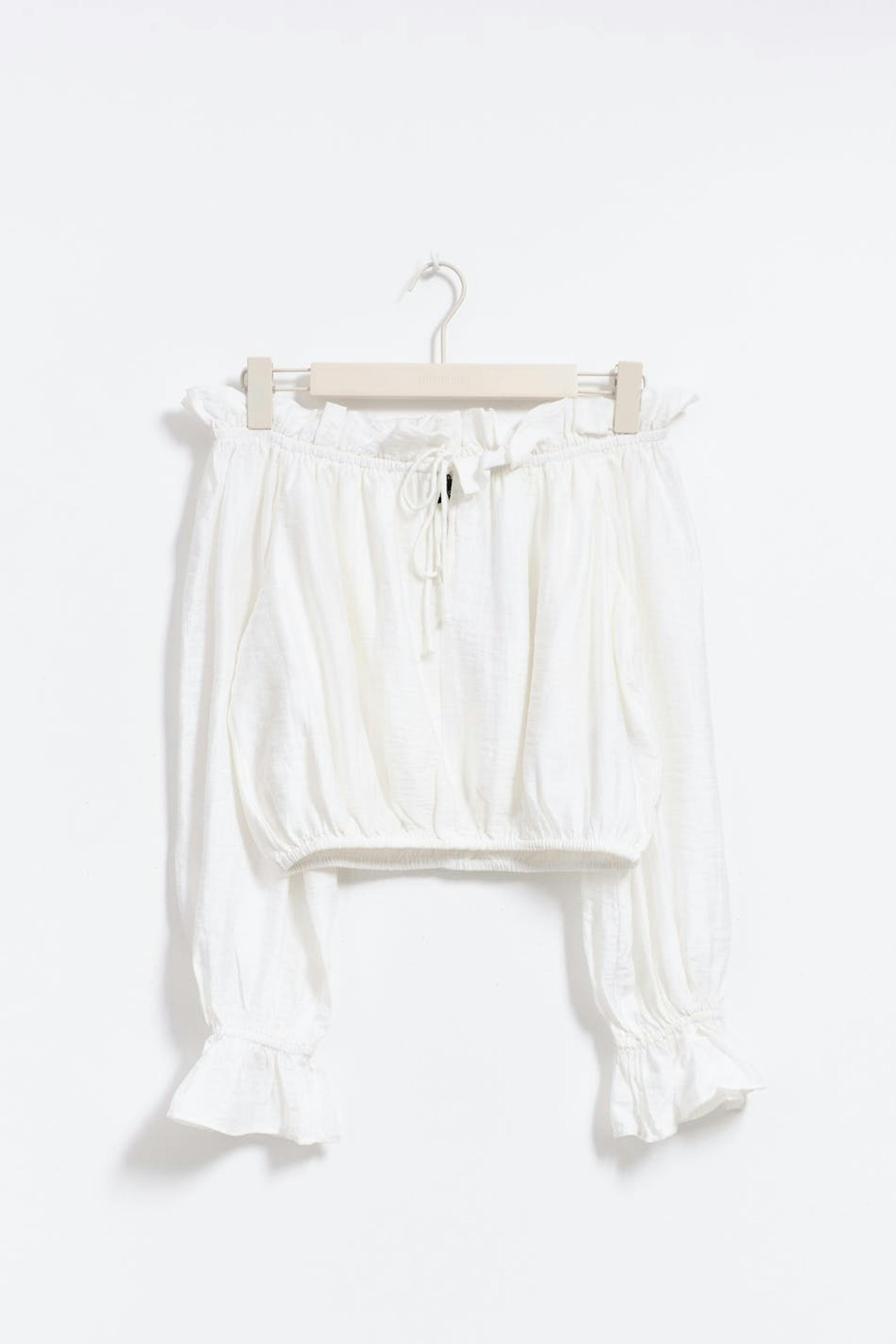 Off-the-shoulder blouse with long sleeve. The blouse is white and has elastic at the bottom. It has self-tie at the front and frill at sleeve ends and on the neckline.