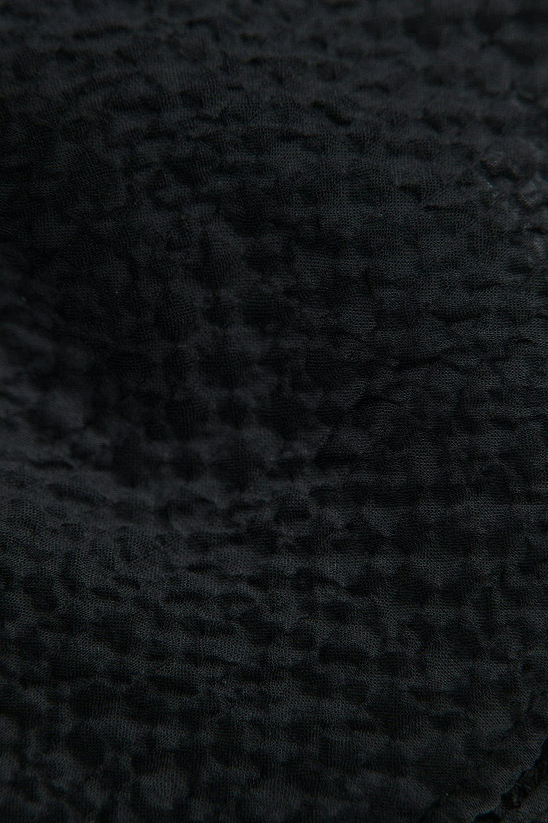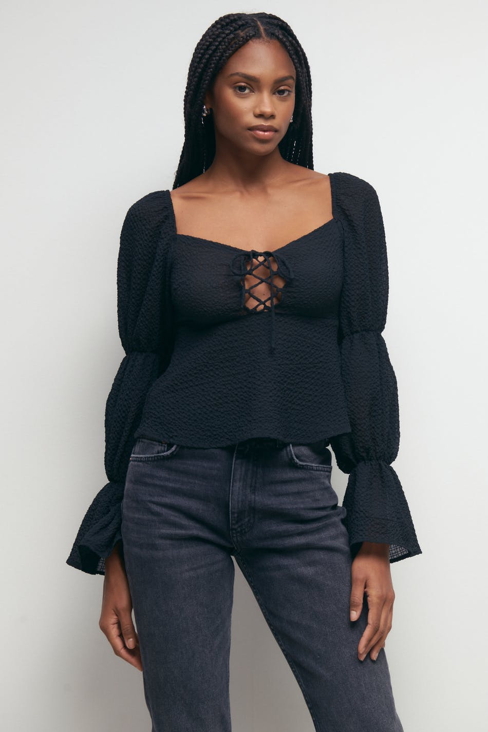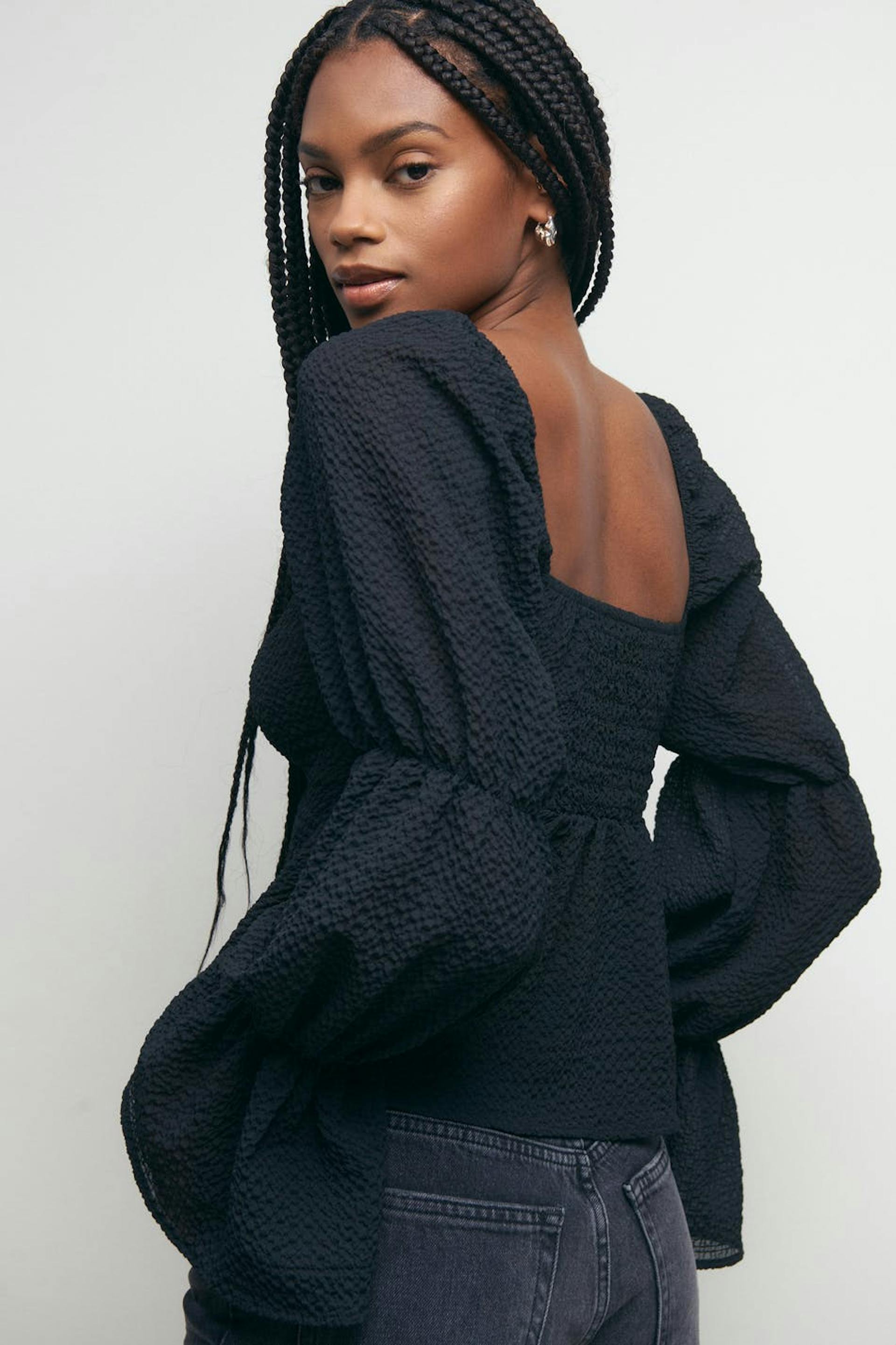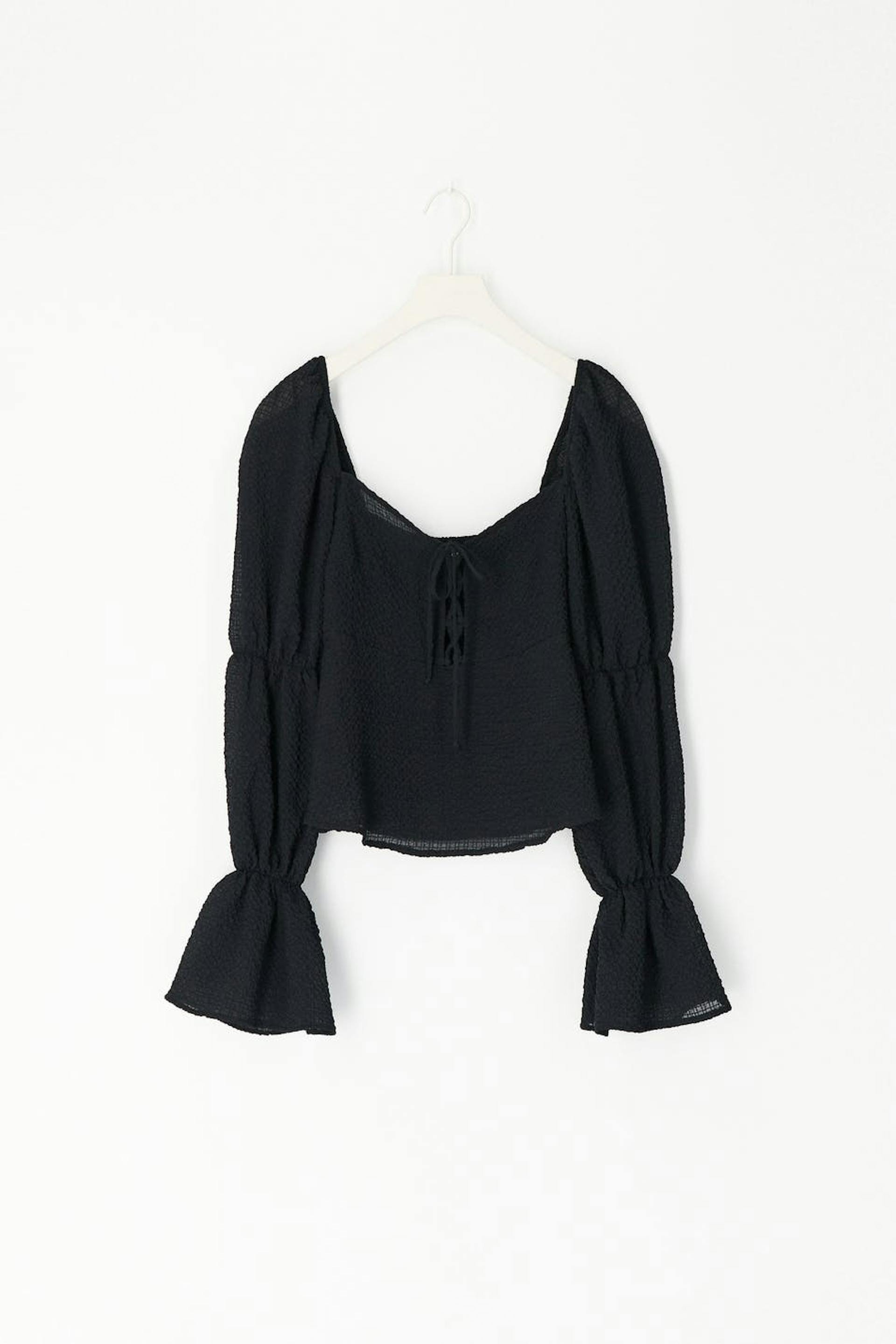 Long-sleeved blouse with voluminous puff sleeves. The blouse is black and has a textured quality. It has knot detail at the bust, smocking at the back and elastic on the sleeves and around the shoulders.