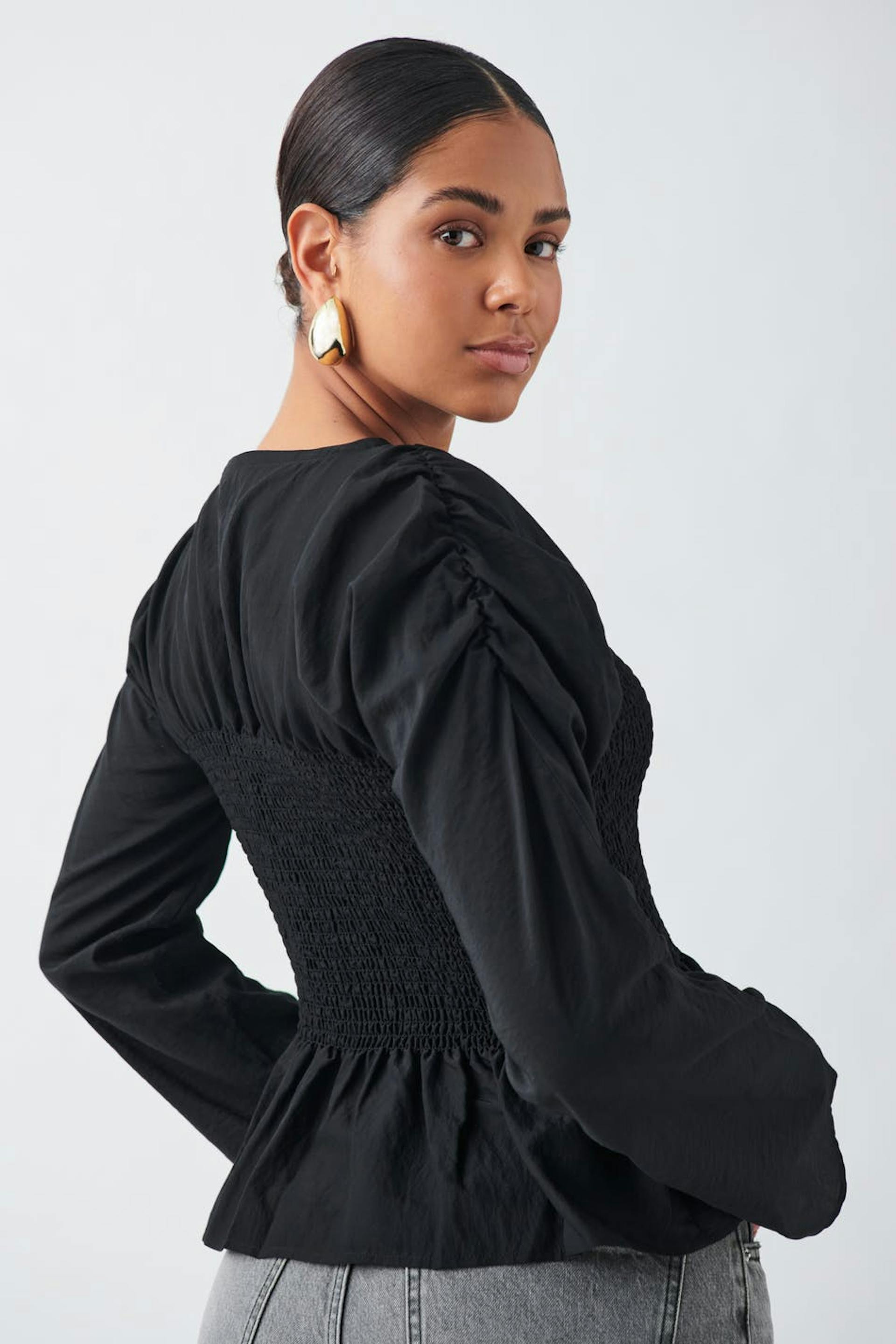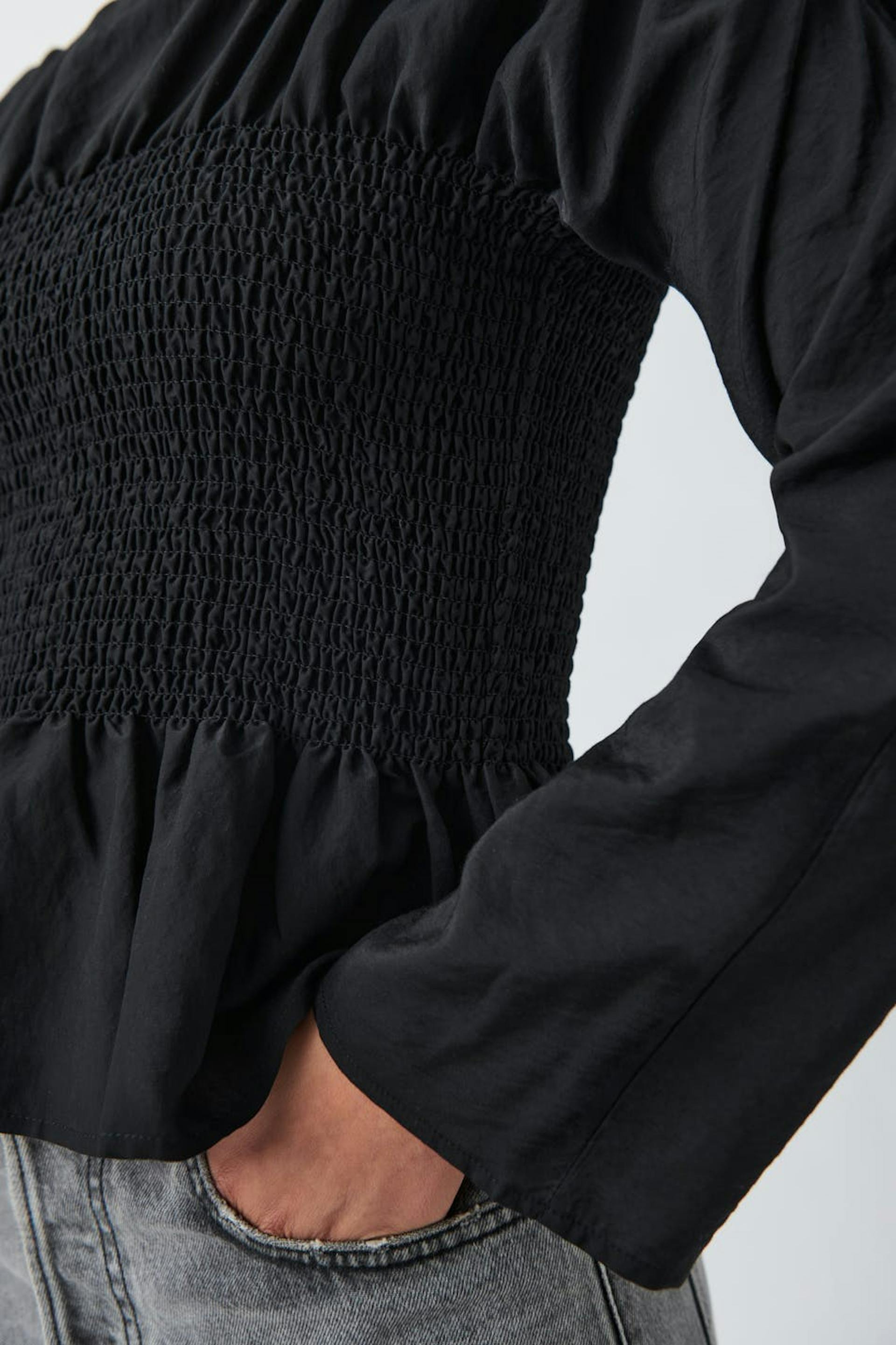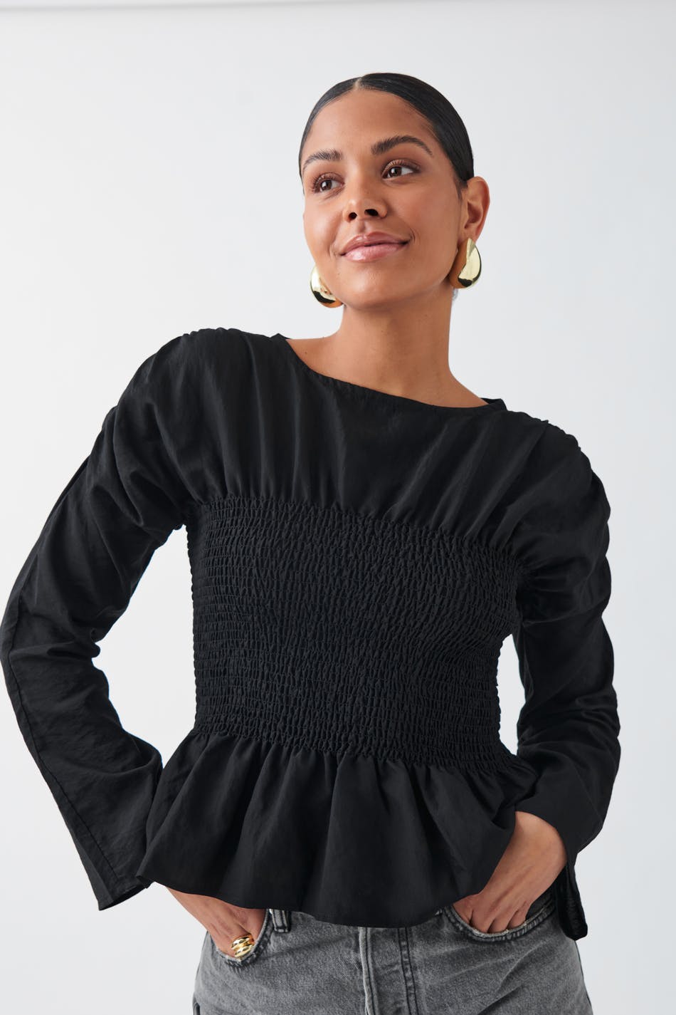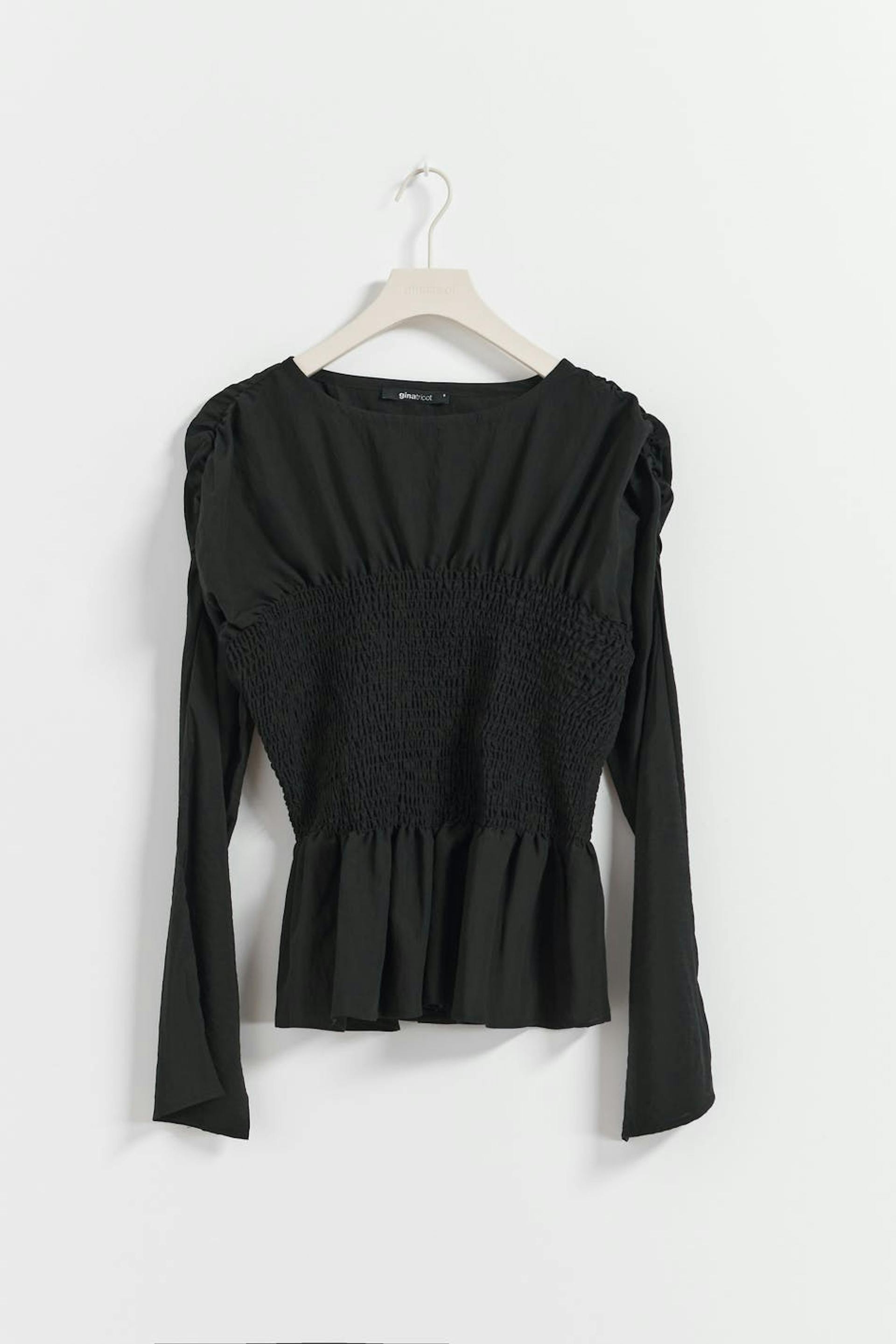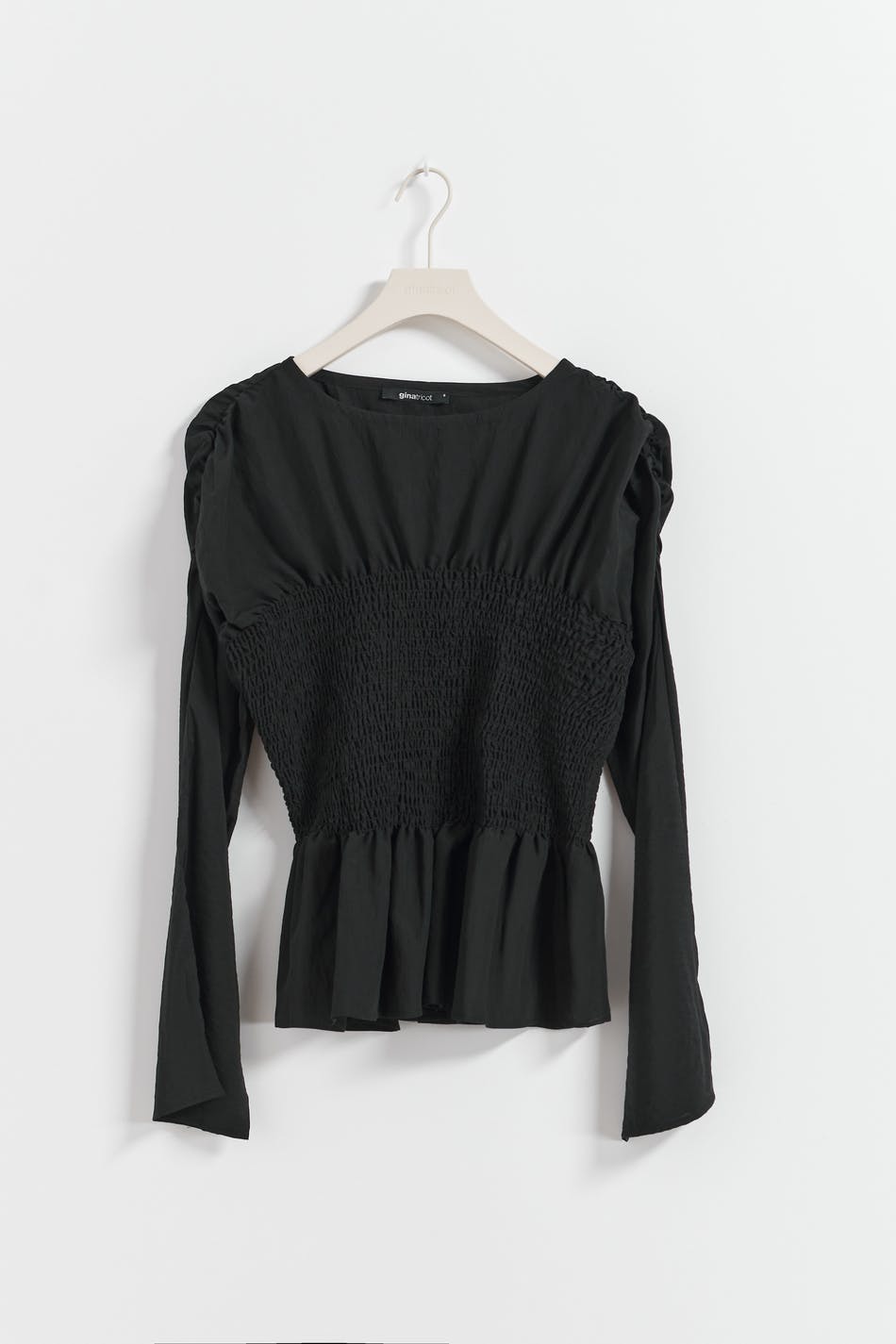 Long-sleeved blouse with smocking. The blouse is black and has ruching at the front and around the shoulders. It has frill at the bottom.