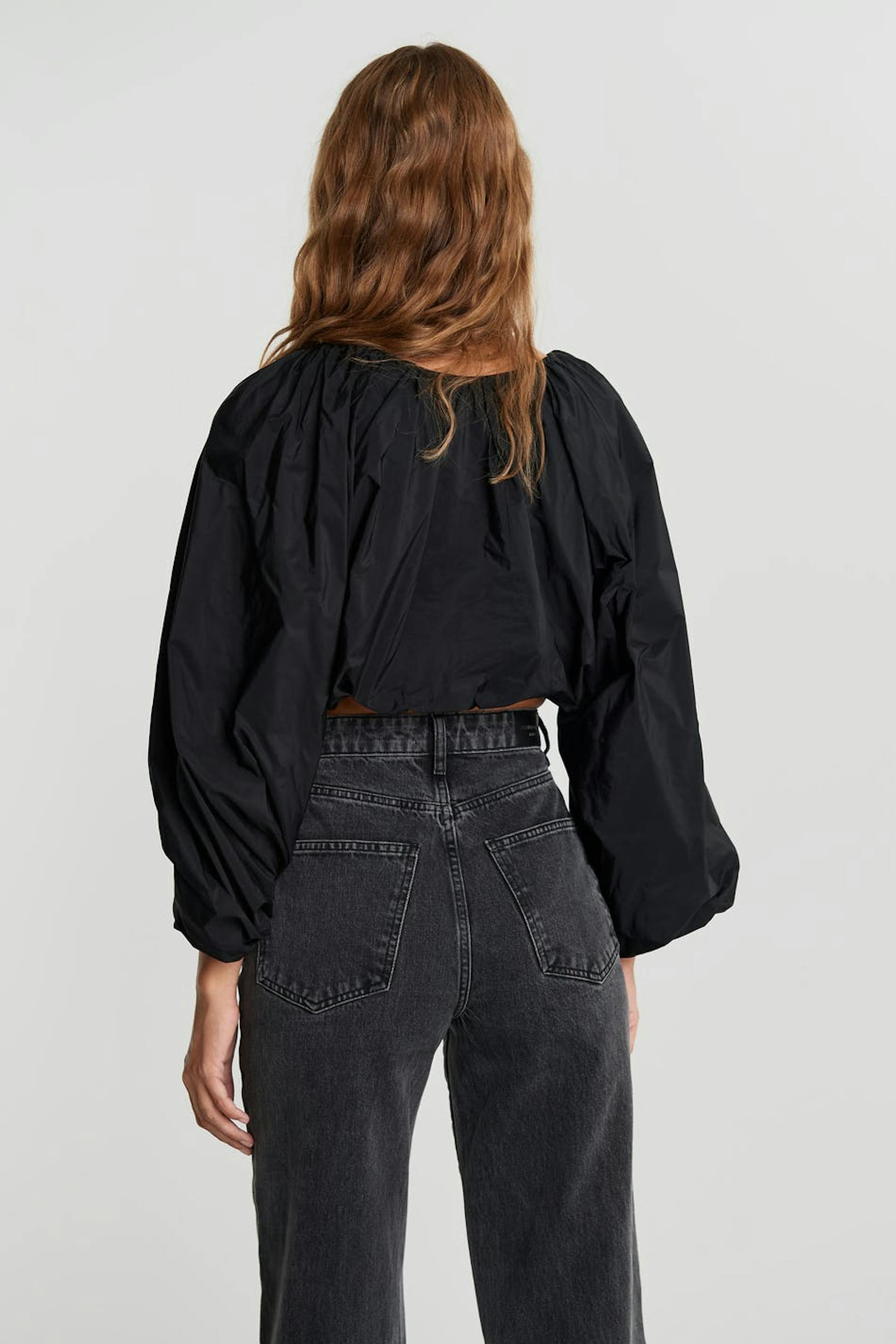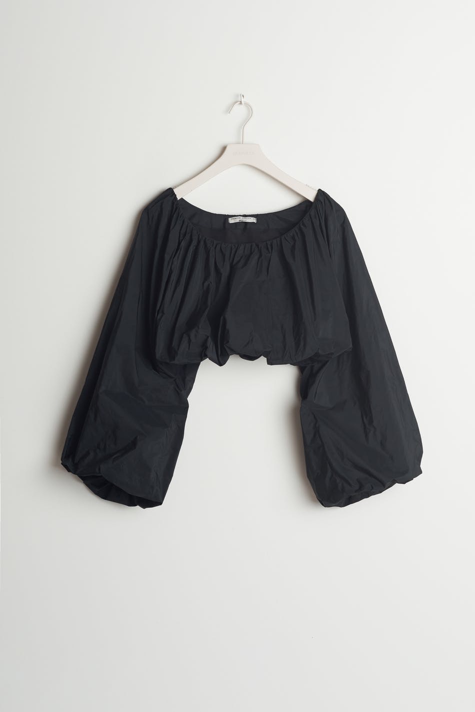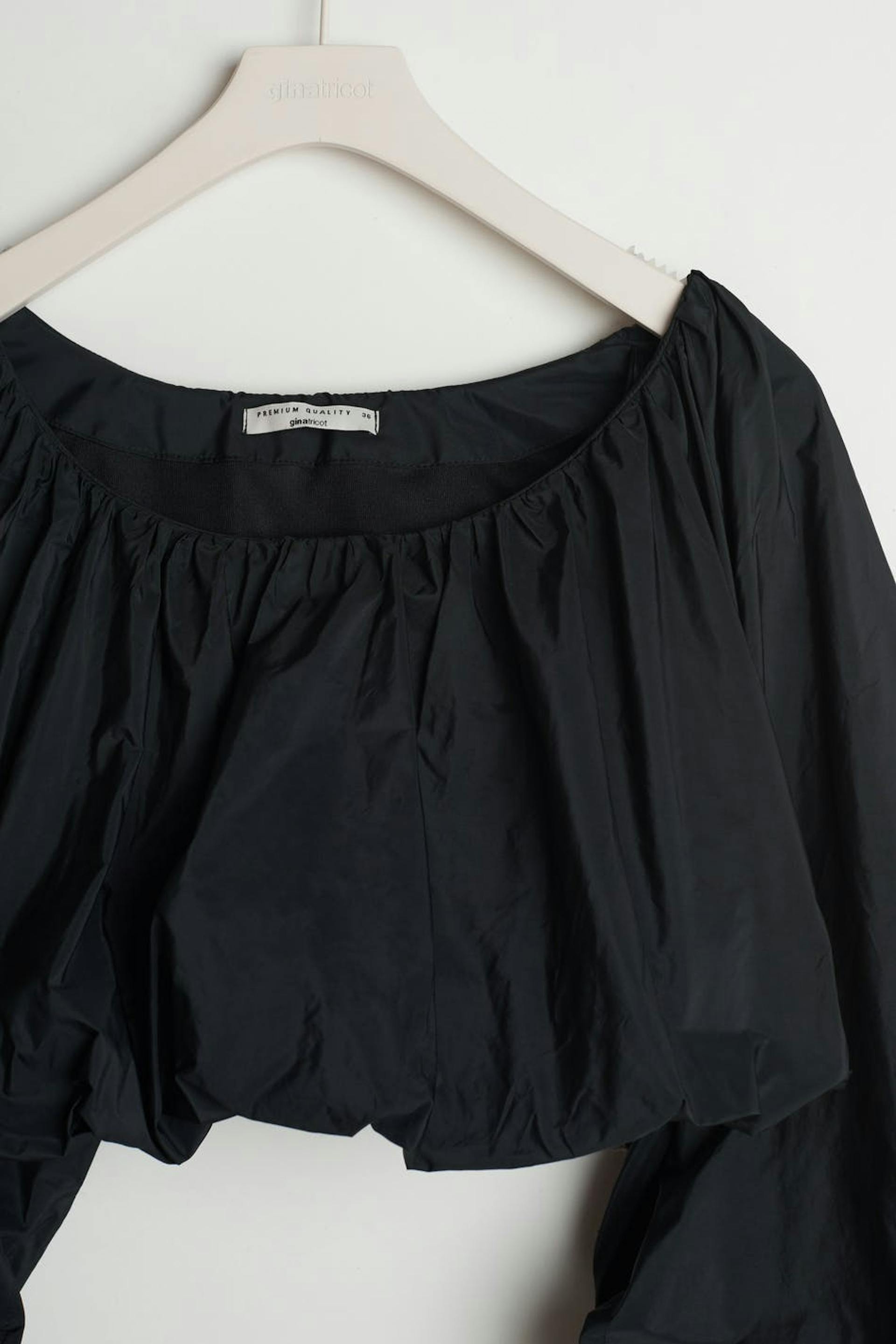 Short blouse with balloon sleeves. The blouse is black and has ruching. It has a crew neckline.