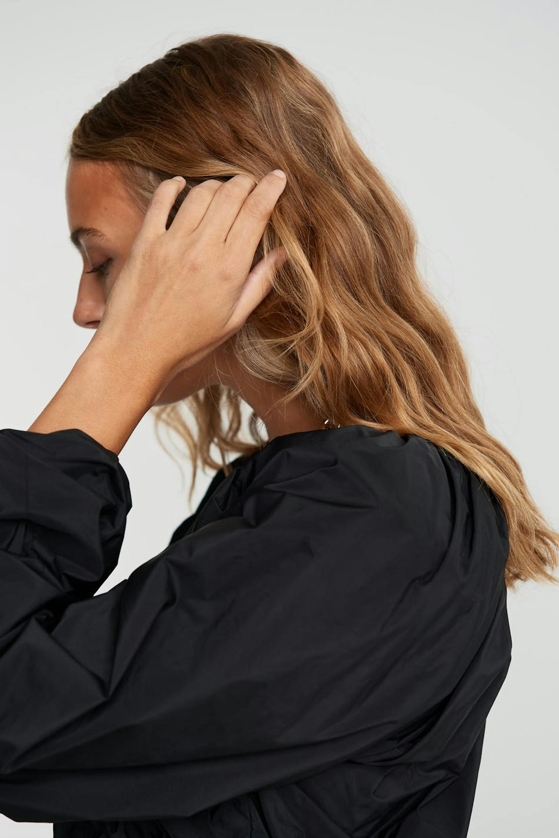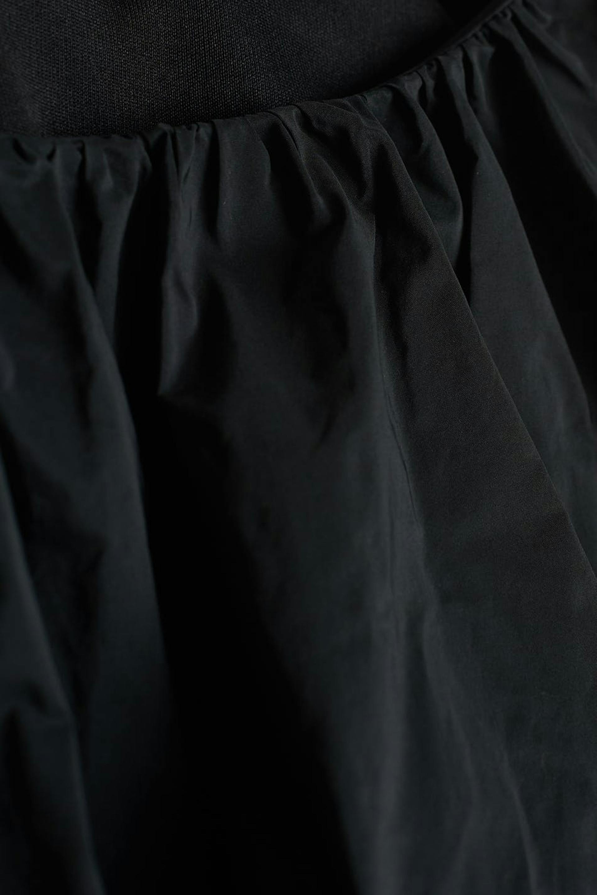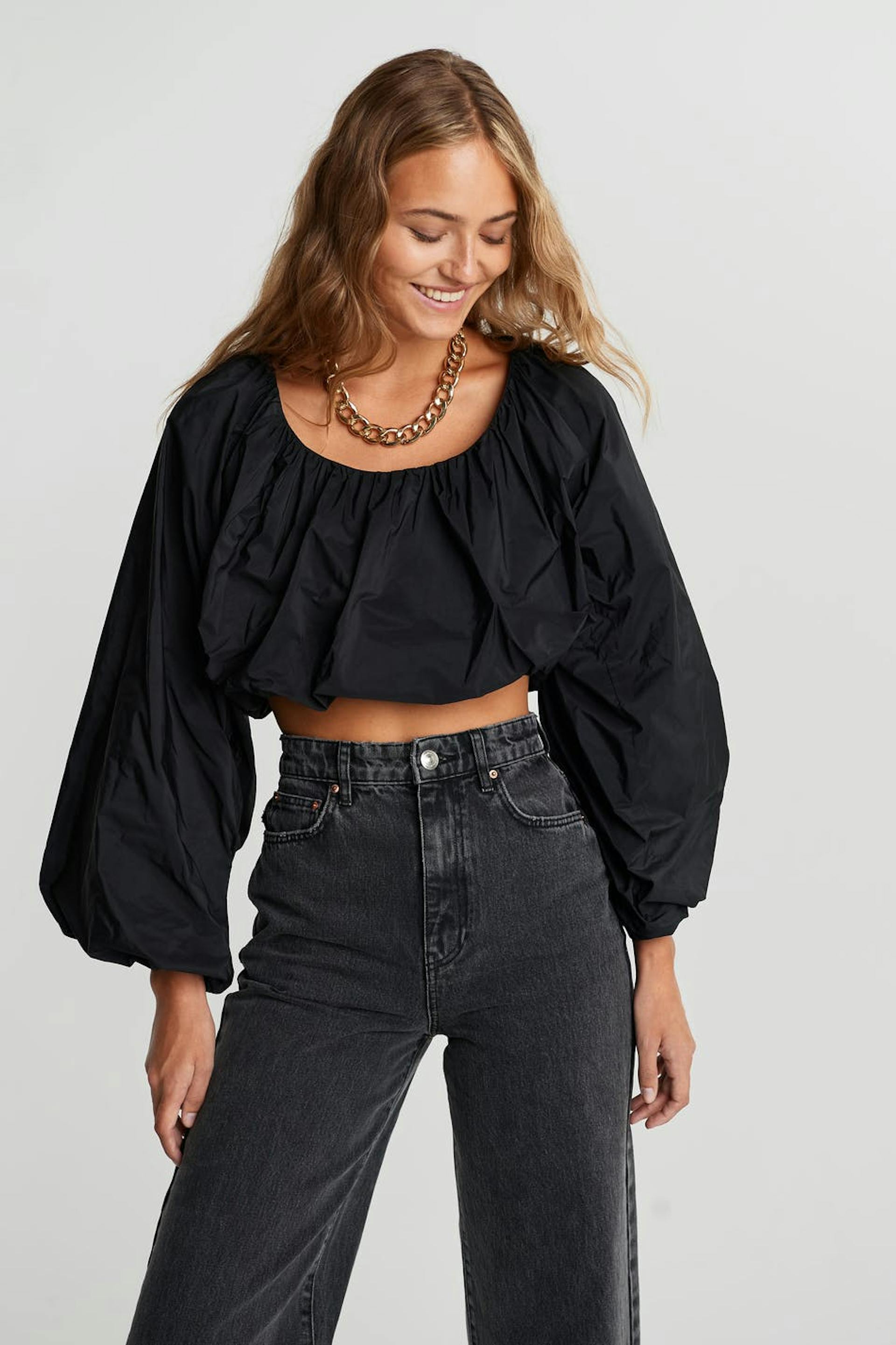 Short blouse with balloon sleeves. The blouse is black and has ruching. It has a crew neckline.