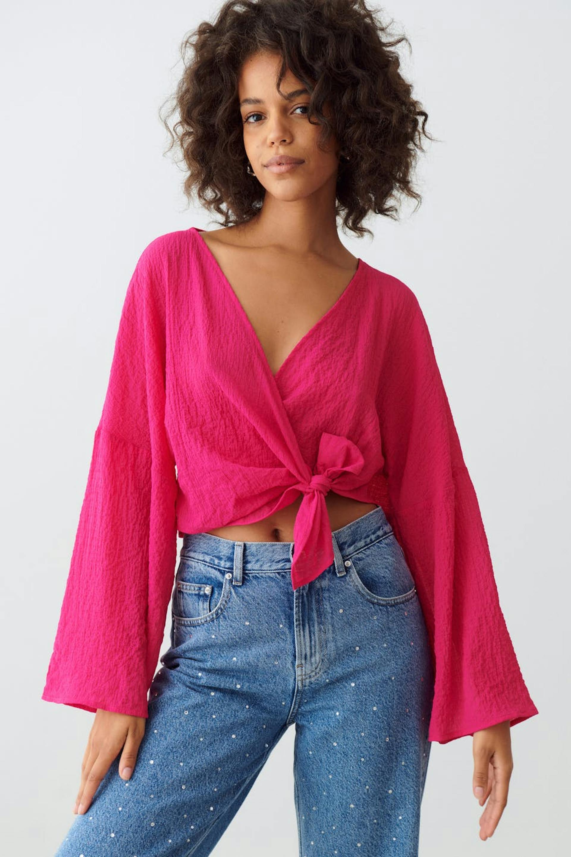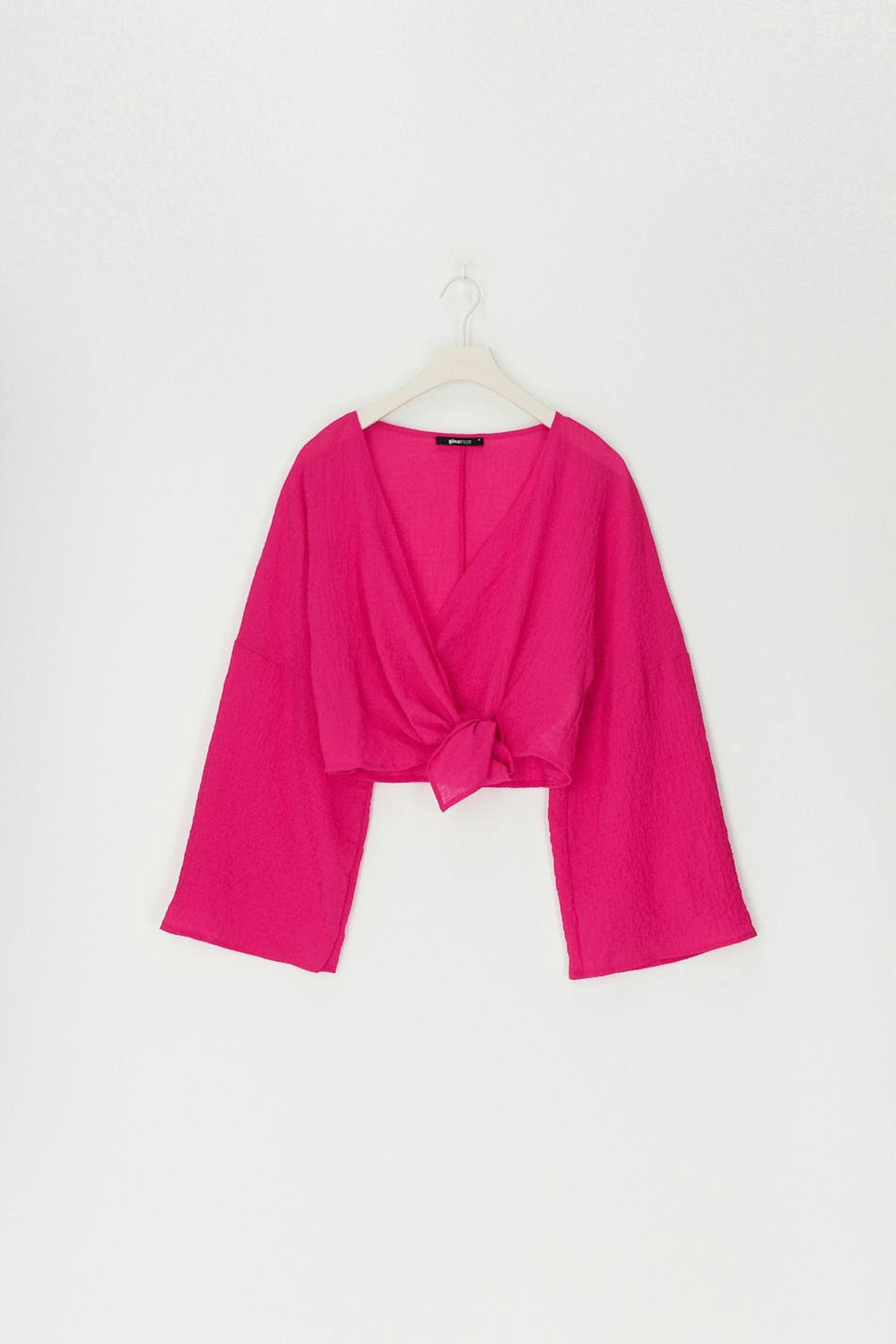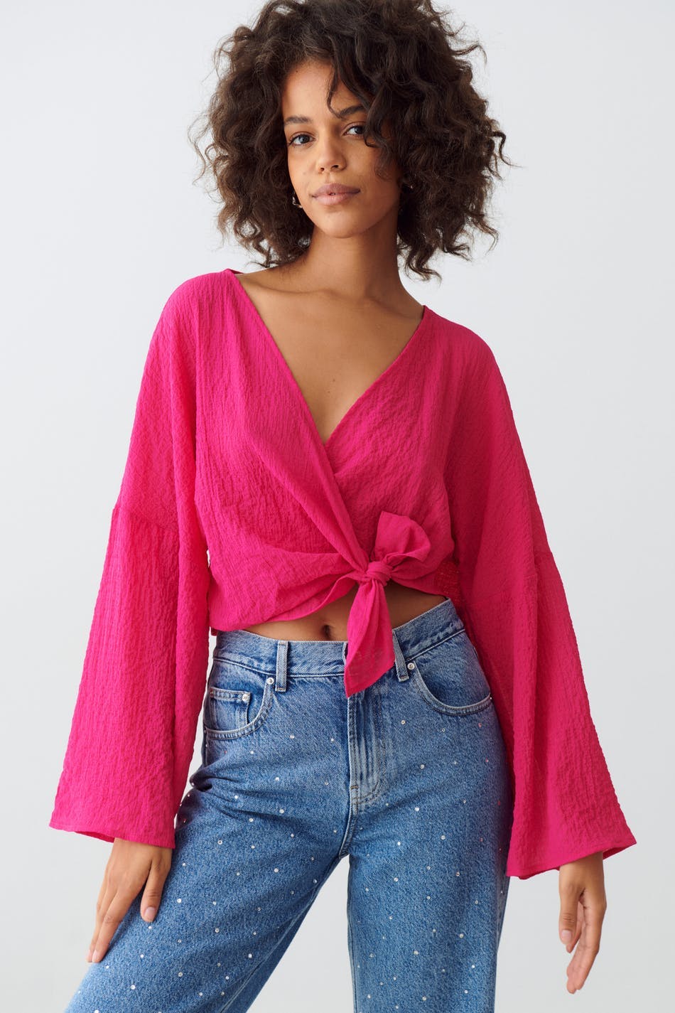 Cropped wrap blouse with knot closure at the front. The blouse is pink and has v neckline. It has dropped shoulders and lantern sleeves.