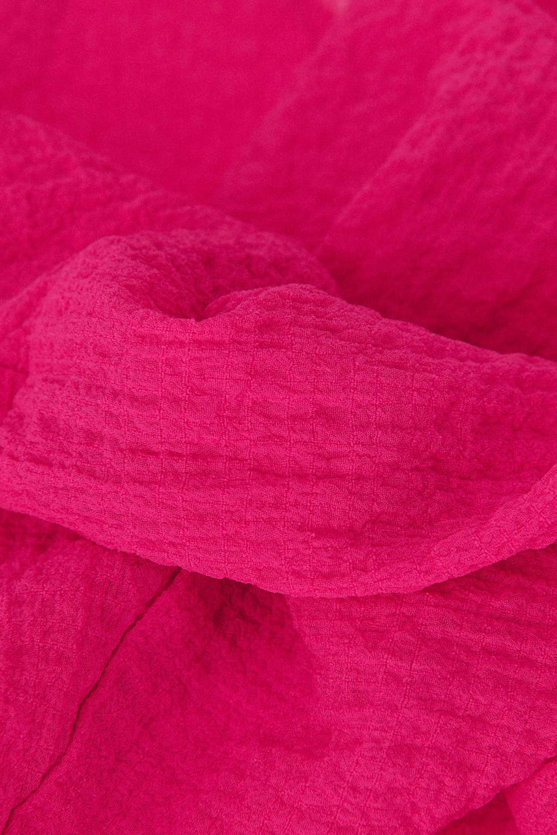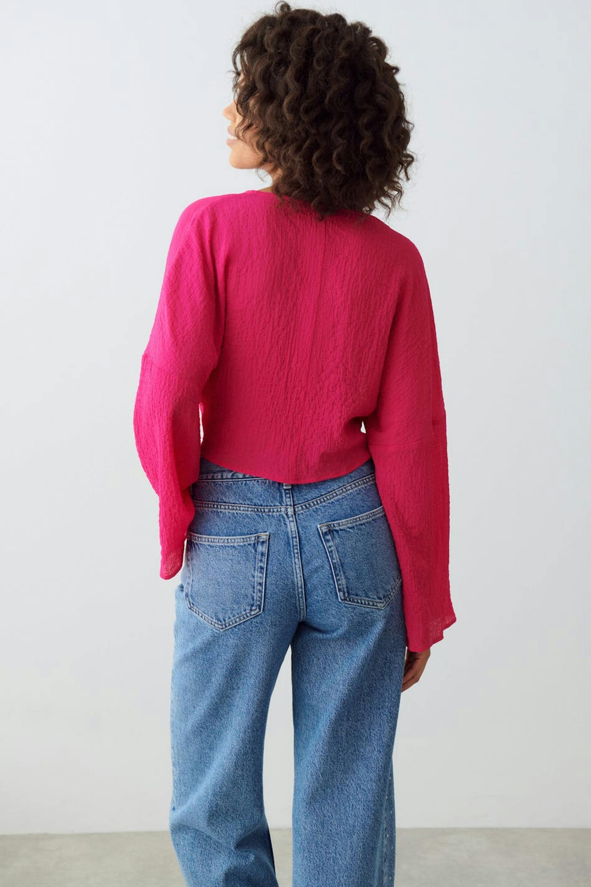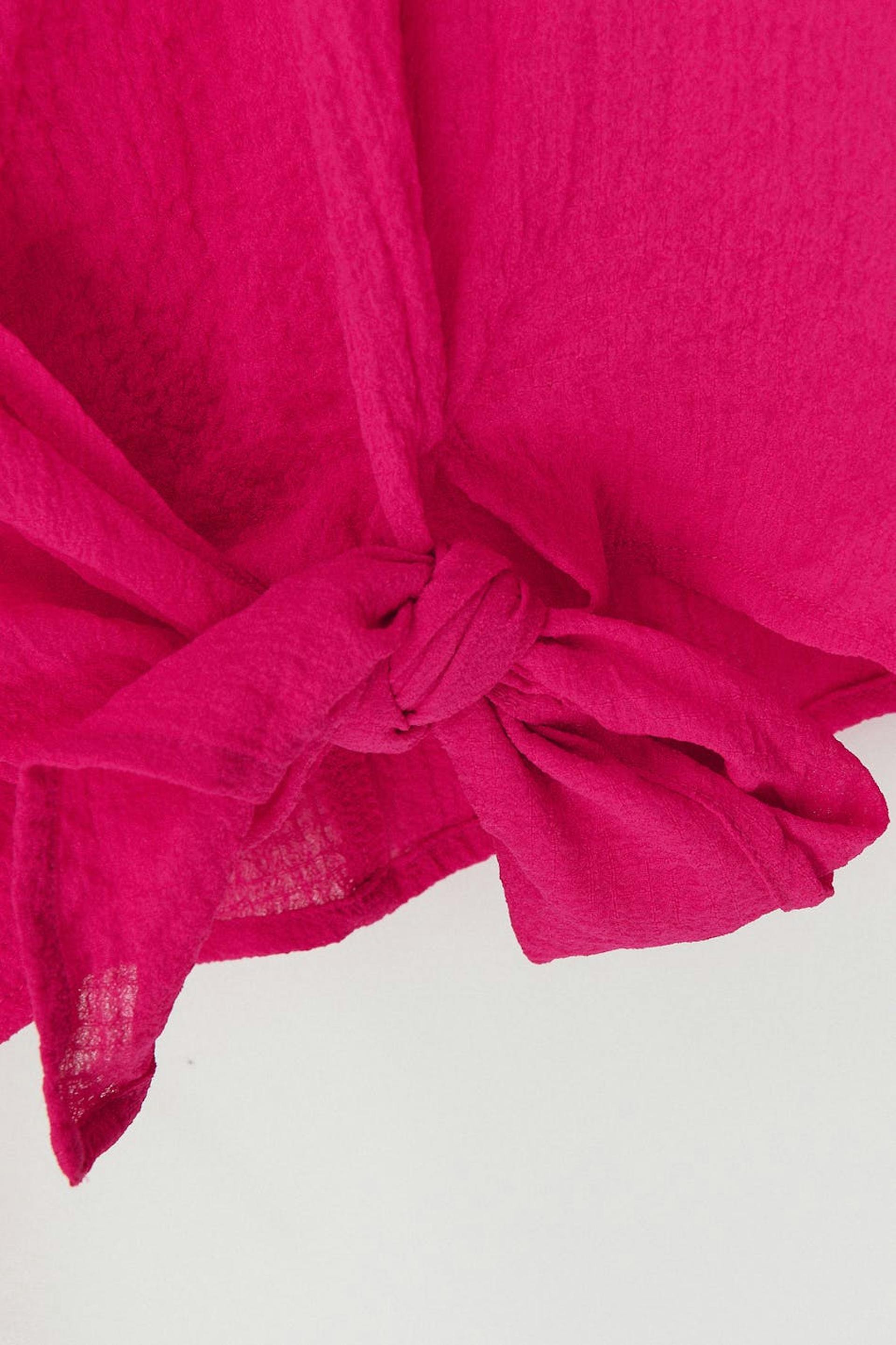Cropped wrap blouse with knot closure at the front. The blouse is pink and has v neckline. It has dropped shoulders and lantern sleeves.