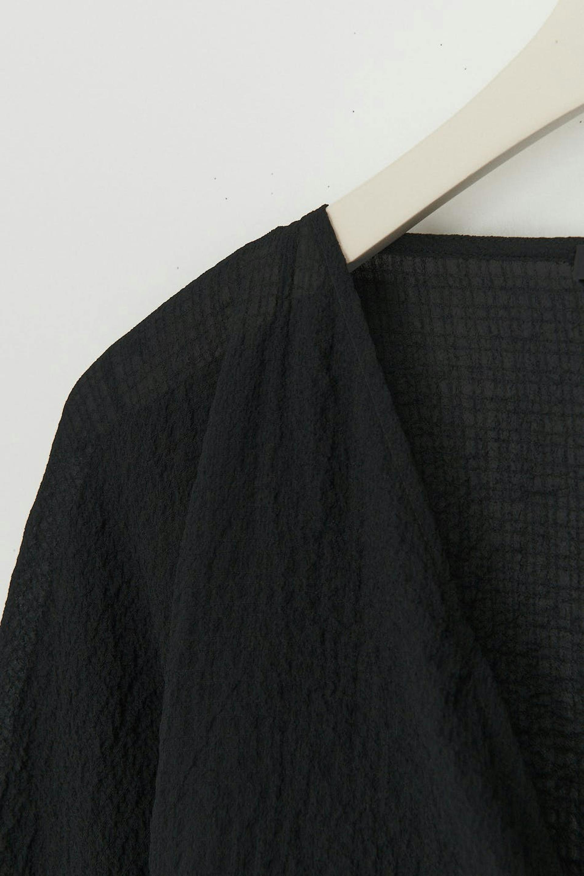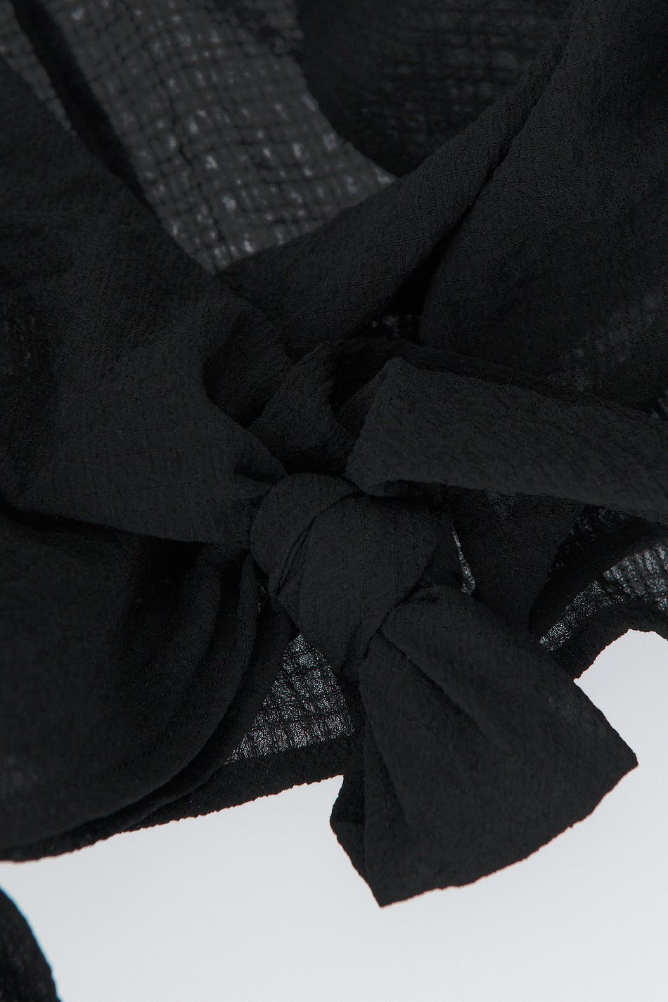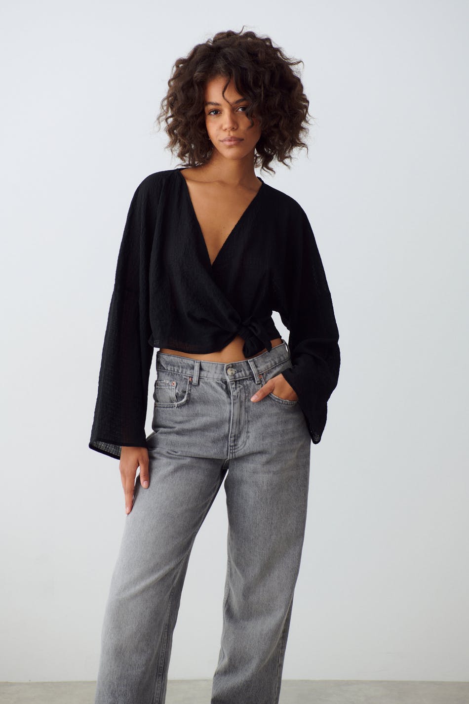Cropped wrap blouse with knot closure at the front. The blouse is black and has v neckline. It has dropped shoulders and lantern sleeves.