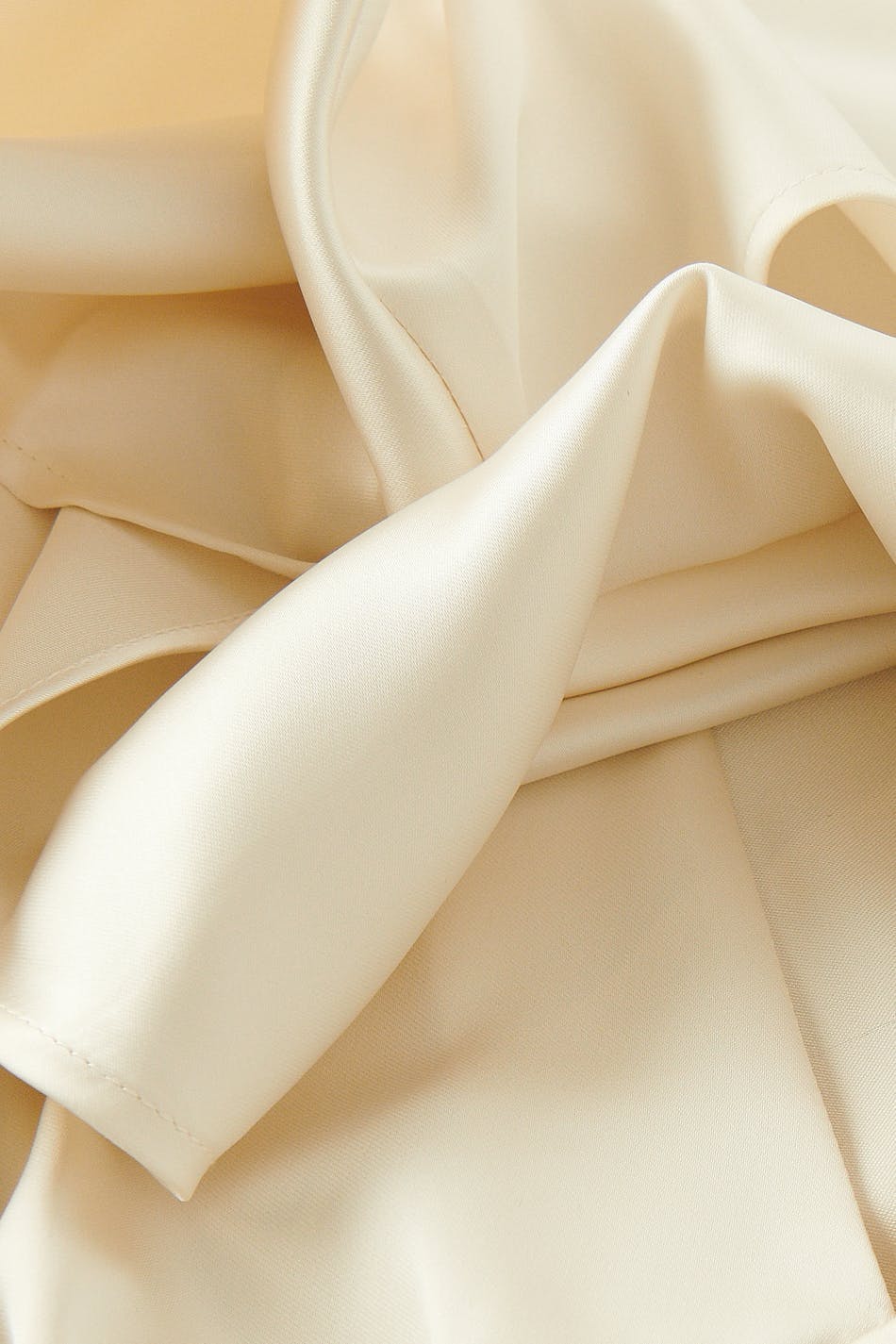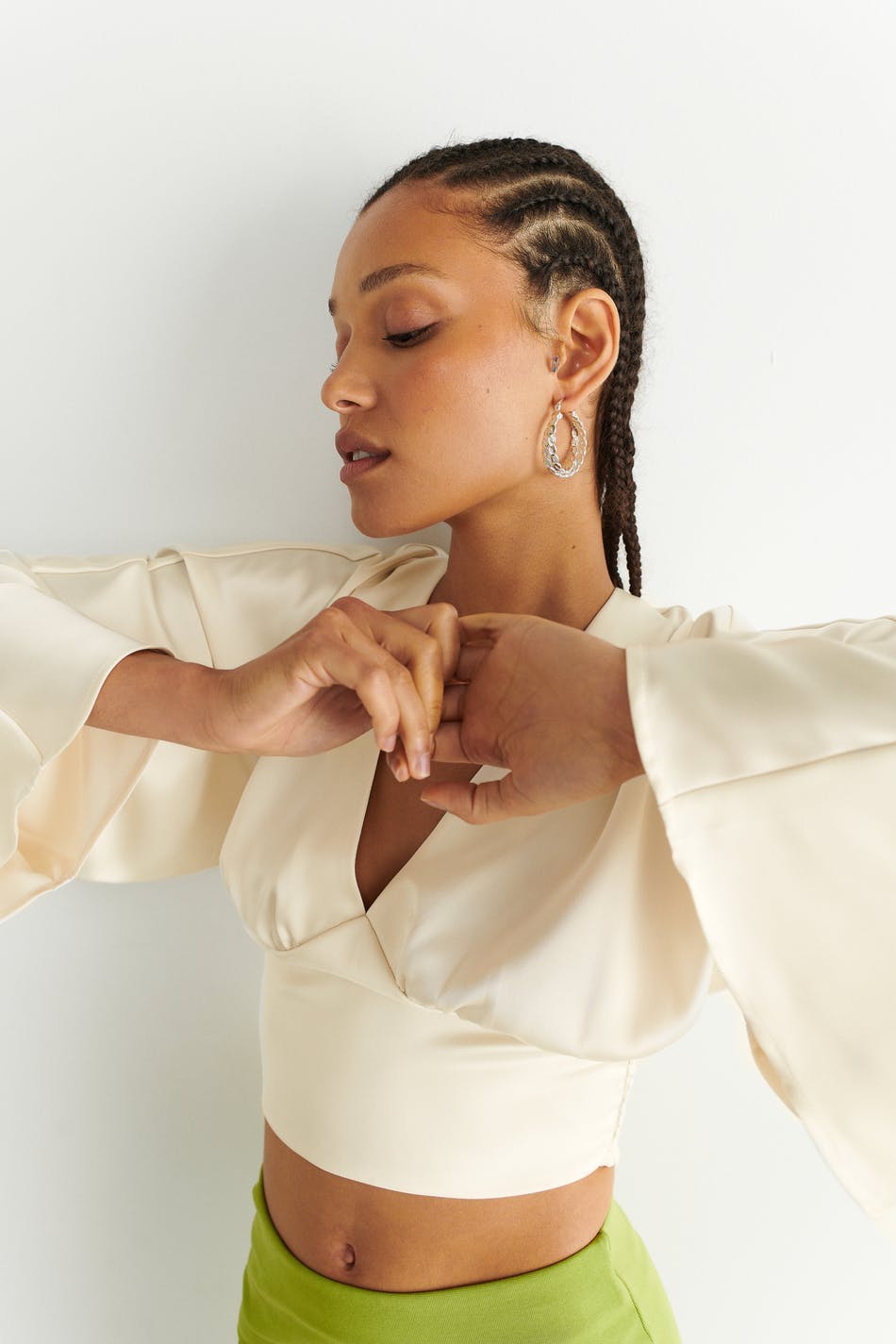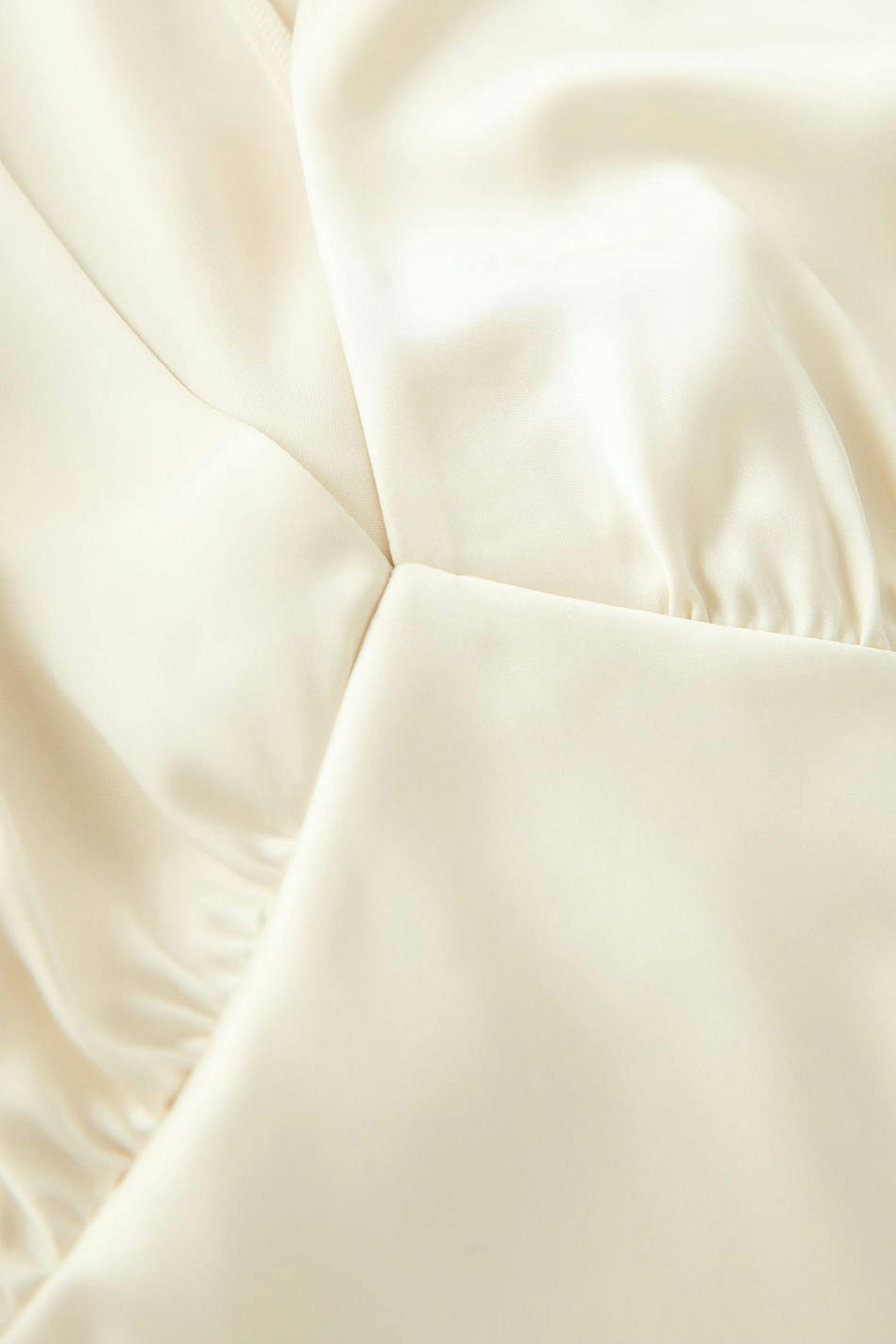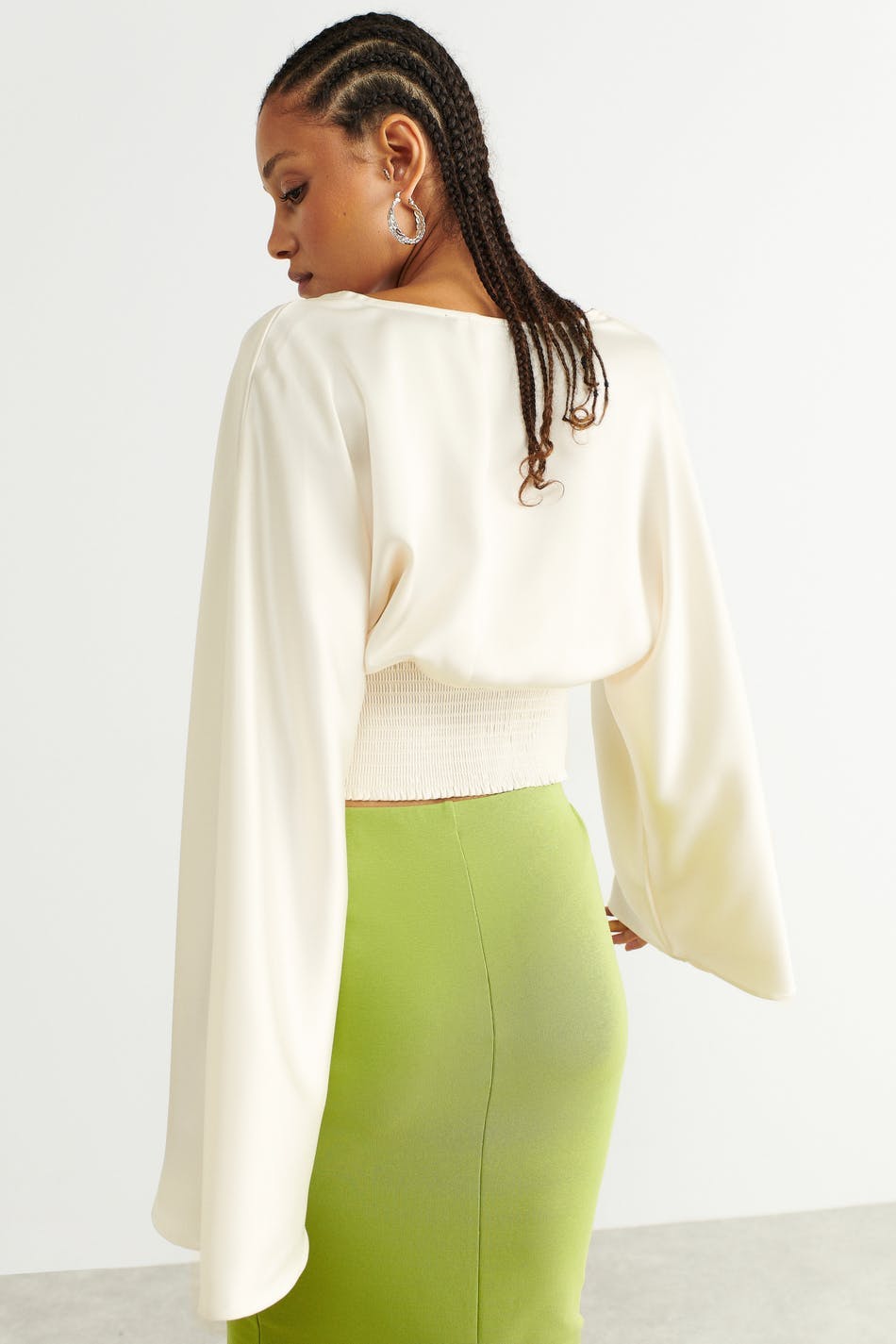 Long-sleeved satin blouse with v neckline. The satin blouse is white and has a fitted waist. It has loose, flared sleeves, cropped length, smocking at the back and a decorative seam detail below the bust.