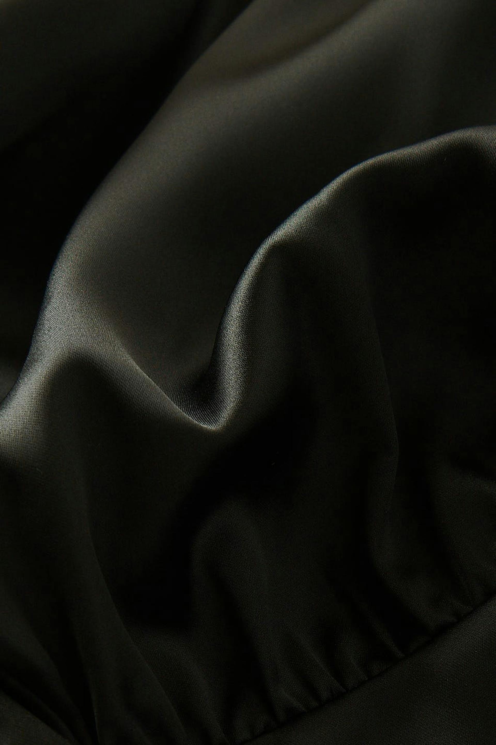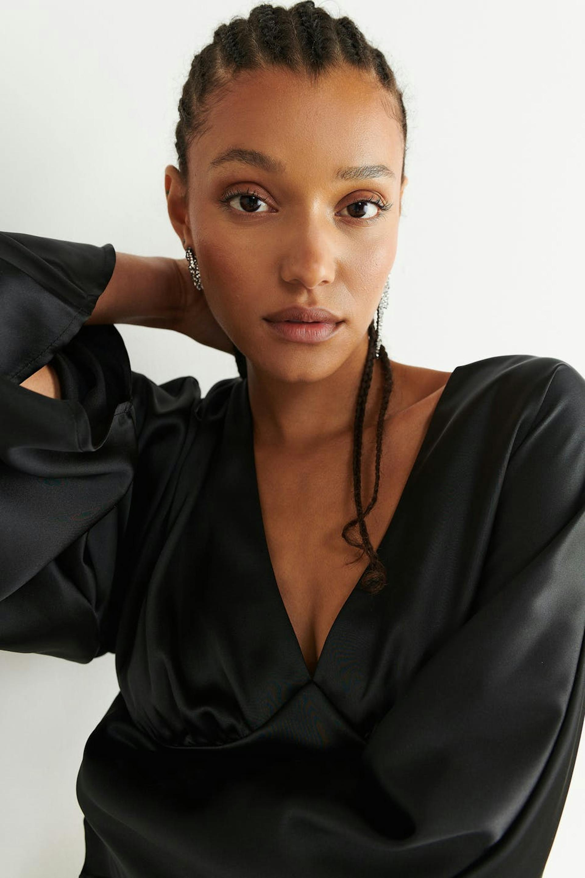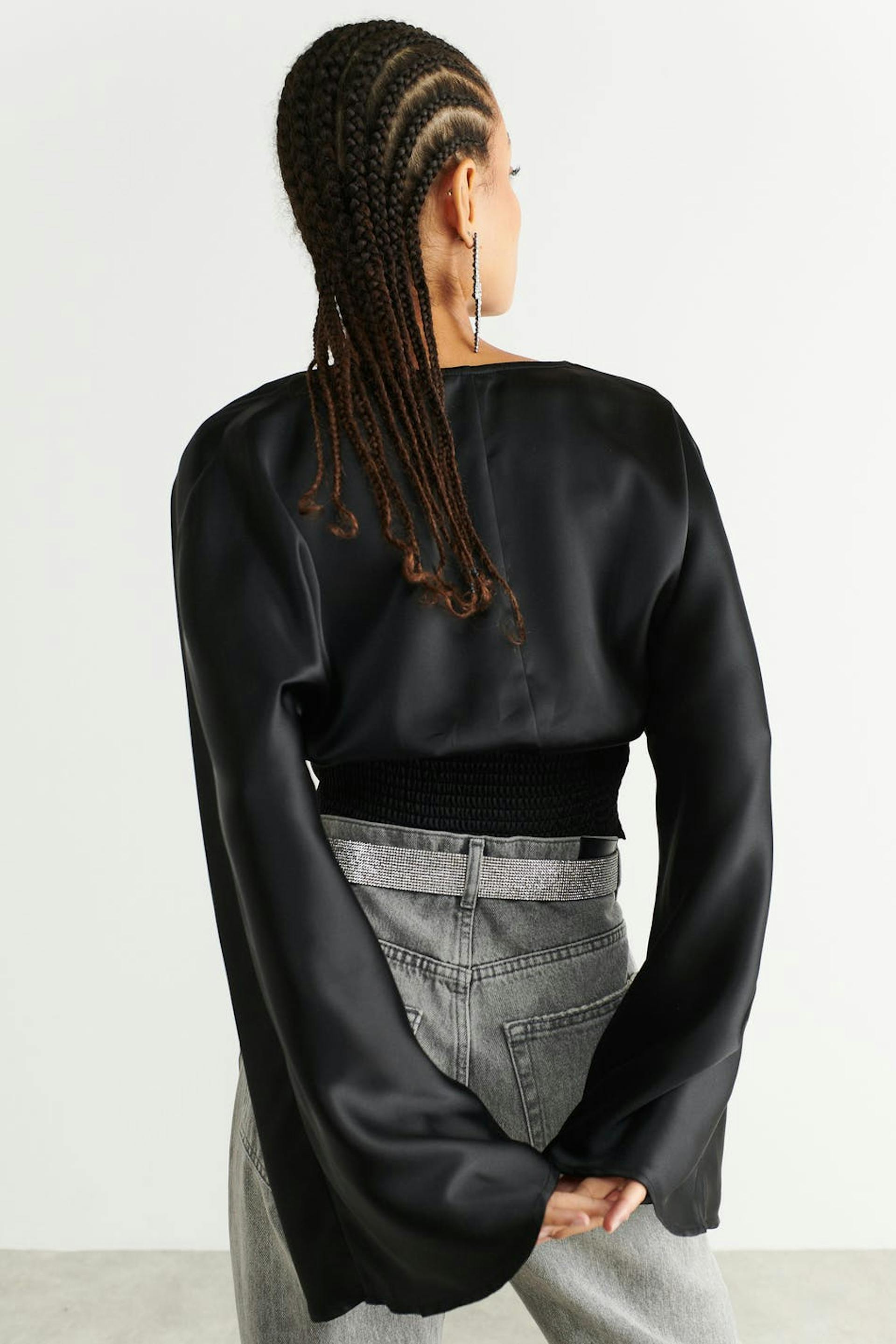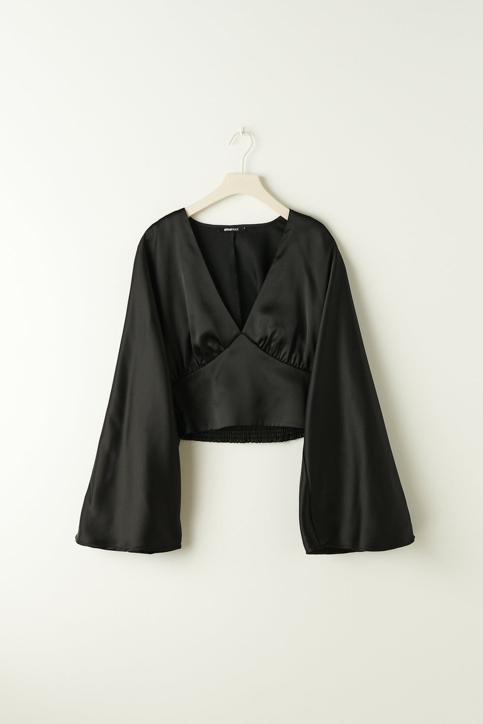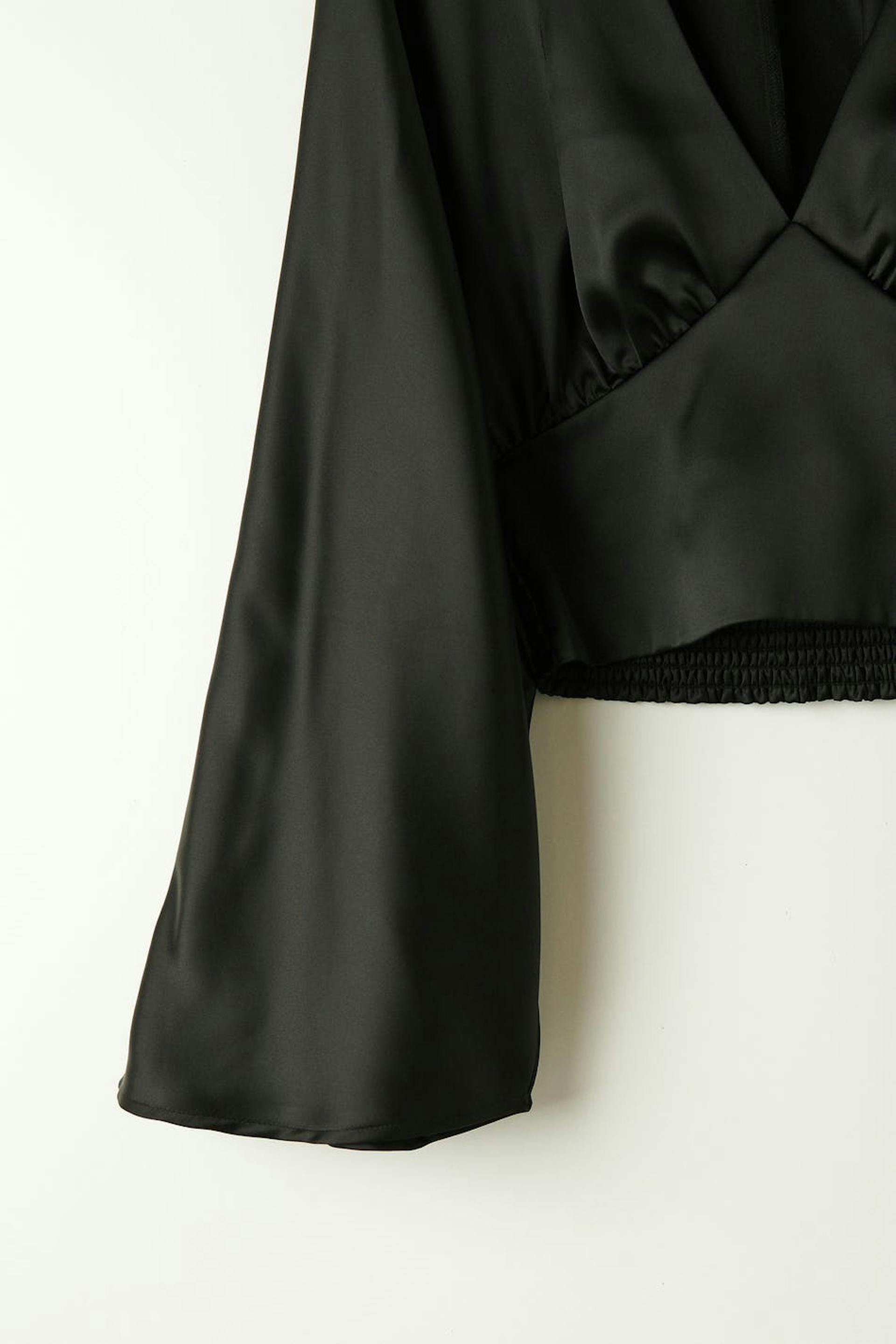 Long-sleeved satin blouse with v neckline. The satin blouse is black and has a fitted waist. It has loose, flared sleeves, cropped length, smocking at the back and a decorative seam detail below the bust.