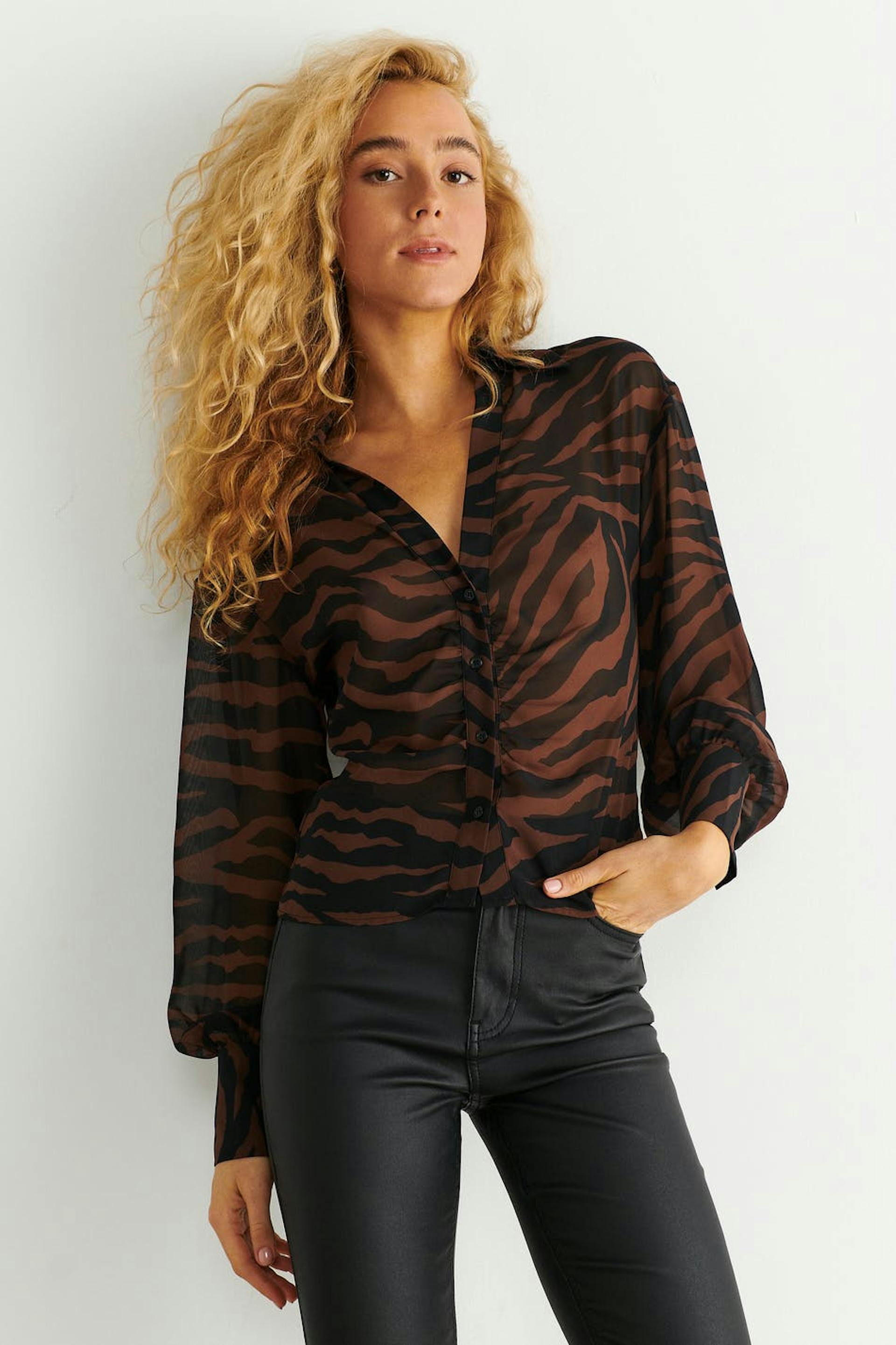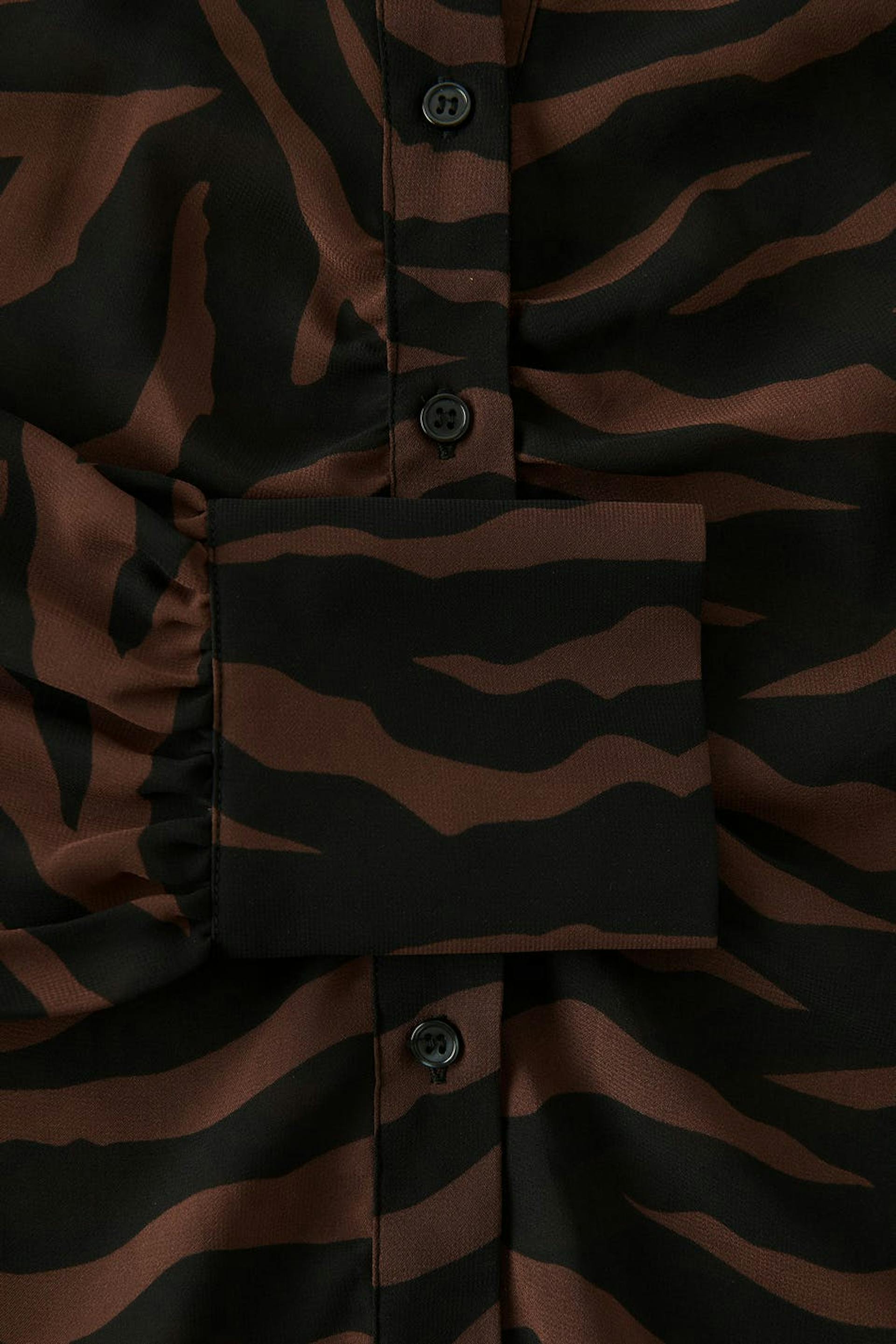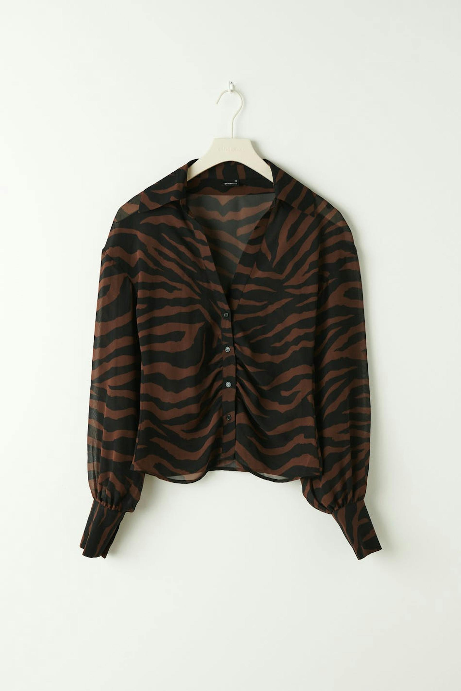 Zebra patterned blouse in chiffon with plunge neckline. The blouse is brown, black and sheer. It has relaxed fit with fitted waist and button placket in front with gathered details.