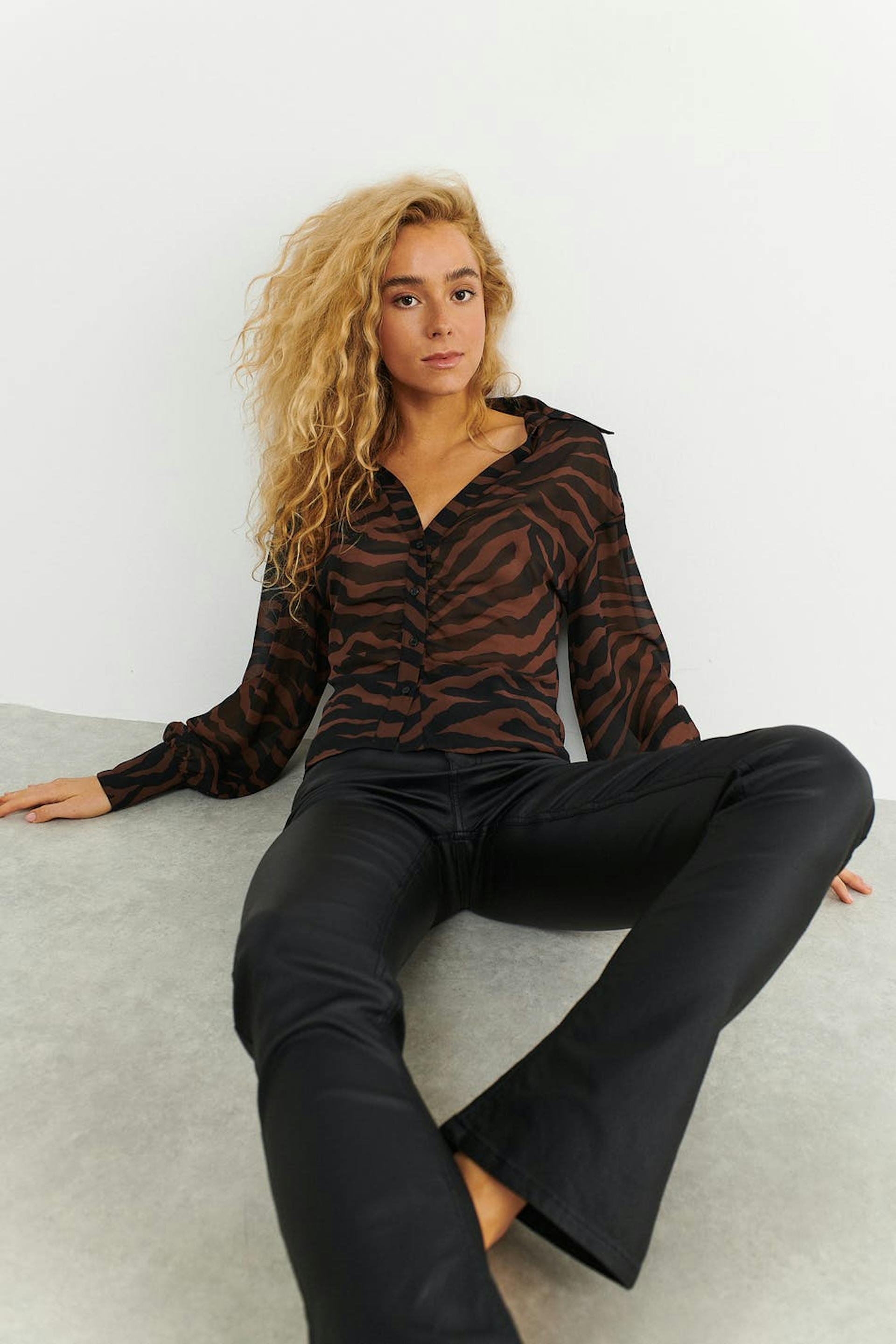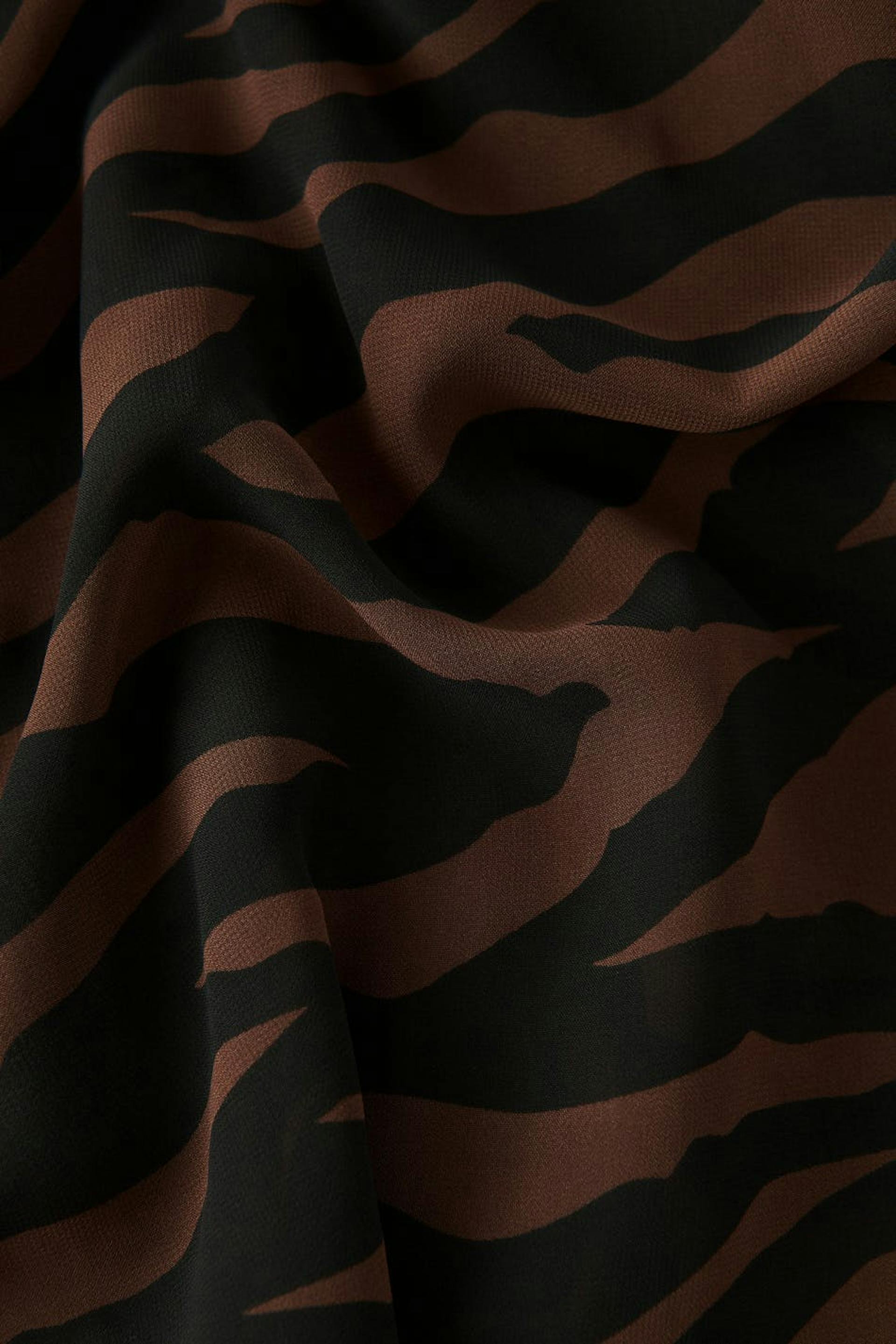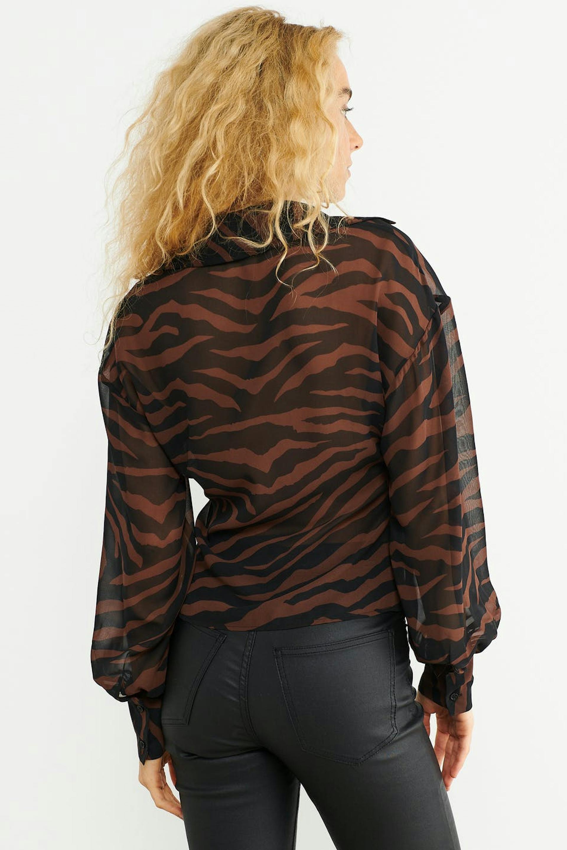 Zebra patterned blouse in chiffon with plunge neckline. The blouse is brown, black and sheer. It has relaxed fit with fitted waist and button placket in front with gathered details.
