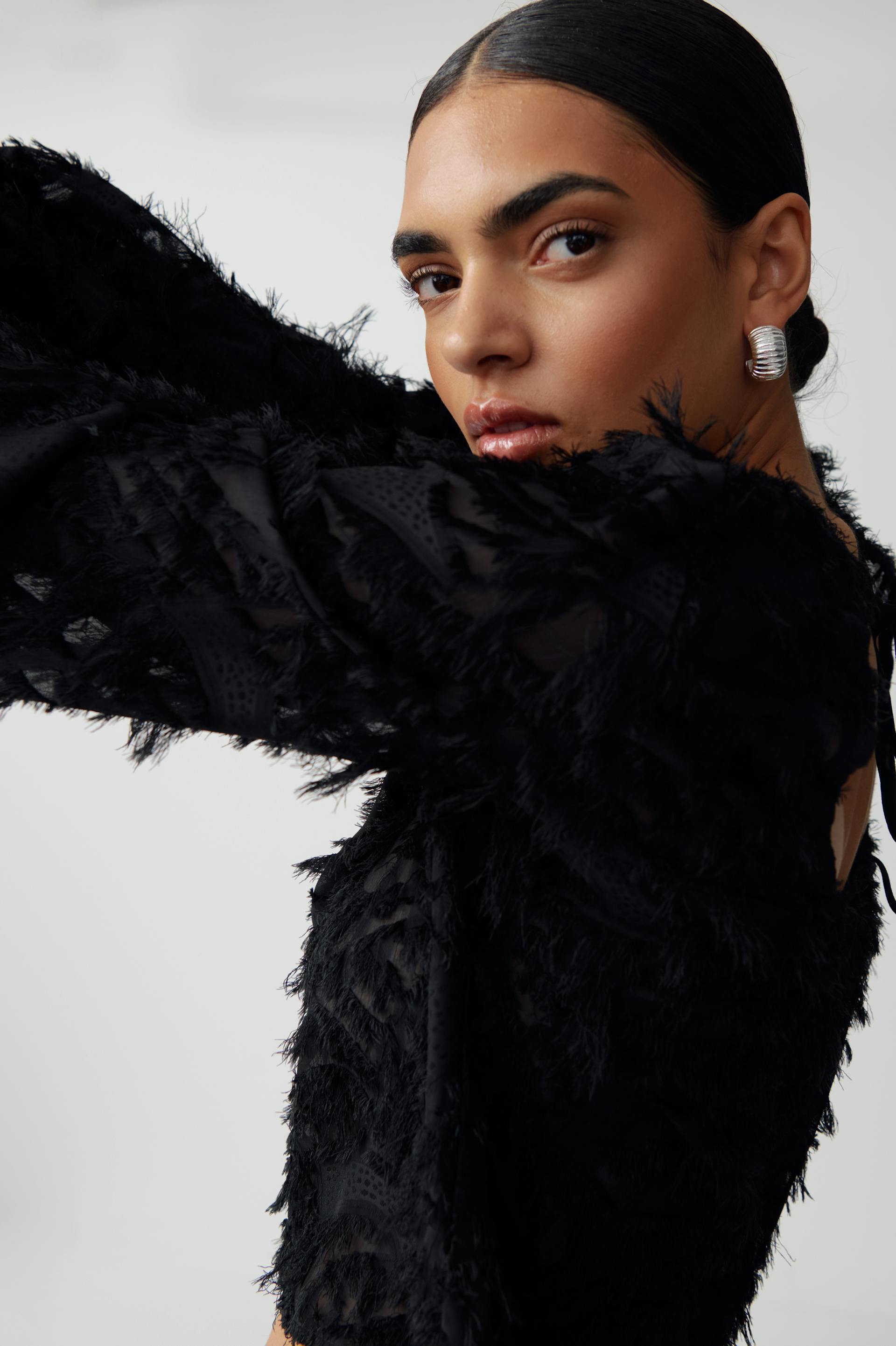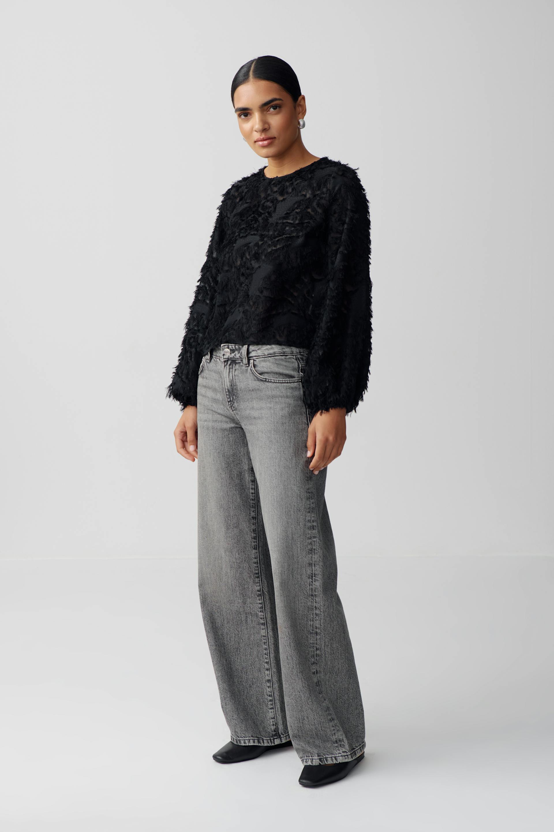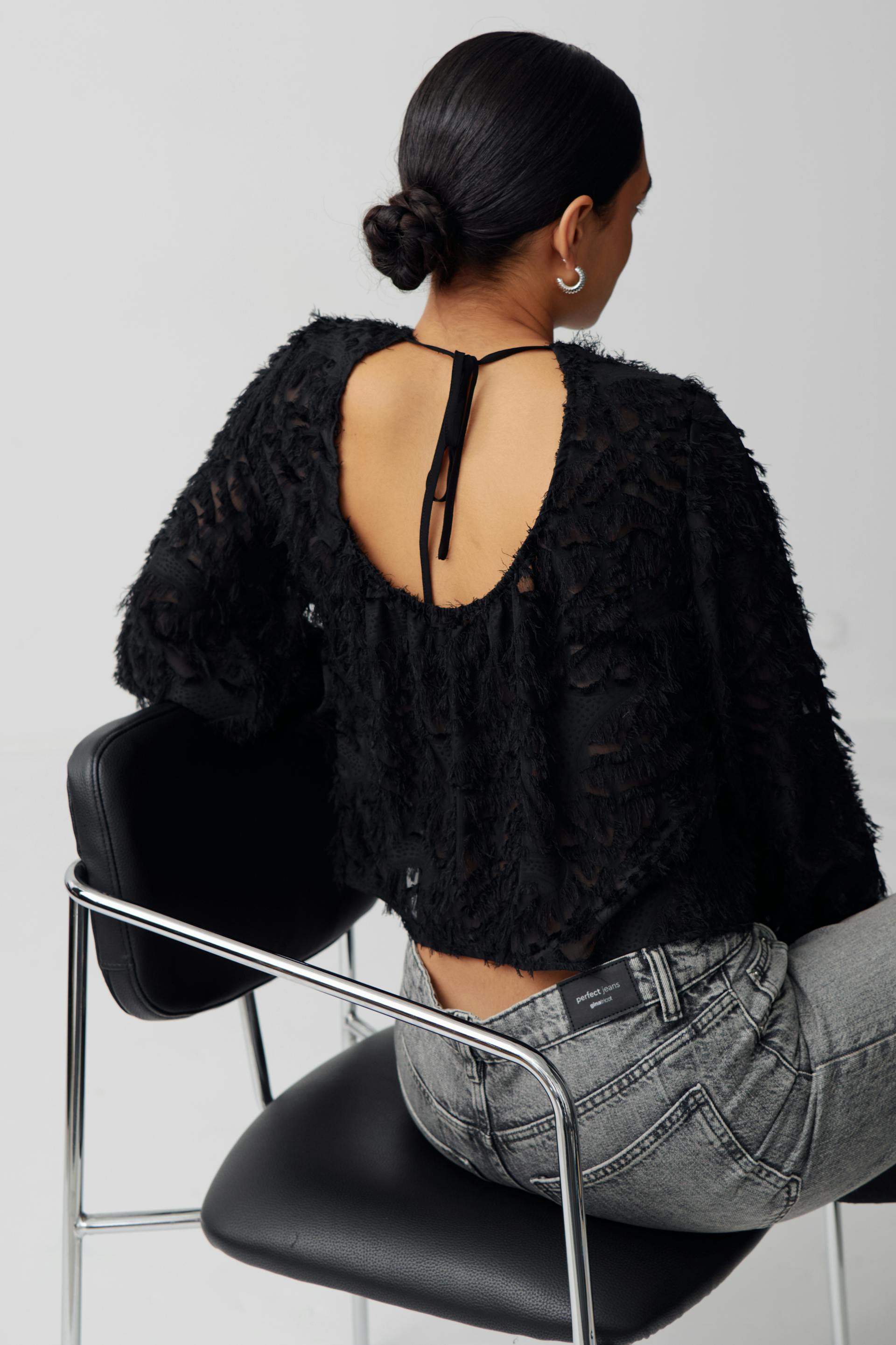 Long-sleeved top with open back. The top is black and has structured quality. It has regular fit and self-tie at the back.