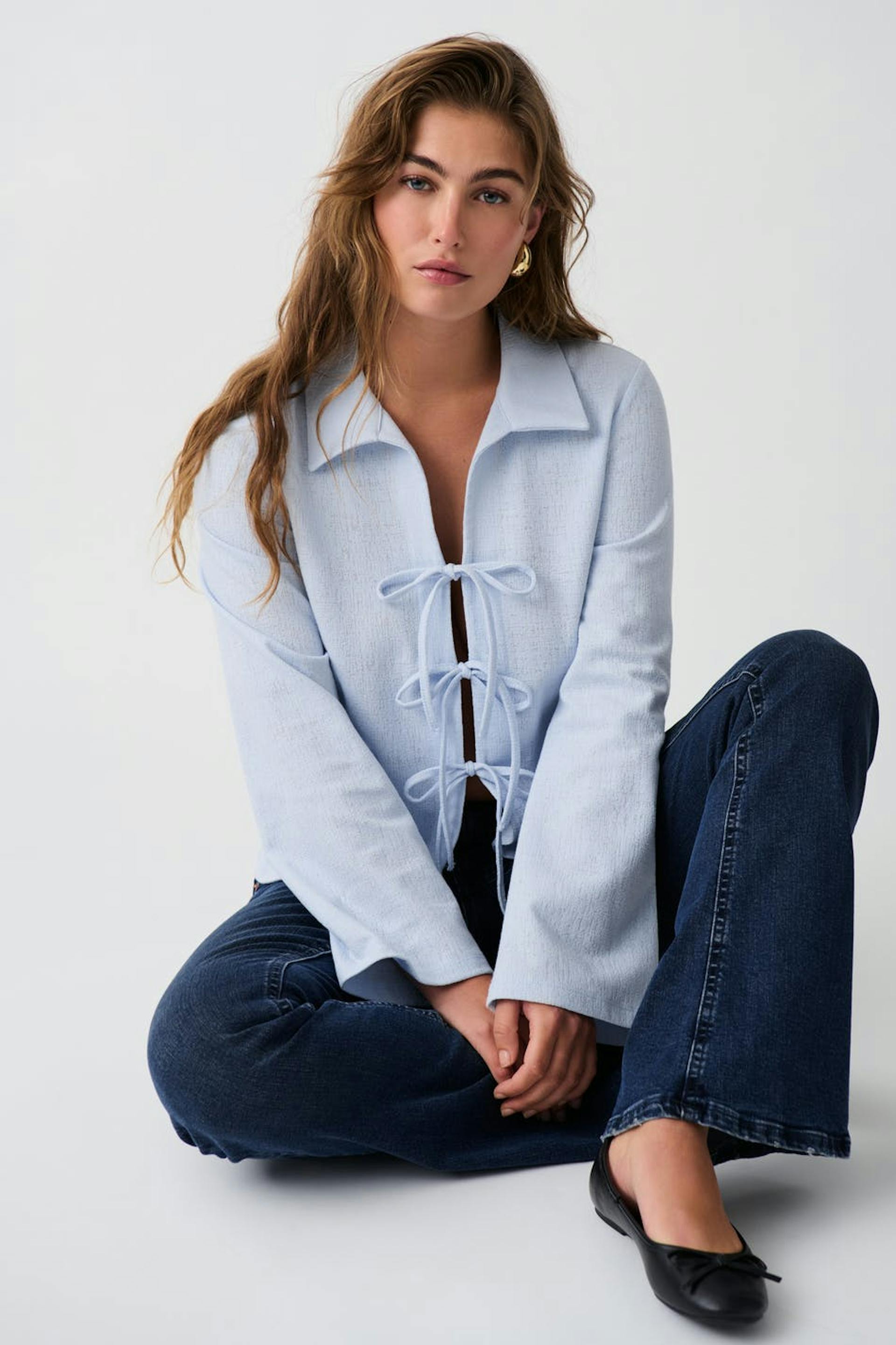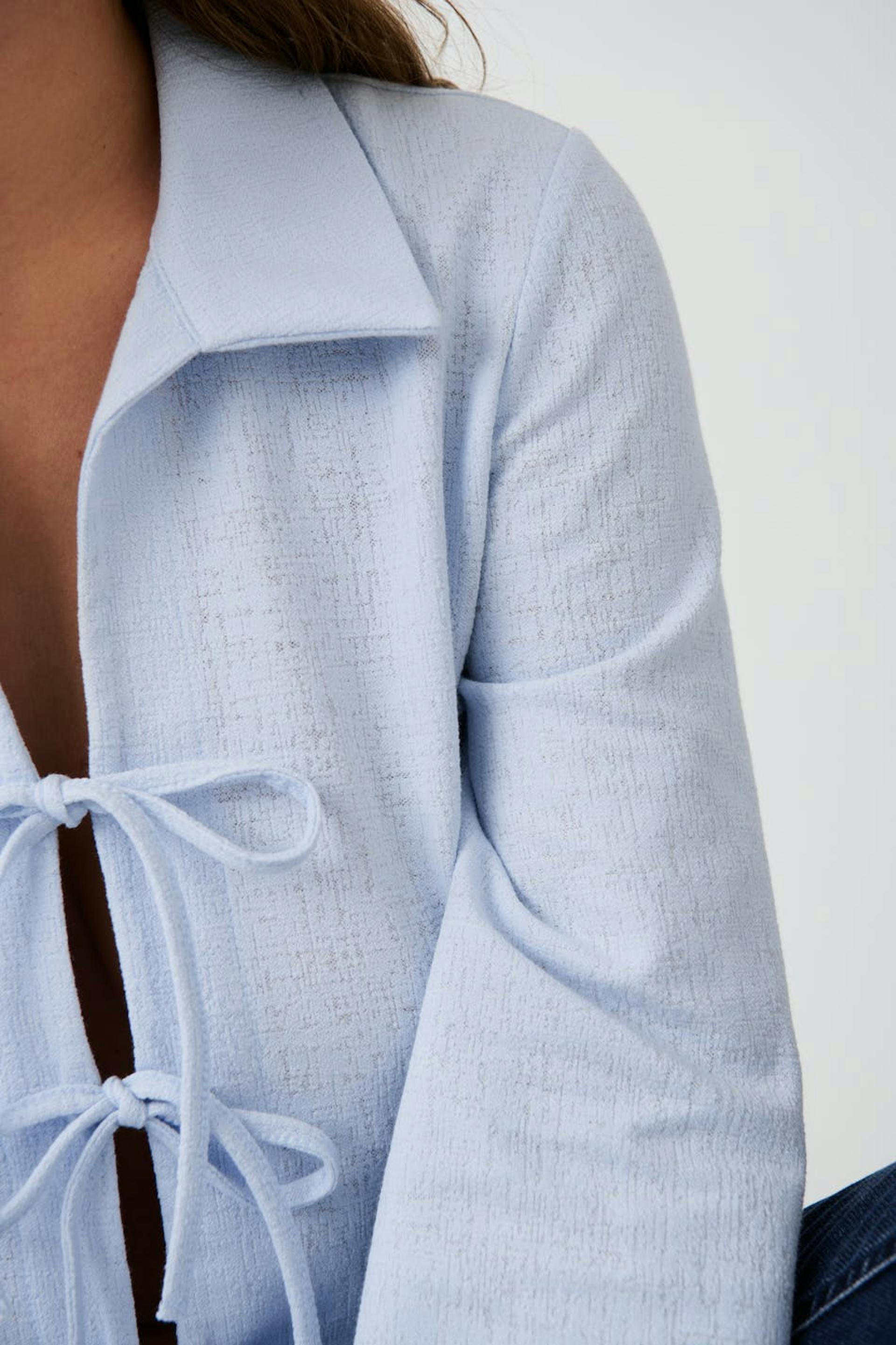Long-sleeved tie top in jersey with loose-fitting style. The top is blue and has a structured material. It has collar, regular length and knot closure at the front.