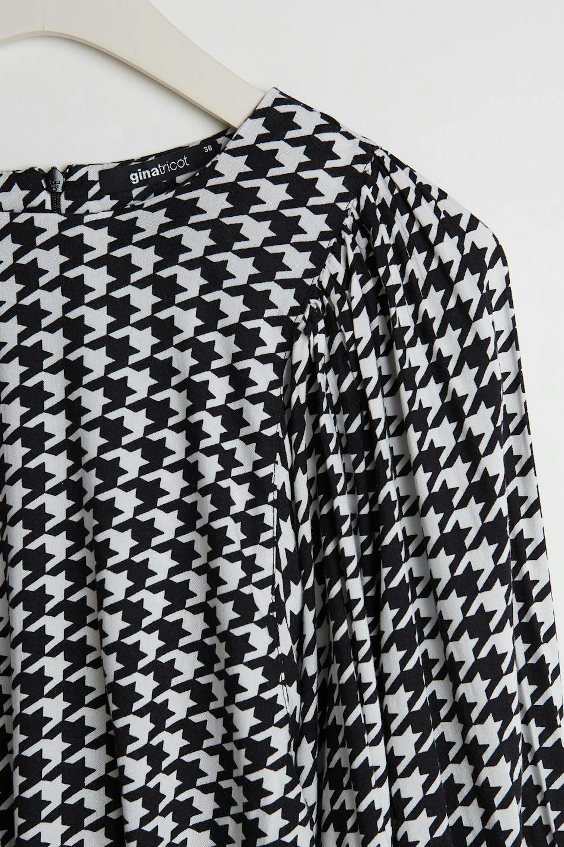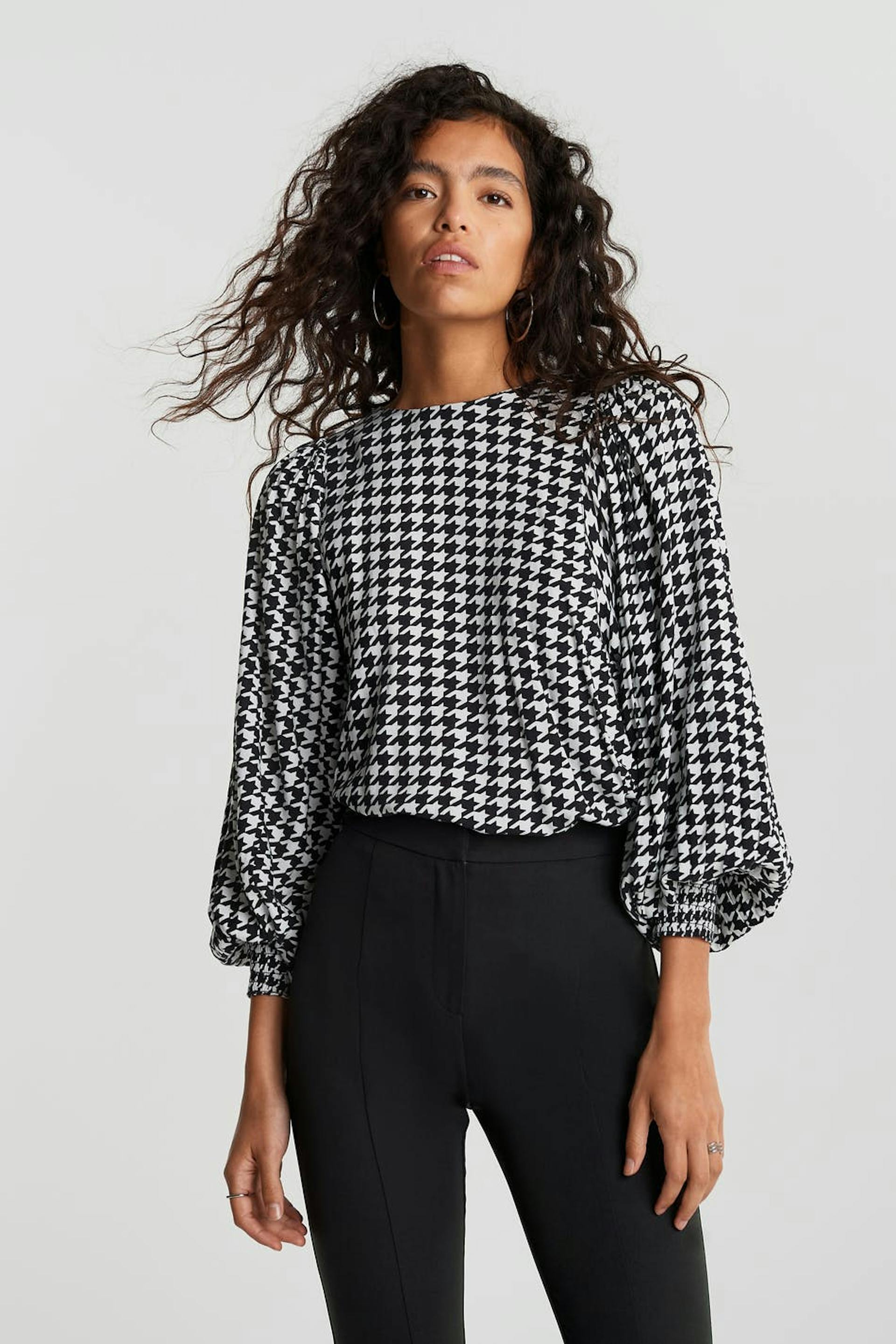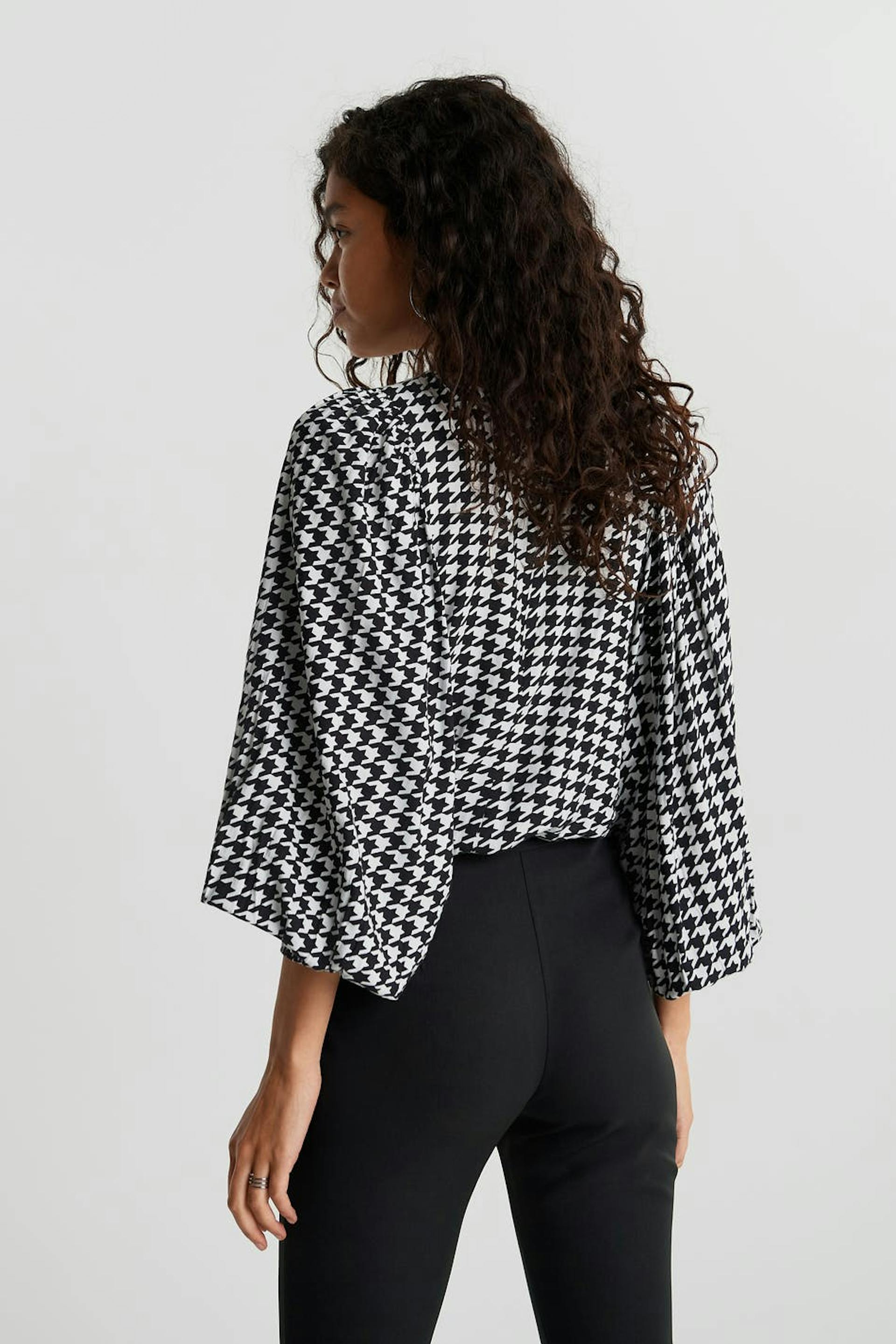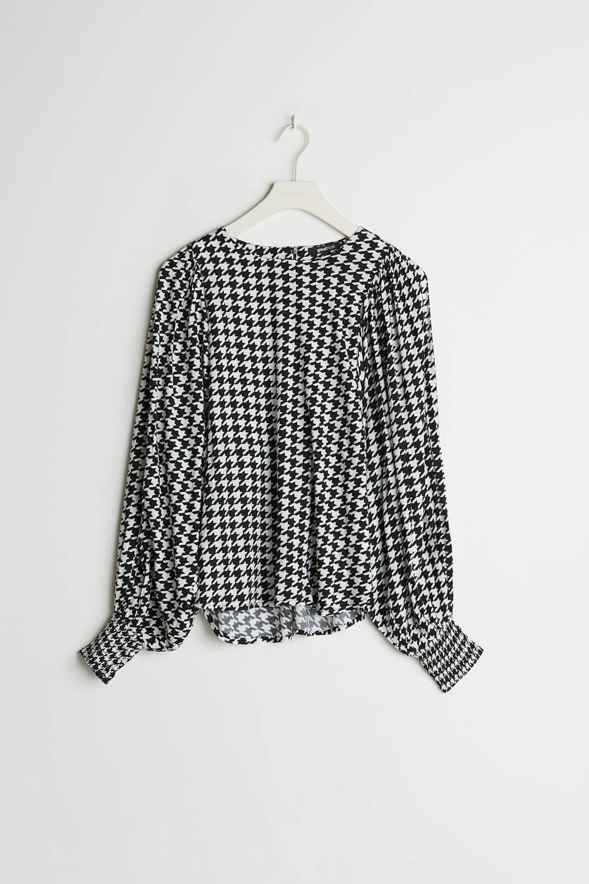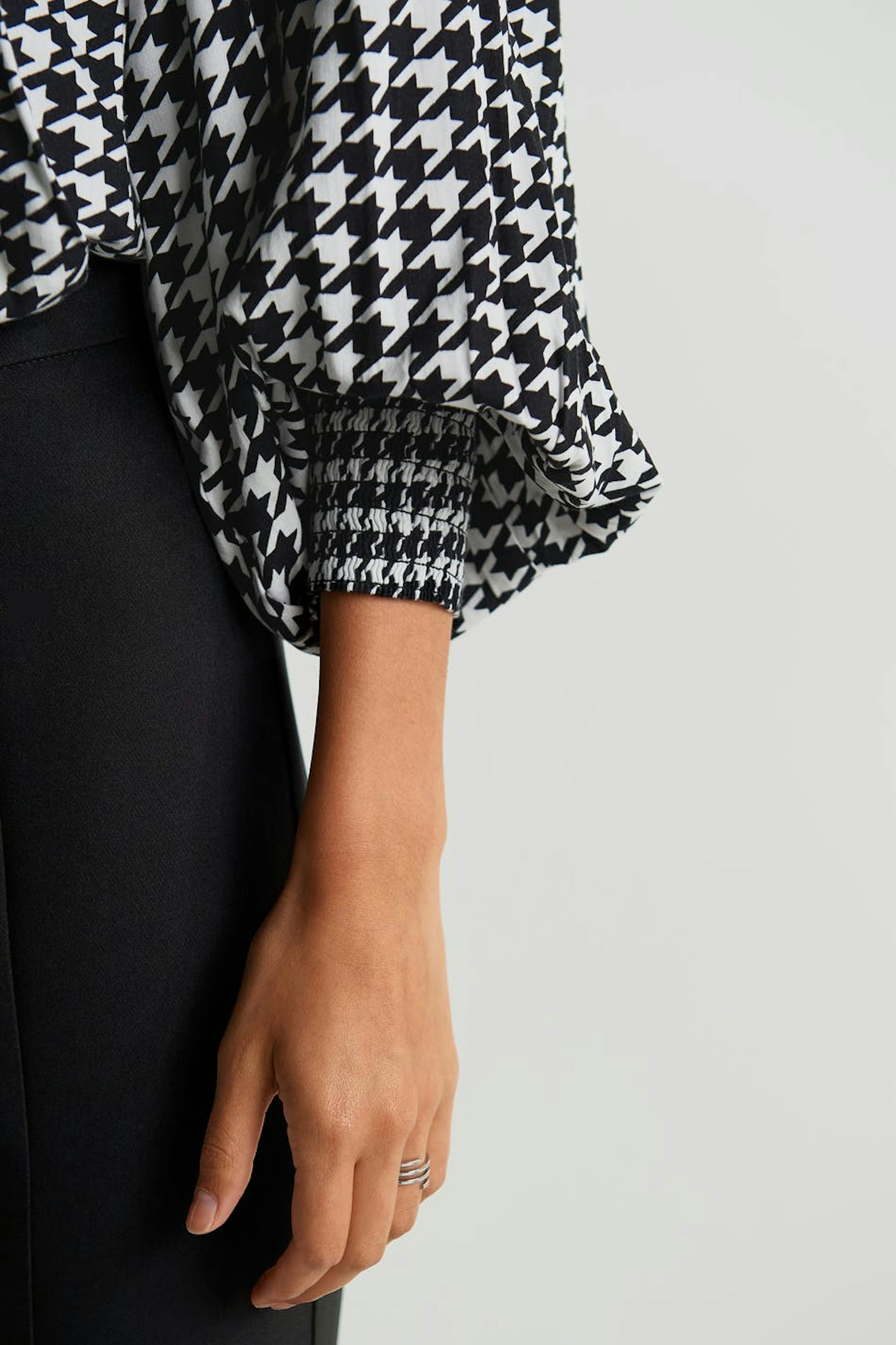 Dog tooth patterned blouse with spacious sleeves with gathering at the top and elastic strap on the sleeve ends.