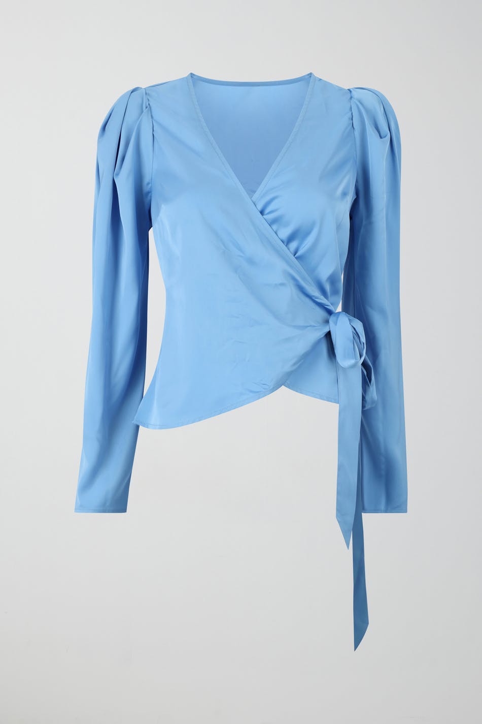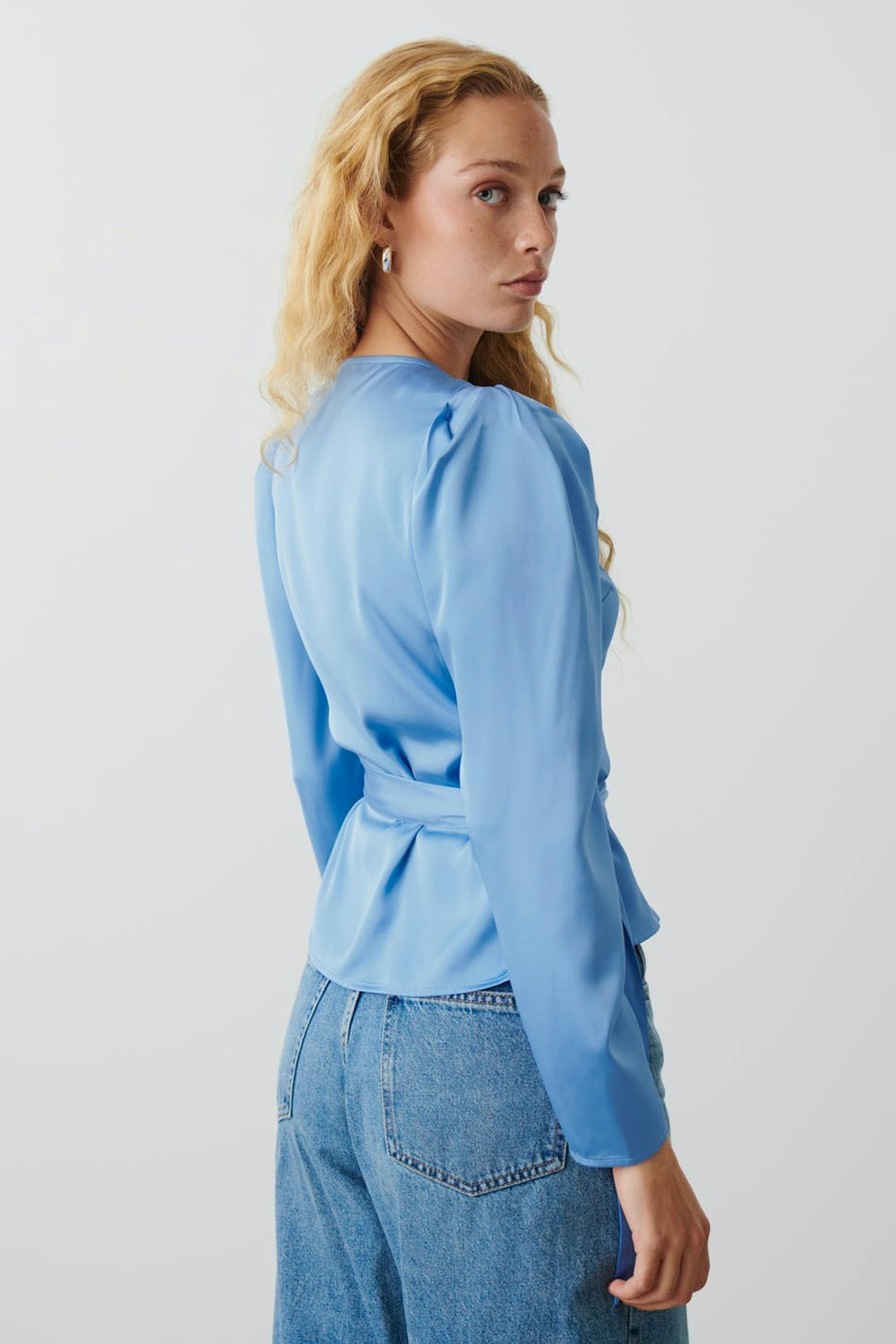 Wrap blouse with relaxed fit. The blouse is blue and has V-neck. It has long trumpet sleeve, self-tie at the waist and gathering around the shoulders.