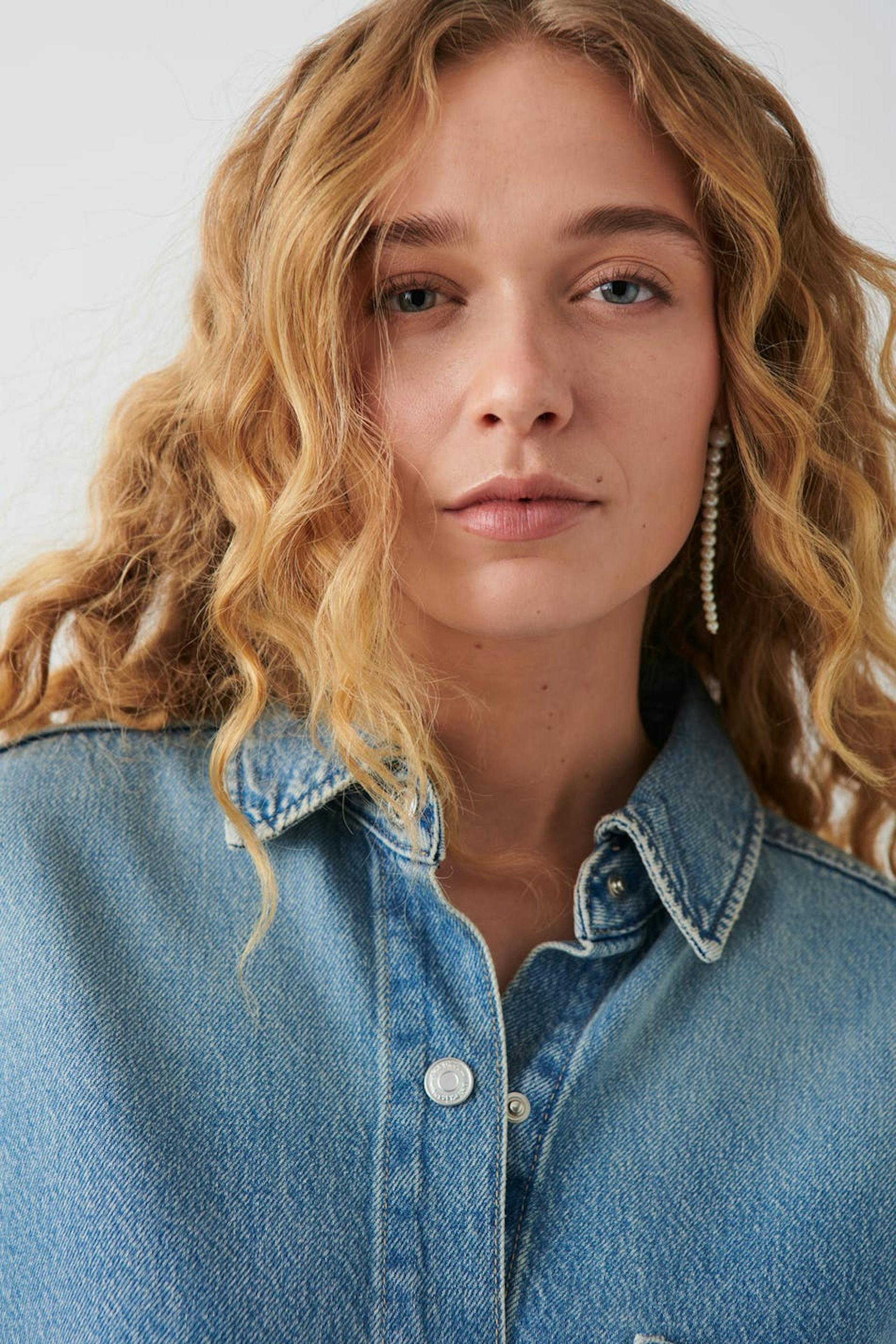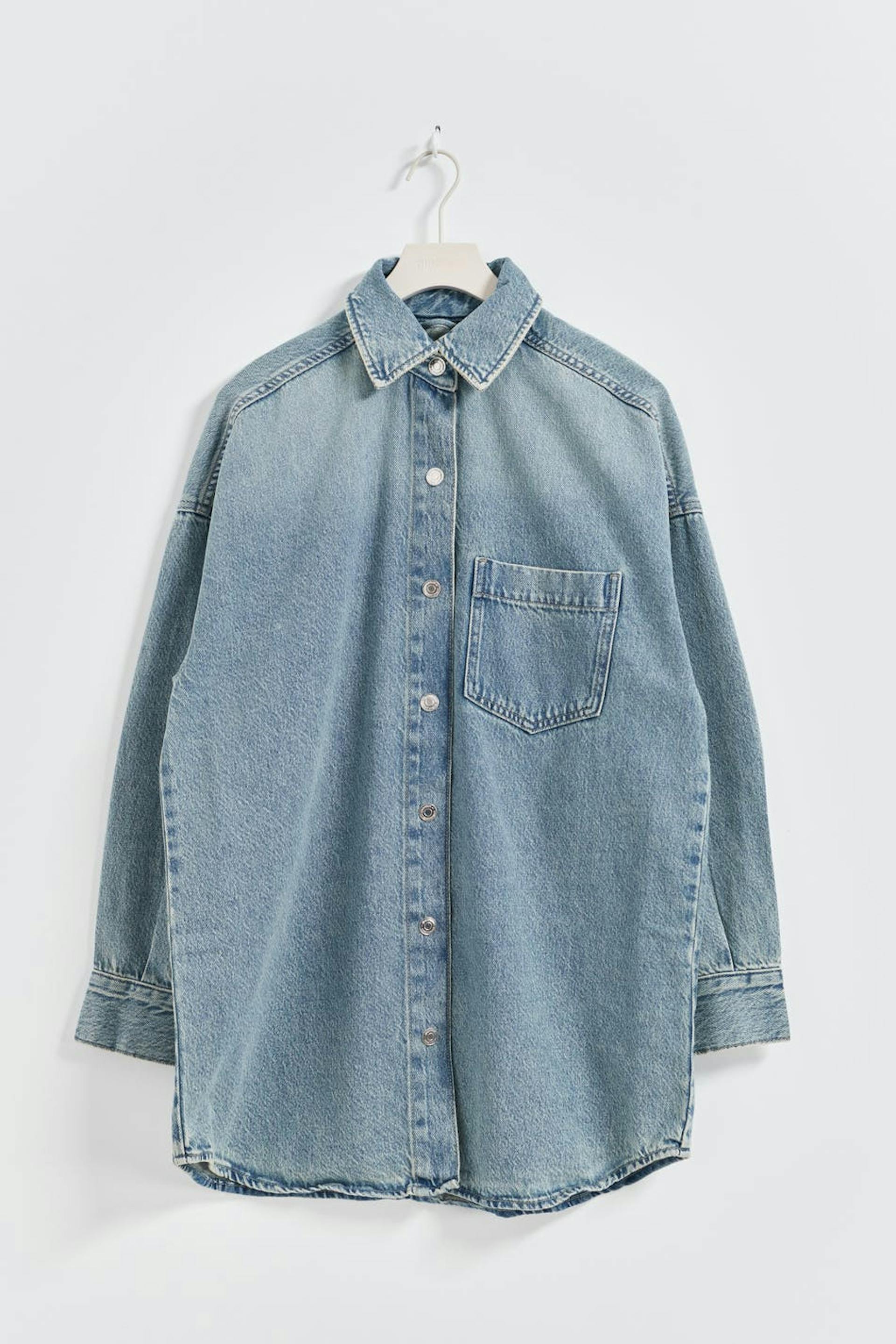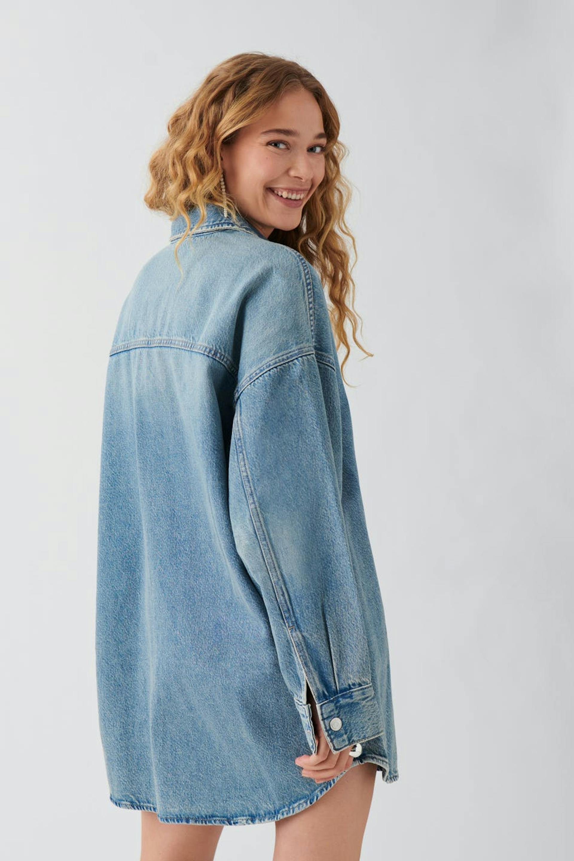 Long denim shirt with oversize fit. The shirt is blue and has snap button closure at the front. It has one chest pocket, collar and long sleeve with button and cuff.