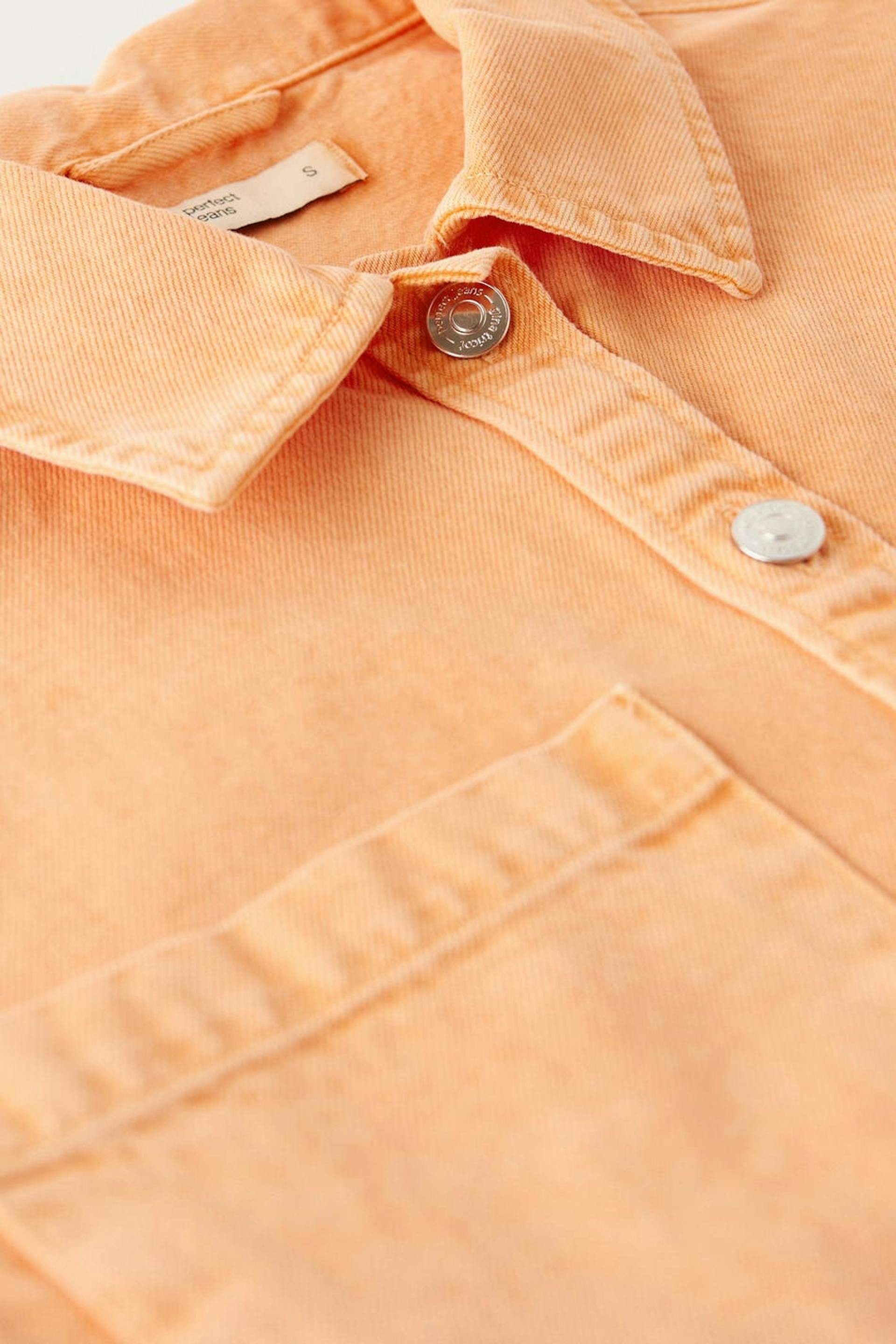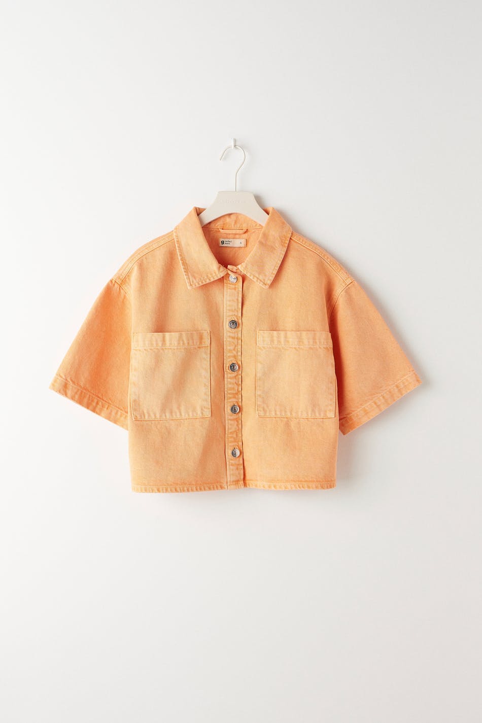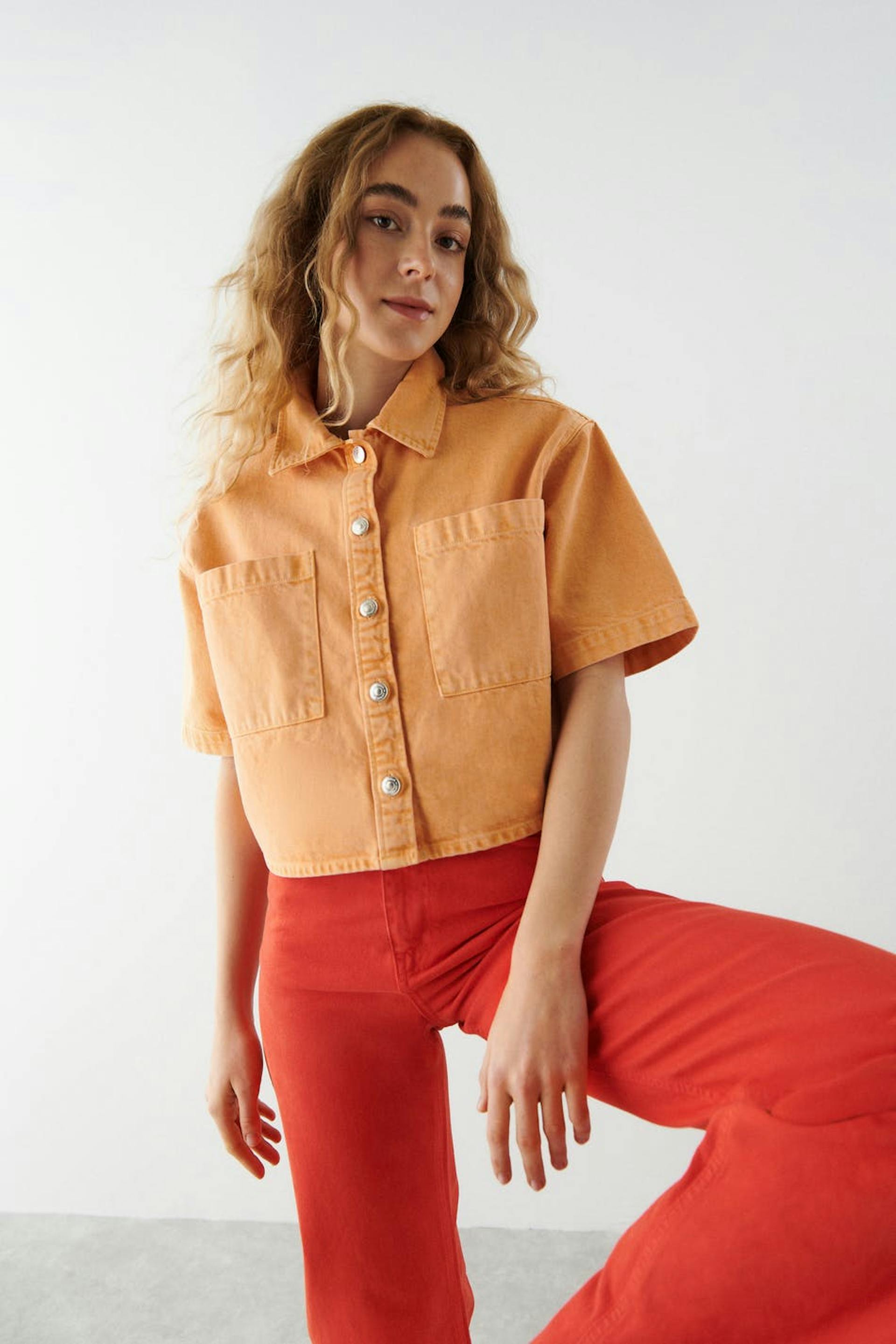 Short-sleeved denim shirt with chest pockets. The shirt is orange and has an oversize fit in non-stretch denim. It has collar, button placket in front and a cropped length.