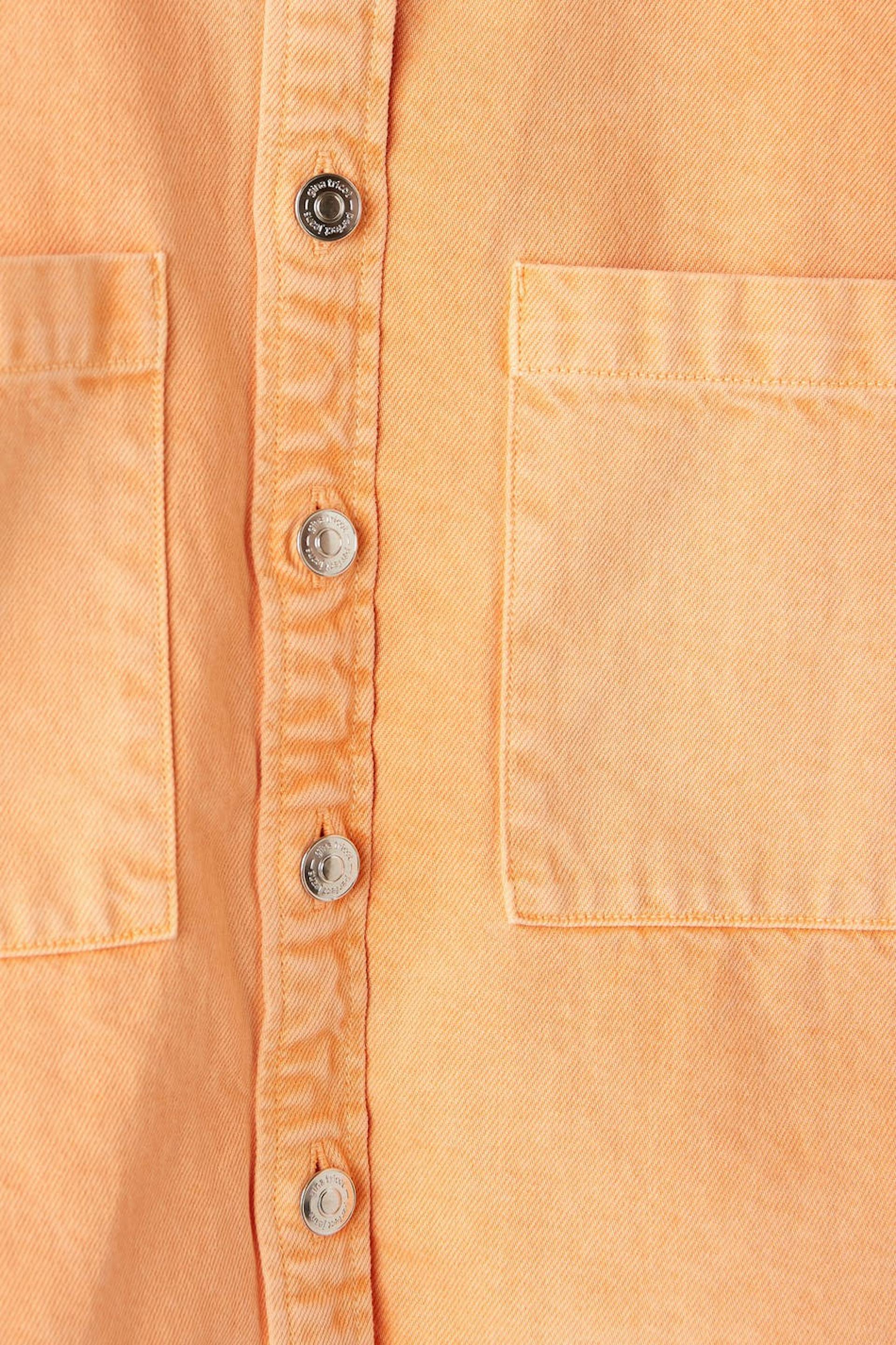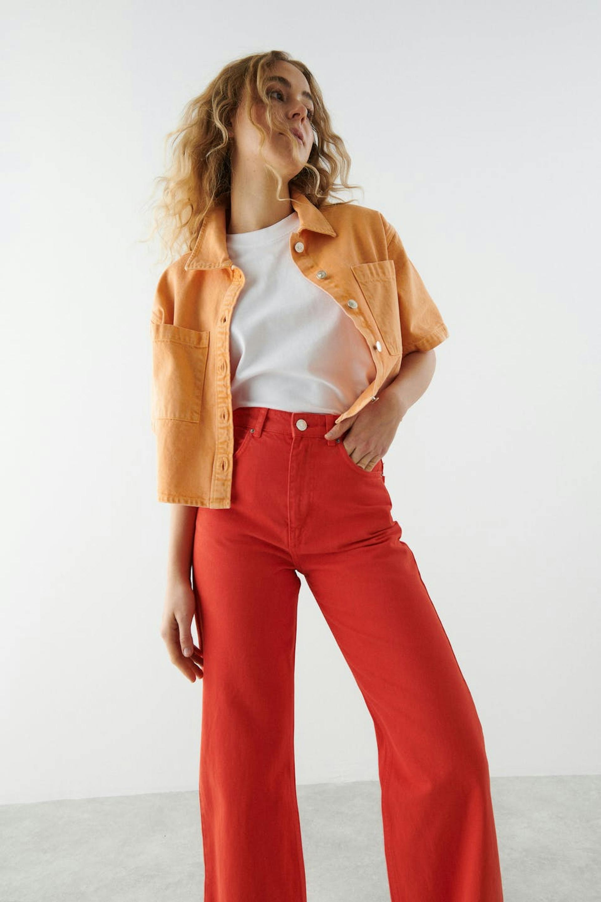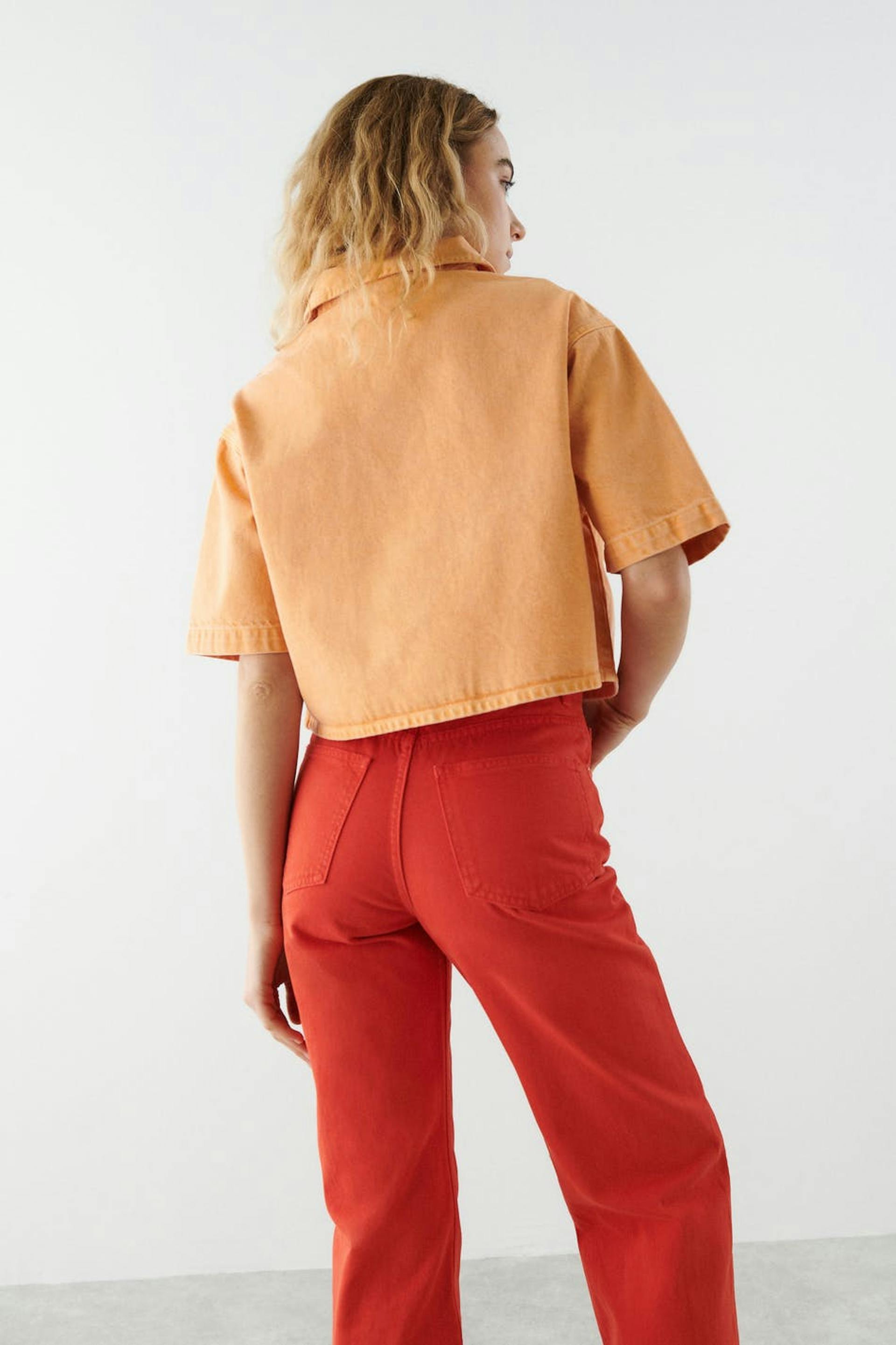 Short-sleeved denim shirt with chest pockets. The shirt is orange and has an oversize fit in non-stretch denim. It has collar, button placket in front and a cropped length.