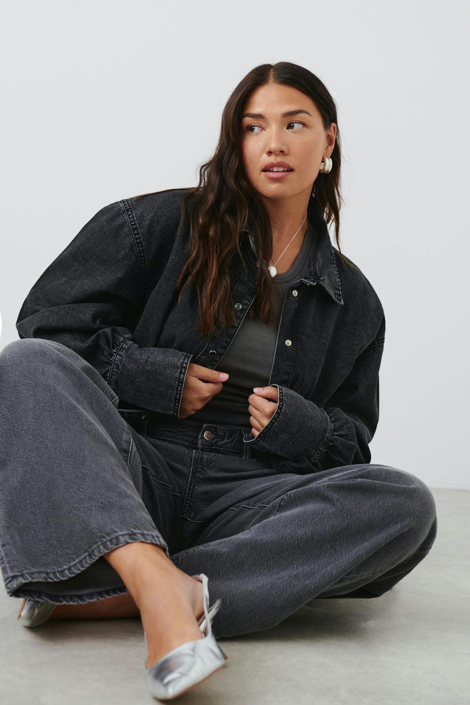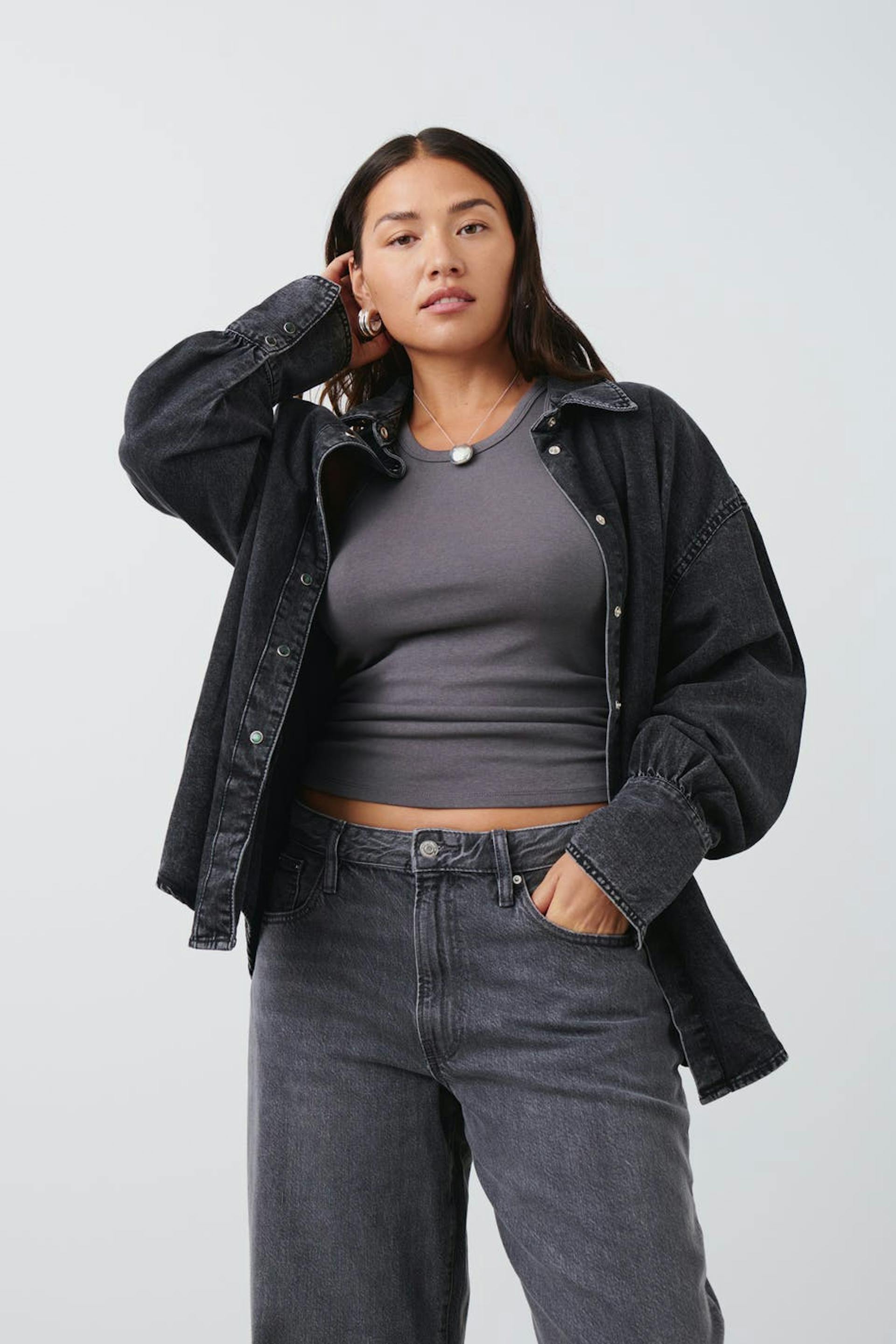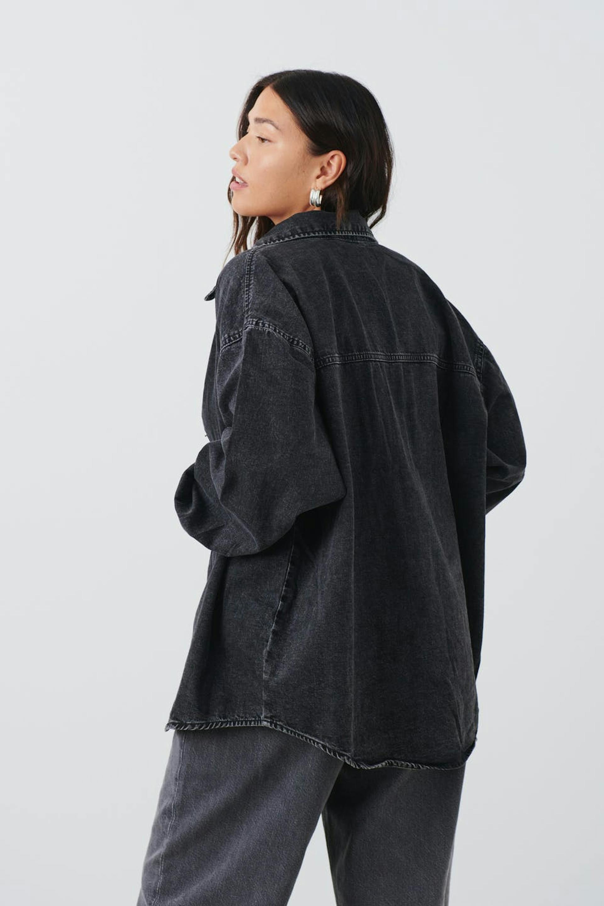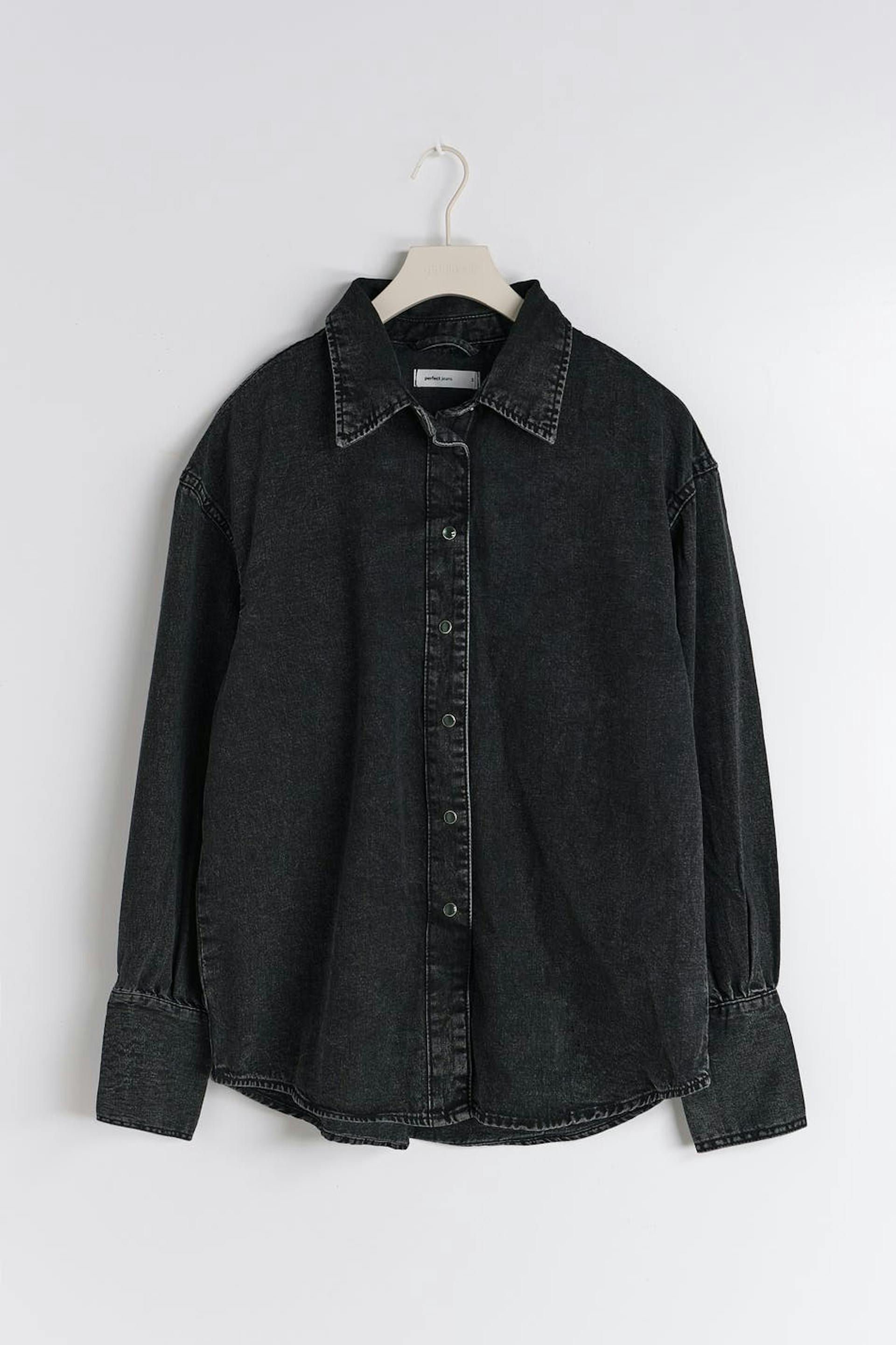 Denim shirt with dropped shoulder. The shirt is black-grey and has regular fit. It has collar, button placket at the front and wide sleeve with button and cuff.