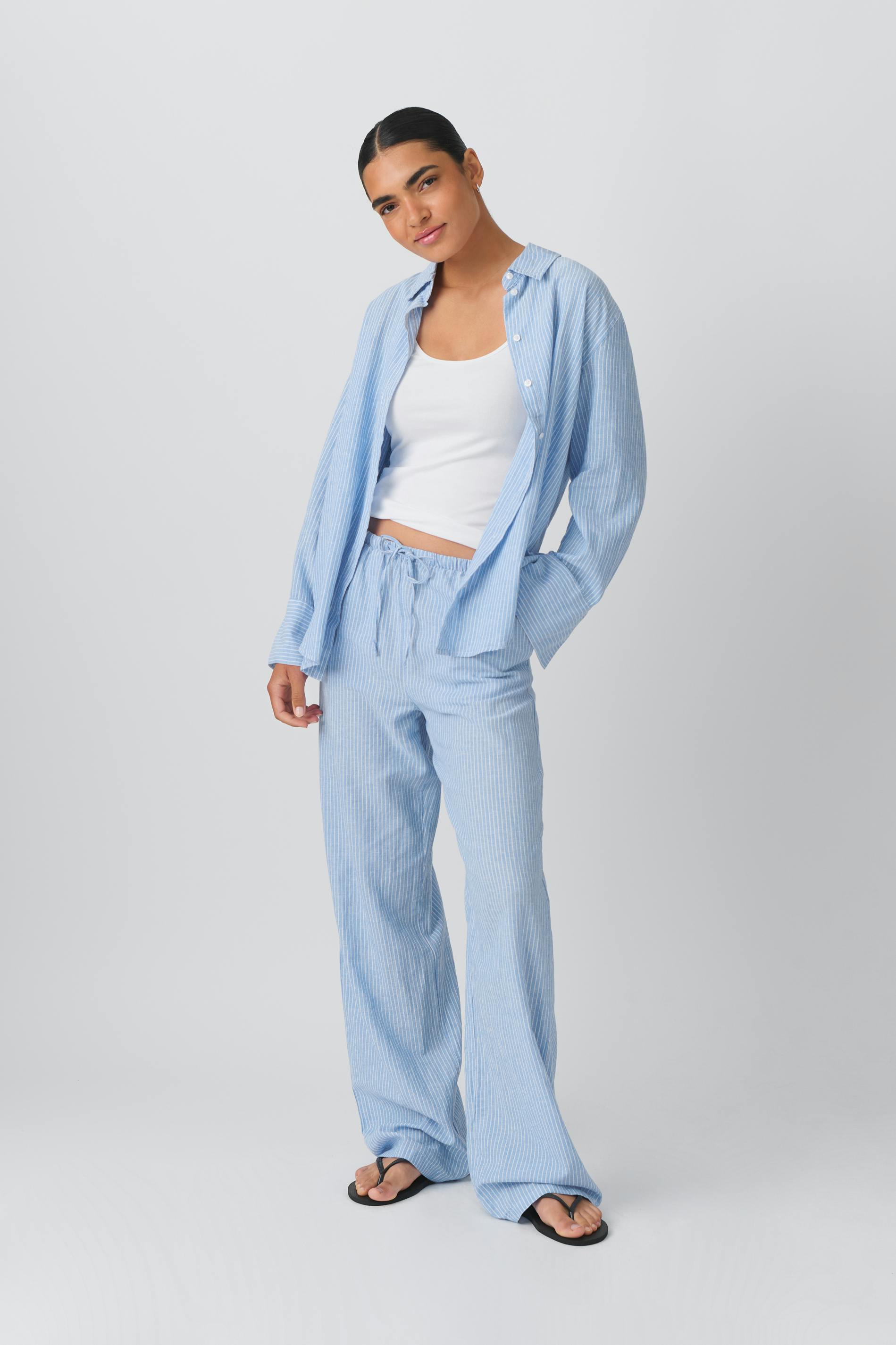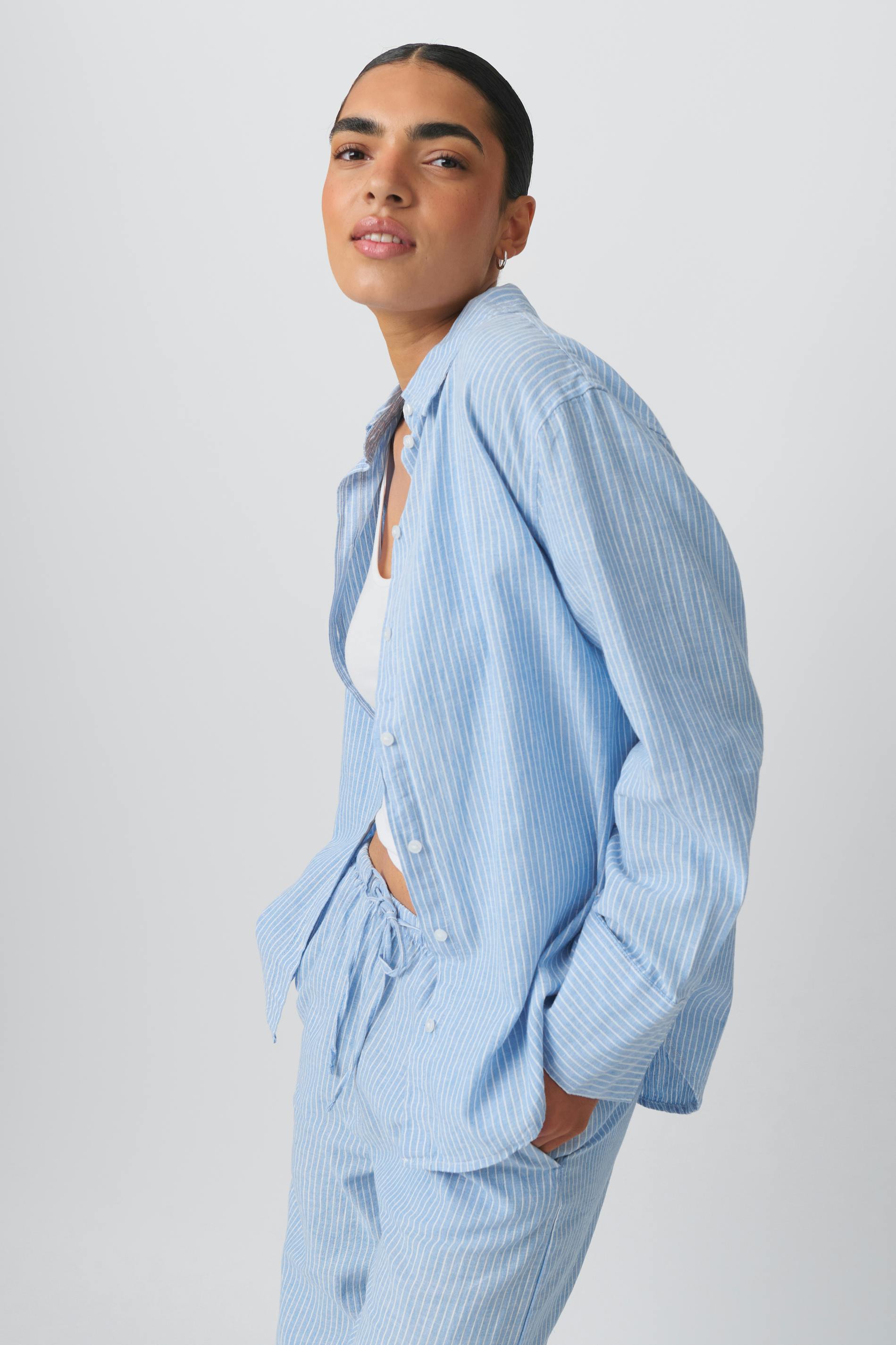 Striped linen shirt in linen blend with buttoning at the front. The shirt is blue and has long sleeve. It has regular fit and pockets.