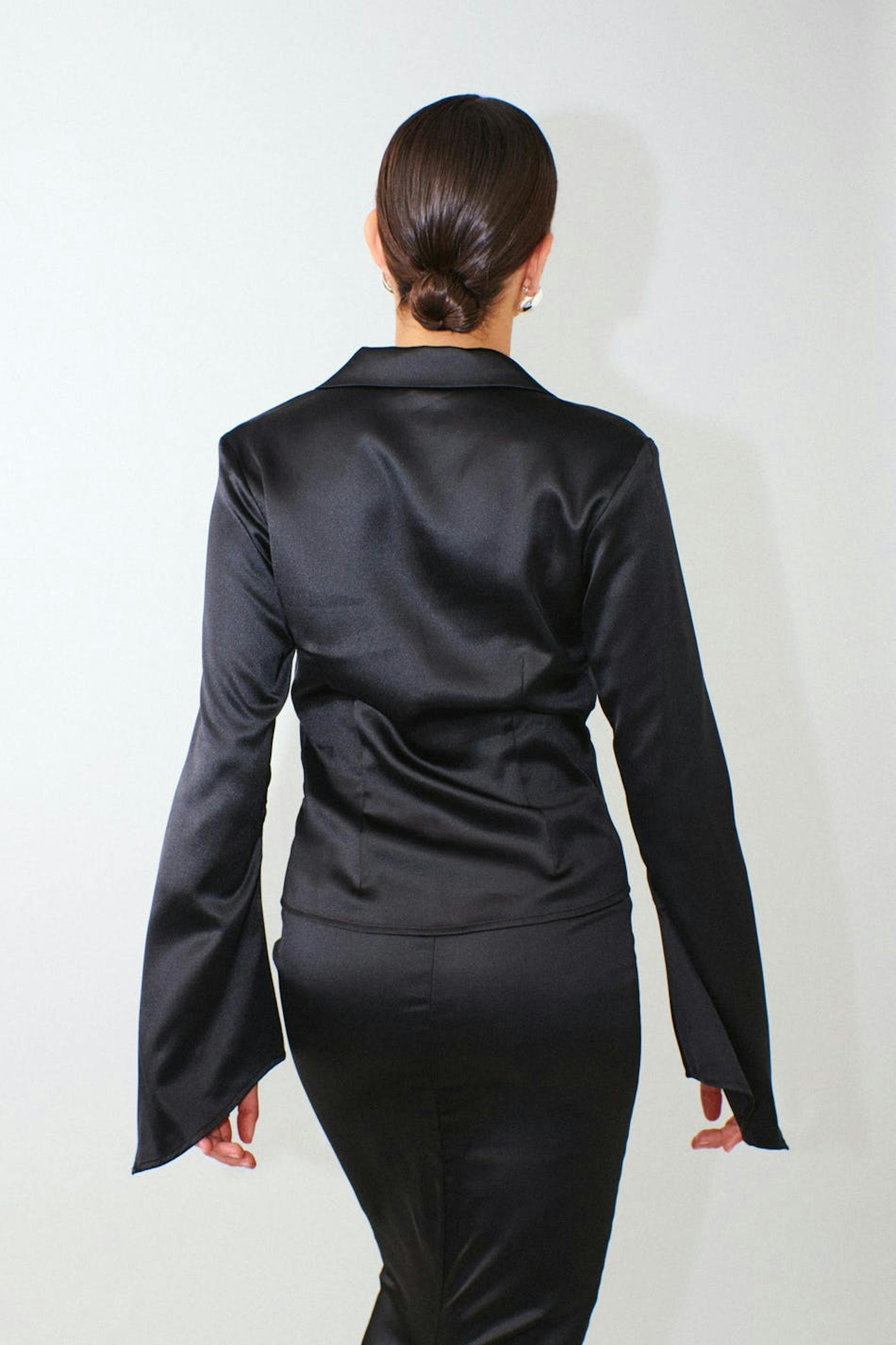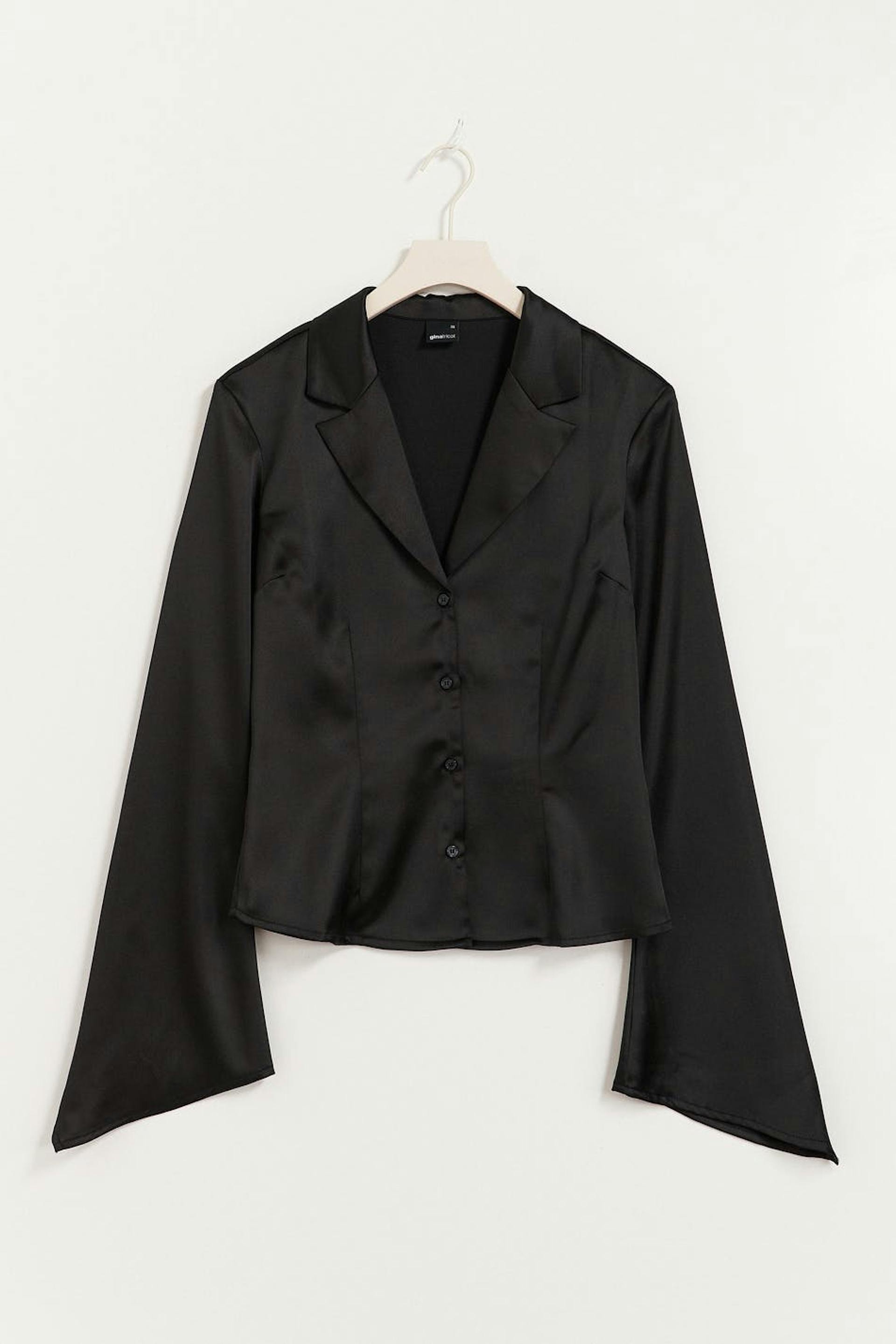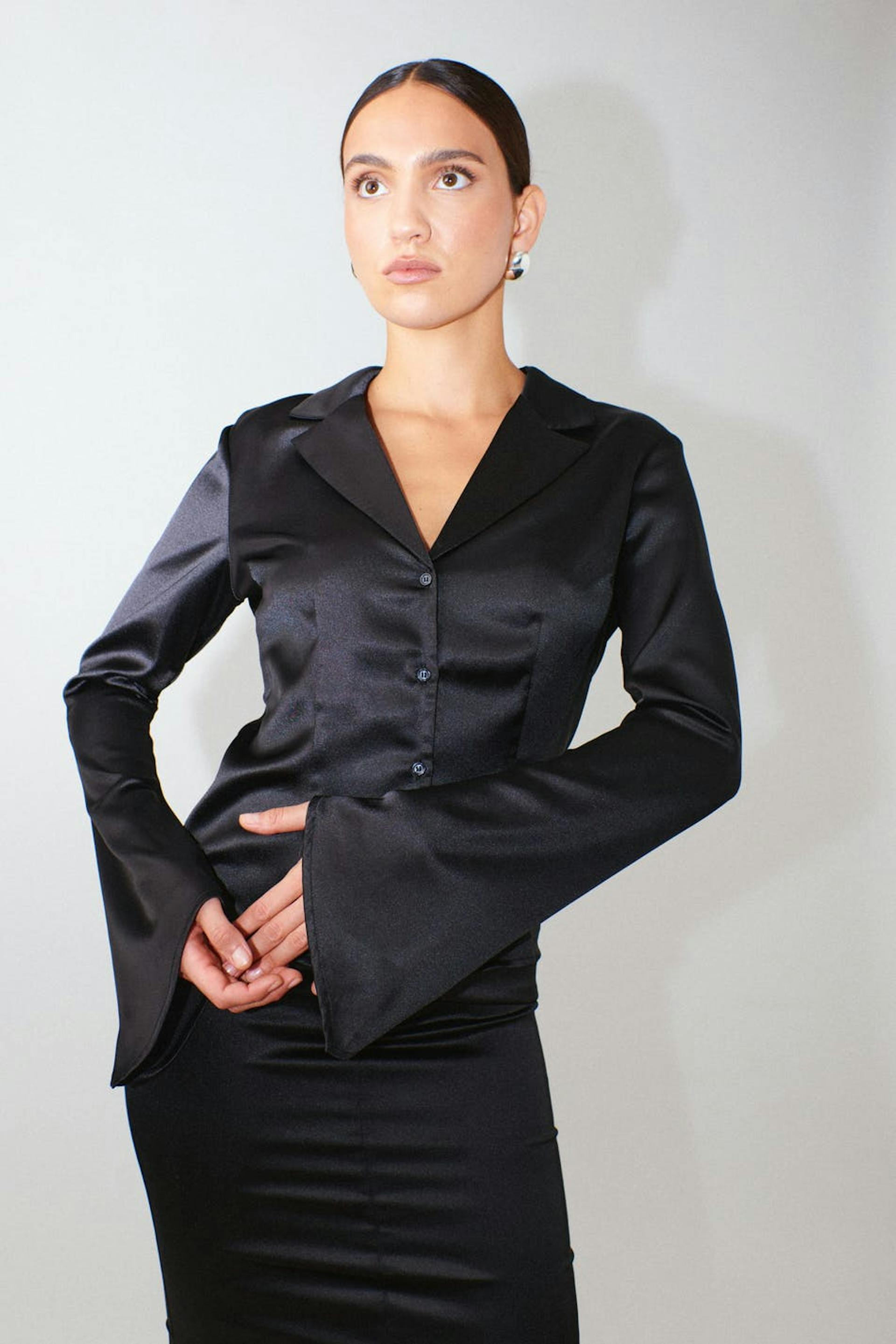 Fitted satin shirt with button placket at the front. The shirt is black and has lantern sleeve. It has collar with lapels.