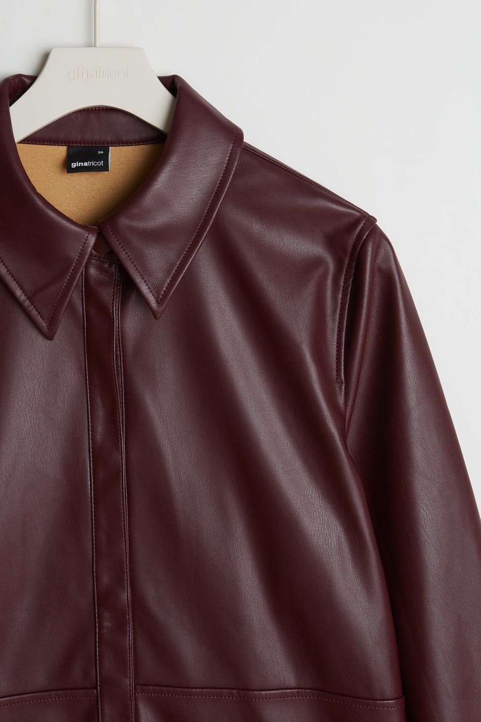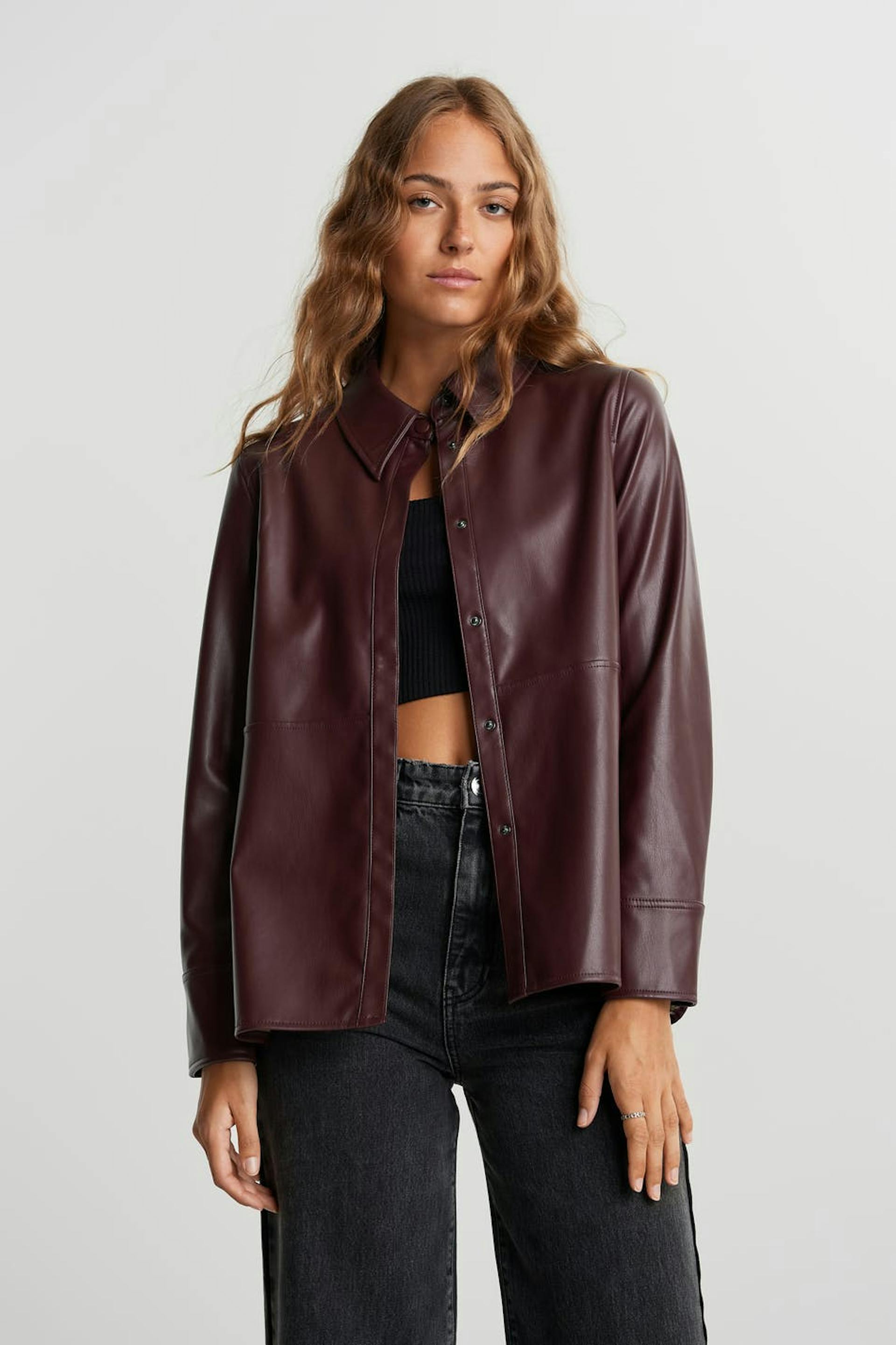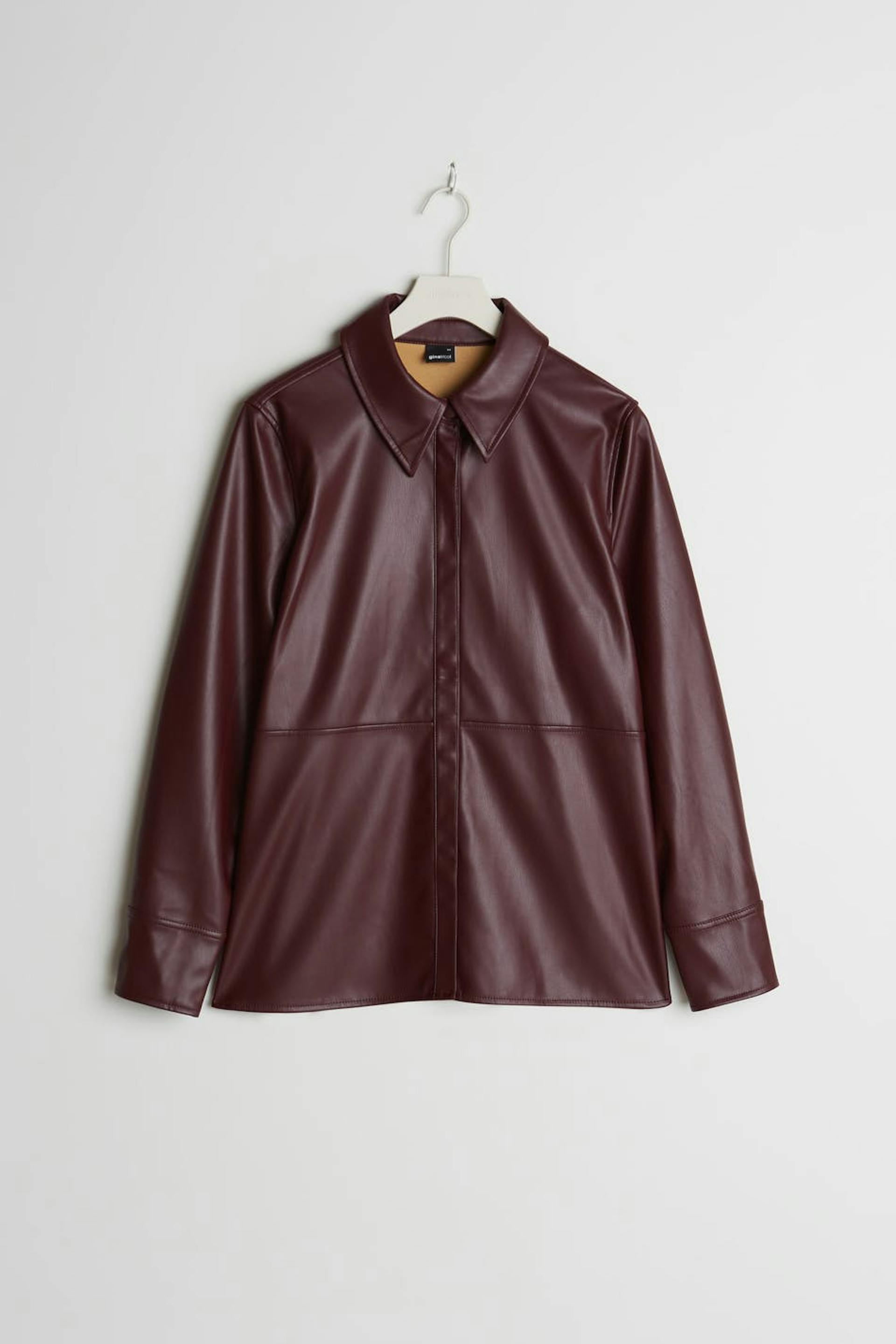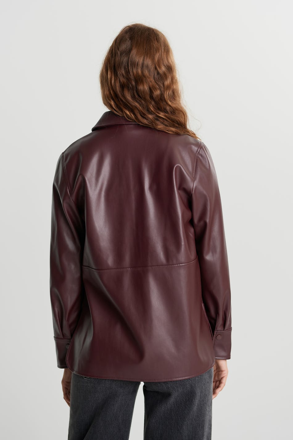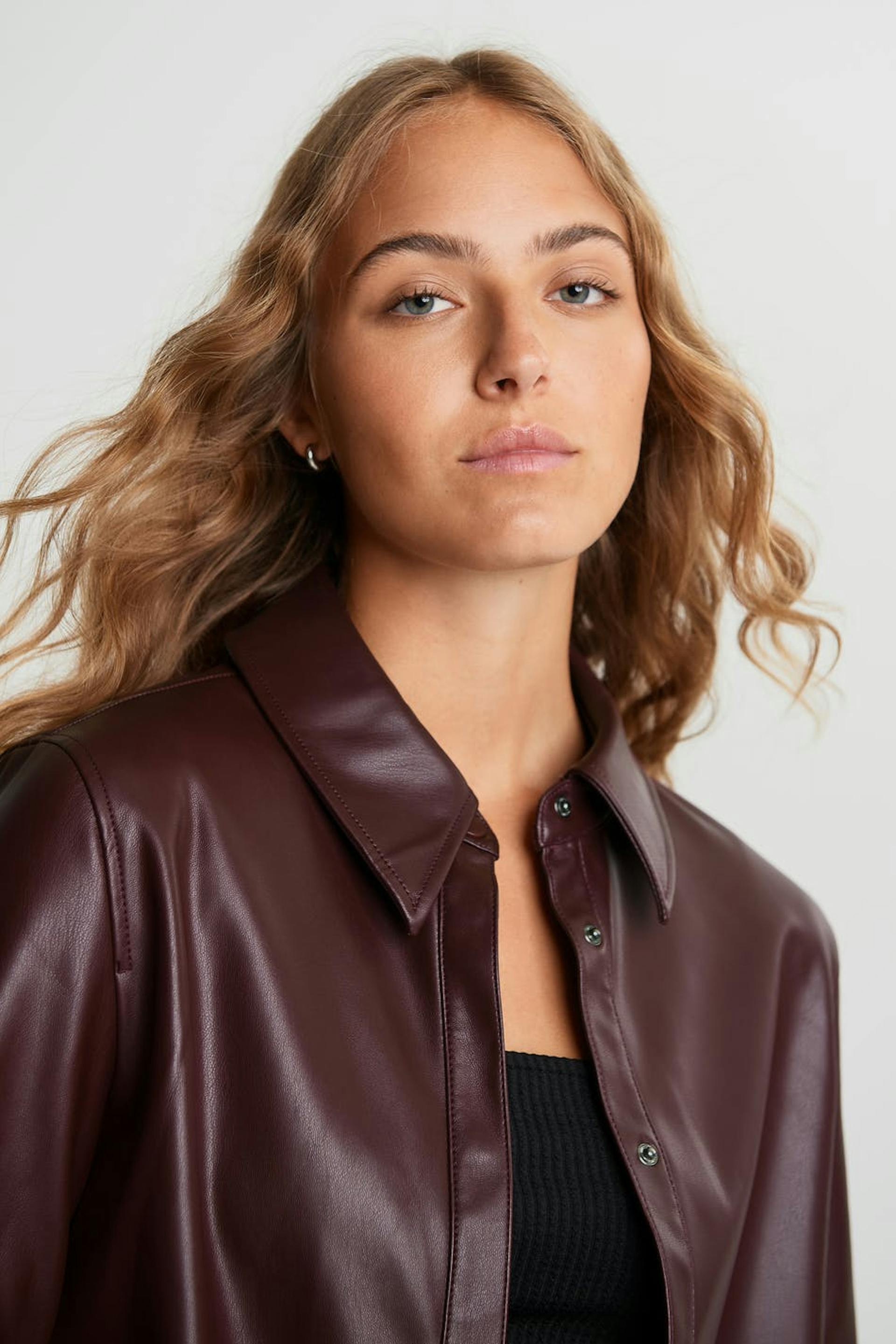 Long-sleeved shirt with a decorative stitching at the waist. The shirt is wine and has hidden snap buttons. It is made of PU.