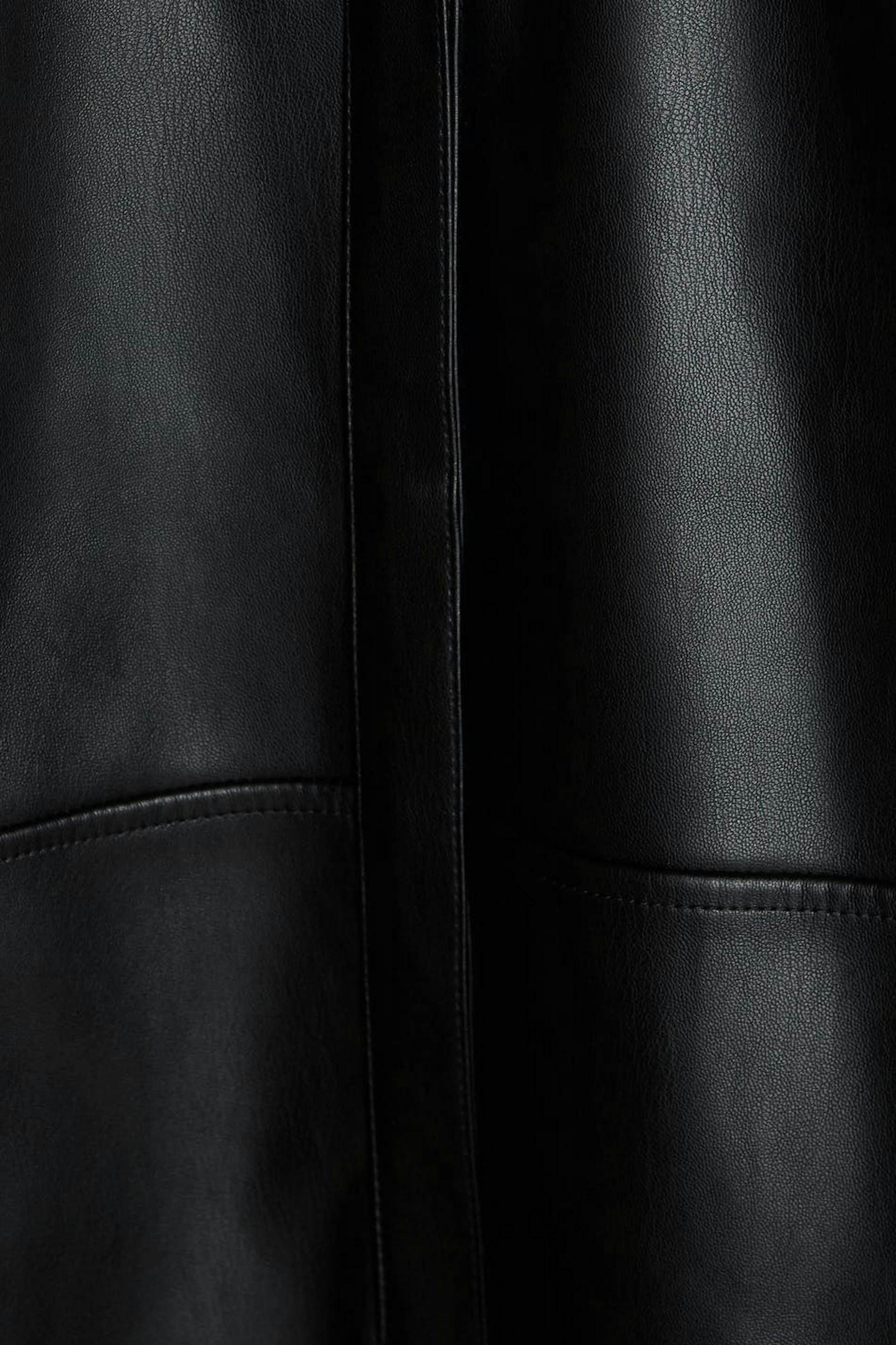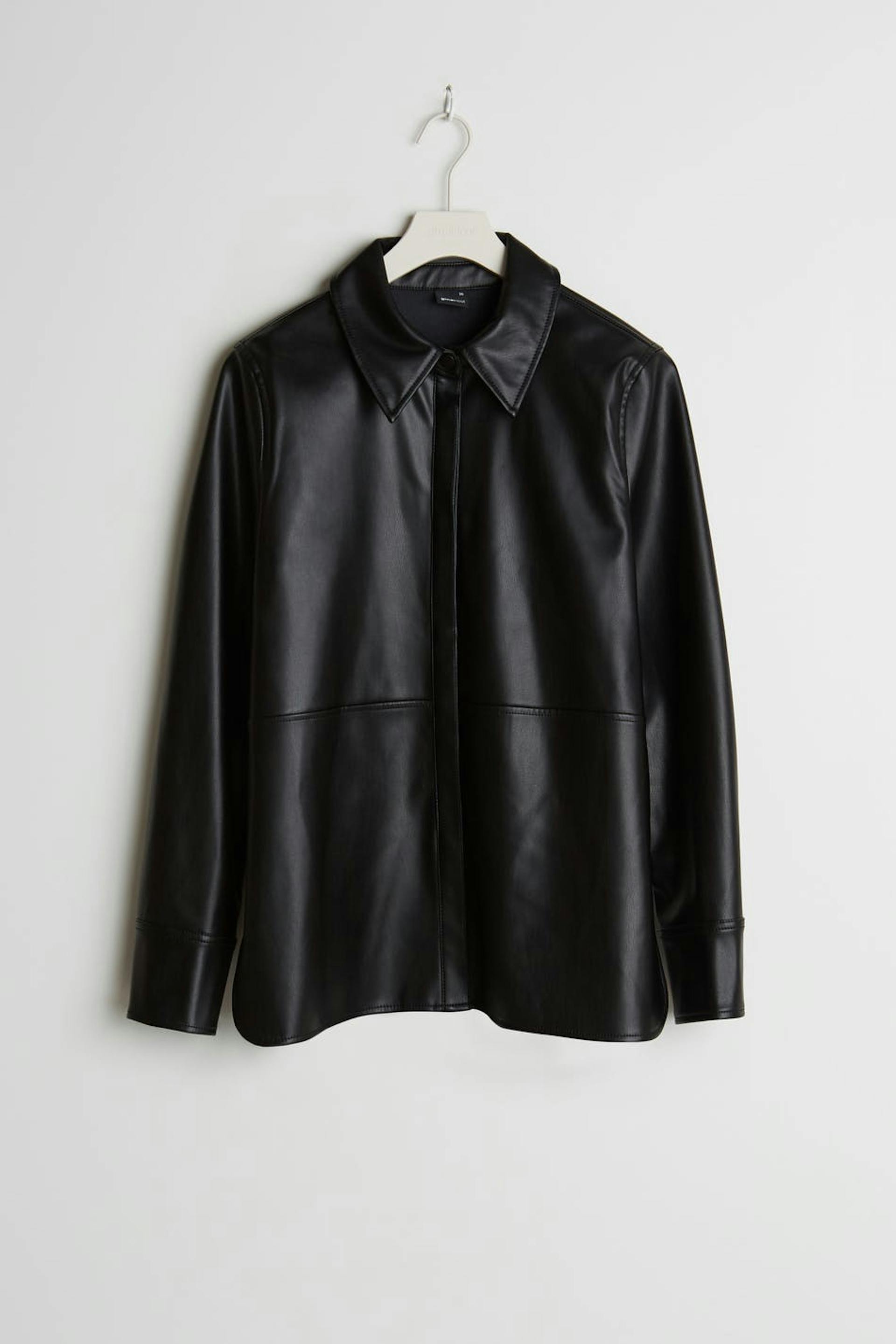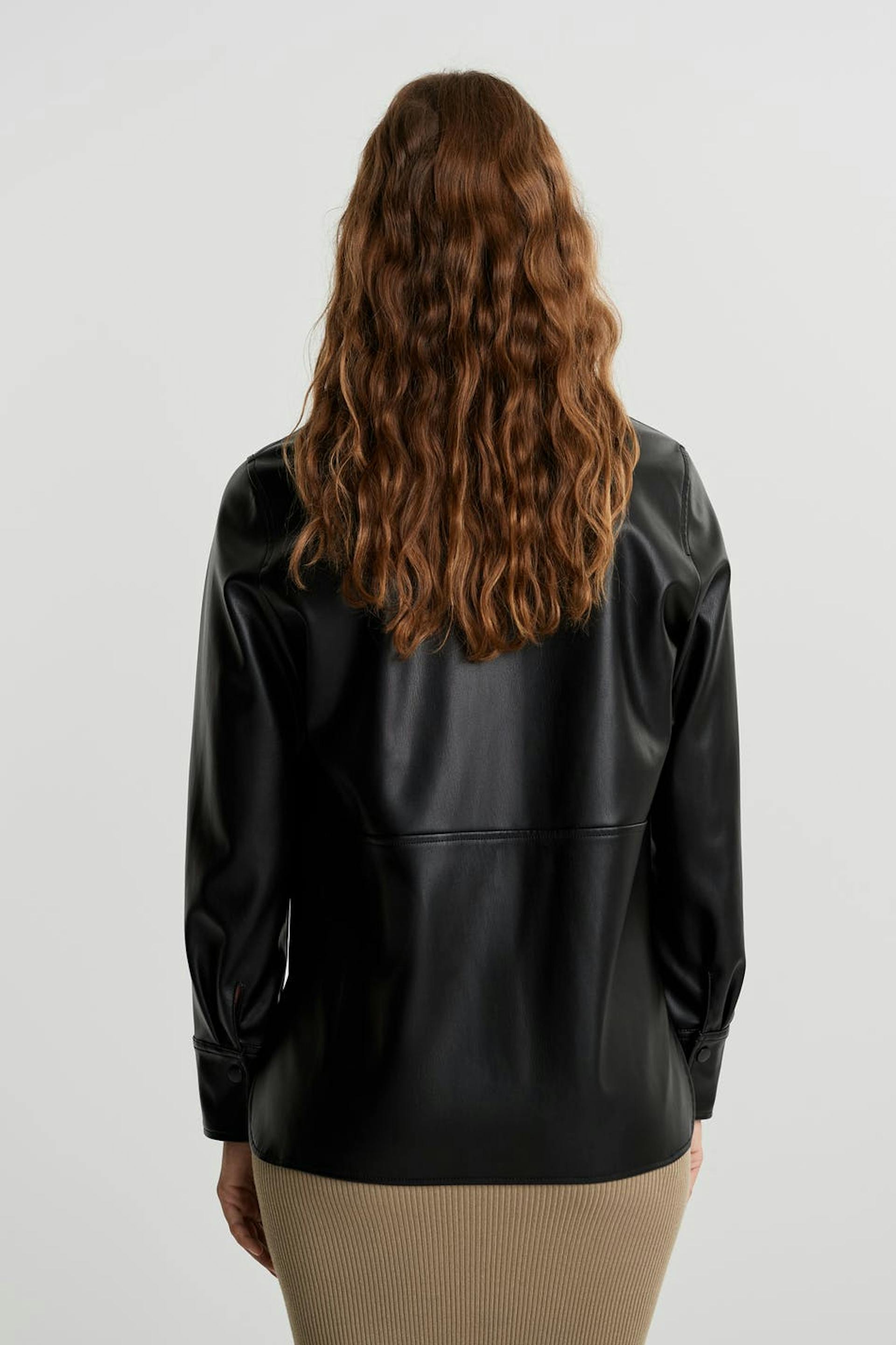 Long-sleeved shirt with a decorative stitching at the waist. The shirt is black and has hidden snap buttons. It is made of PU.