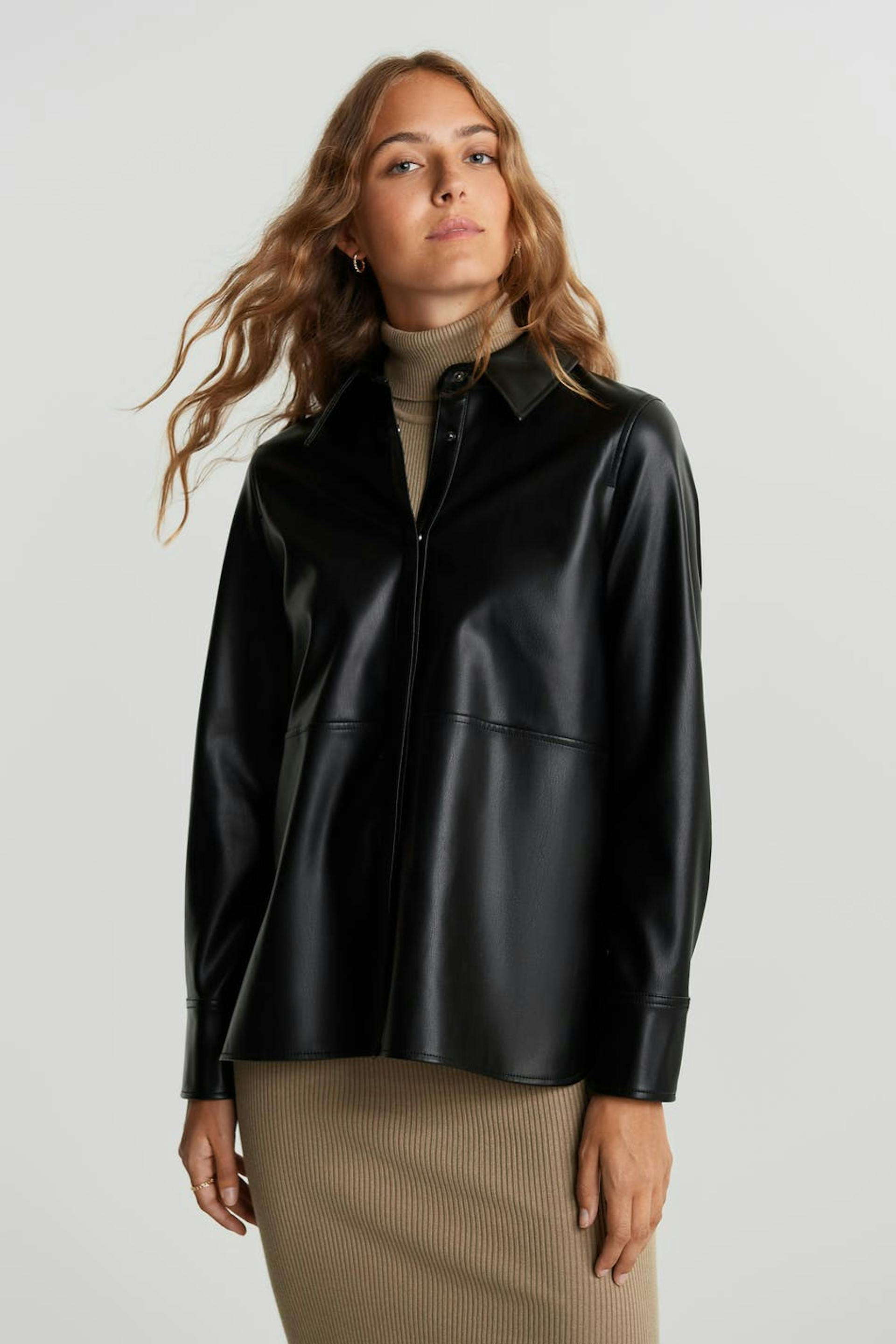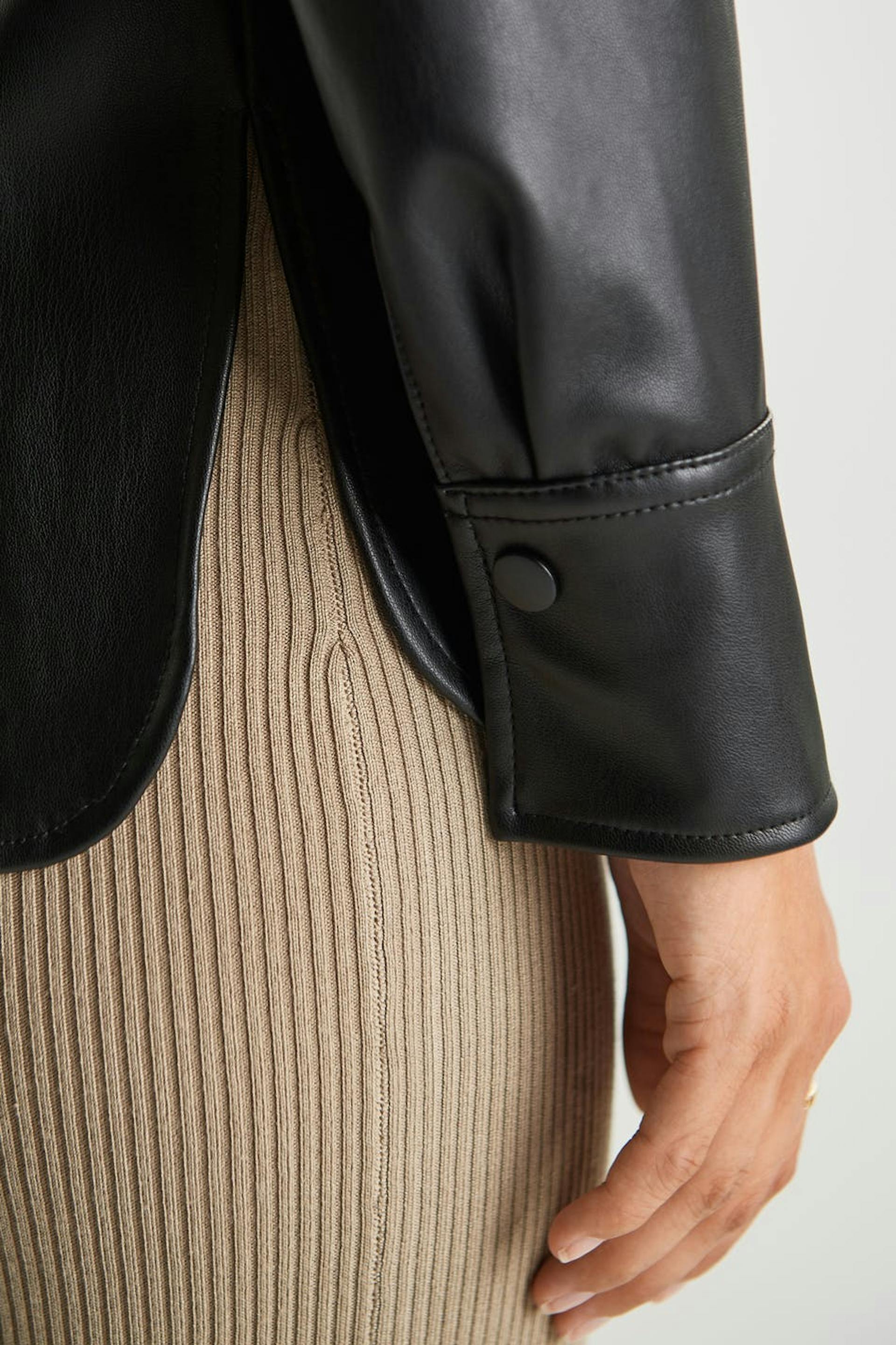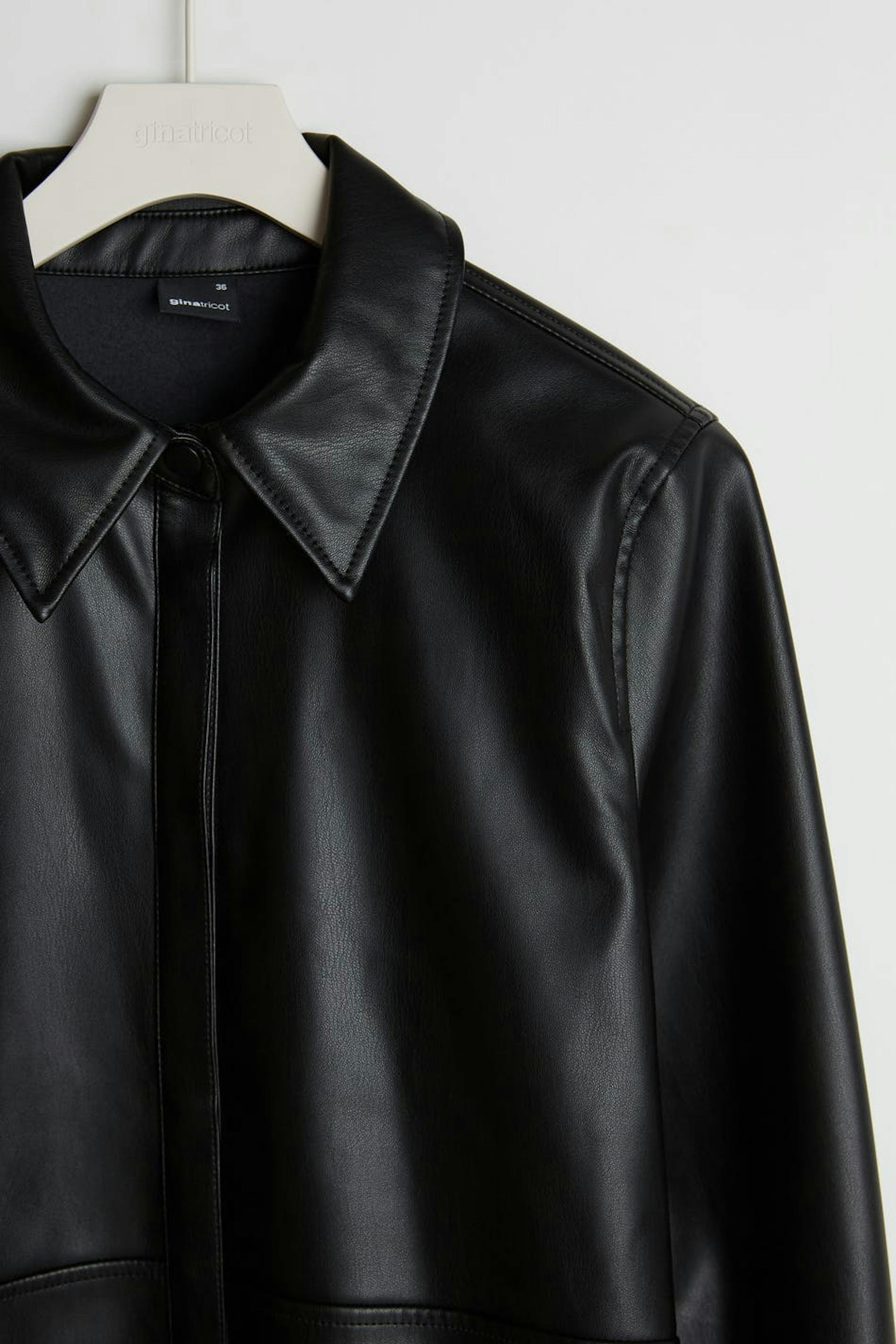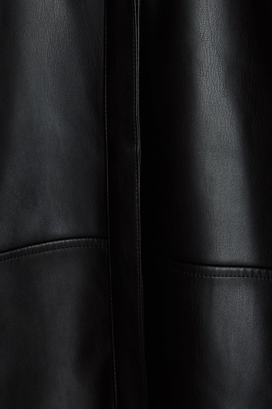 Long-sleeved shirt with a decorative stitching at the waist. The shirt is black and has hidden snap buttons. It is made of PU.