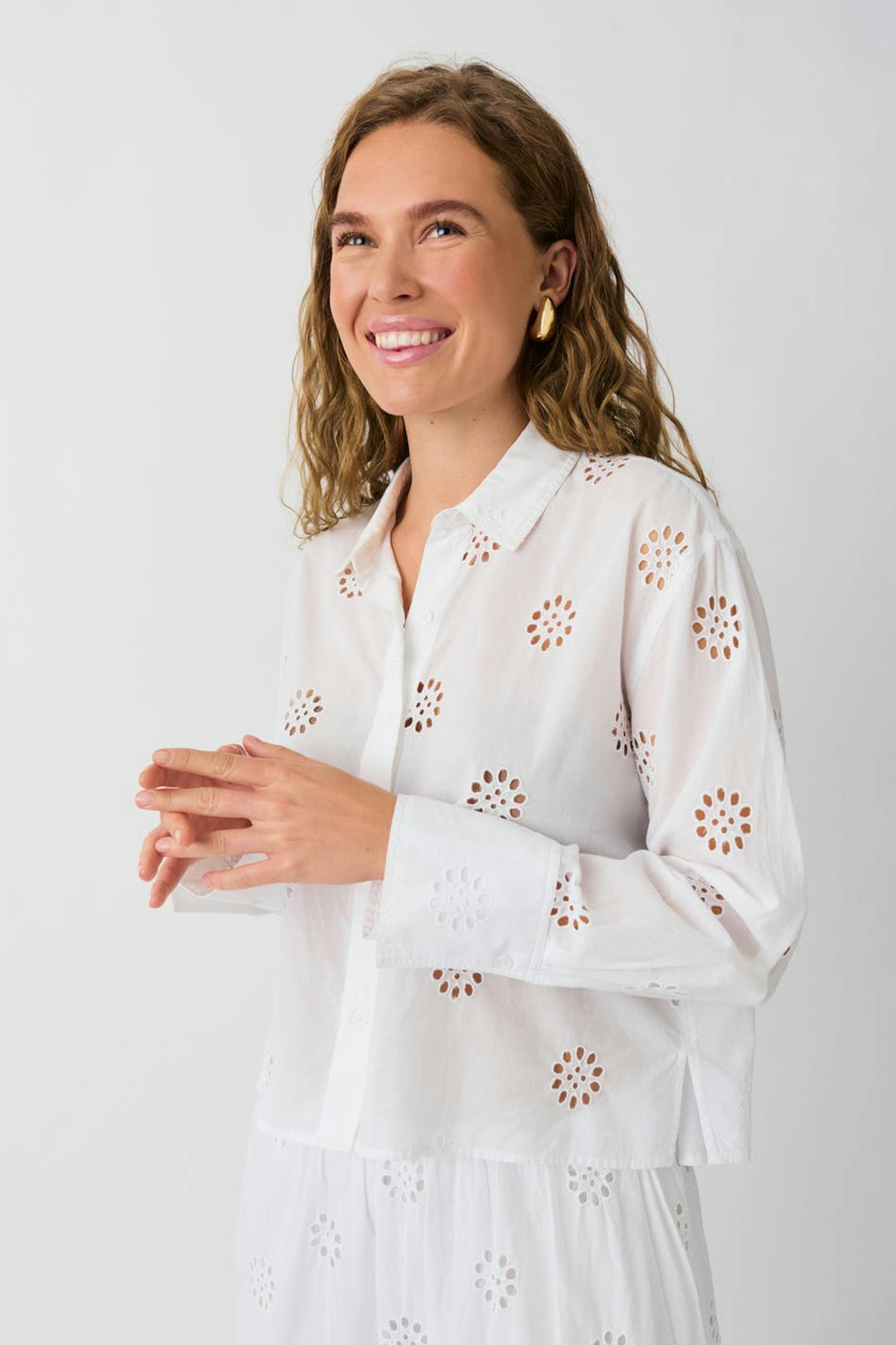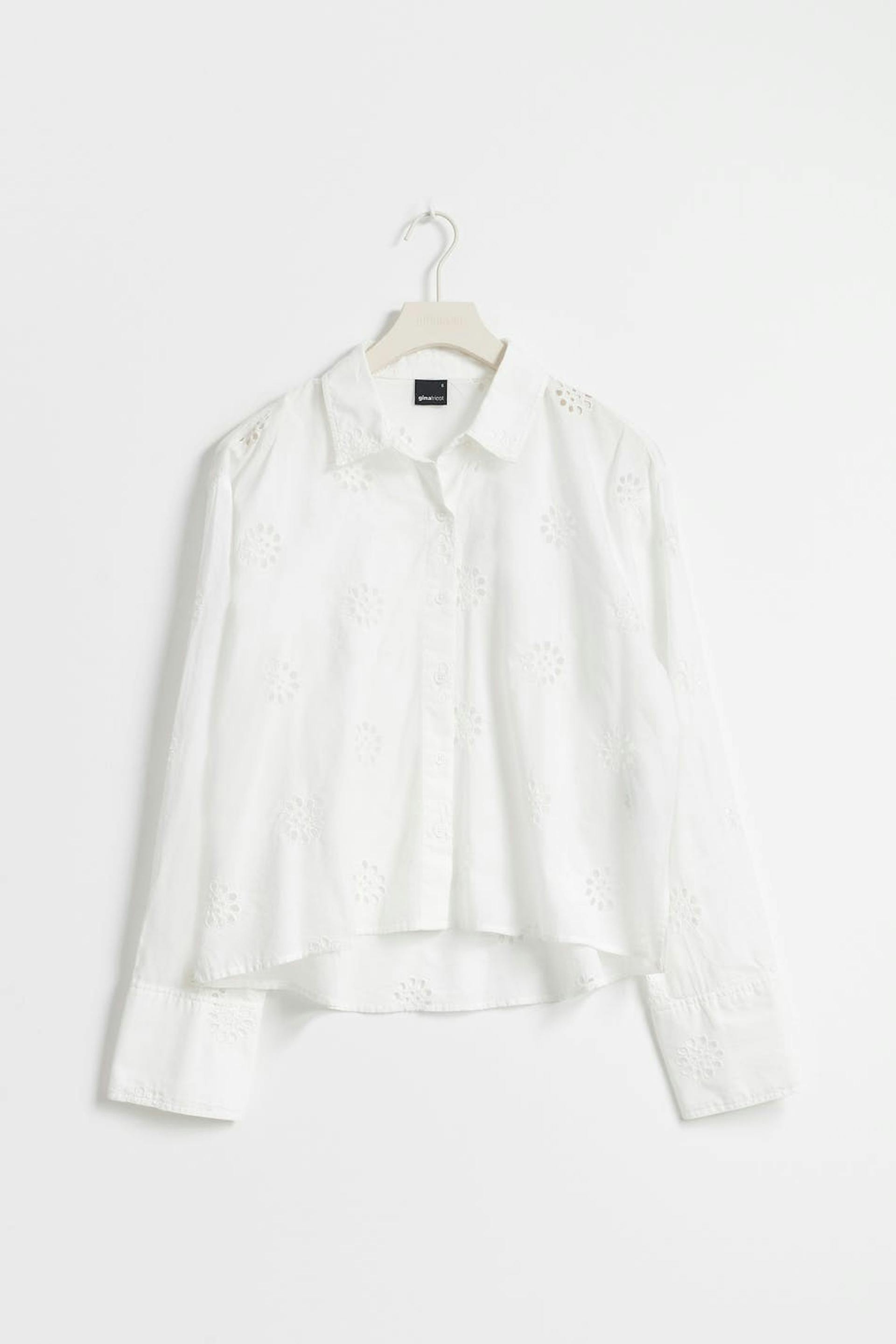 Shirt with hole embroidery. The shirt is white and has hidden buttoning at the front. It has collar, slit in the sides and long sleeve with button and cuff.