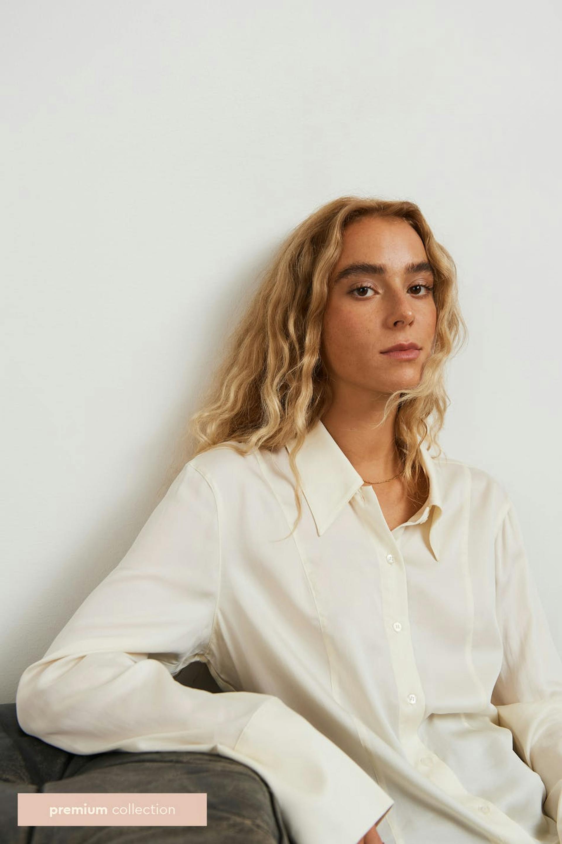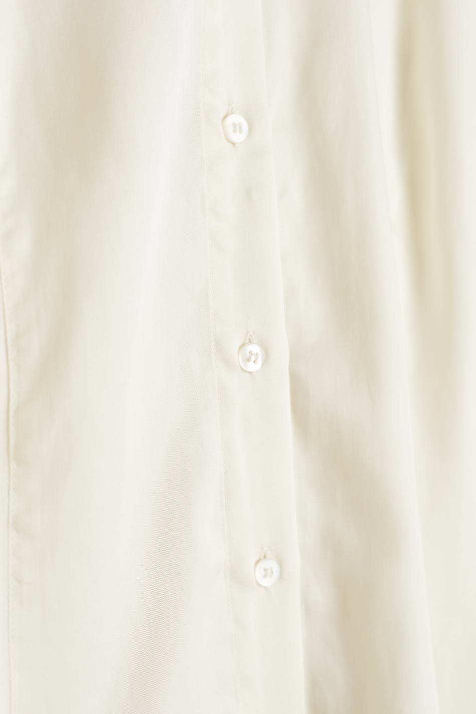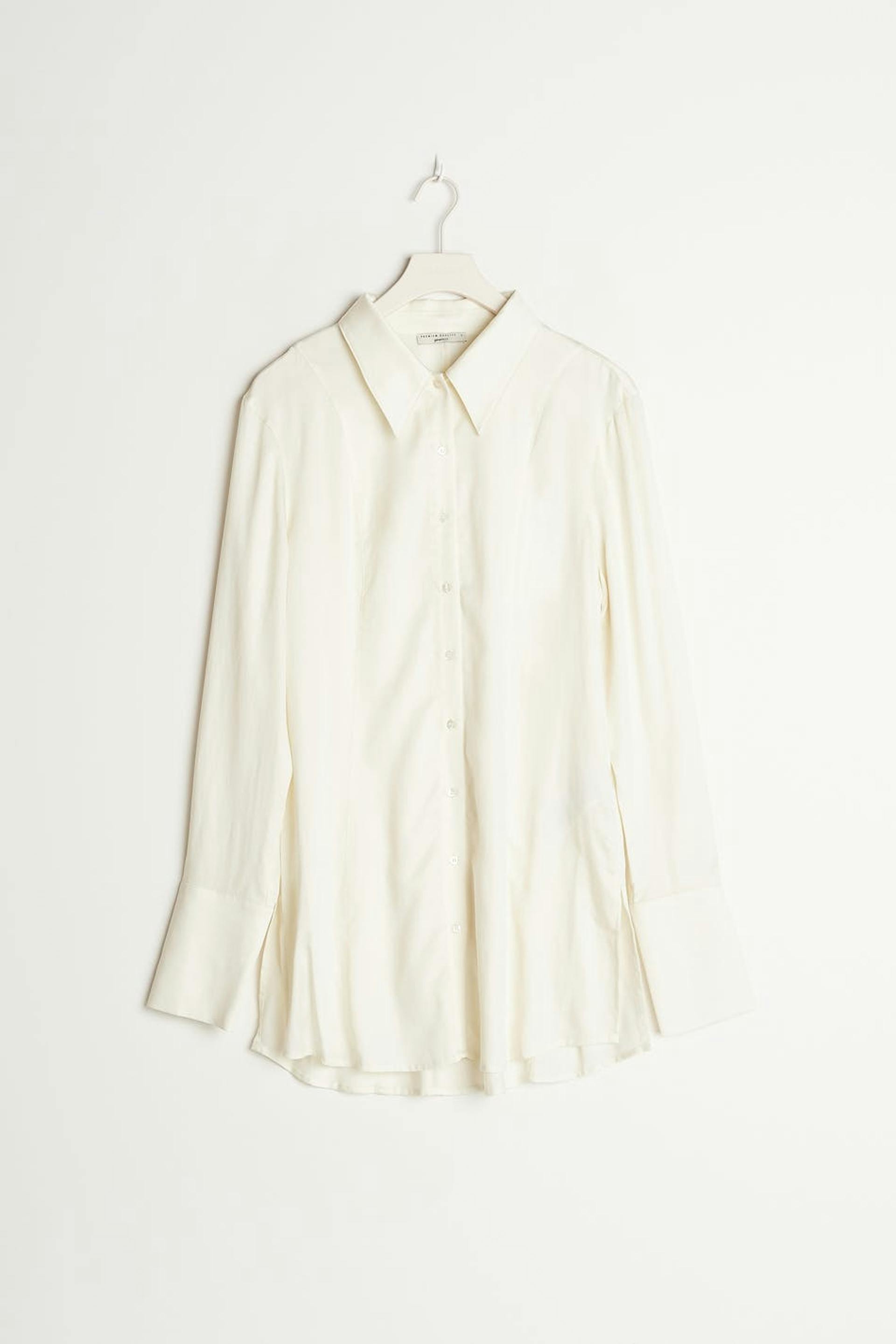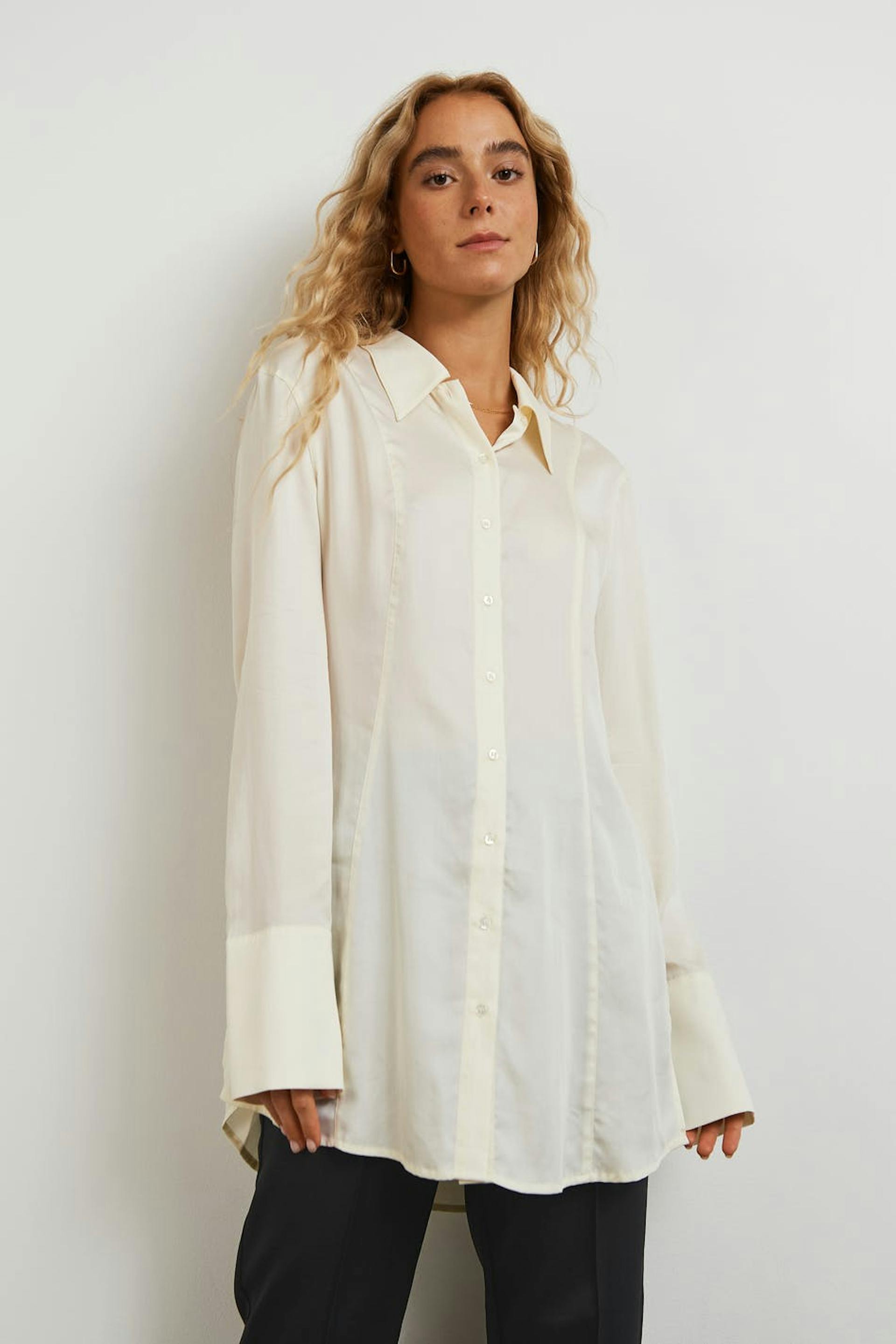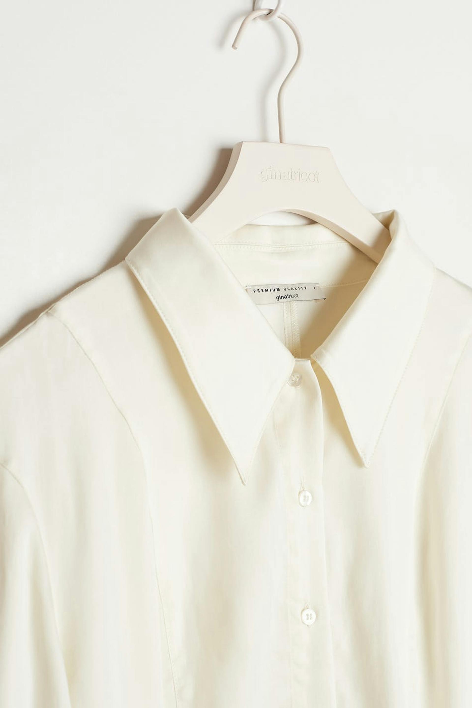 Long shirt with a slim fit. The shirt is beige and has a classic style. It has a pointy collar, high cuffs with slit, a button closure at the front, a slightly figure fit waist and decorative seam details at the front and back.
