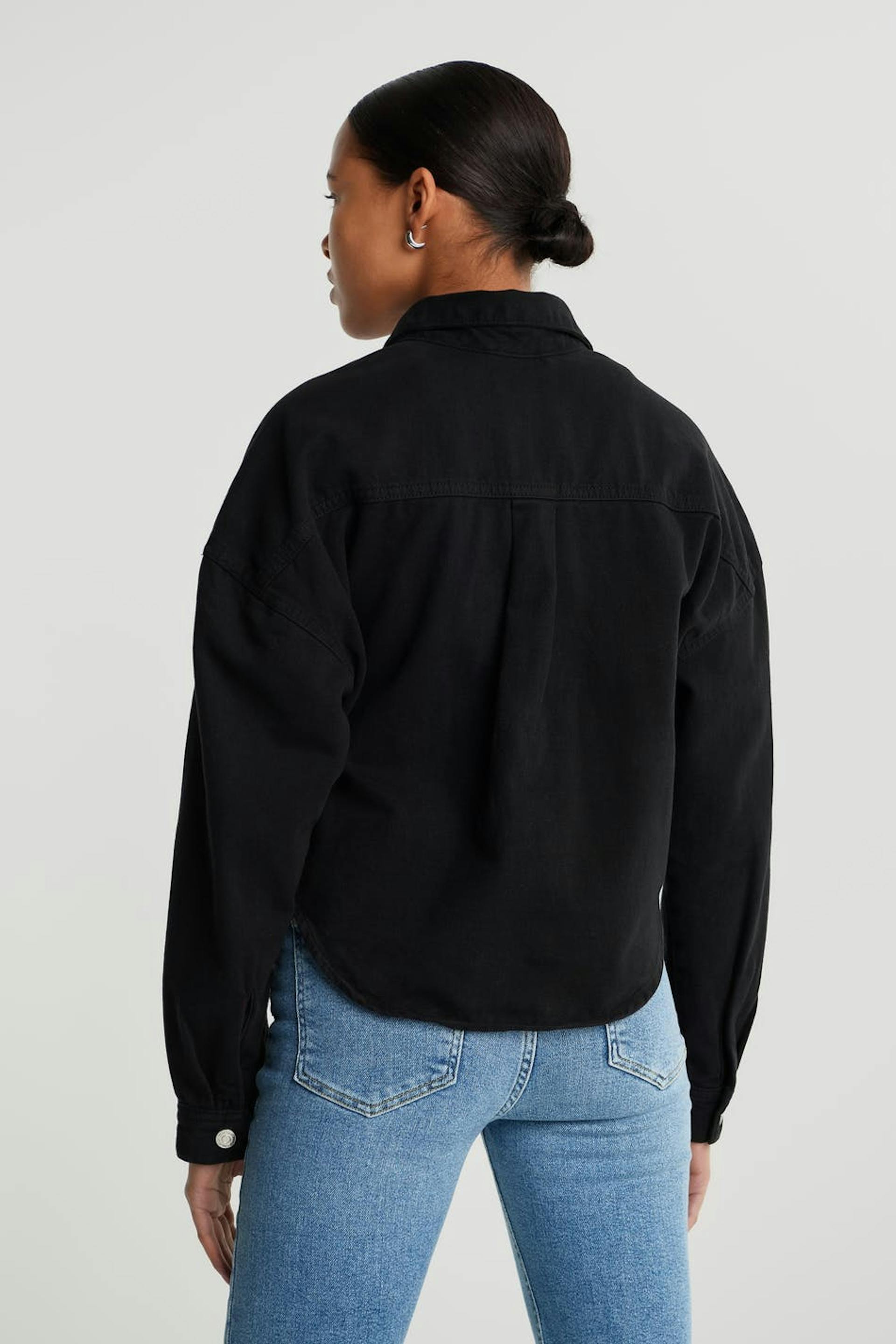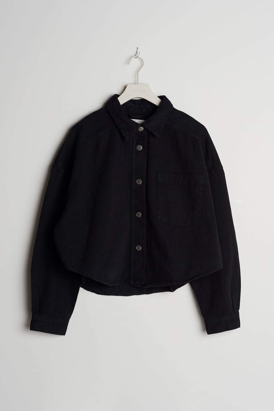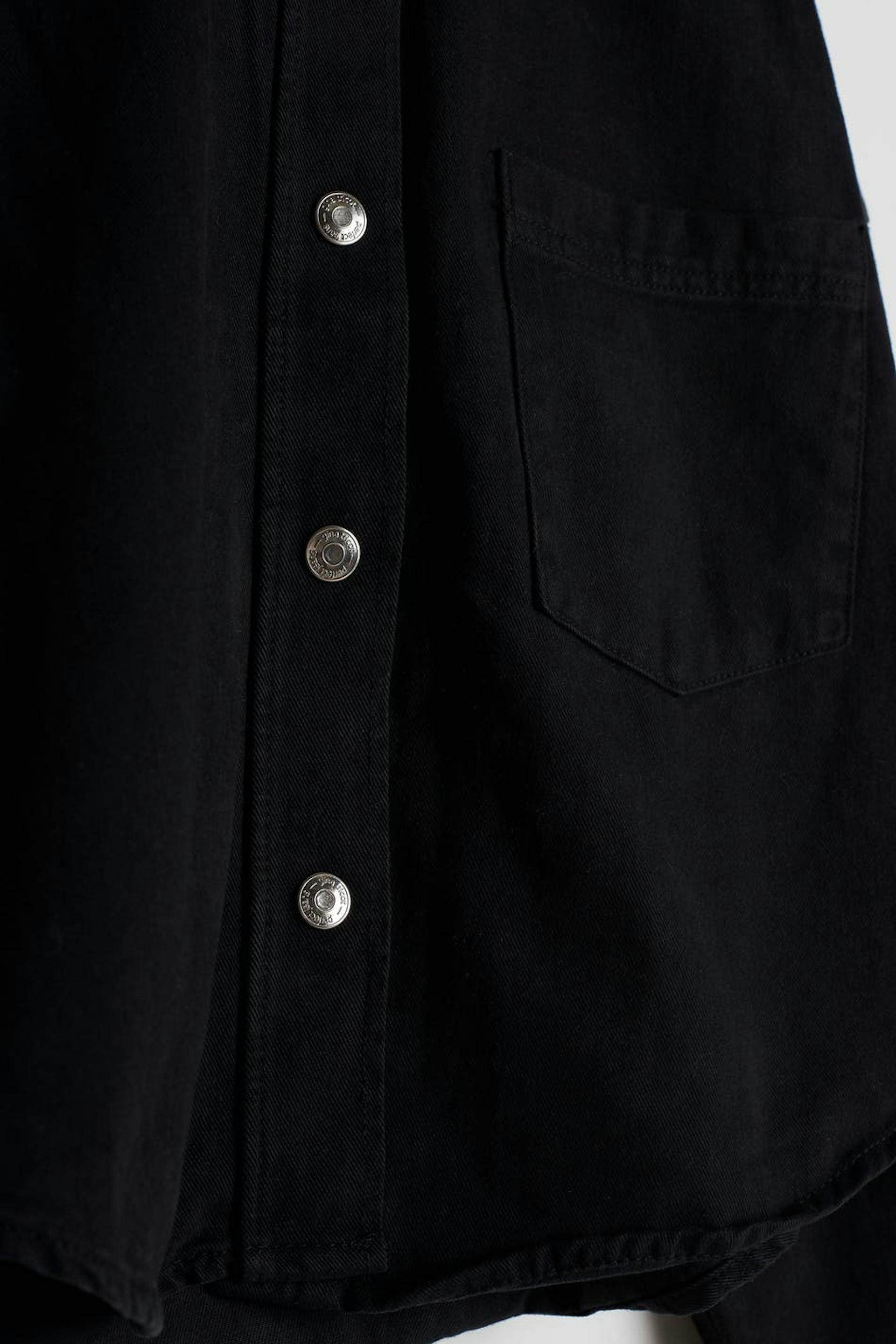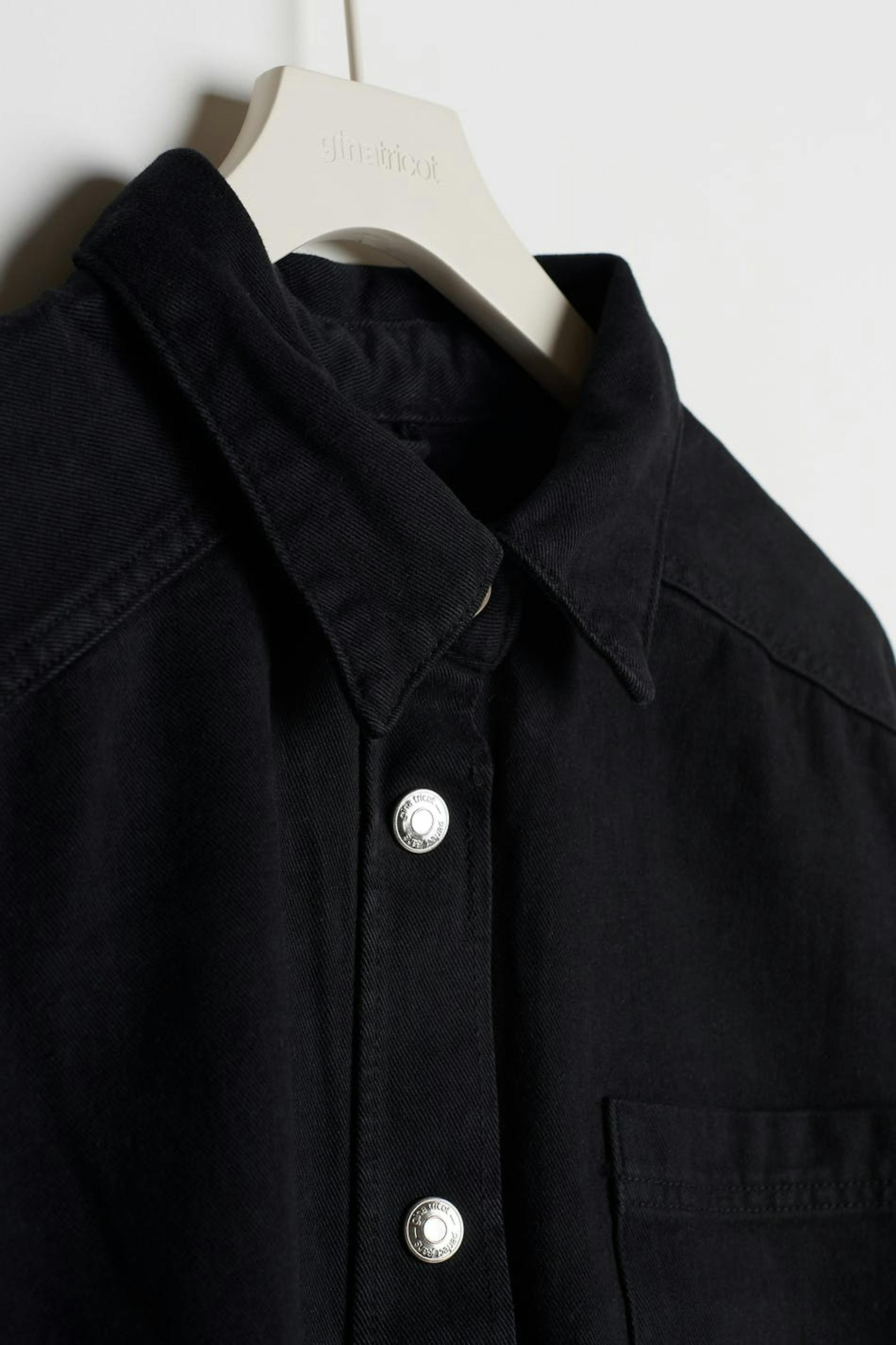 Cropped shirt with an oversize fit. The shirt is black and has snap buttons at the front. It has a chest pocket and a thin material in denim.