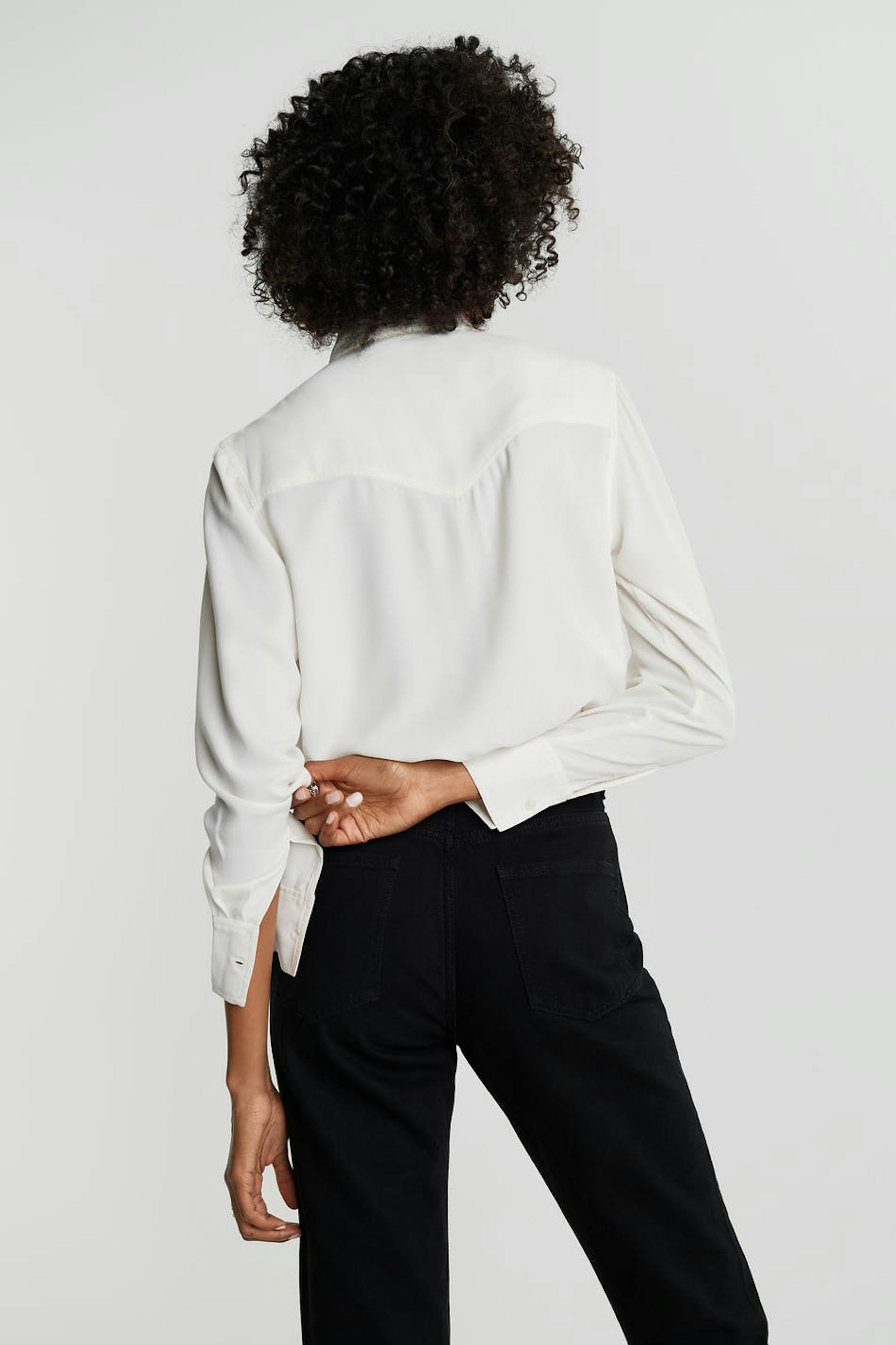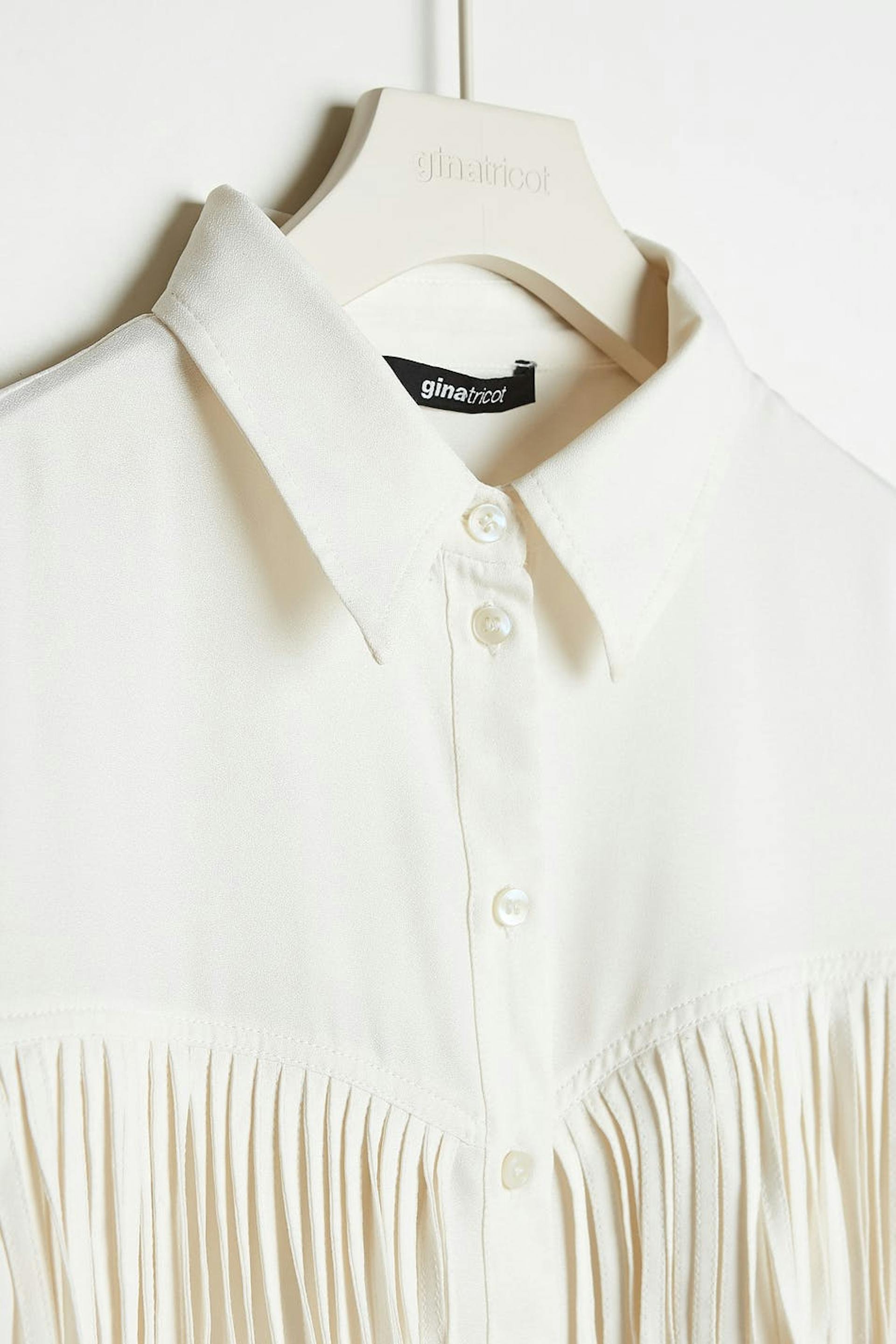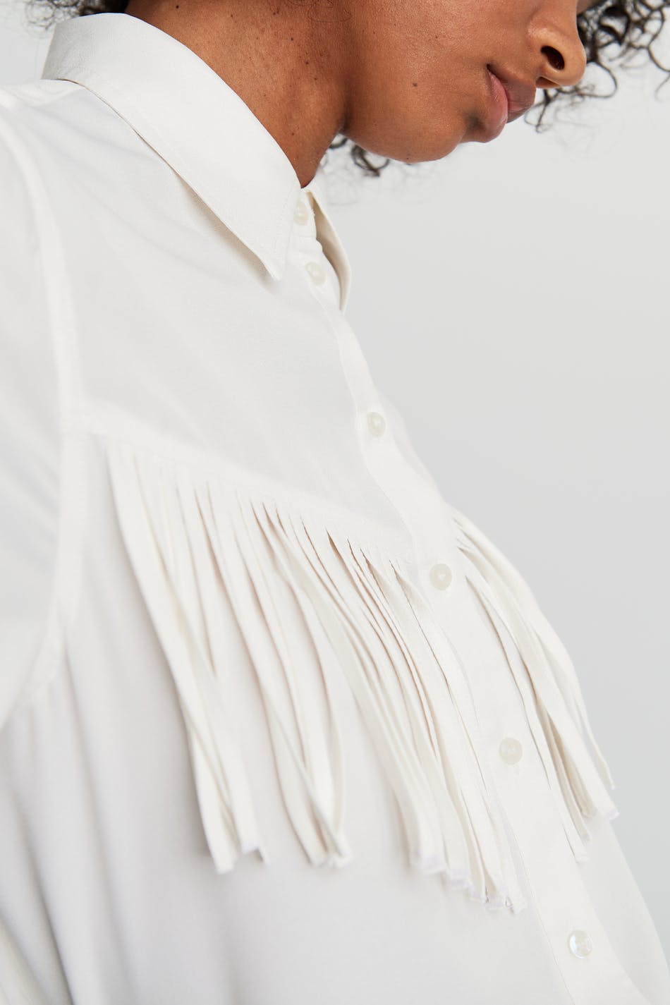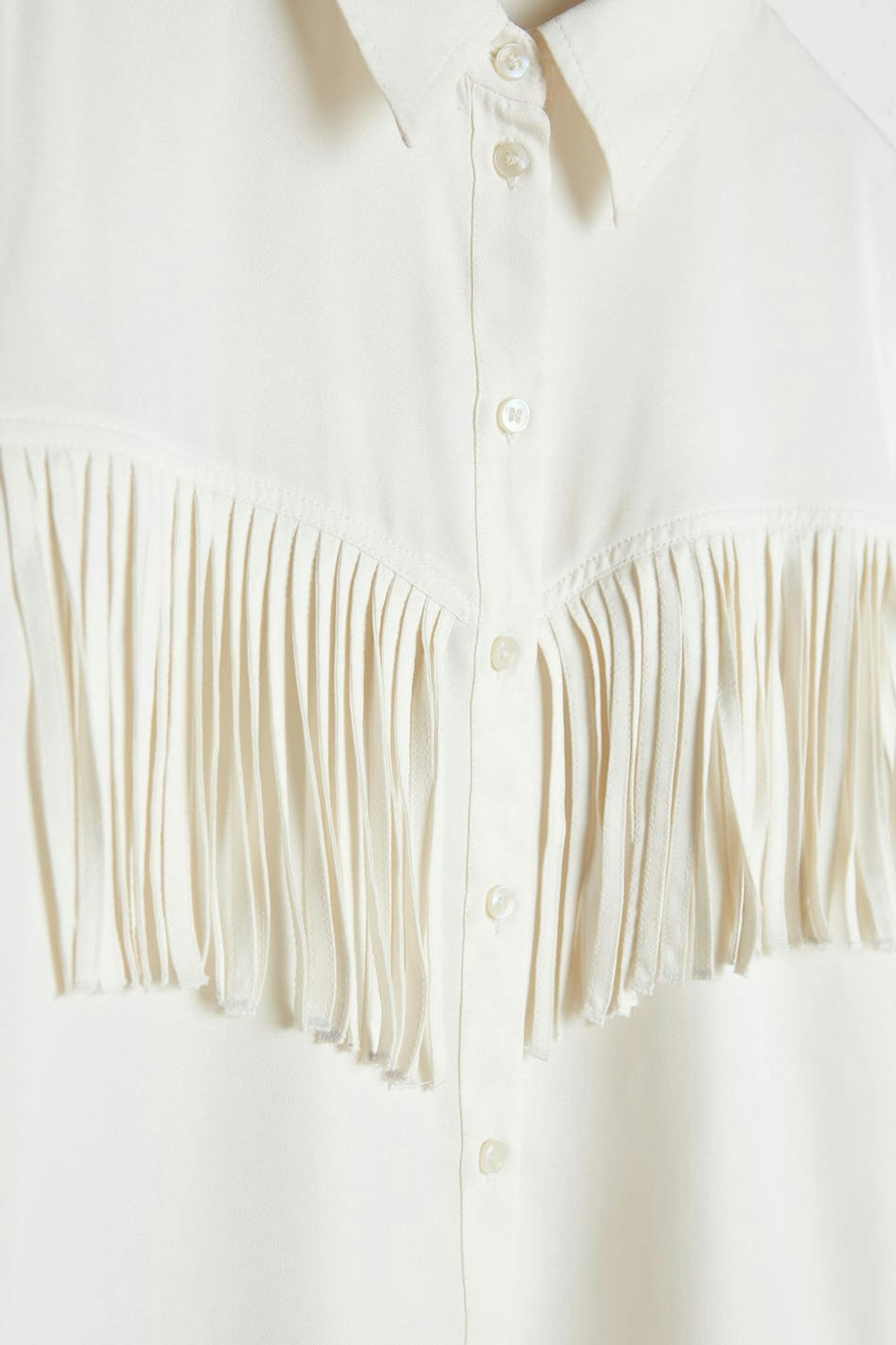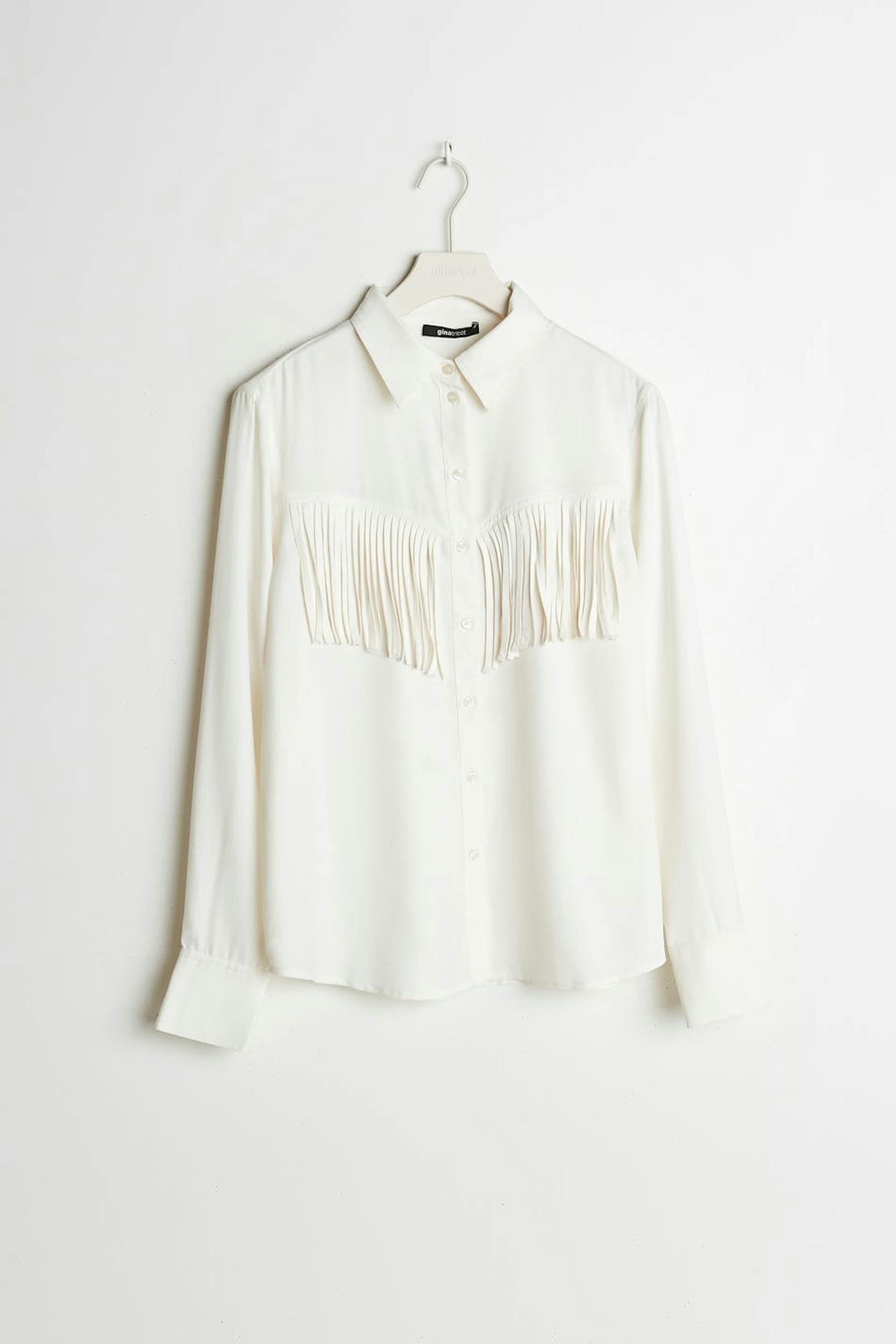 Long-sleeved shirt with fringes at the front. The shirt is white.