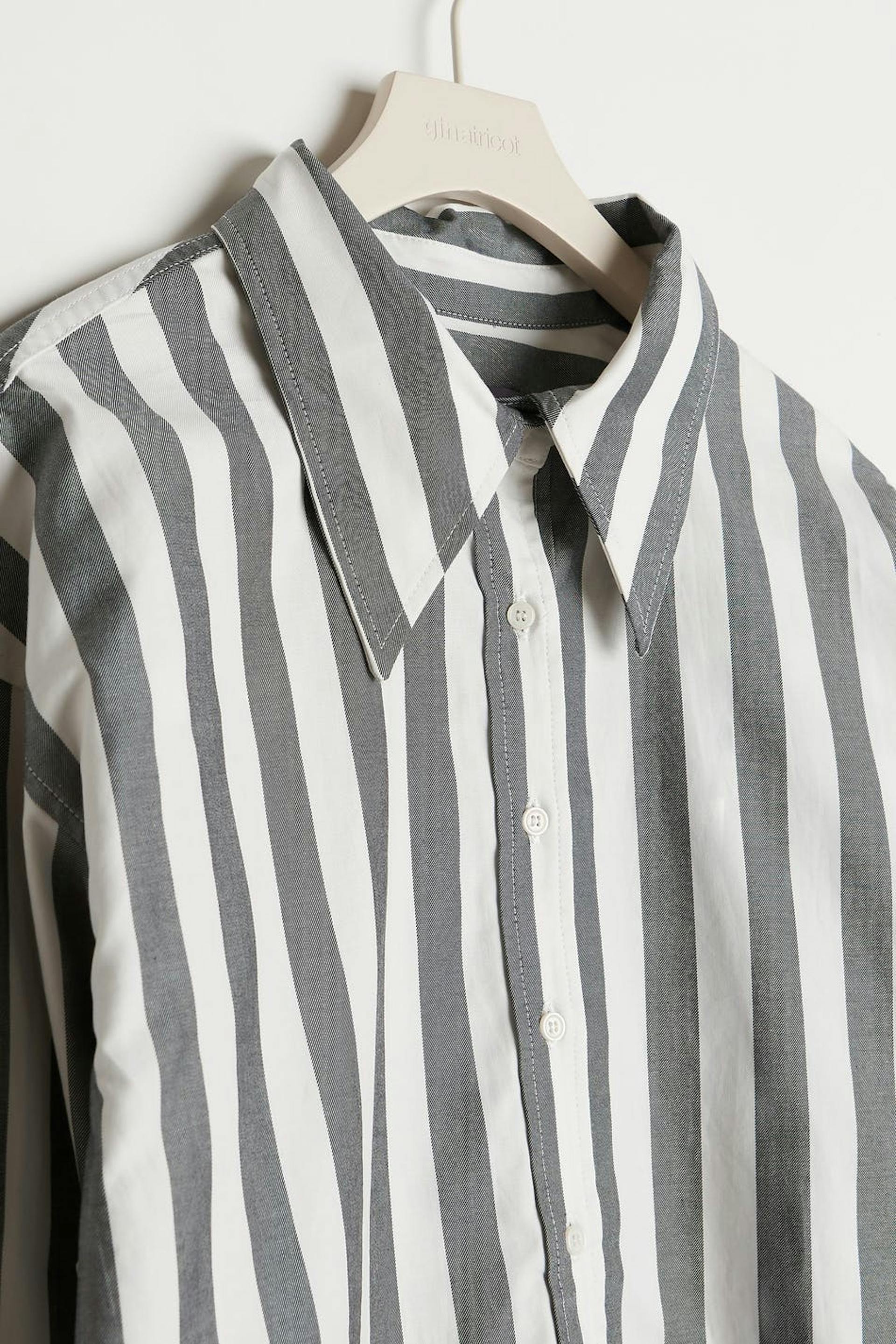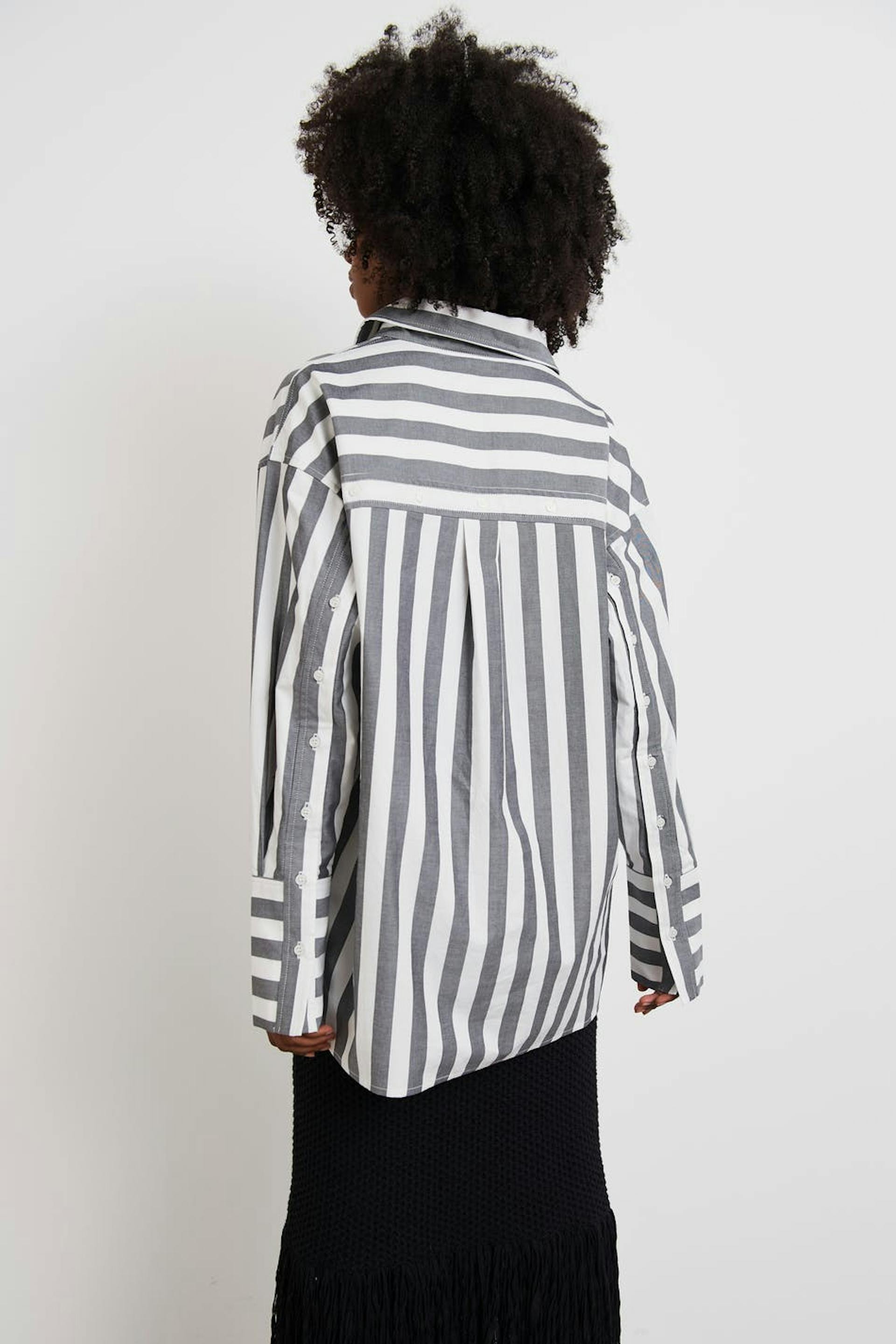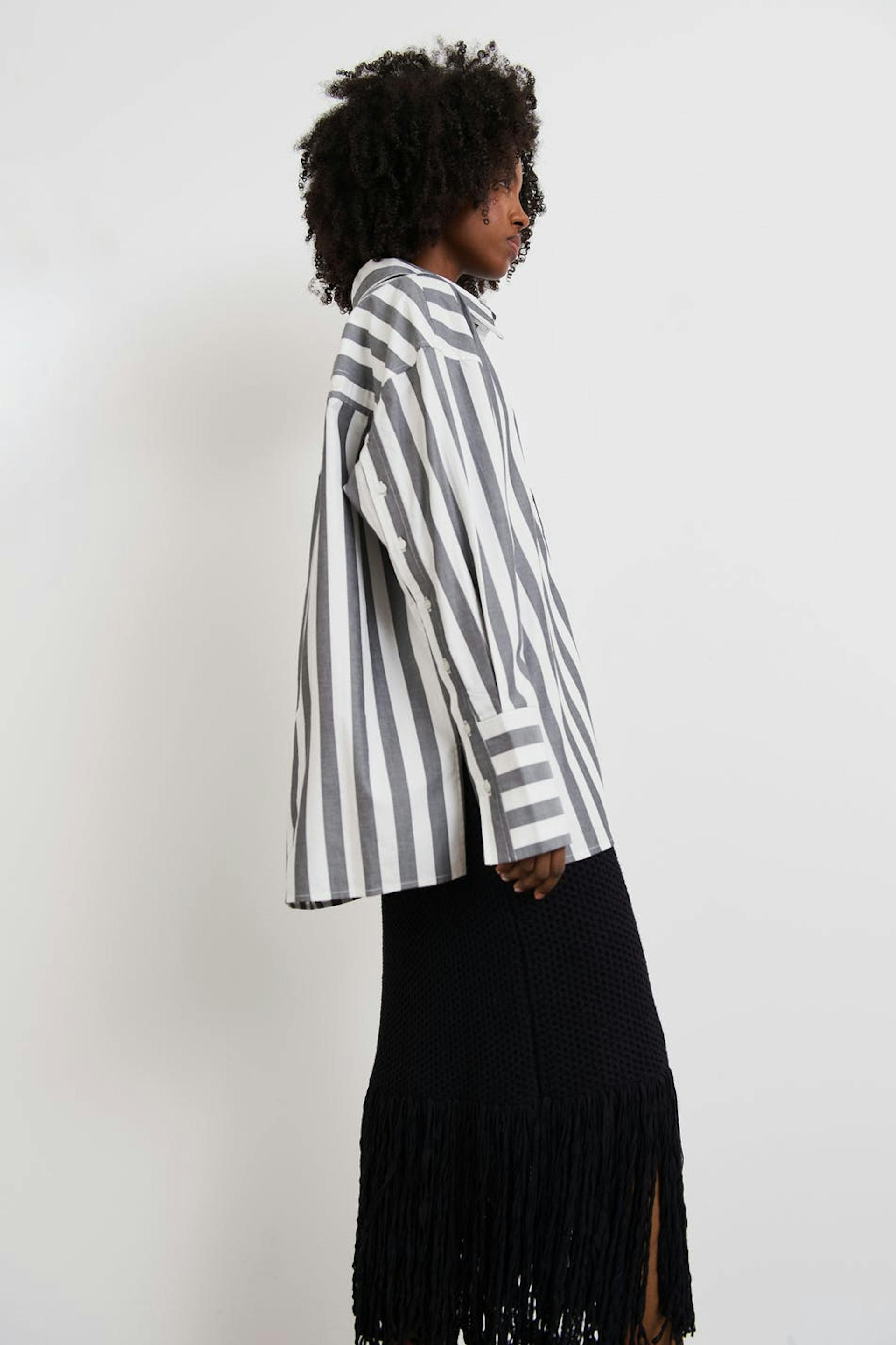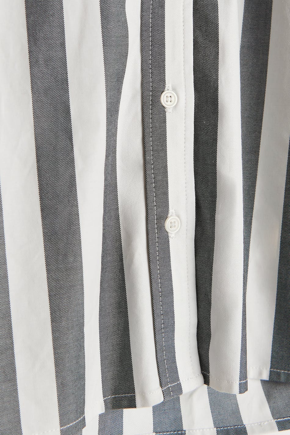 Striped shirt with an oversize fit. The shirt is white and black and has dropped shoulders. It is made of cotton twill and has a big, pointy collar, high cuffs and a button closure at the front and along both sleeves.