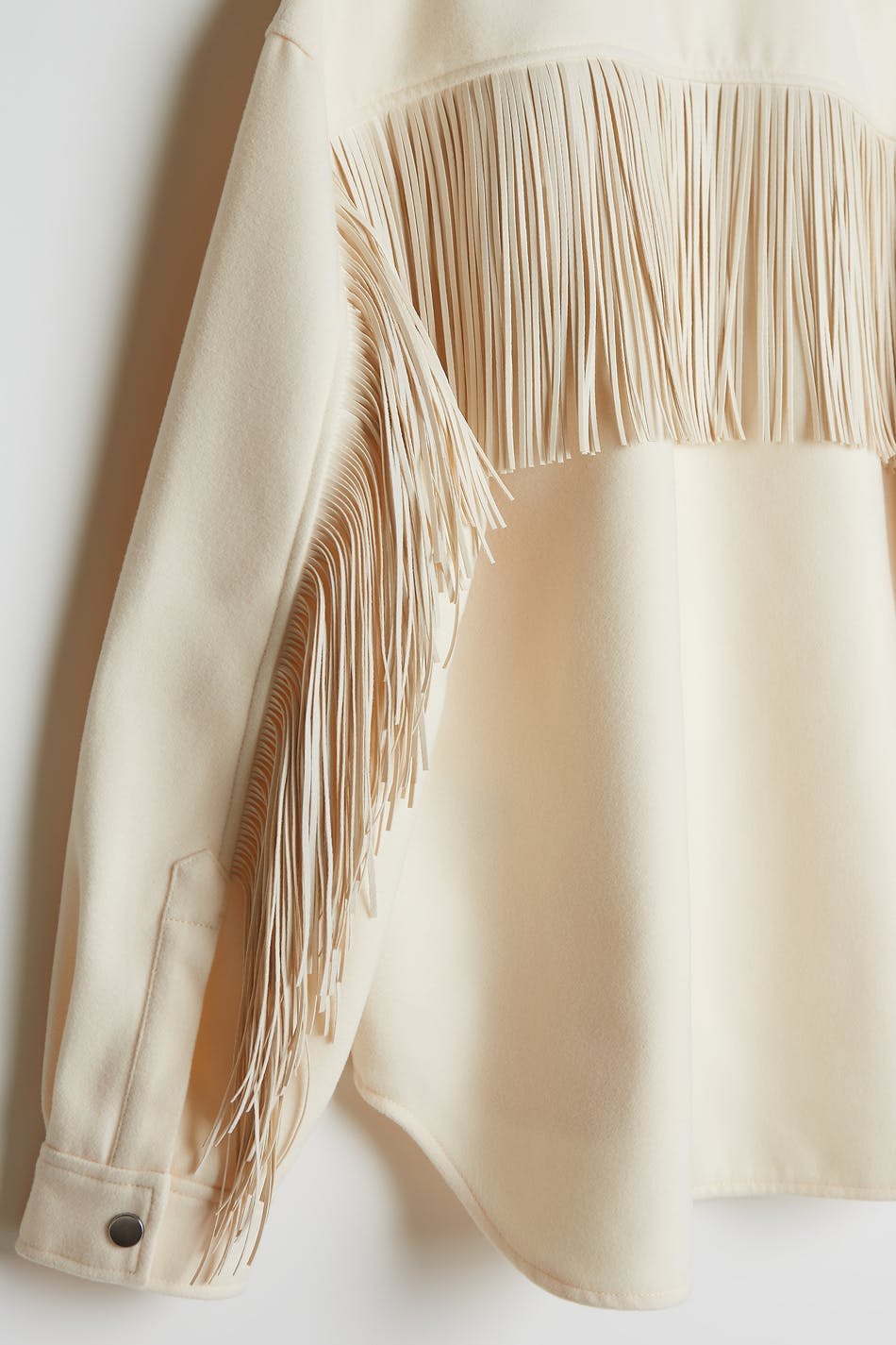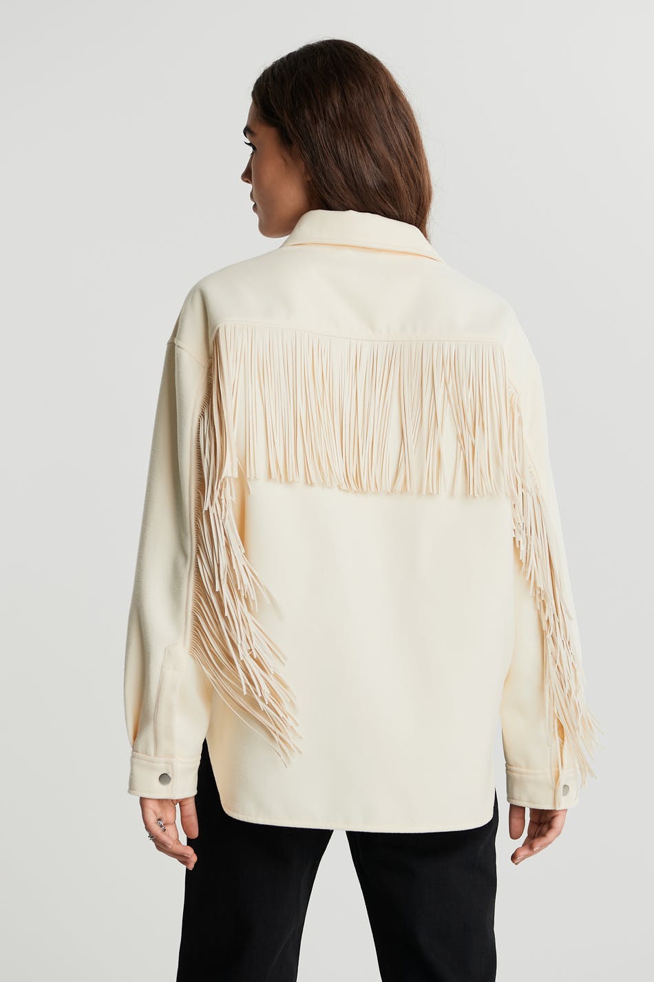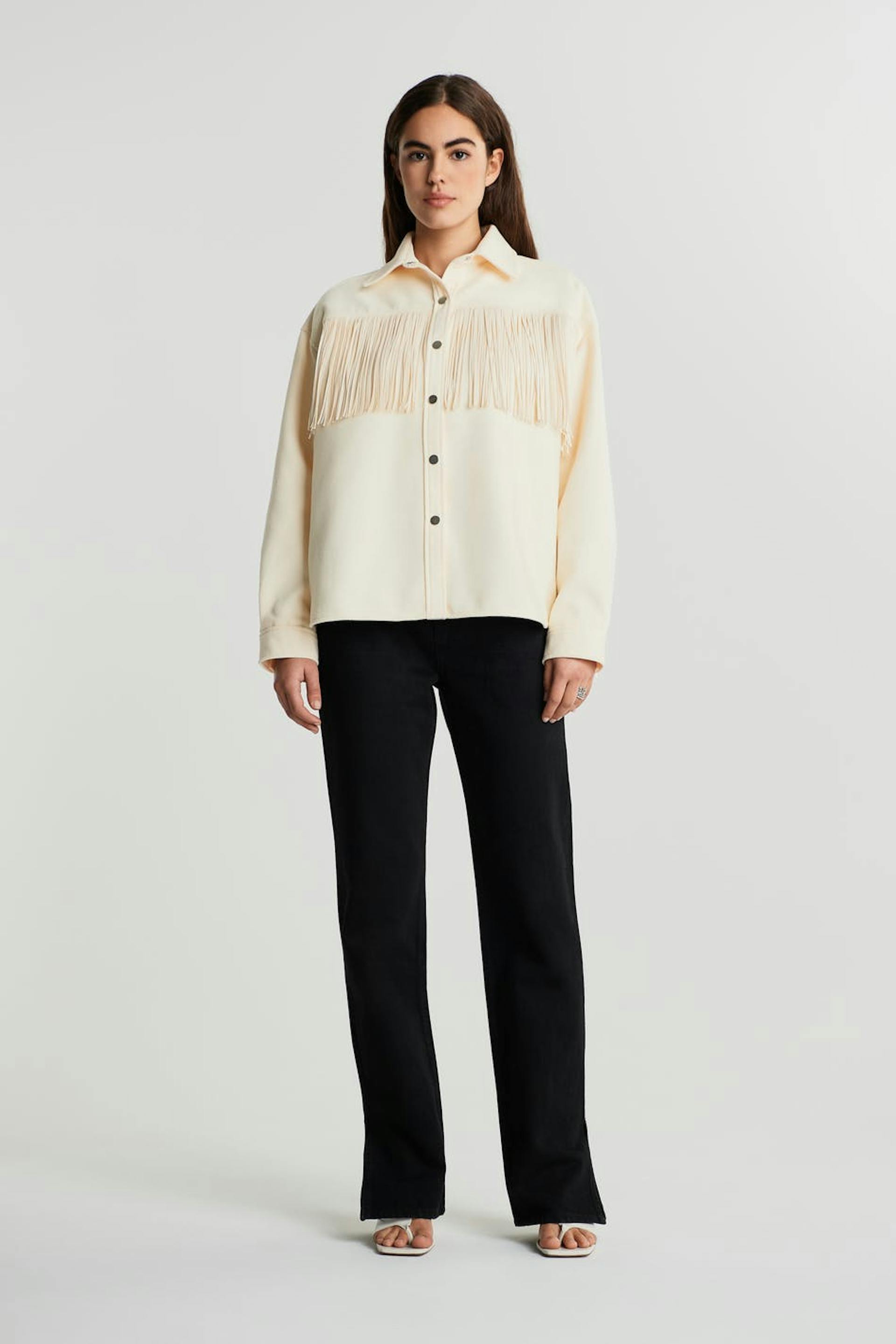 Shirt with fringes on the chest and in the back. The shirt is white and has snap buttons. It has a straight, boxy fit.