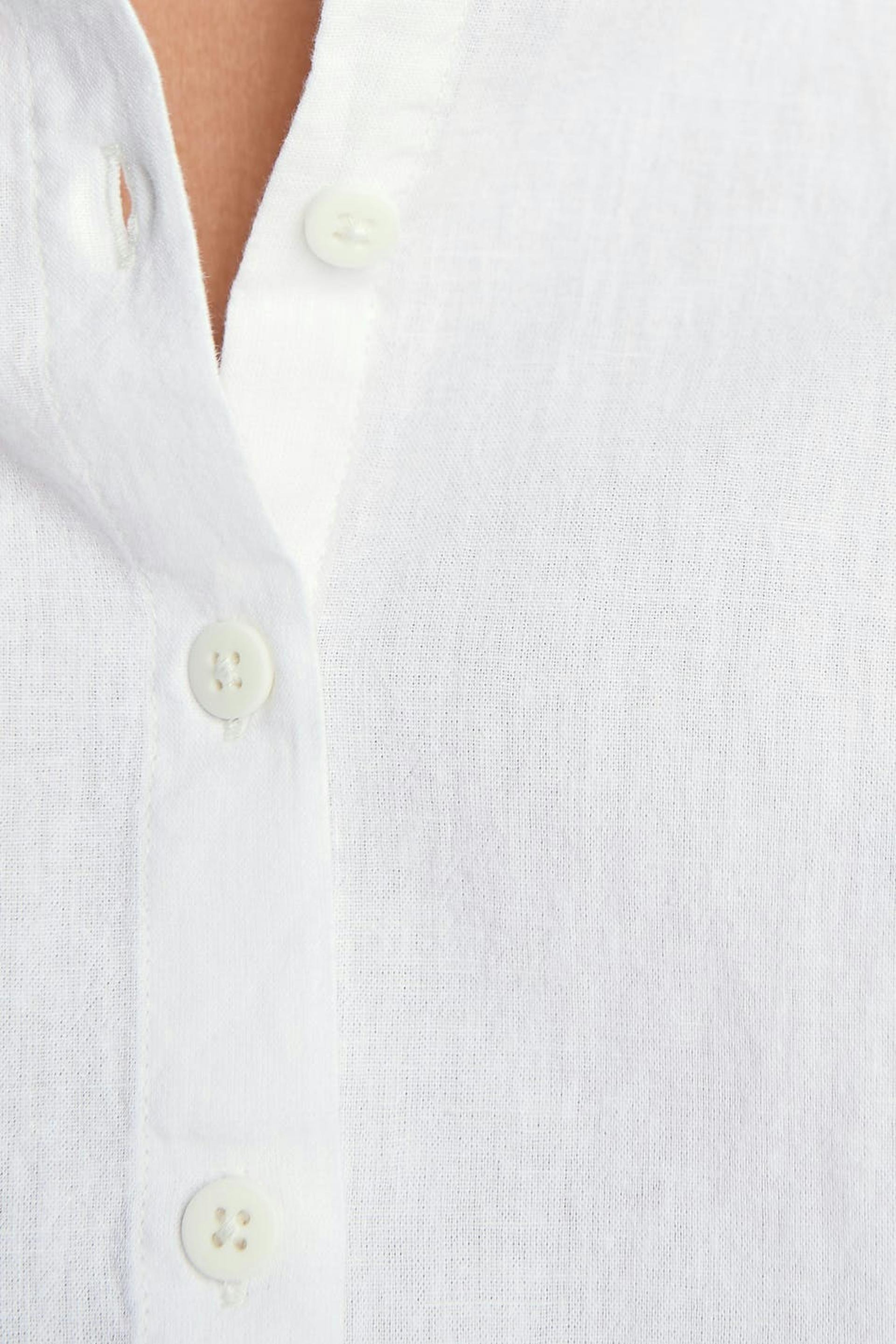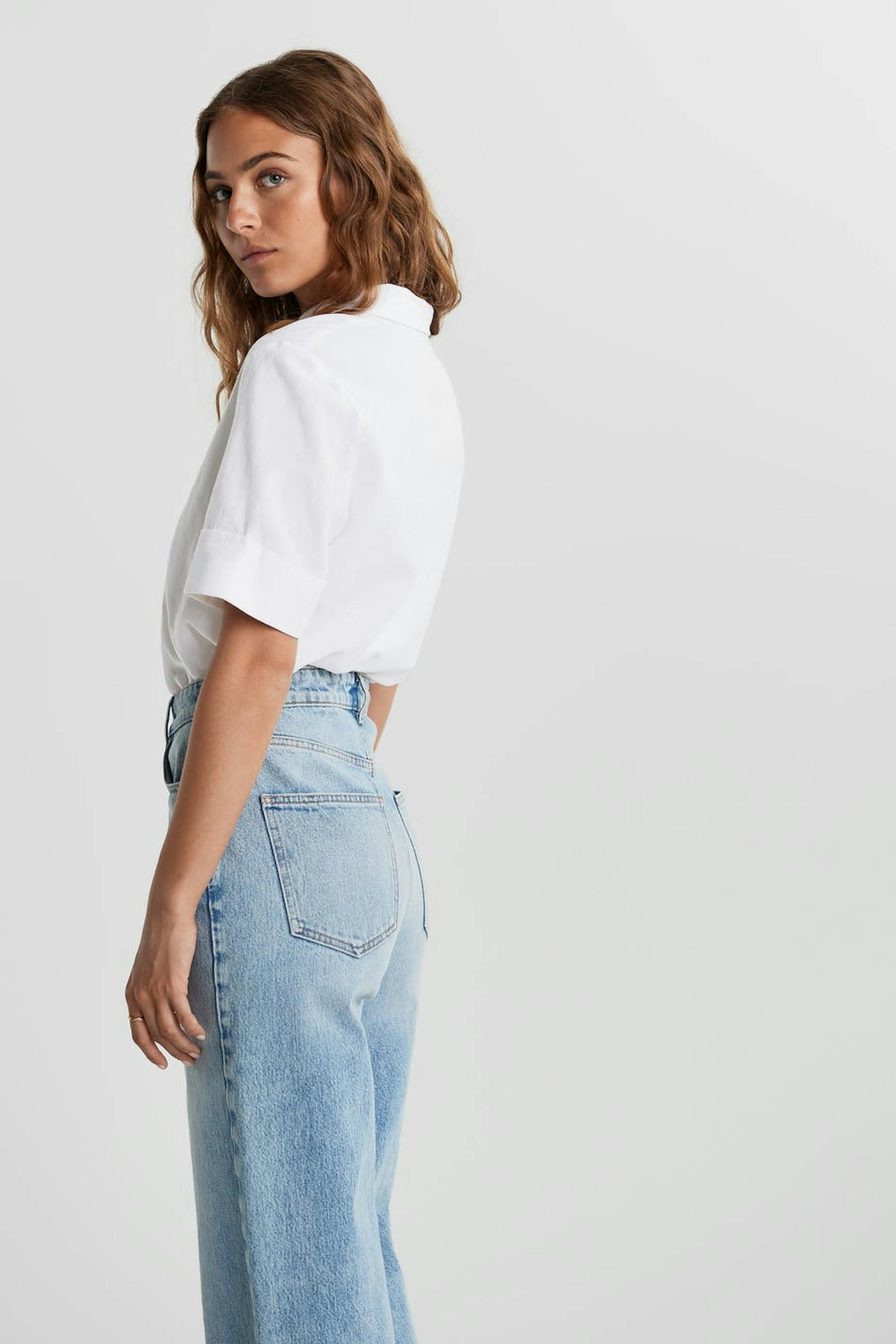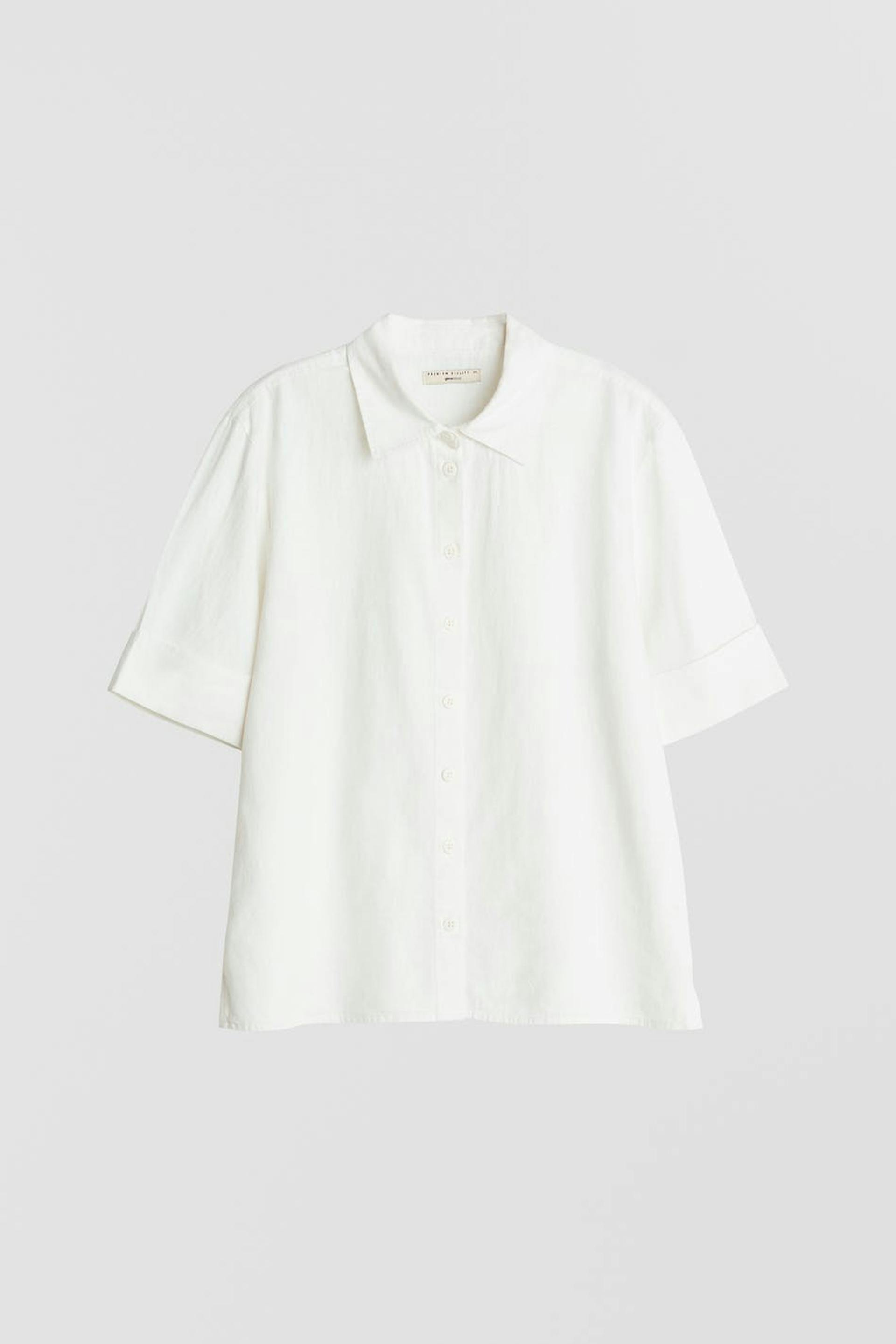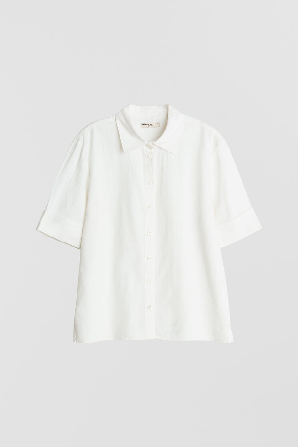 Short-sleeved shirt with buttons. The shirt is white and has folded sleeves. It has a straight fit.