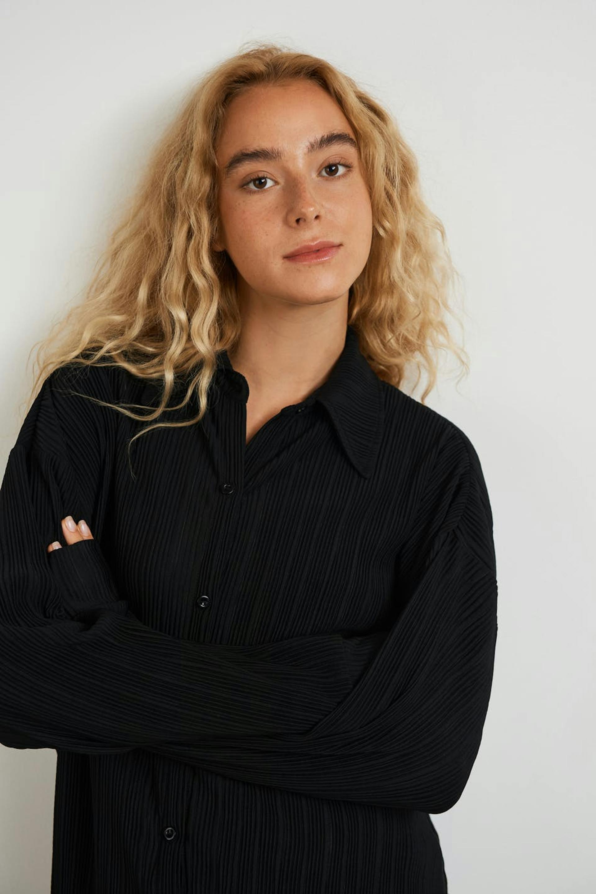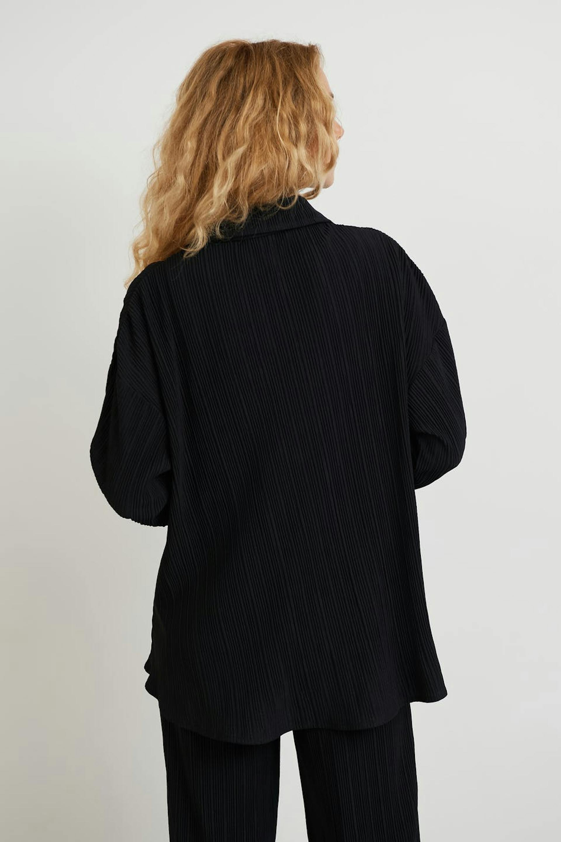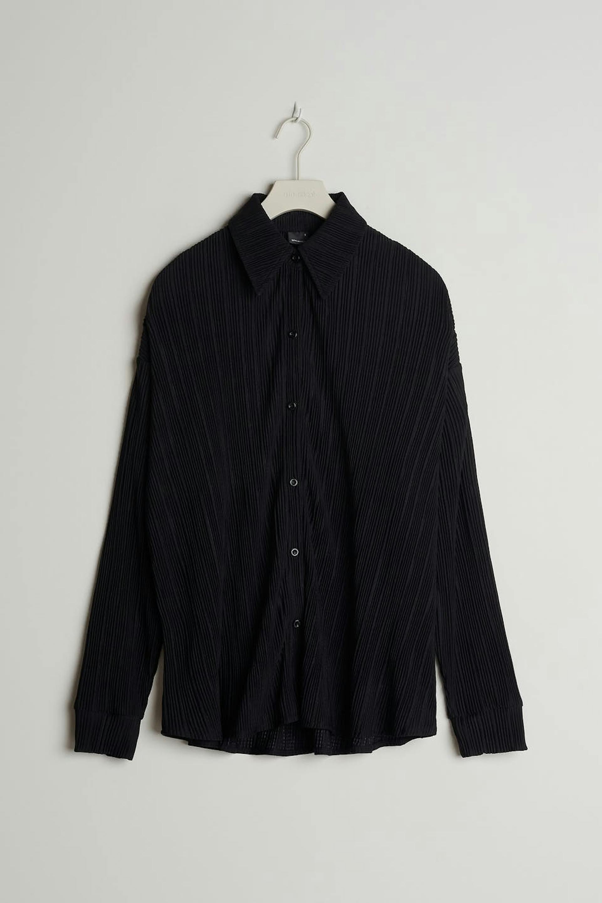 Pleated shirt with an oversize fit. The shirt is black and has a button closure at the front.