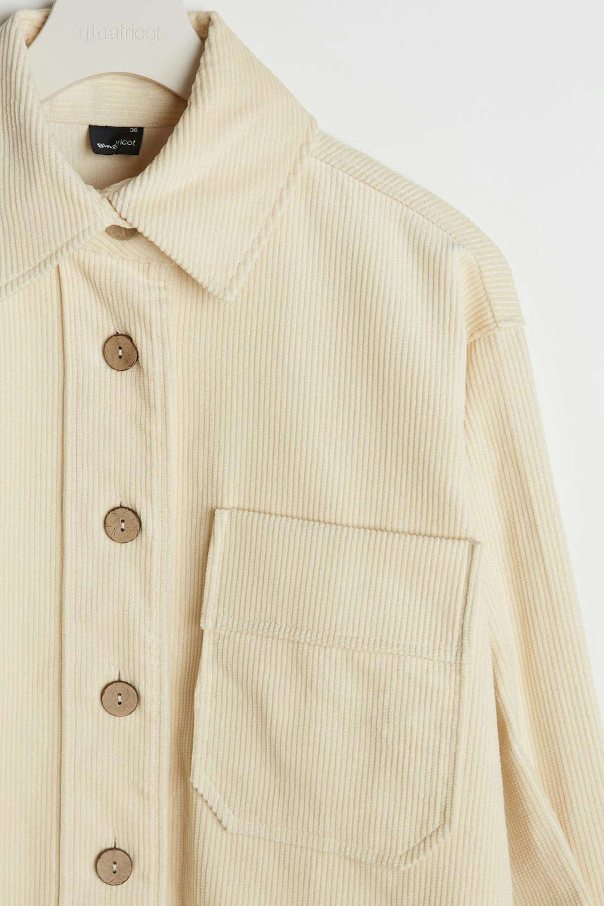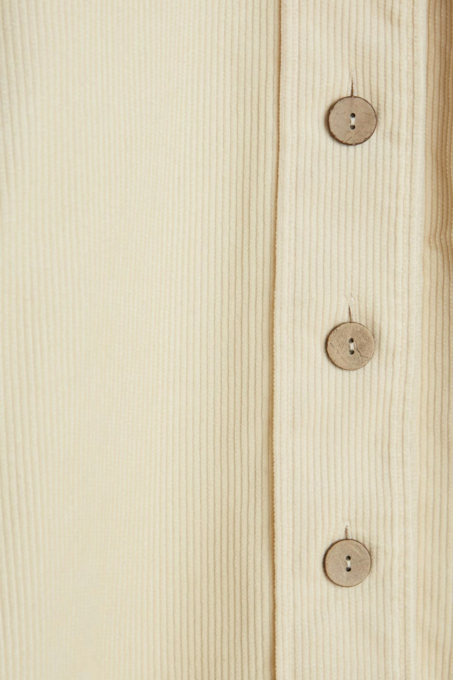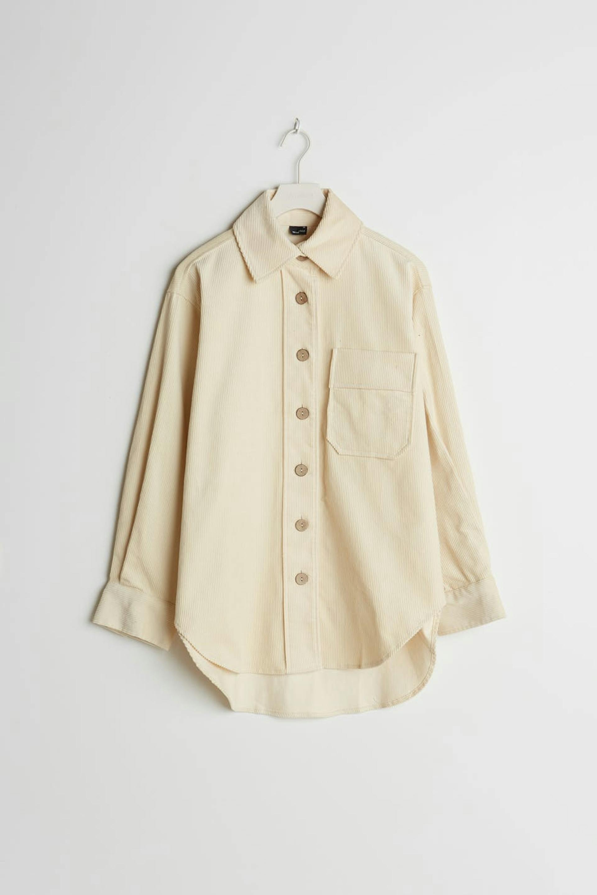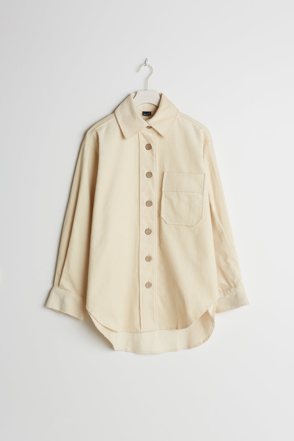 Shirt with long, spacious sleeves. The shirt is bone-white and has large buttons at the front. It is made of corduroy.
