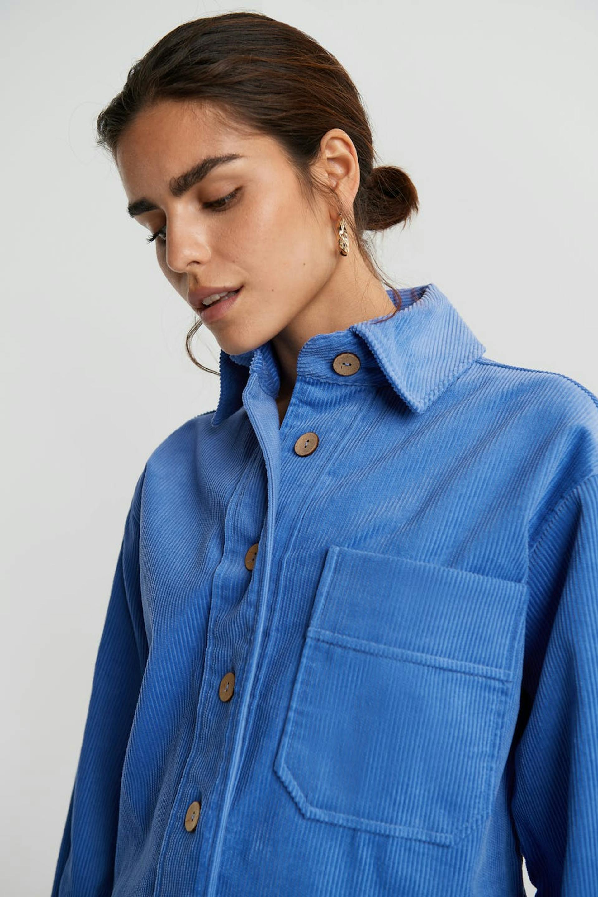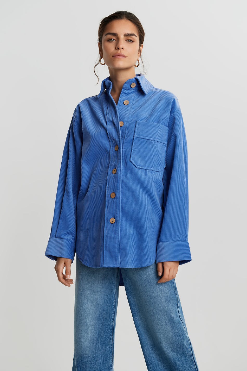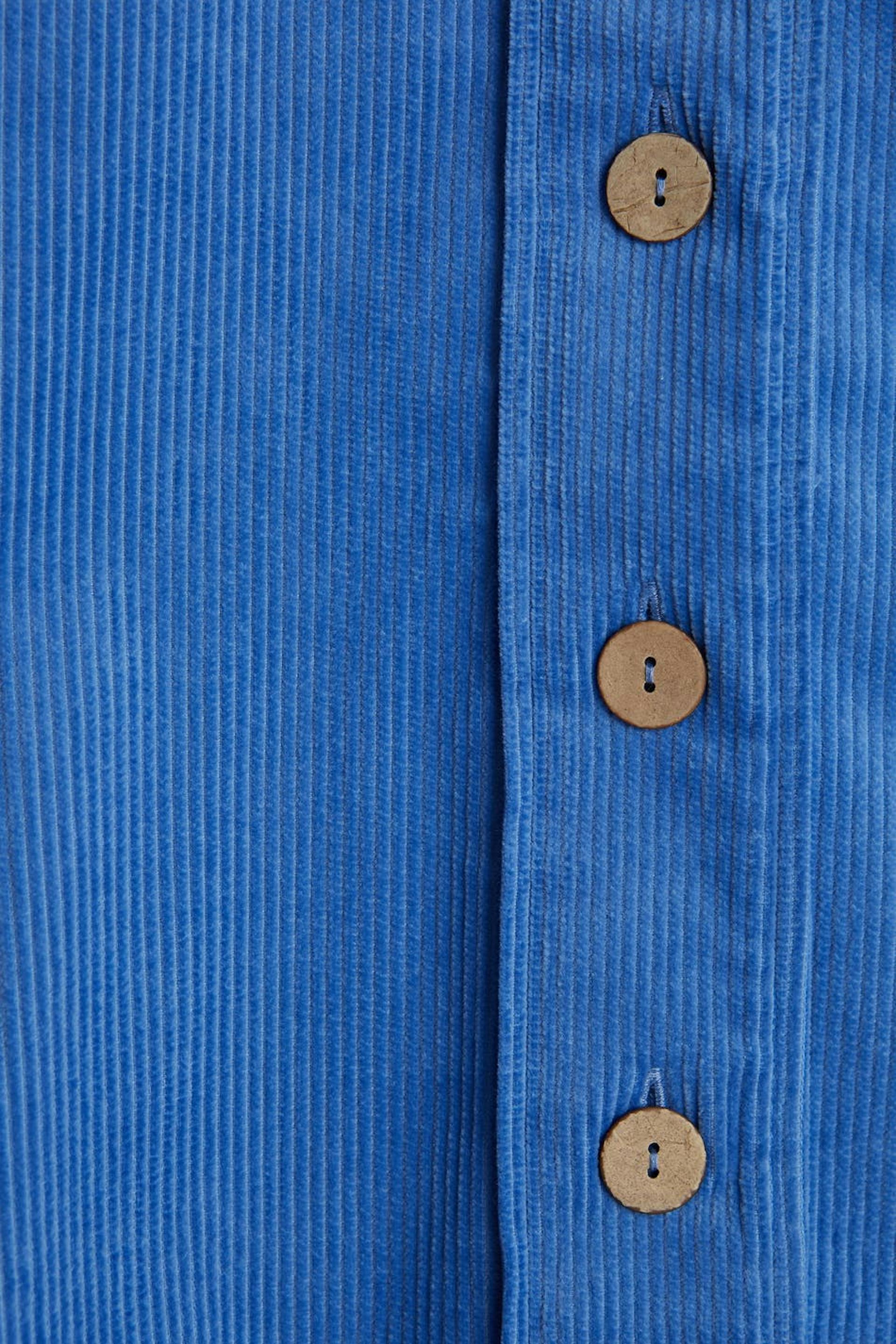 Shirt with long, spacious sleeves. The shirt is blue and has large buttons at the front. It is made of corduroy.