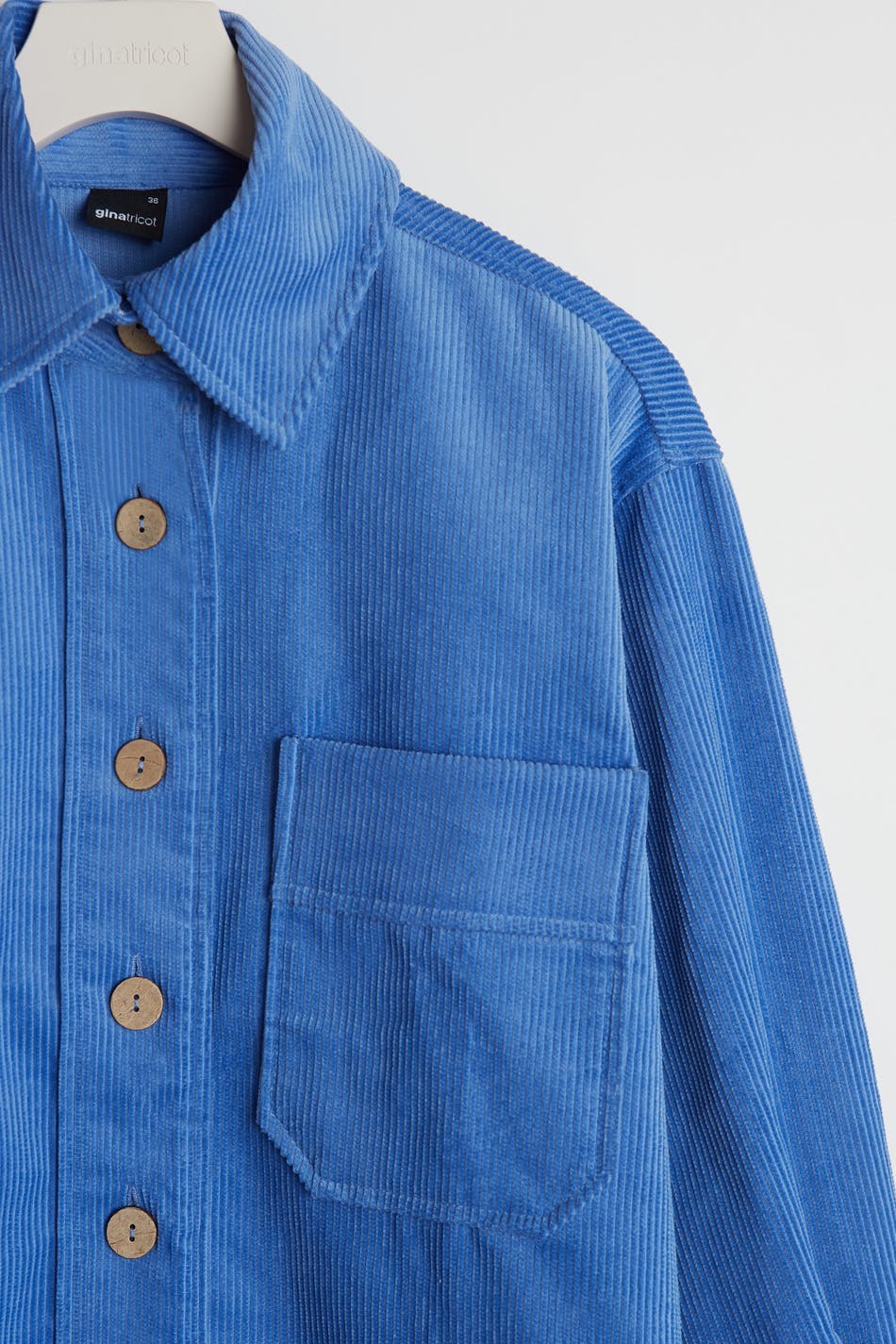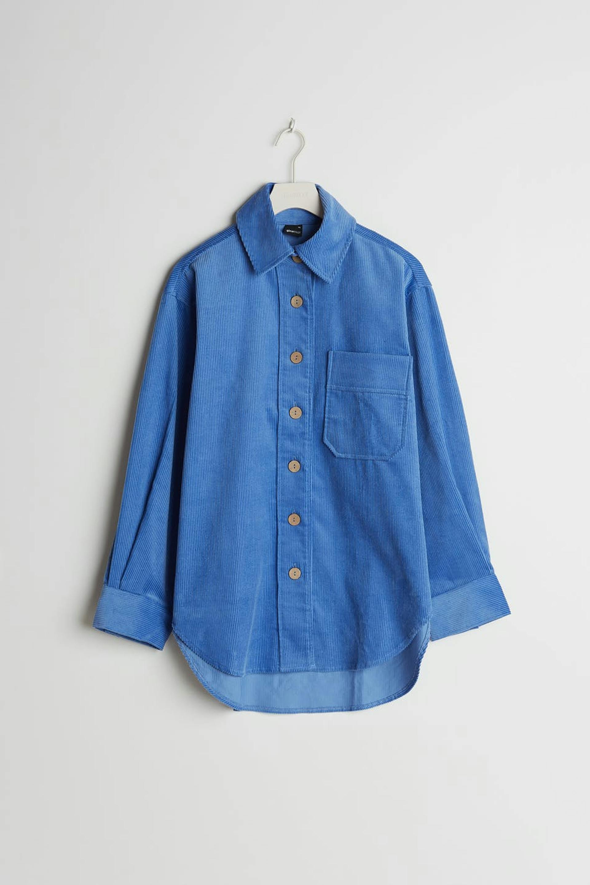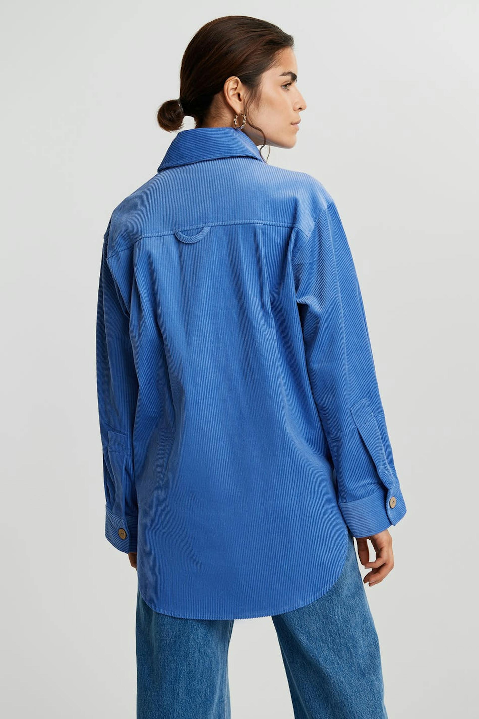 Shirt with long, spacious sleeves. The shirt is blue and has large buttons at the front. It is made of corduroy.