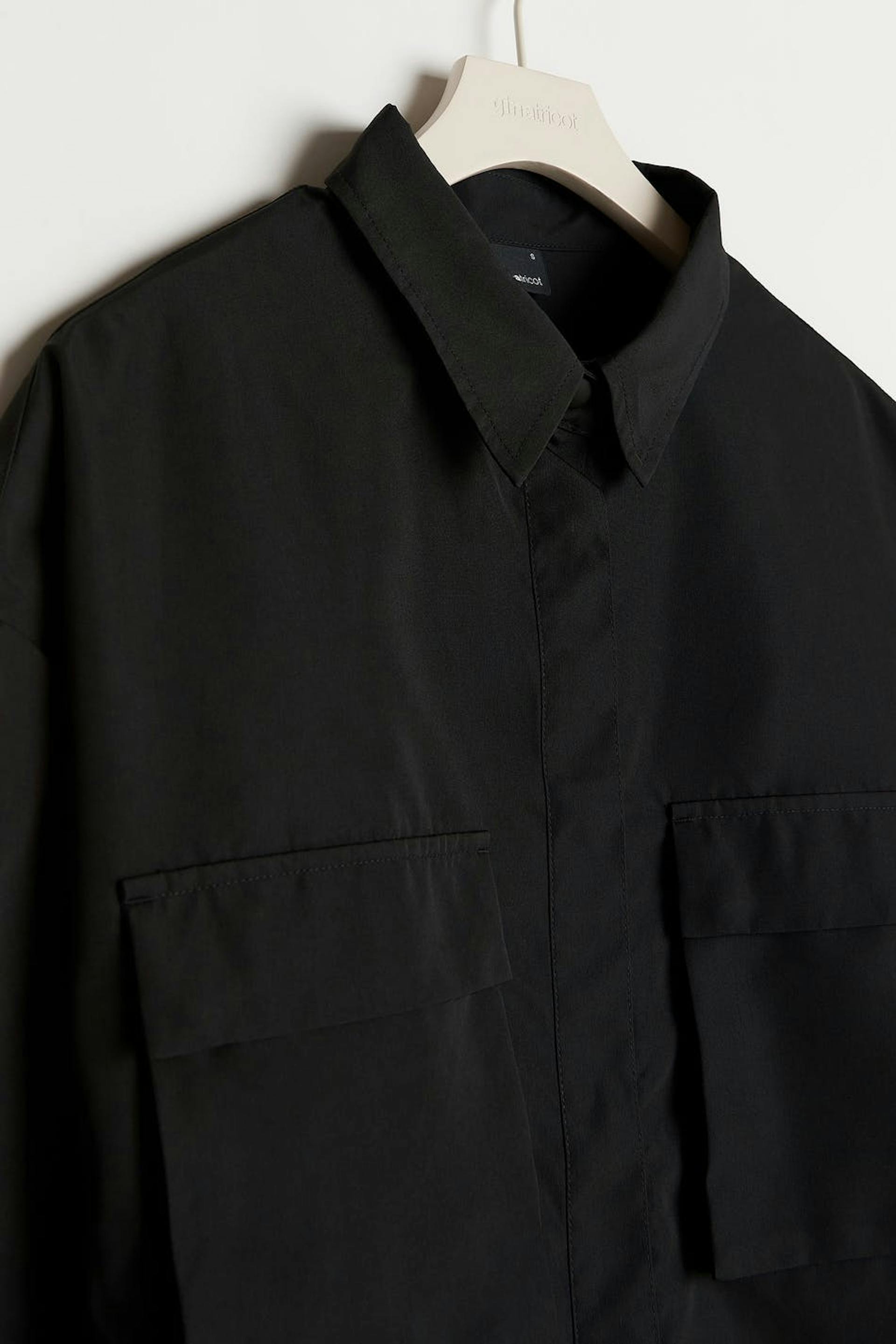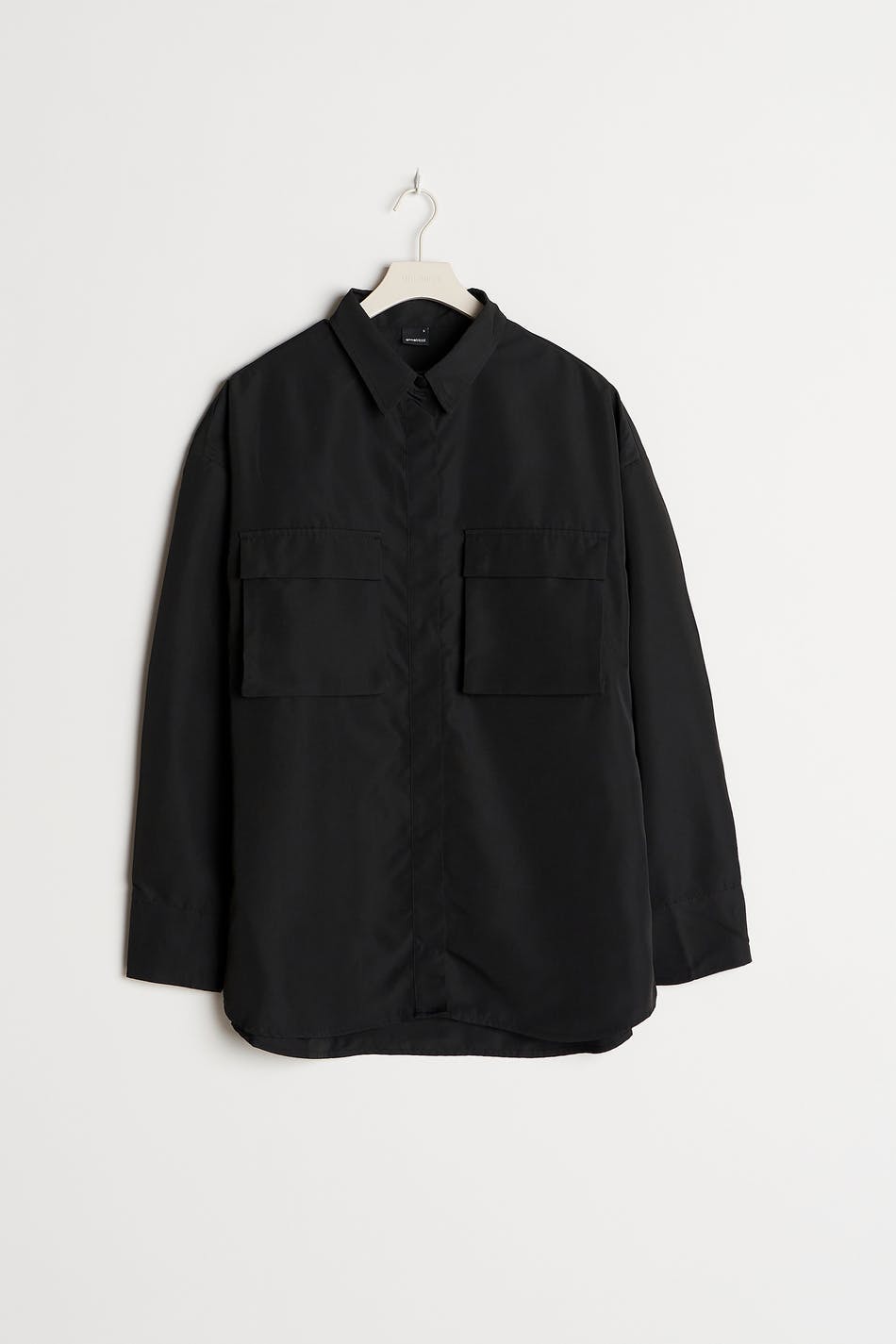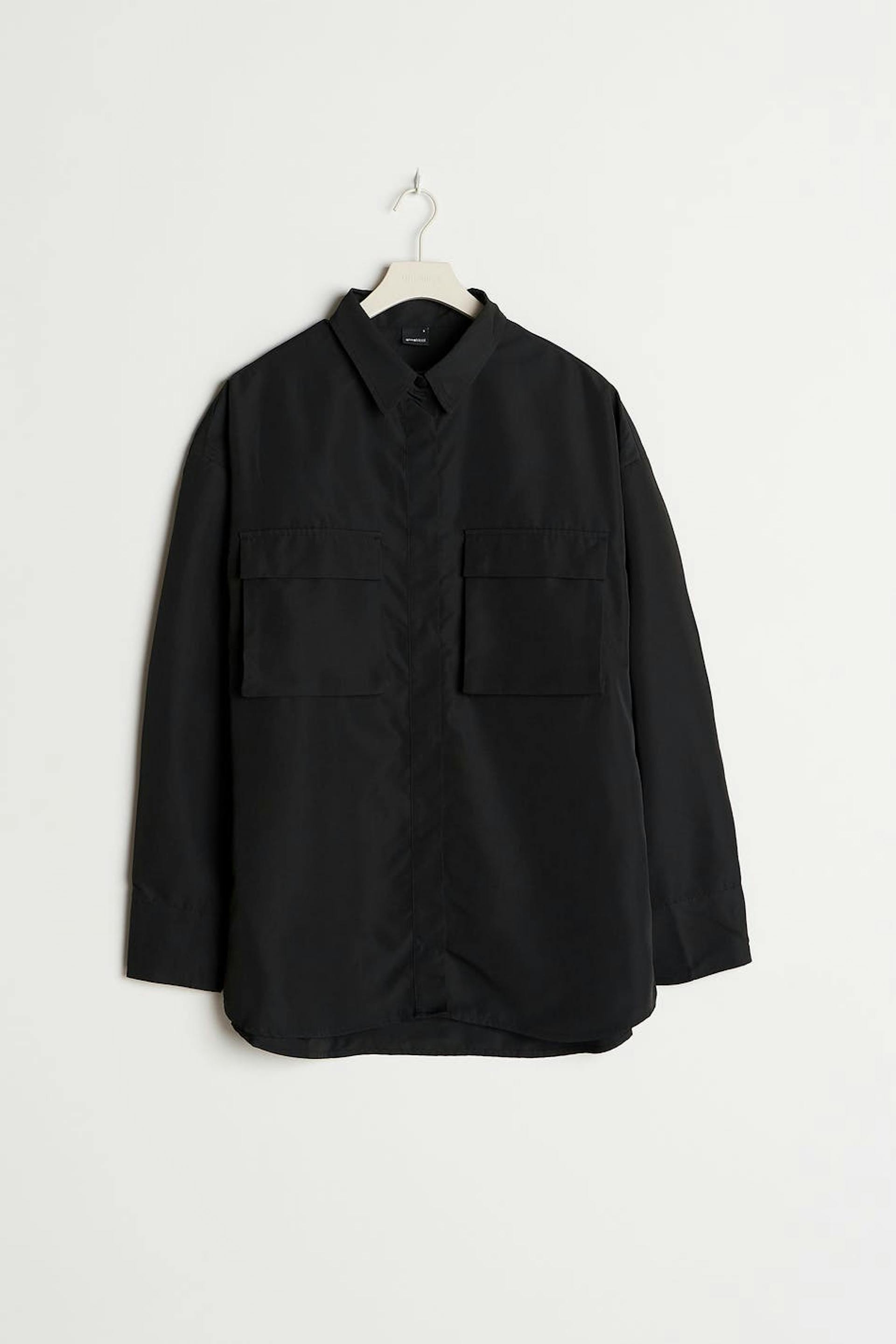 Shirt by Gina Lab with an oversize fit. The shirt is black and has a material in recycled polyester coloured by We aRe SpinDye®. It has flap pockets and a button closure at the front.