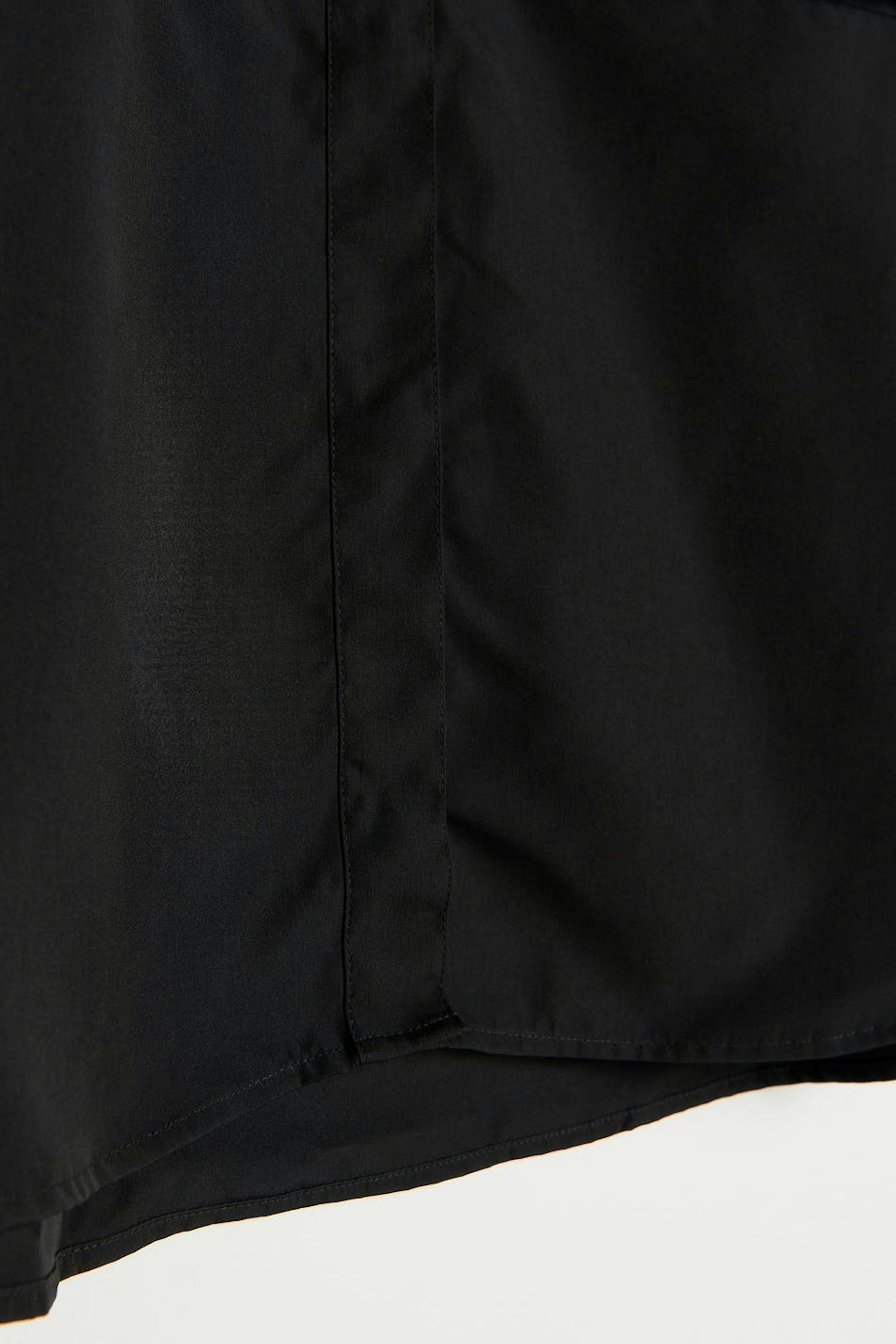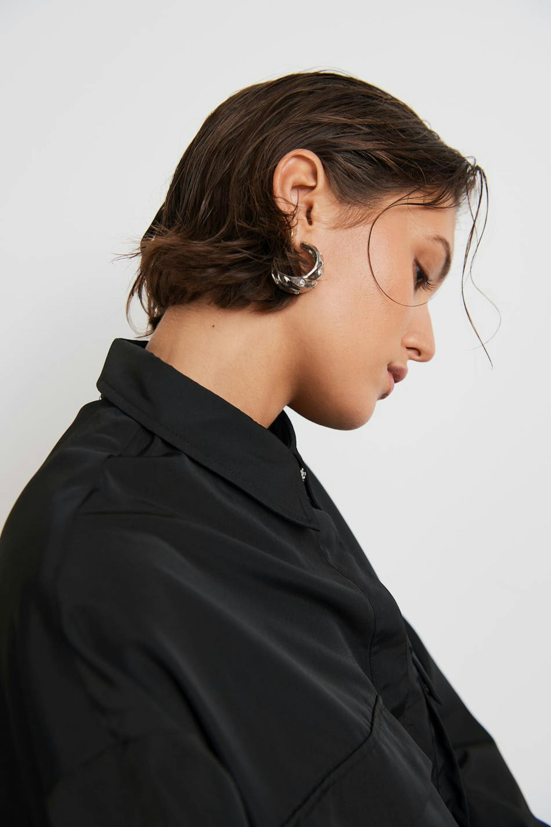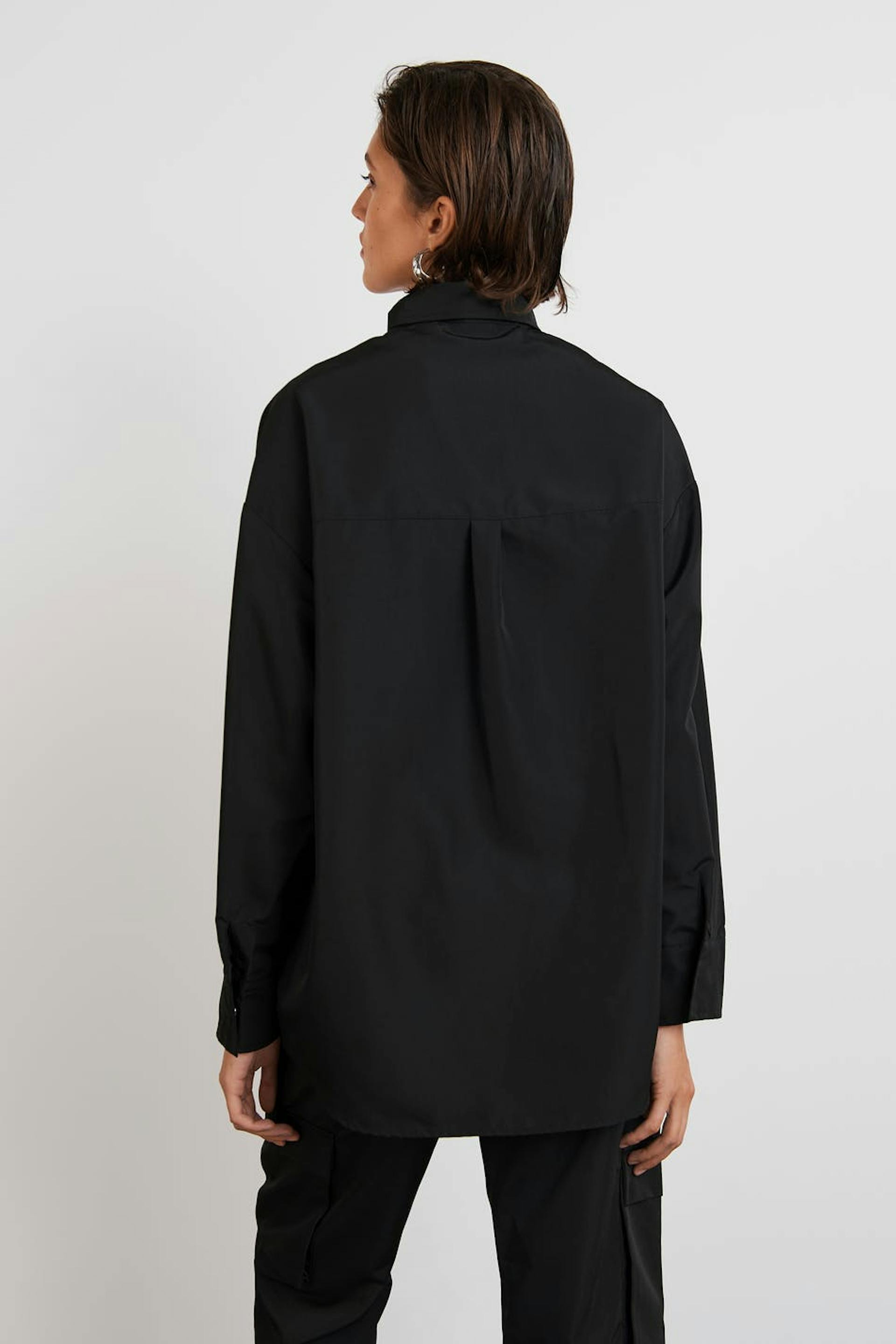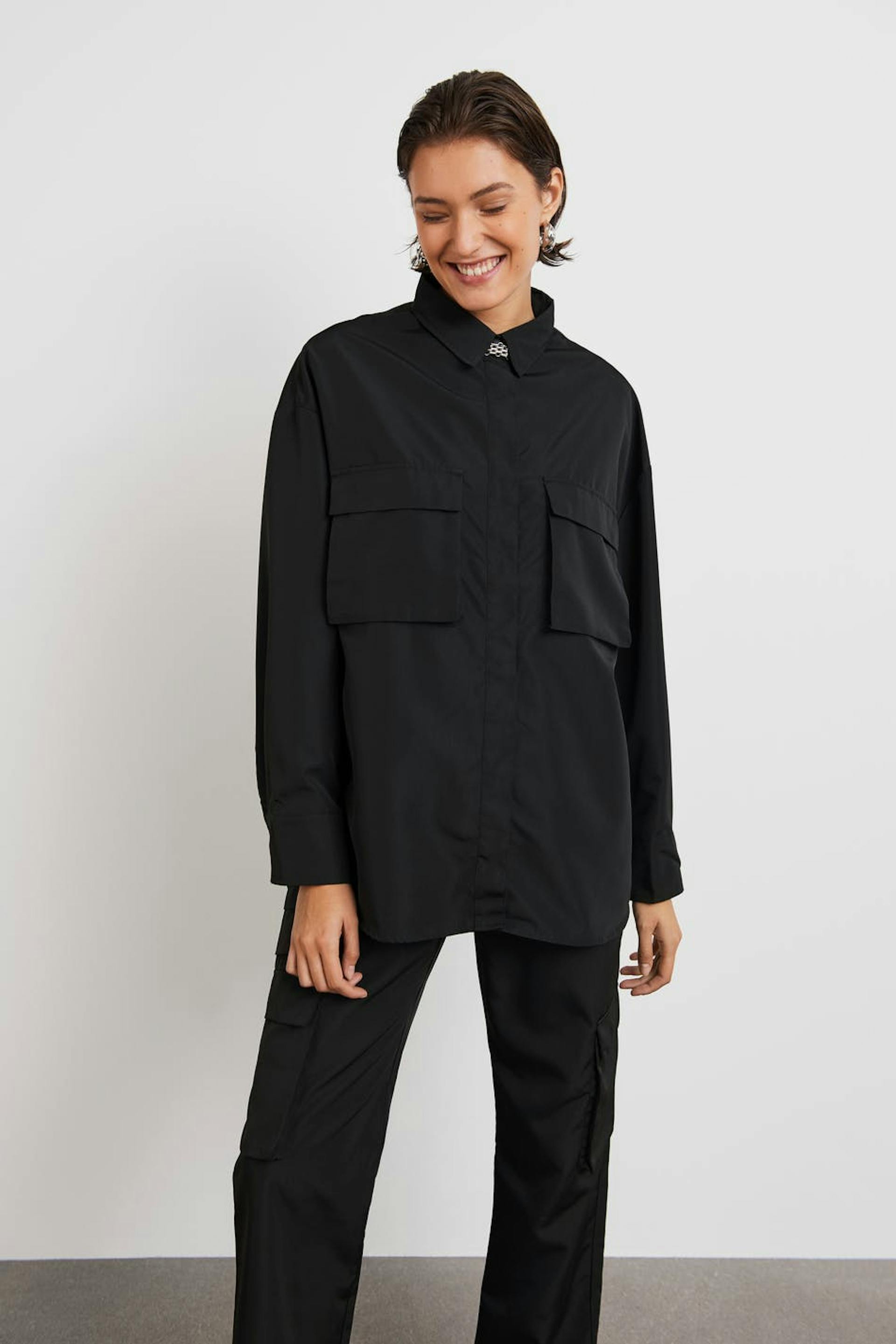 Shirt by Gina Lab with an oversize fit. The shirt is black and has a material in recycled polyester coloured by We aRe SpinDye®. It has flap pockets and a button closure at the front.