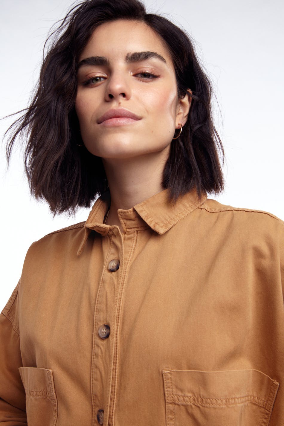 Shirt with an oversize fit. The shirt is brown and has big pockets. It is made of denim.