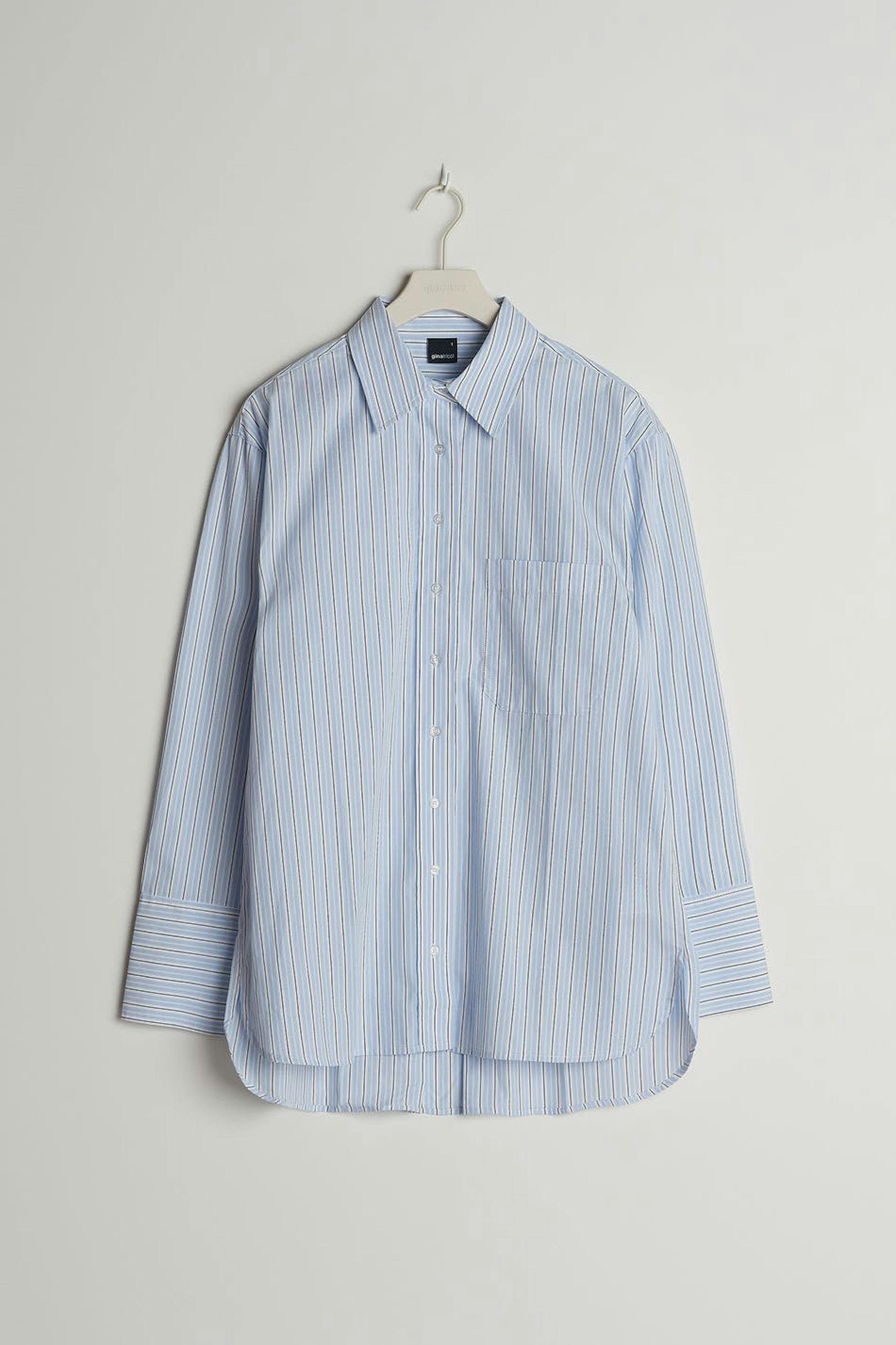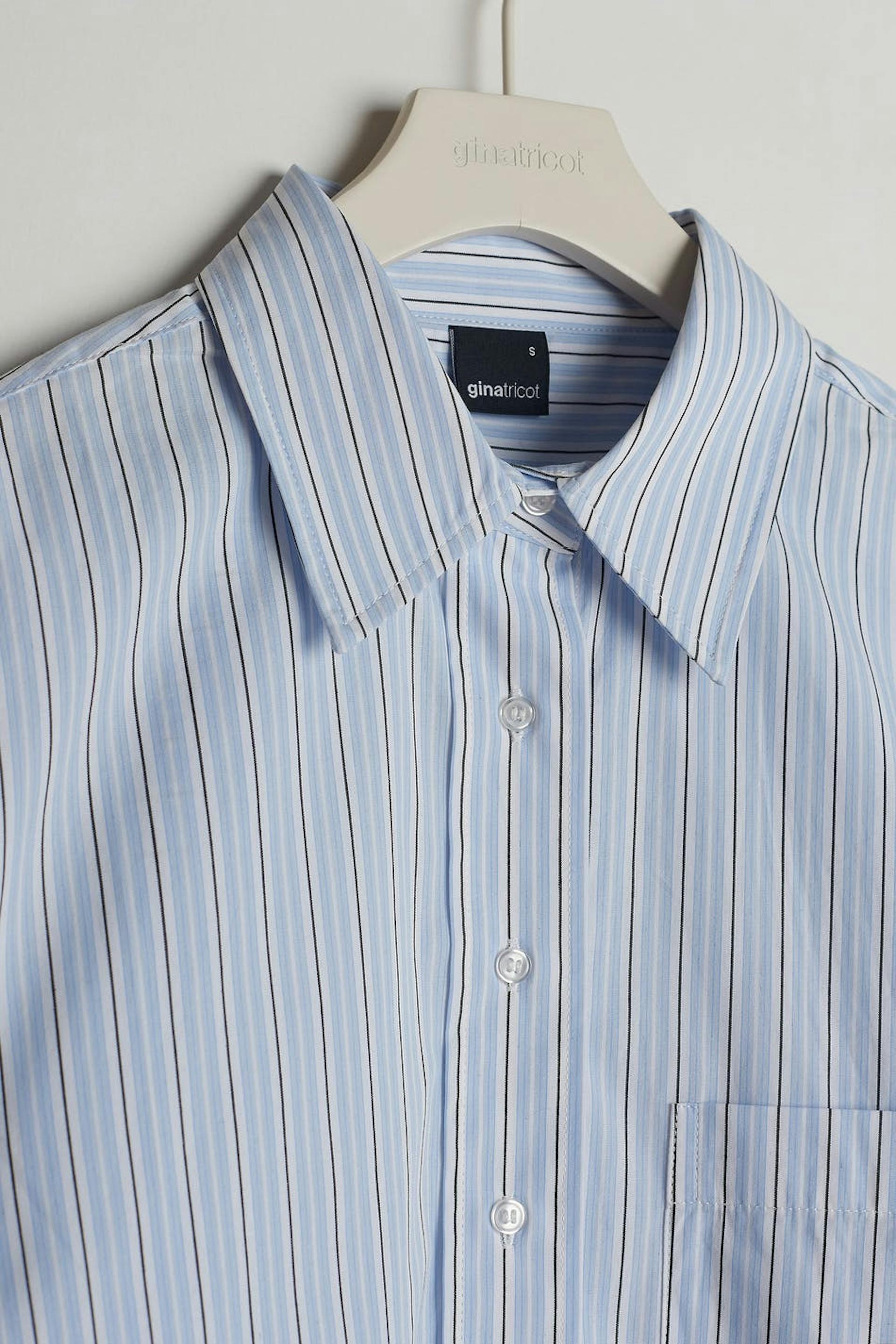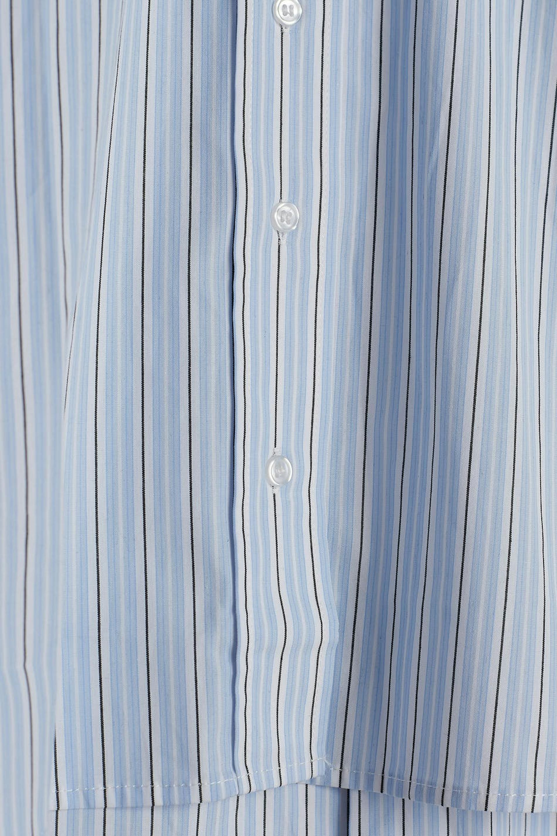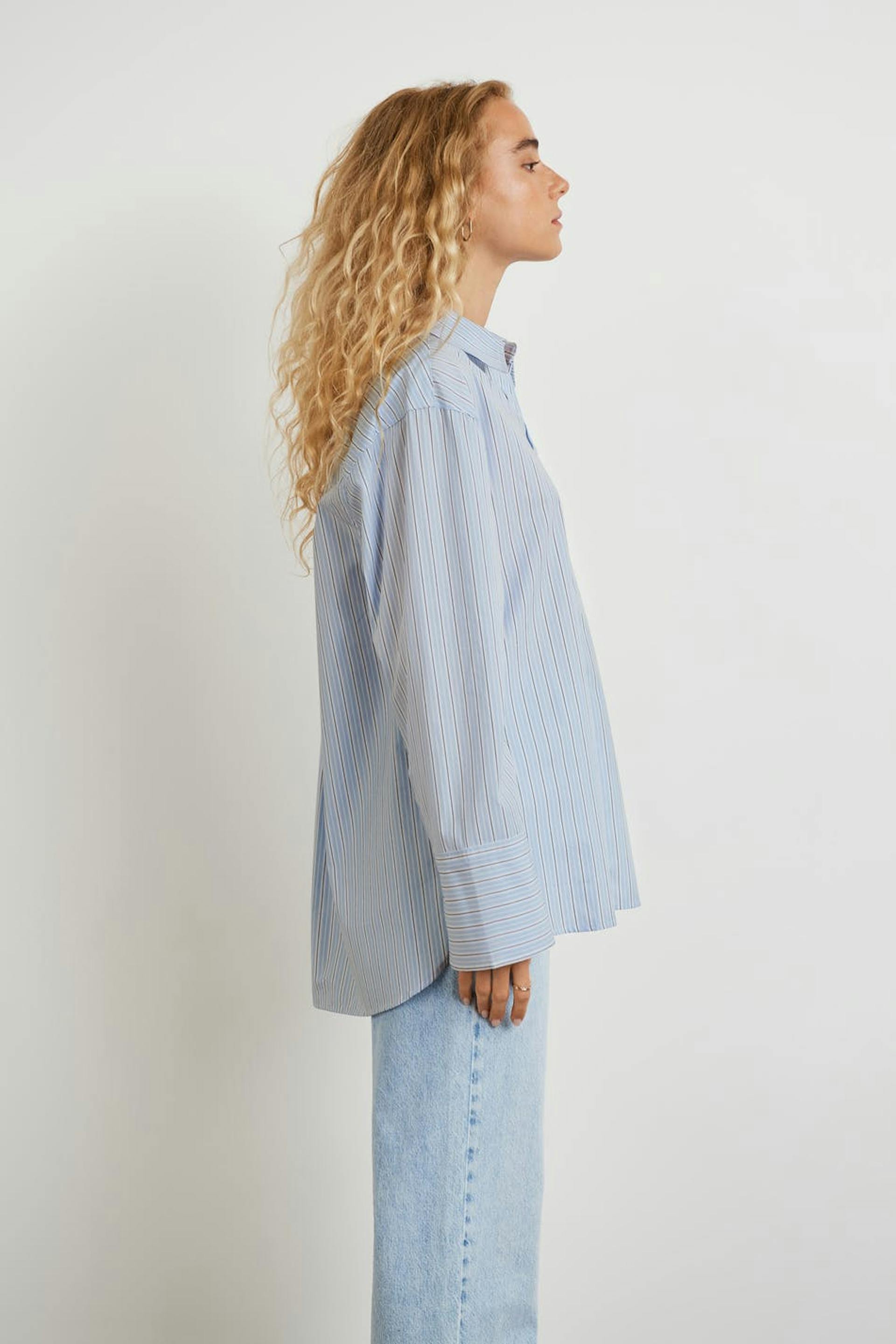Striped shirt with an oversize fit. The shirt is blue and has buttons at the front. It is made of poplin and has a chest pocket on one side.