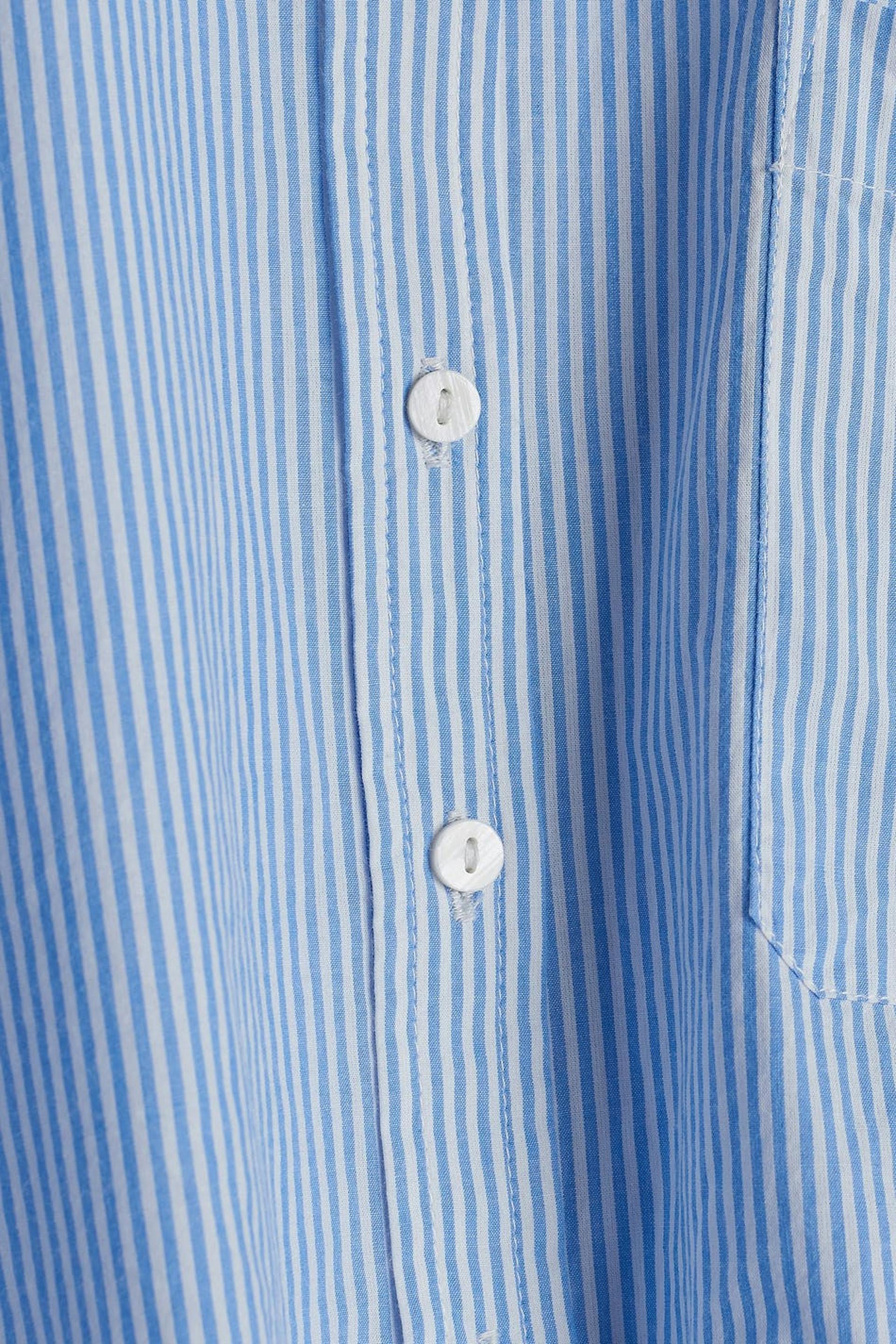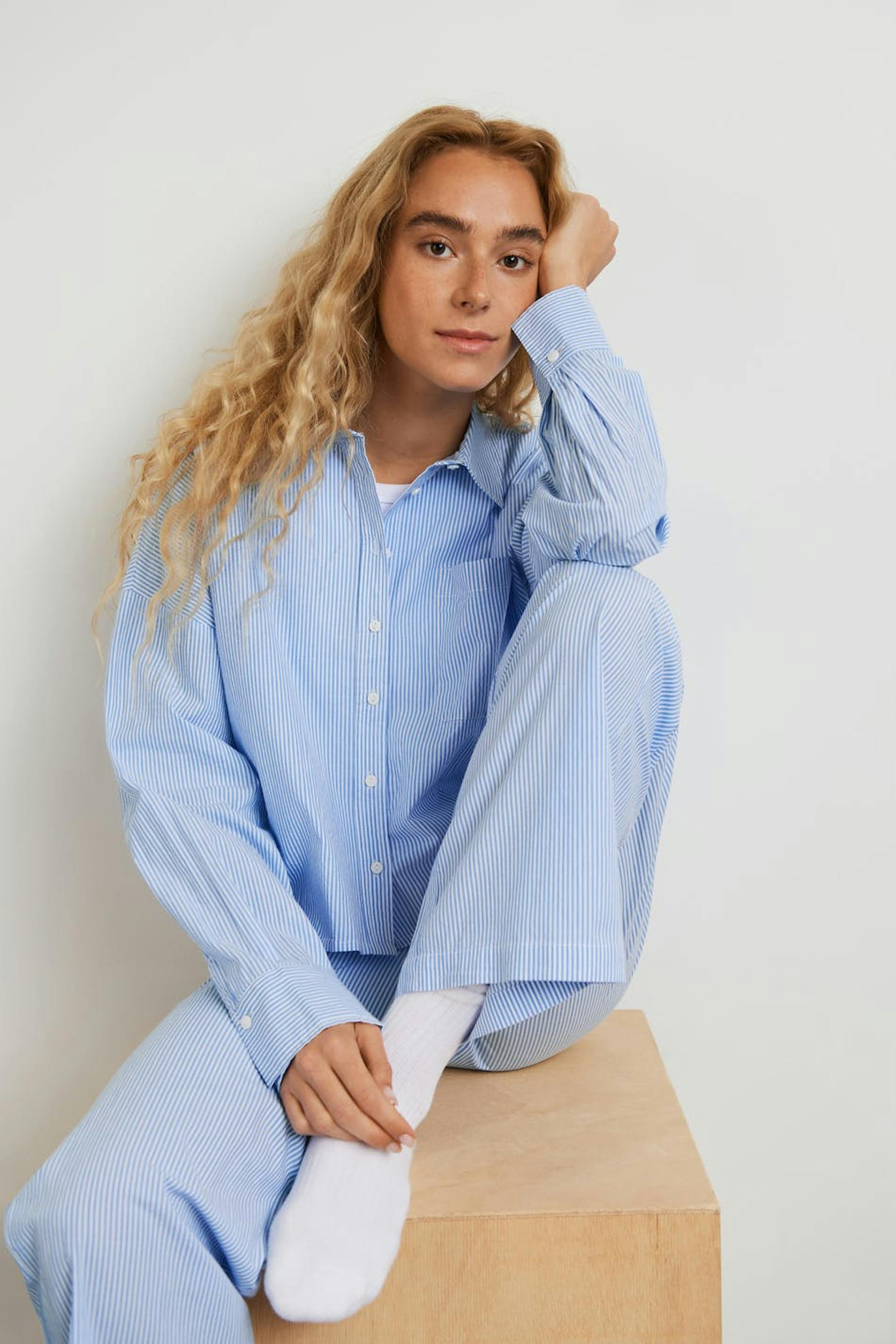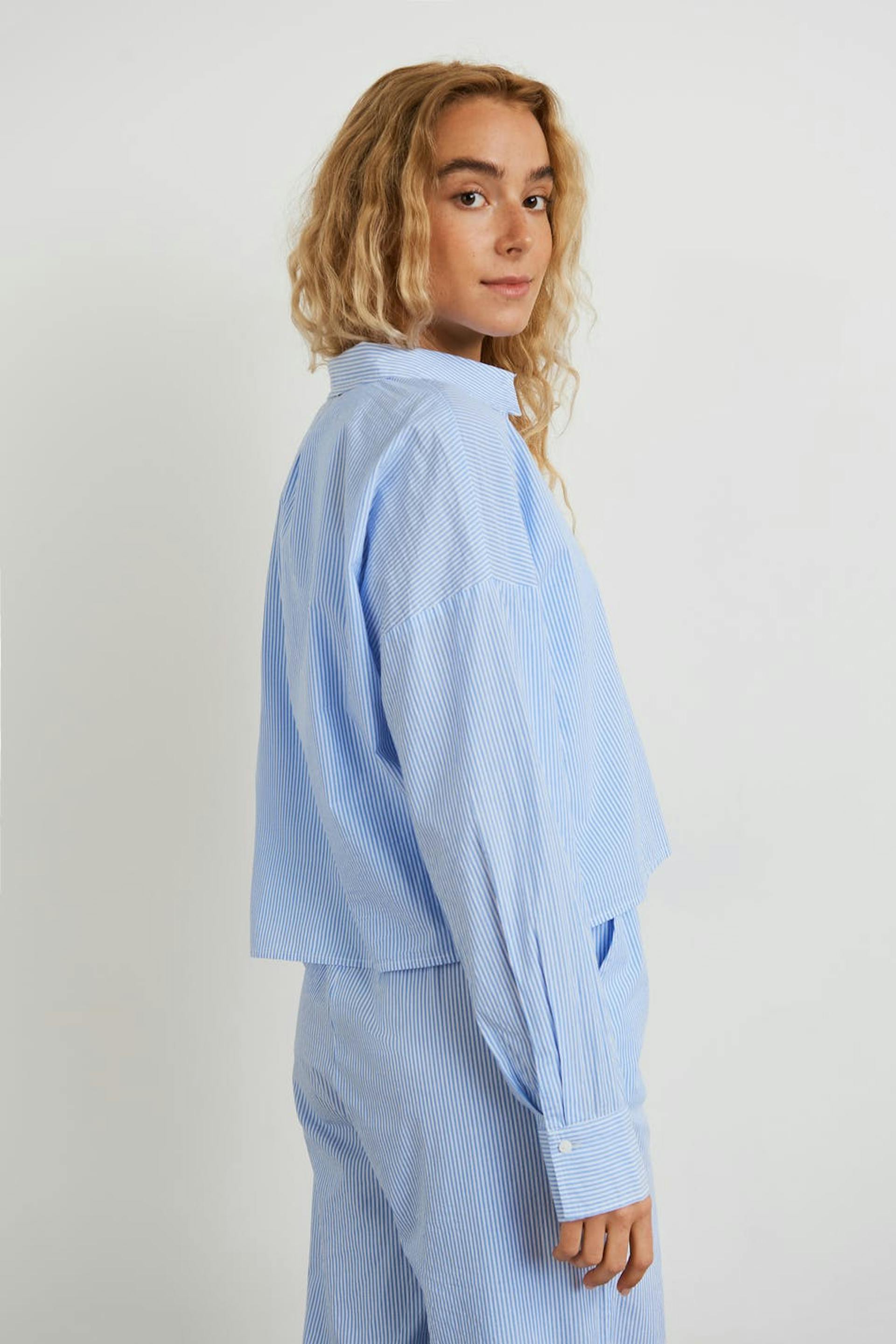 Striped pyjama shirt with a regular fit. The shirt is blue, long-sleeved and cropped. It has a collar, a chest pocket and a button closure at the front.