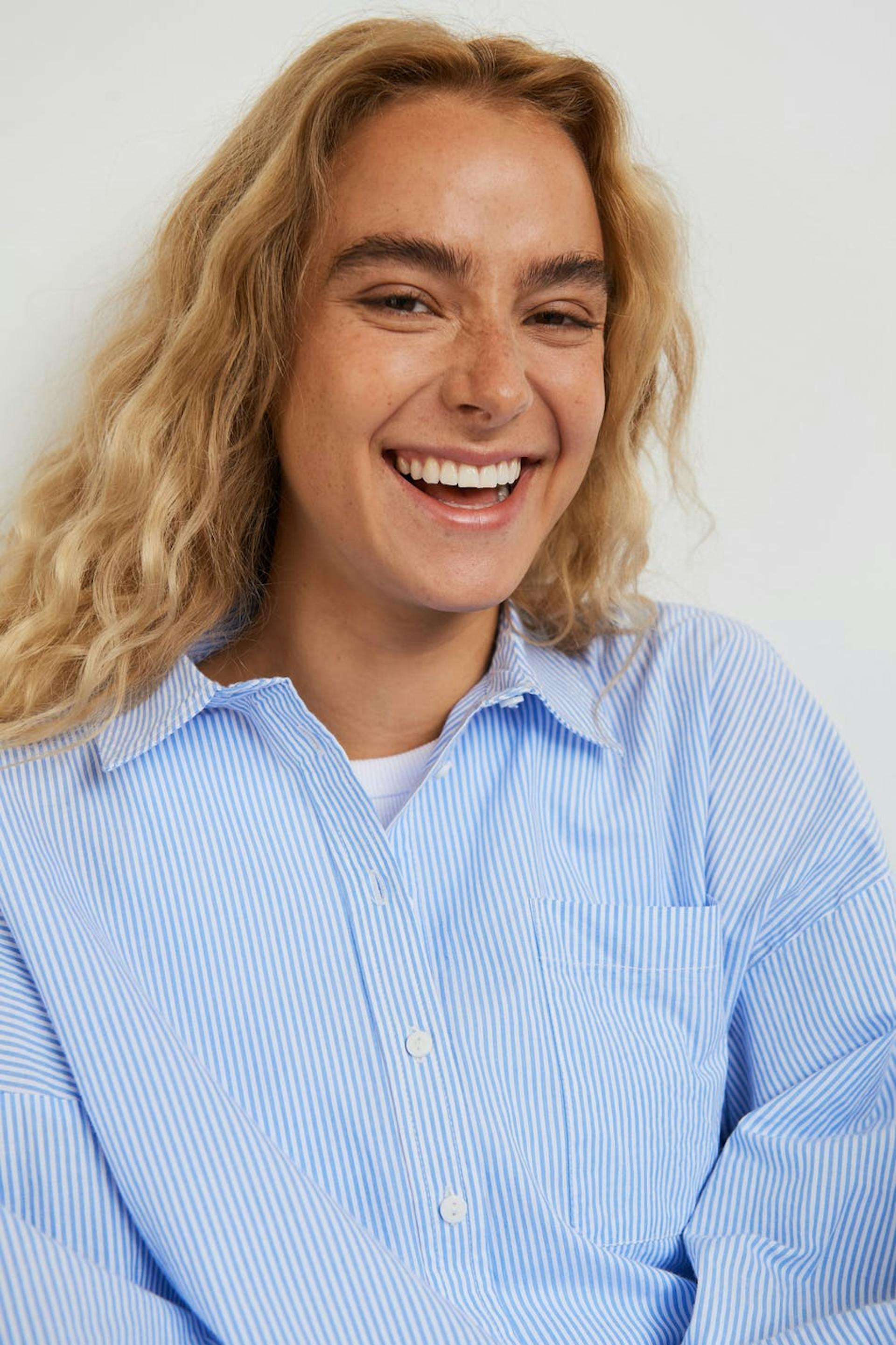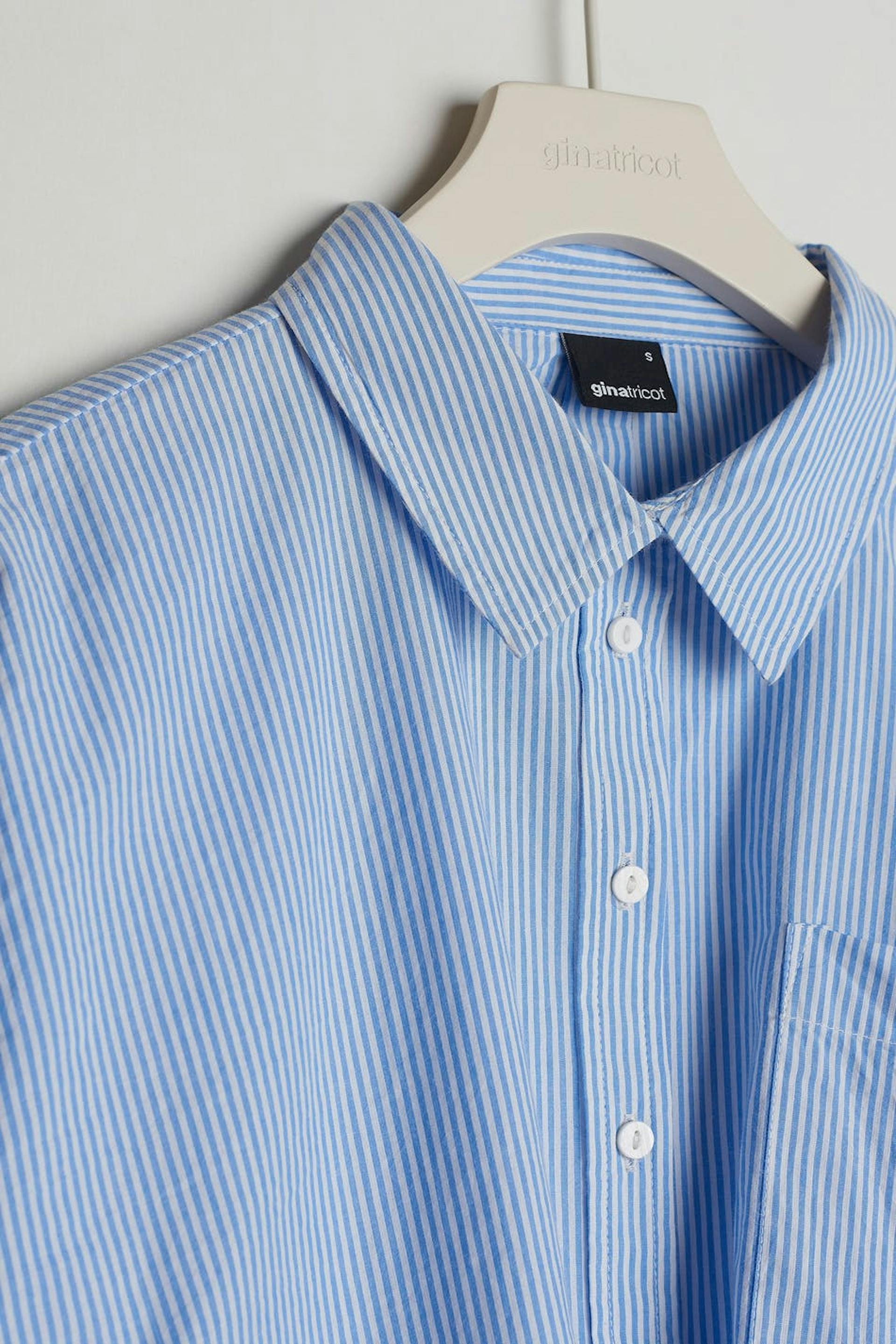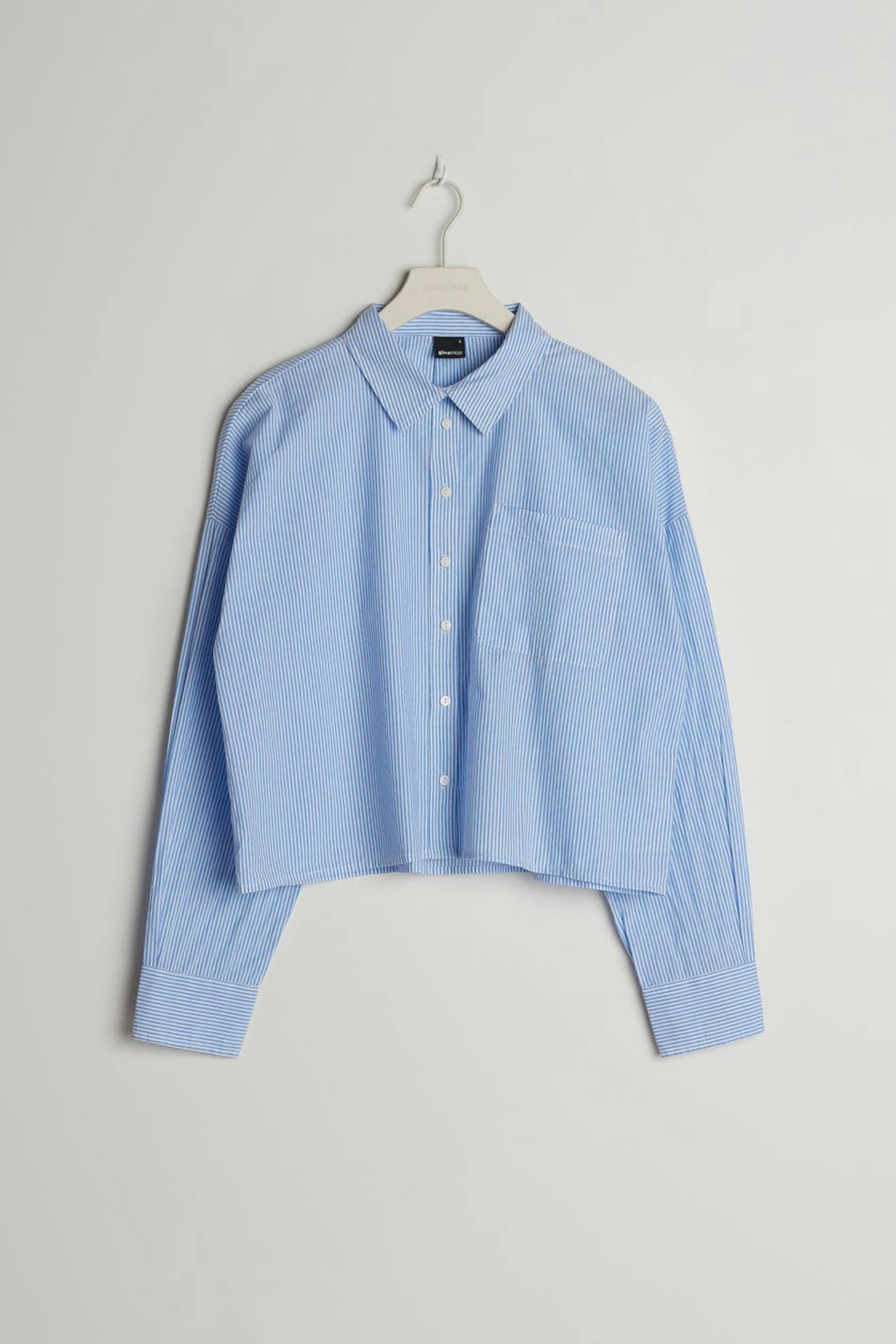 Striped pyjama shirt with a regular fit. The shirt is blue, long-sleeved and cropped. It has a collar, a chest pocket and a button closure at the front.