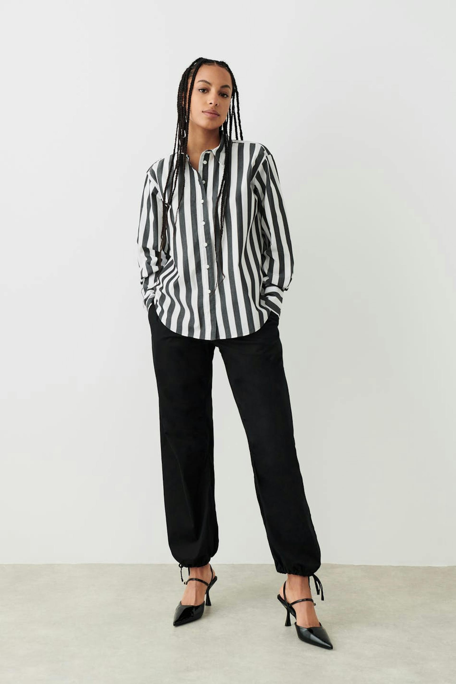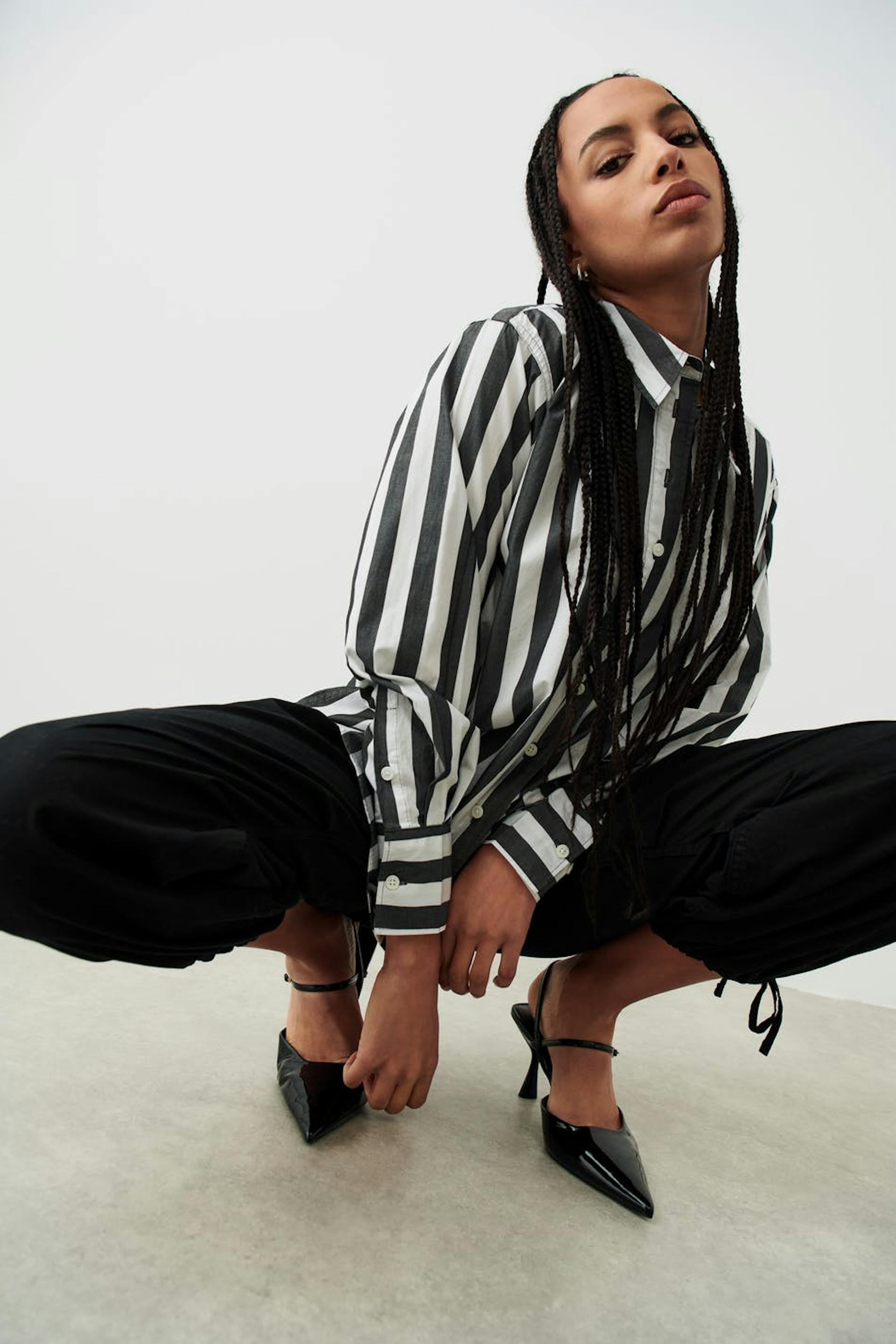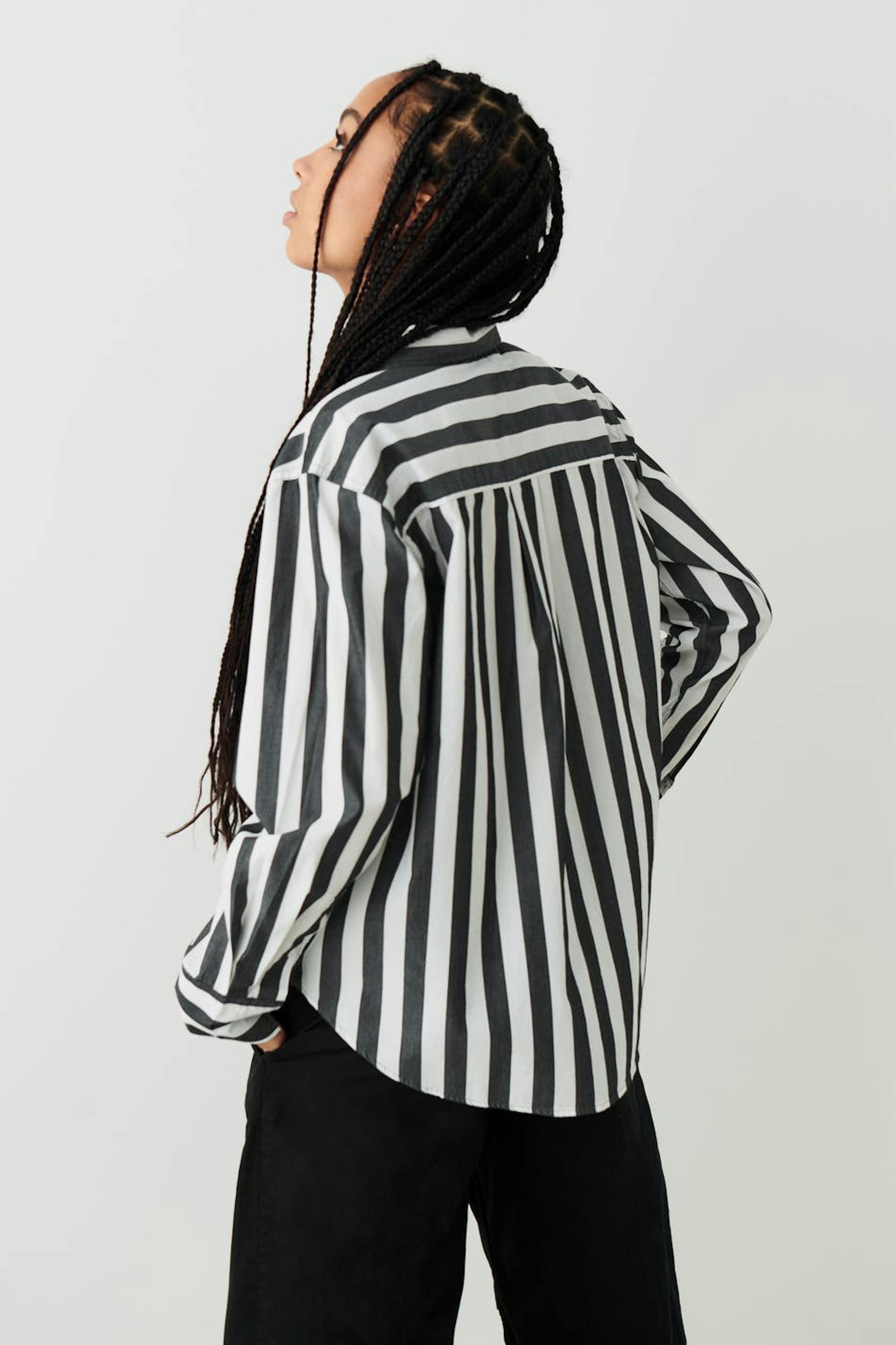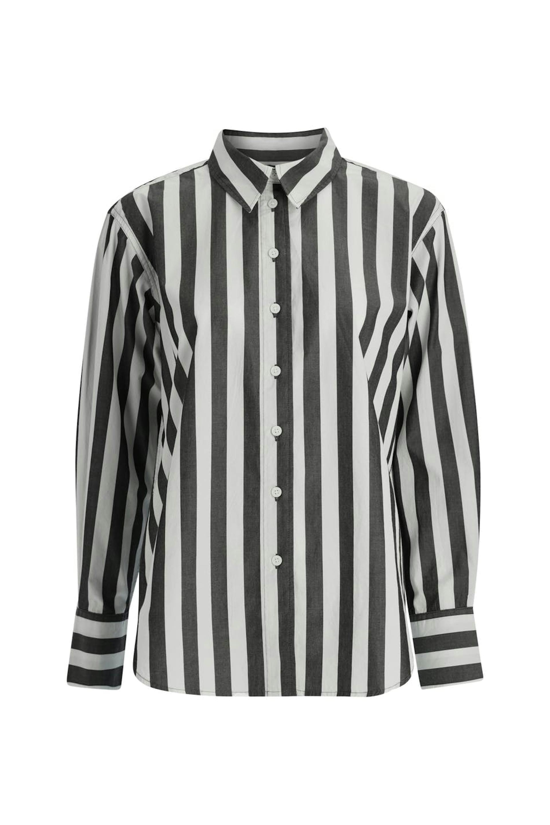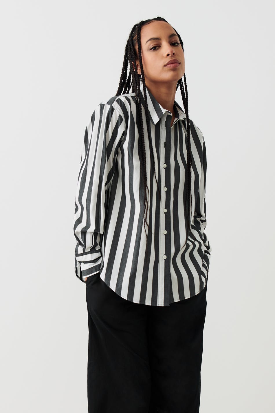 Striped shirt in cotton poplin with relaxed fit. The shirt is black and has button placket in front. It has collar and long sleeve with button and cuff.