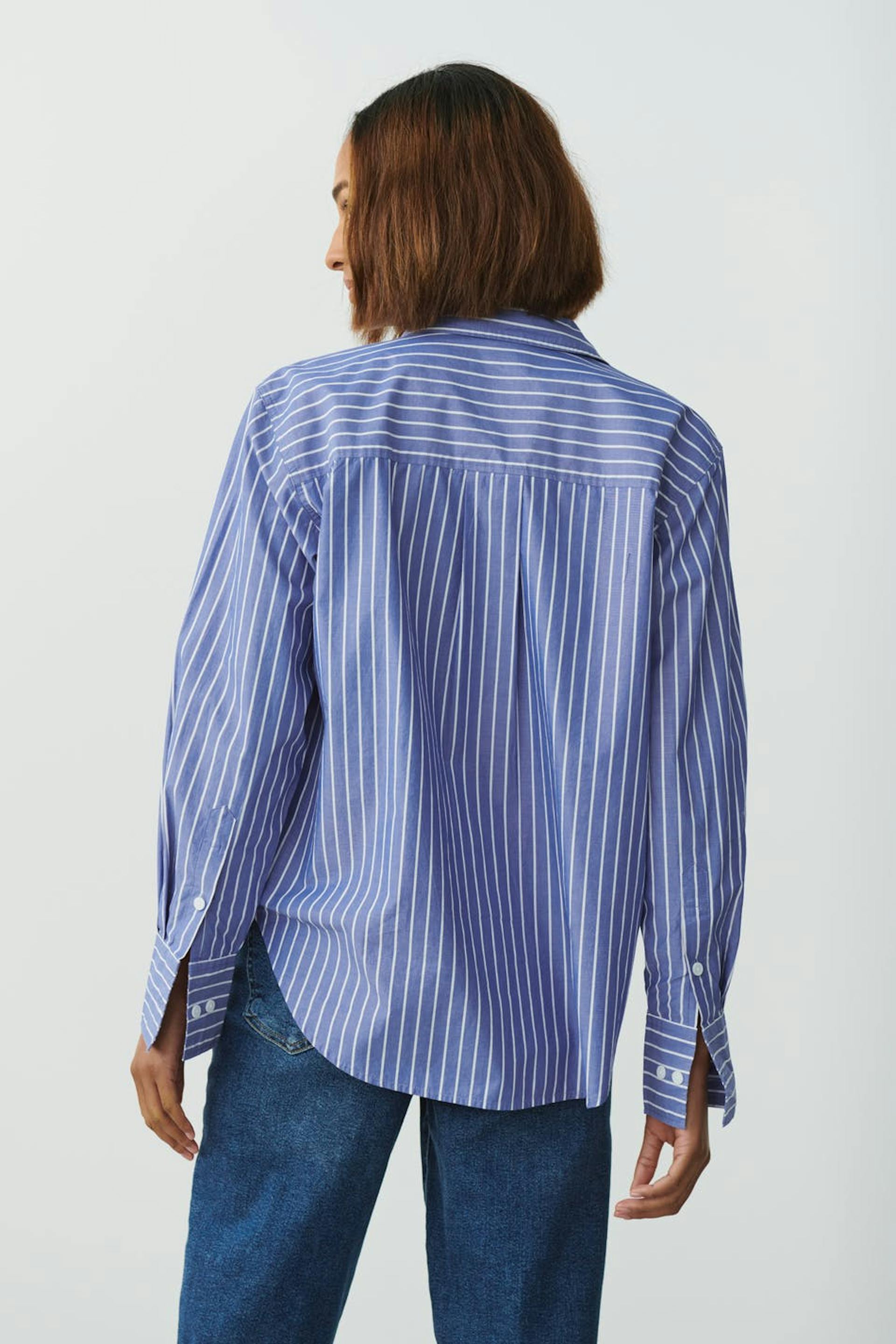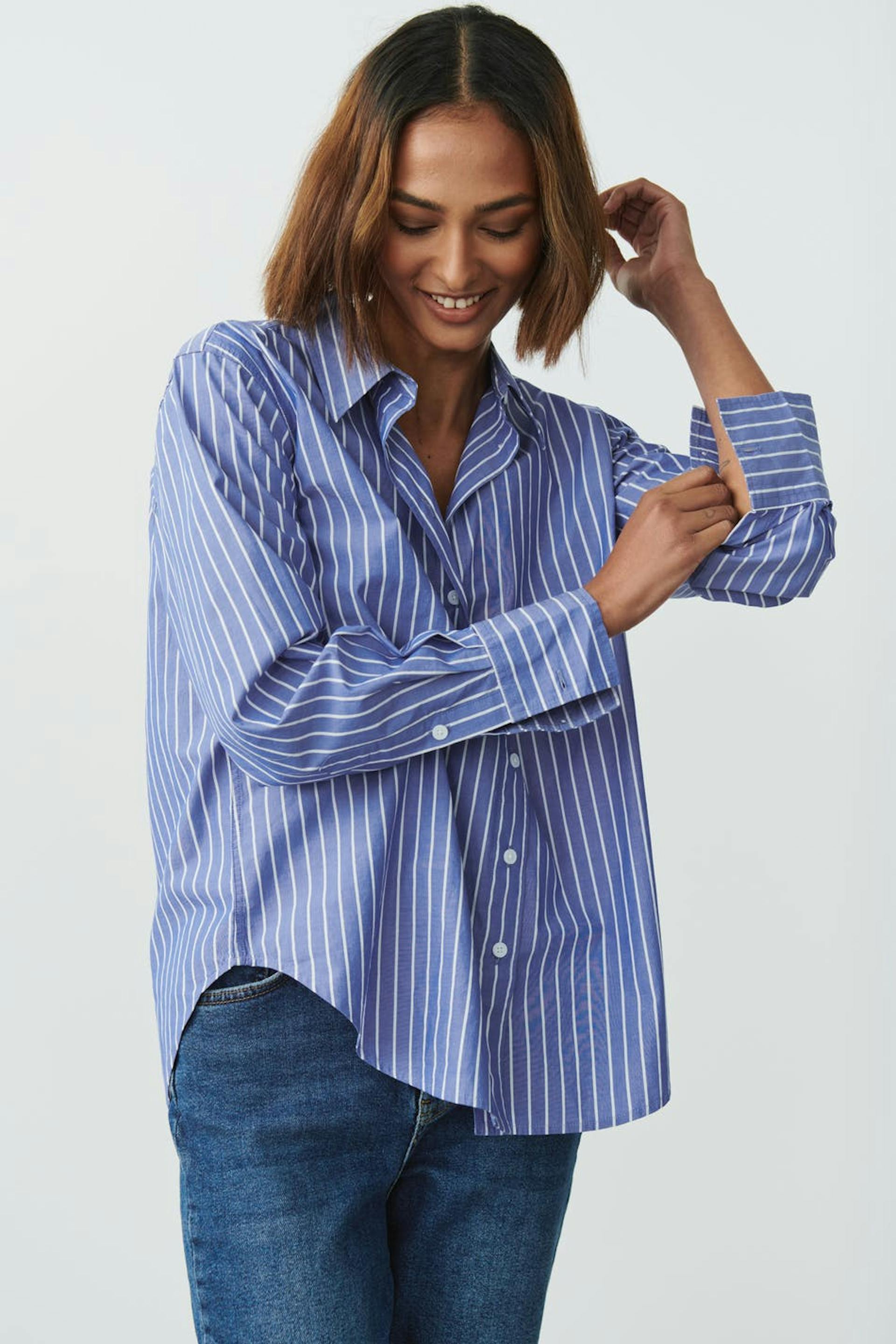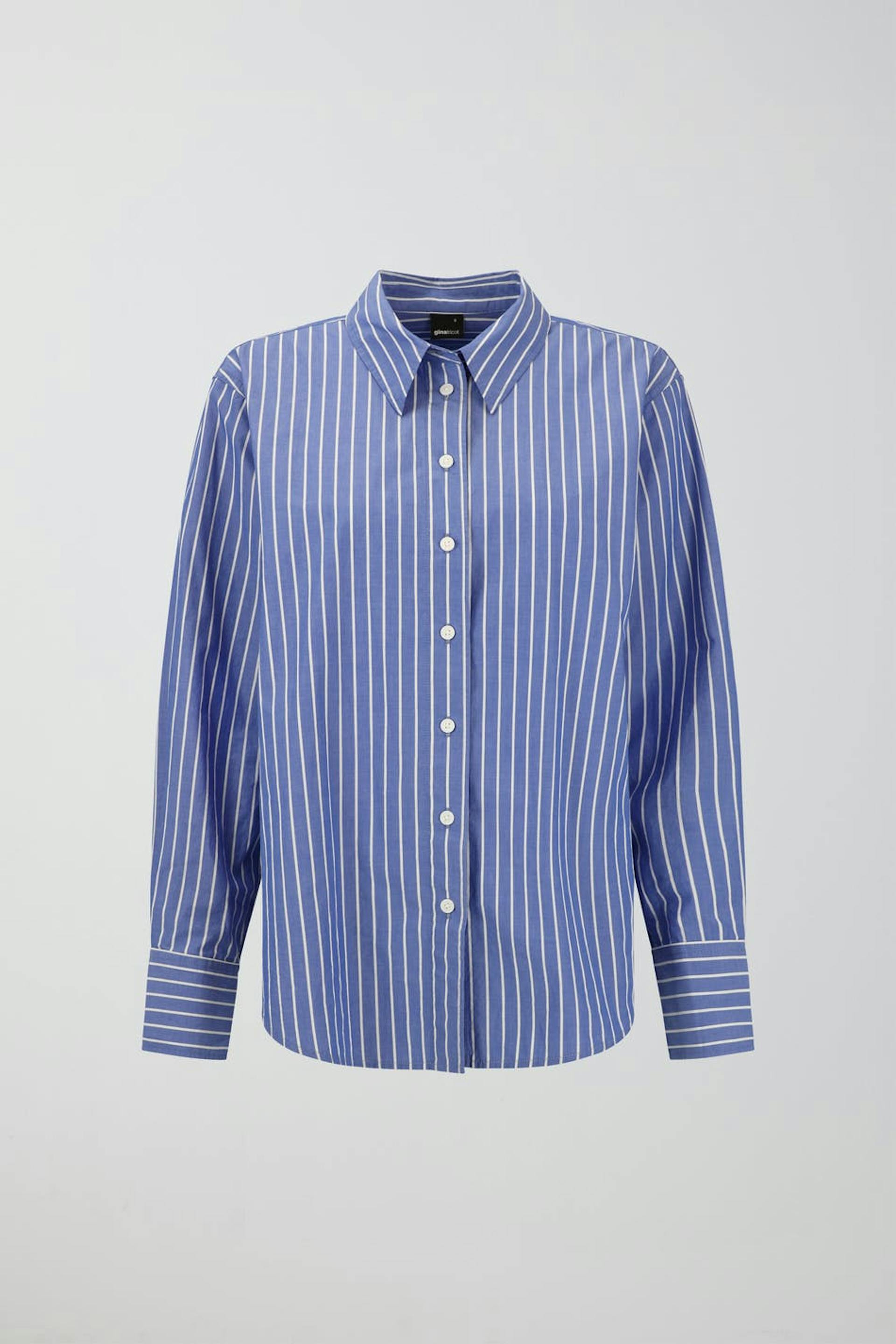 Striped shirt in cotton poplin with relaxed fit. The shirt is blue and has button placket at the front. It has collar and long sleeve with button and cuff.