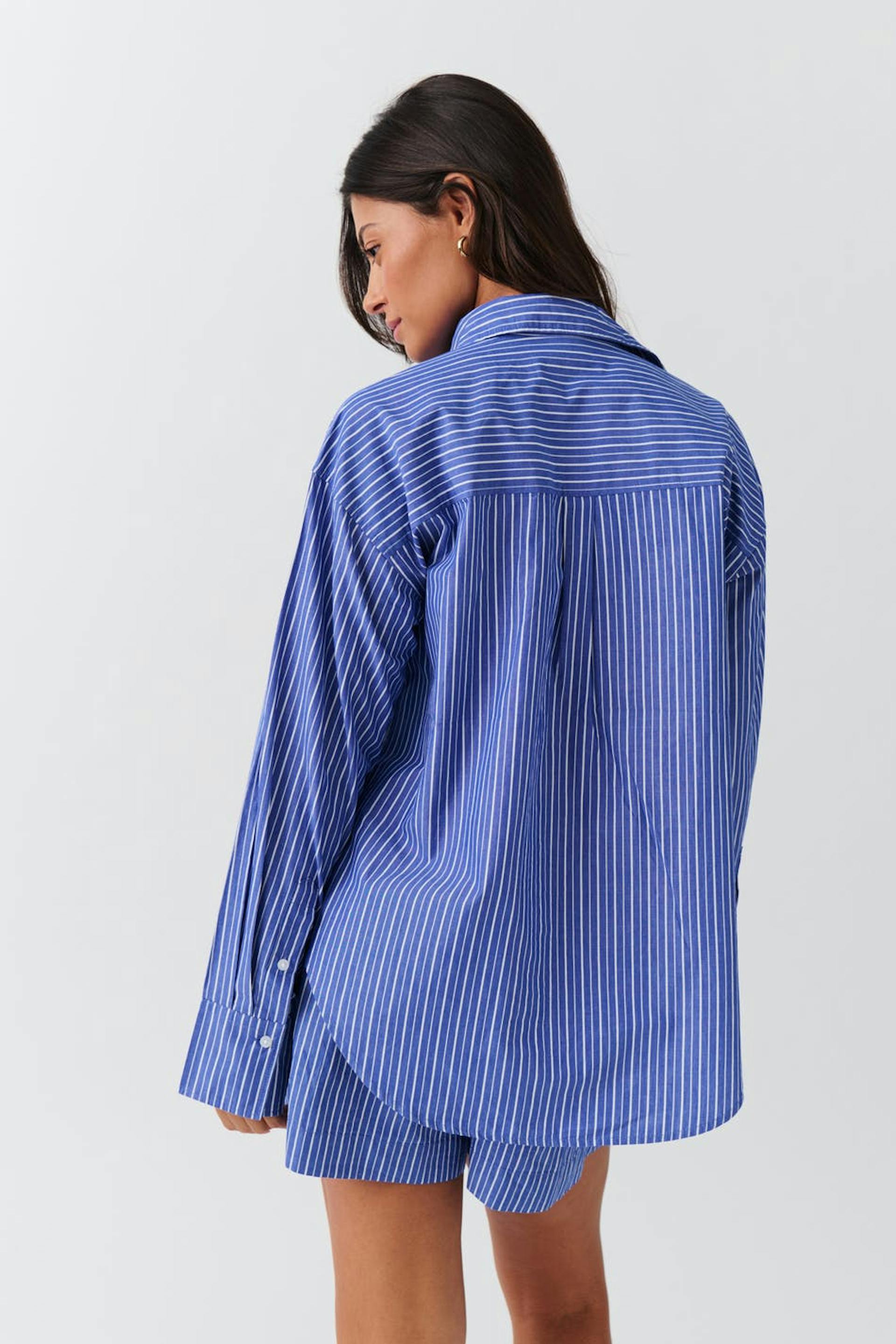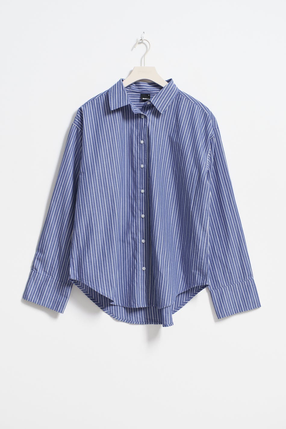 Striped shirt in cotton poplin with relaxed fit. The shirt is blue and has buttoning at the front. It has yoke with pleats at the back and long sleeve with button and cuff.