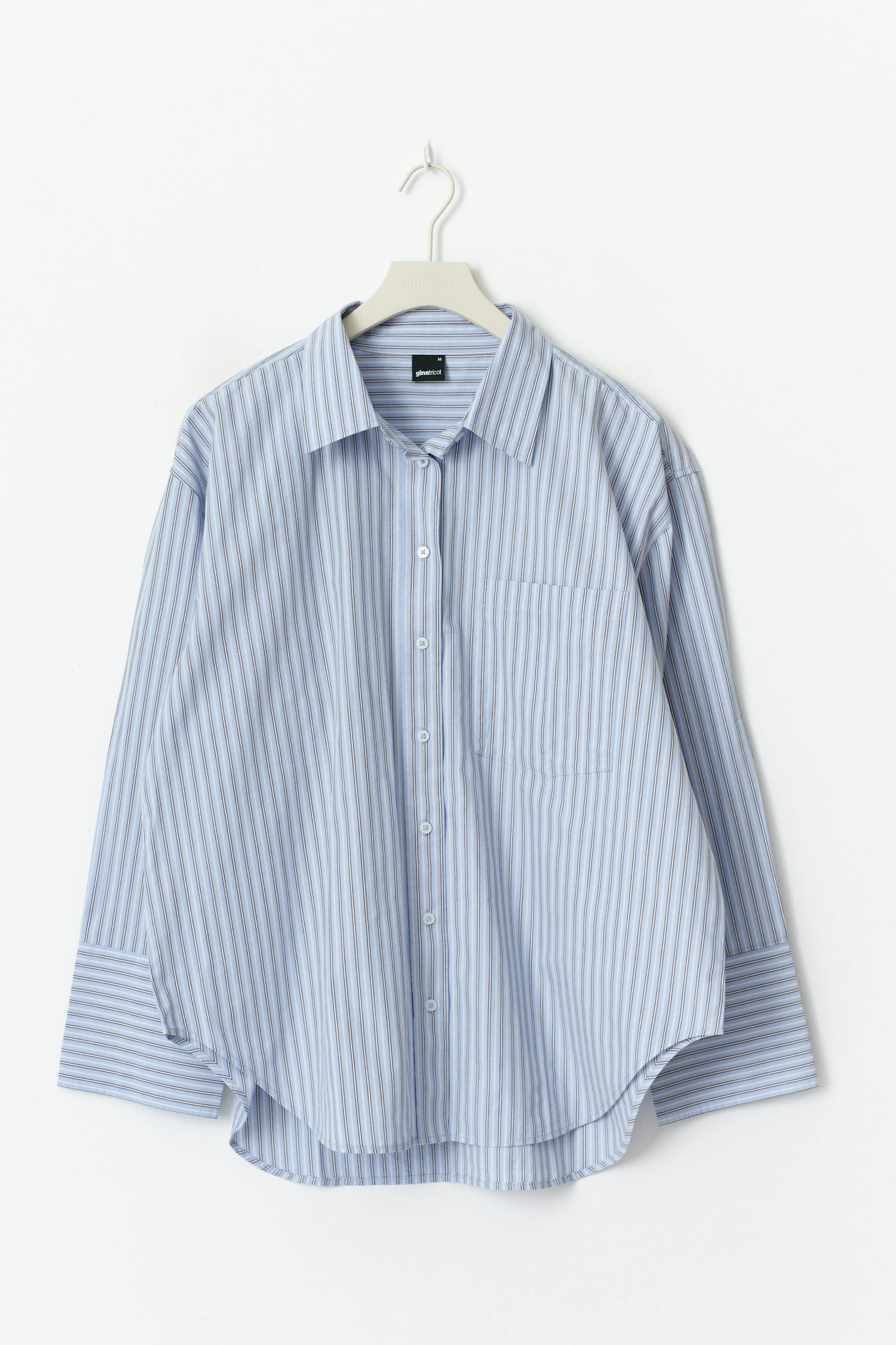 Striped shirt with oversize fit at the front. The shirt is blue and has chest pocket. It has collar and long sleeve with button and cuff.