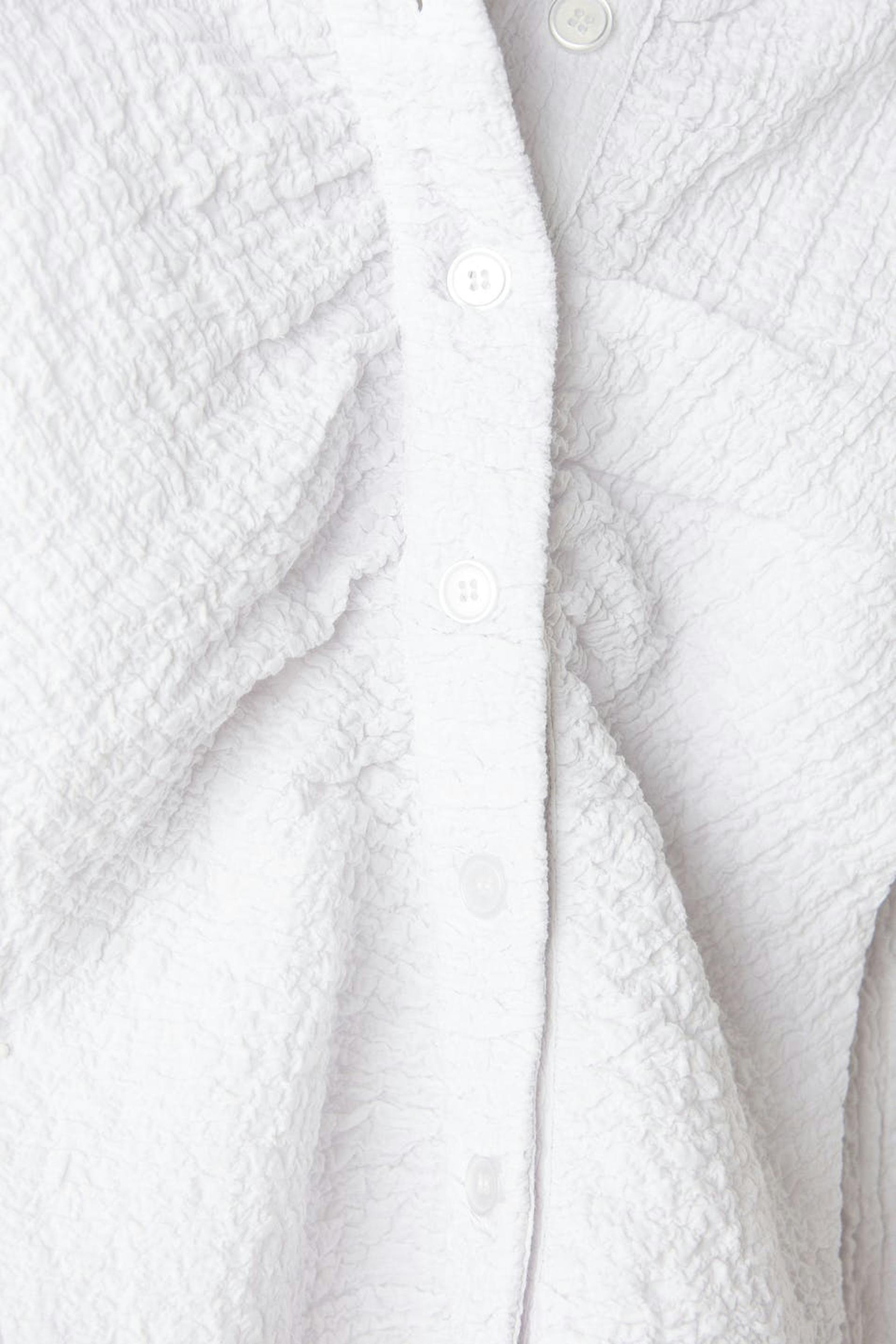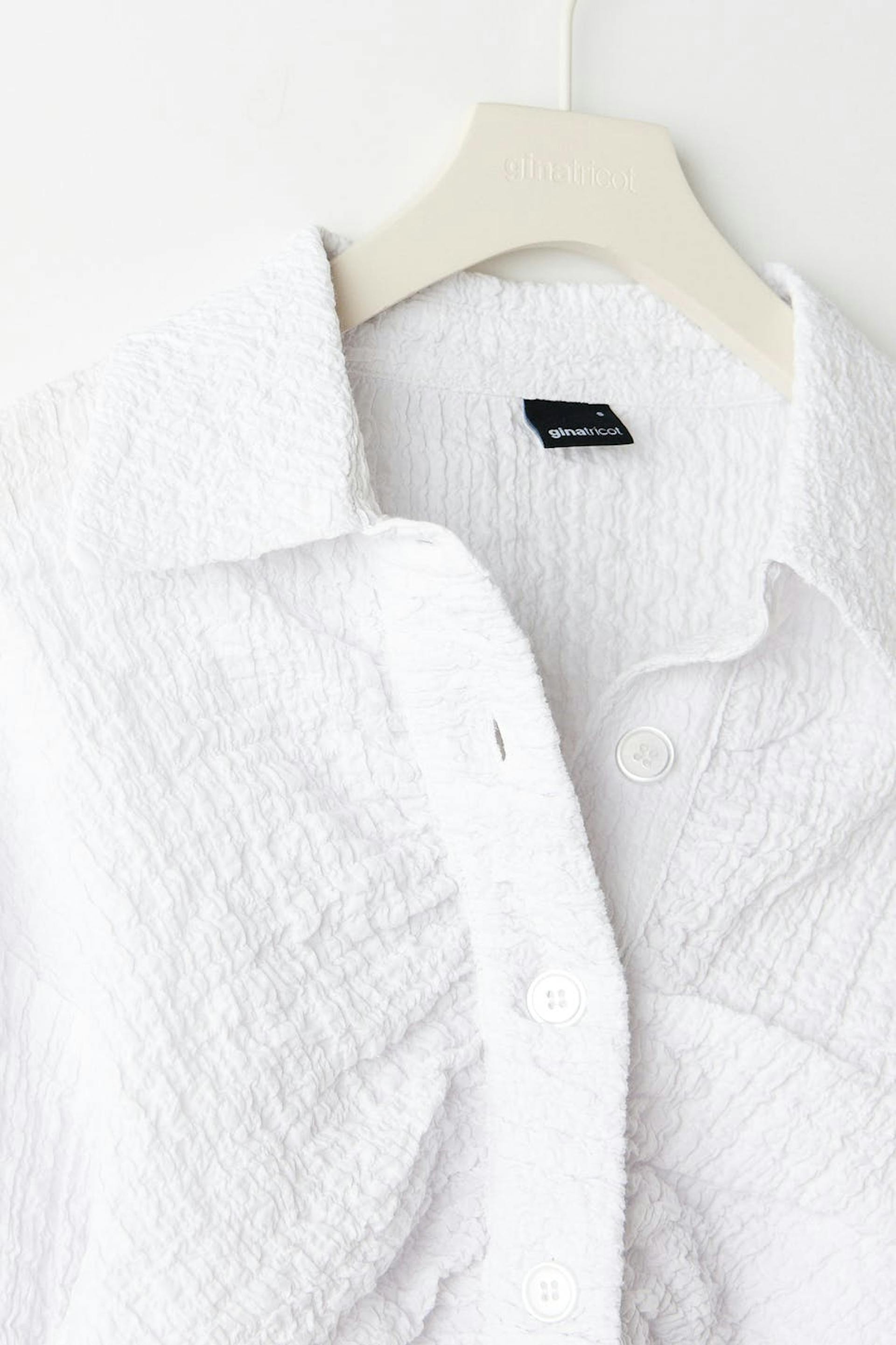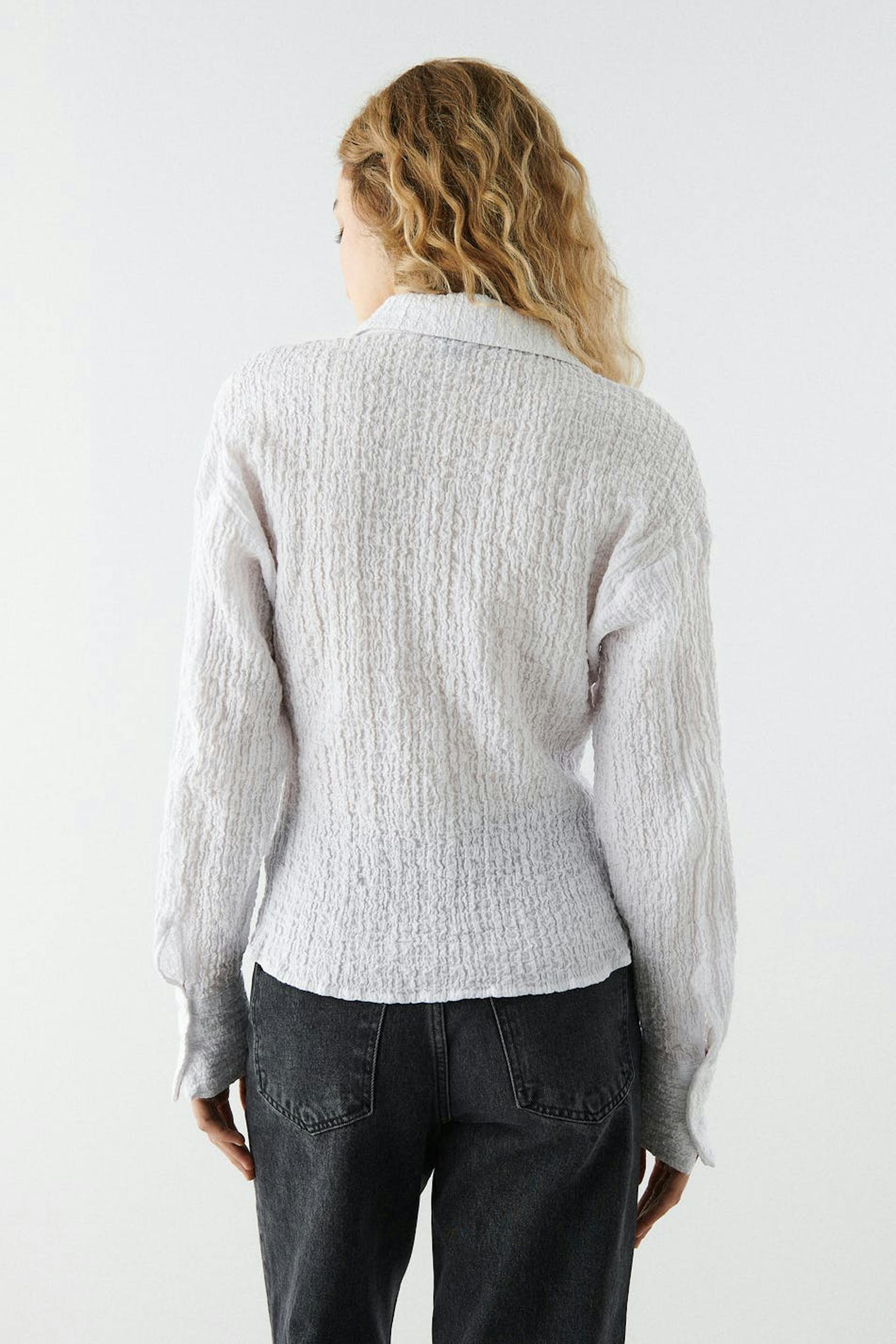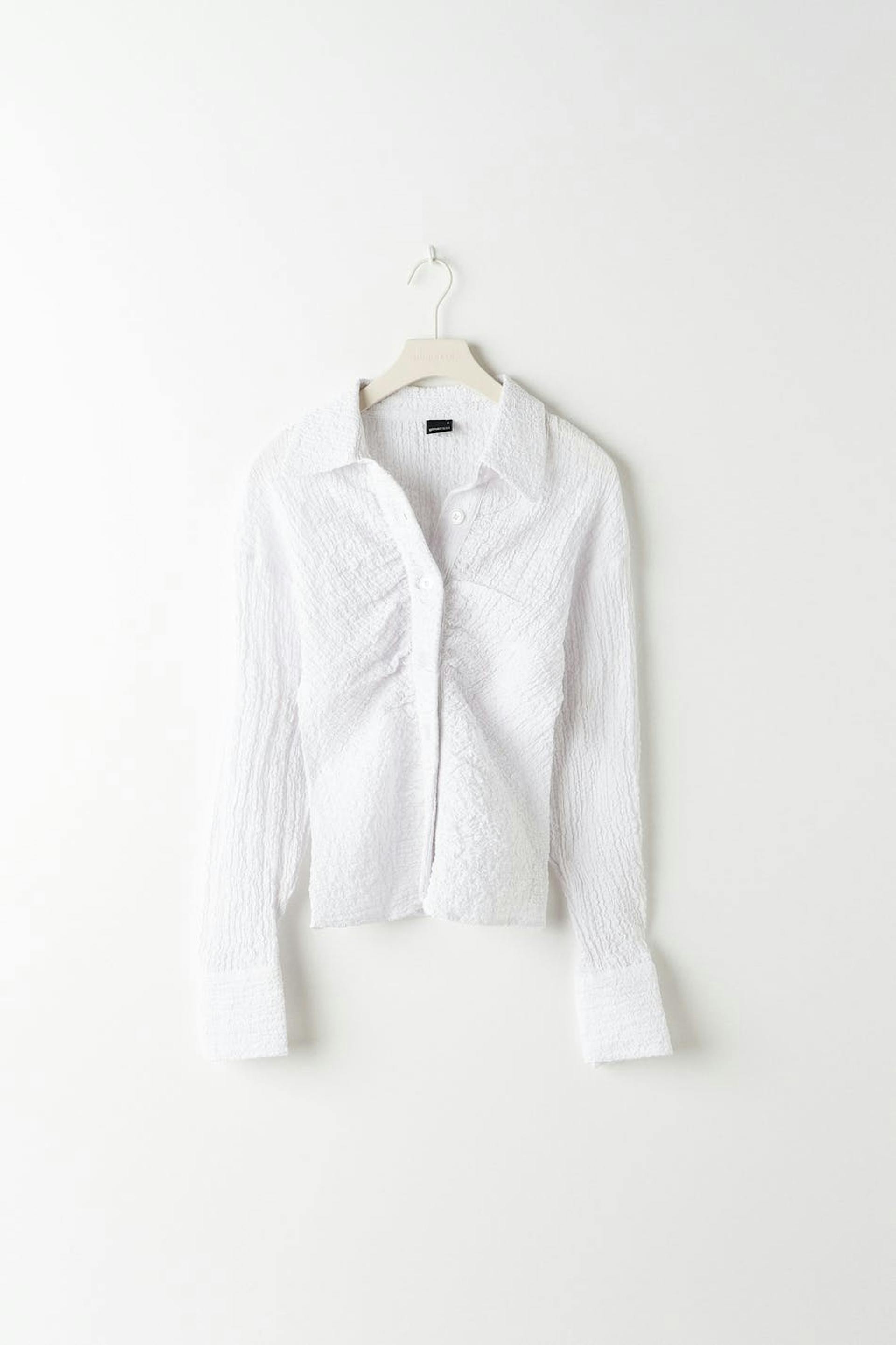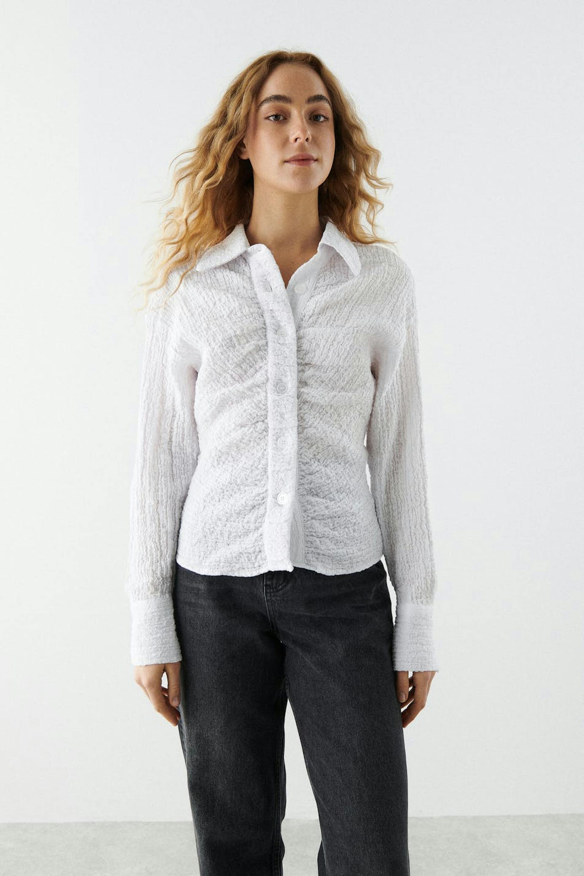 Shirt with fitted fit. The shirt is white and has button closure in front with gathered effect. It has a crêped seersucker quality, large collar and high cuffs with buttons.
